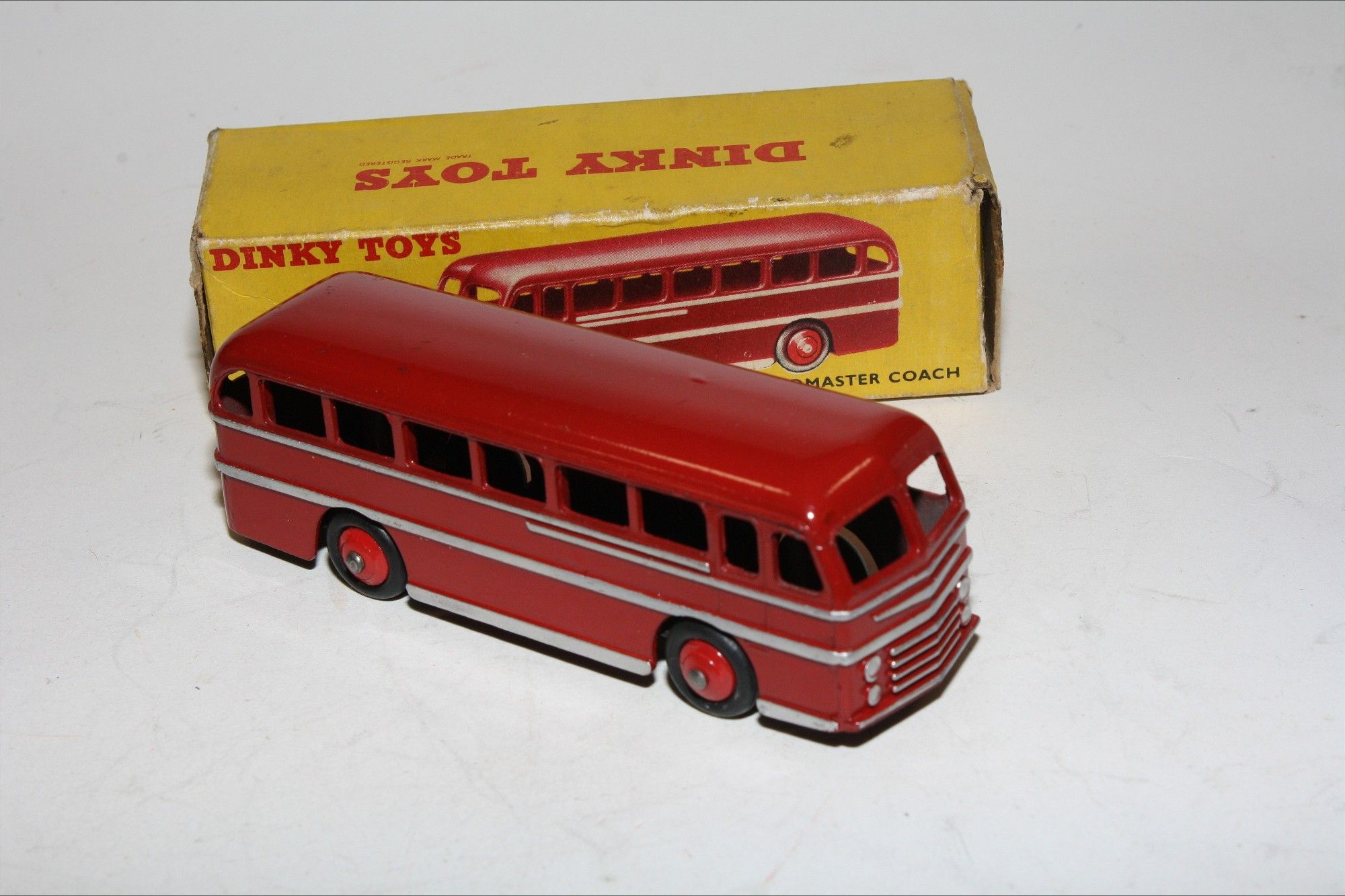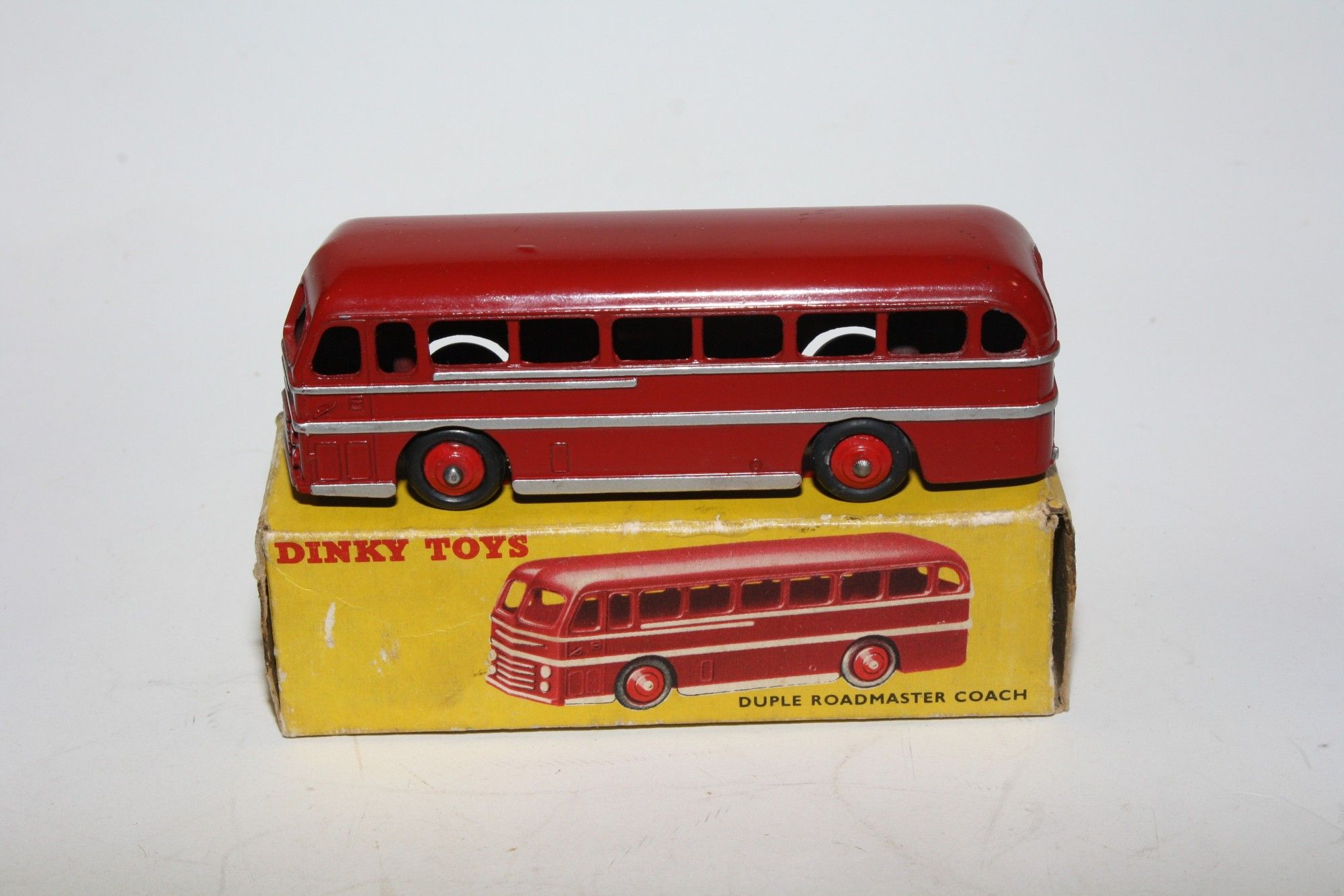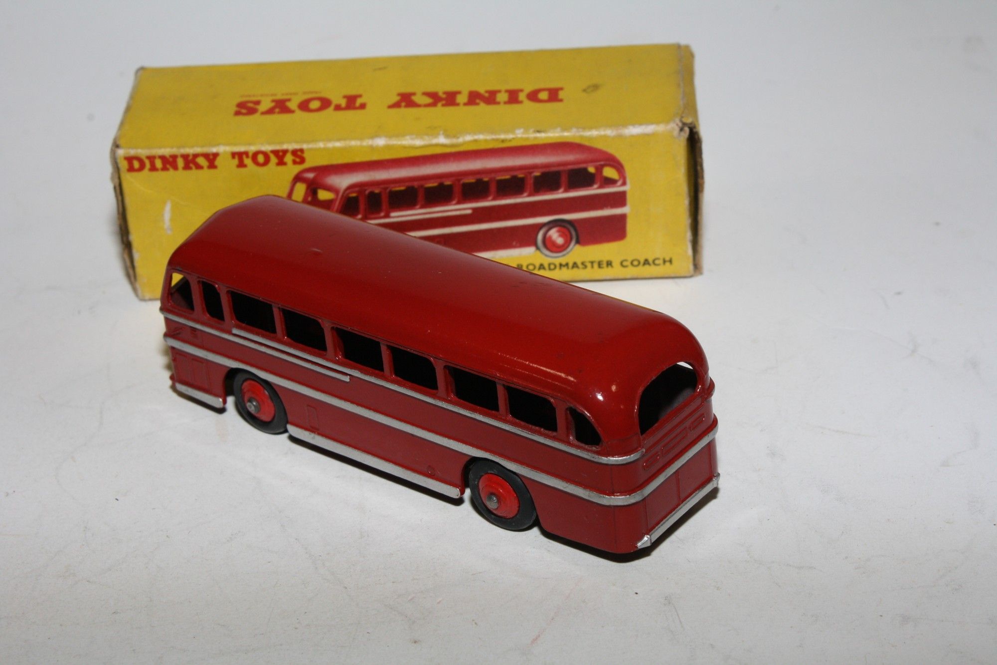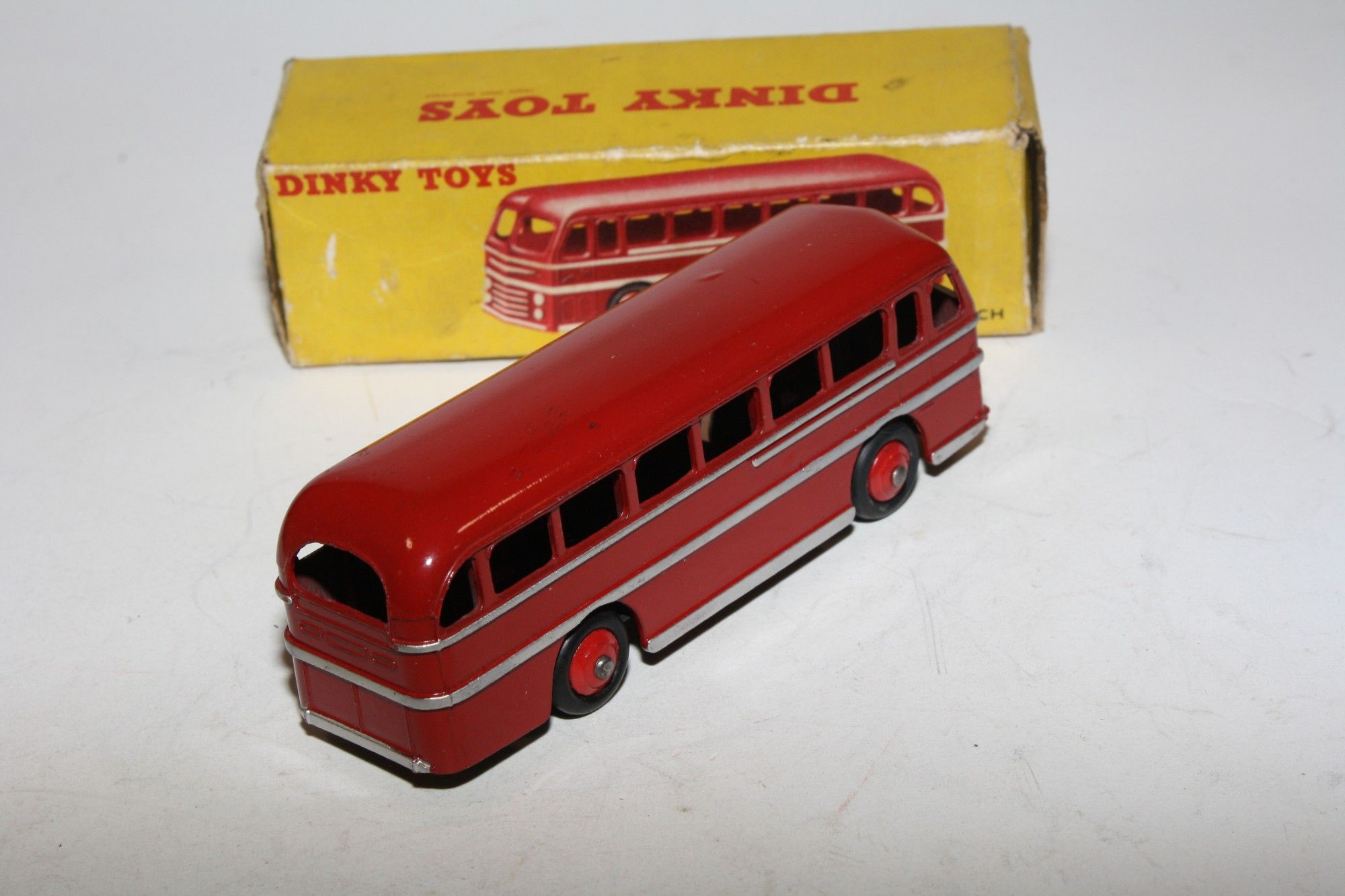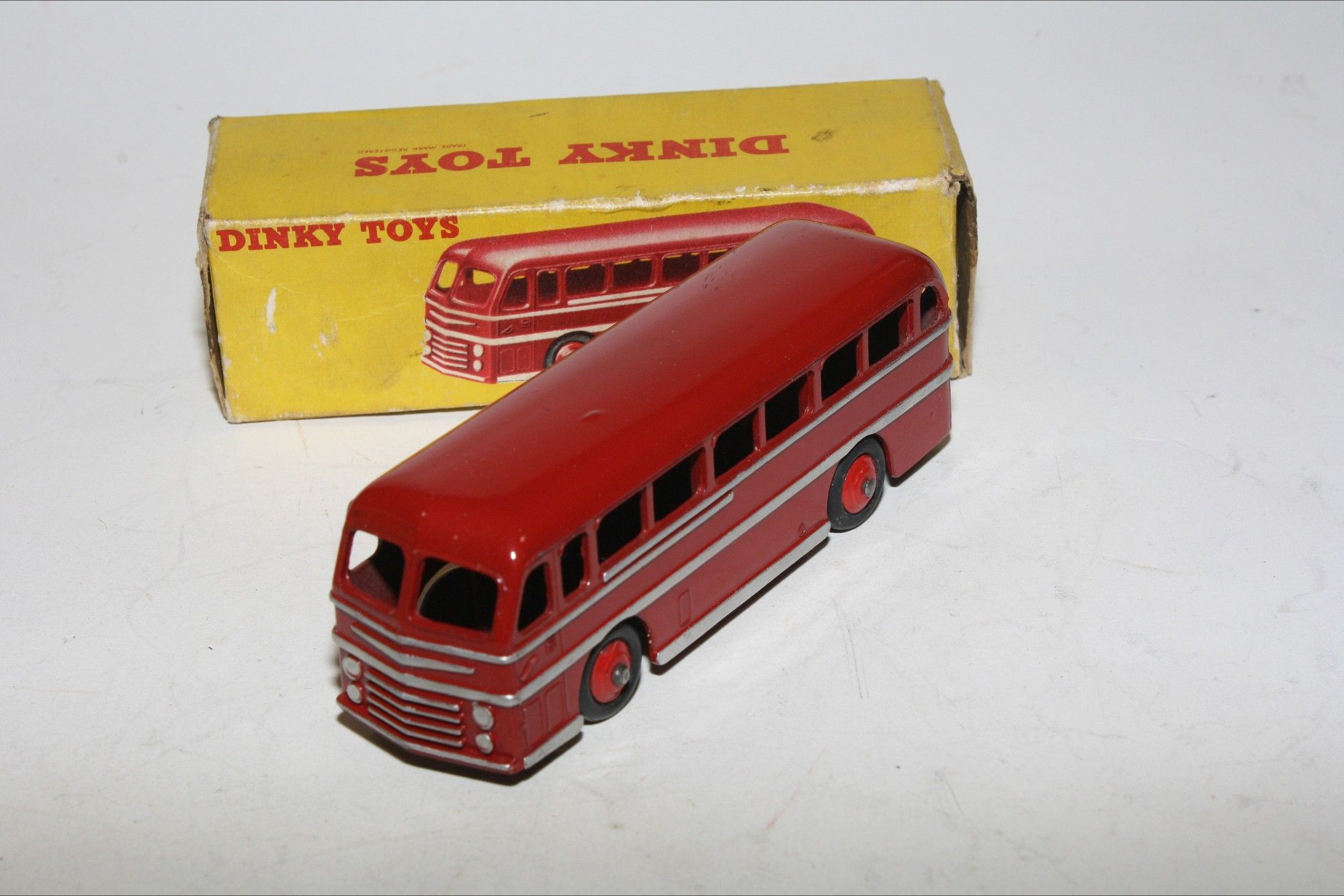 A superb example of this 1950's Dinky model. Gleaming original maroon paintwork is mint, please study the photos for exact condition. Original tyres are good on red ridges hubs, good original silver detailing, excellent tin baseplate underside.