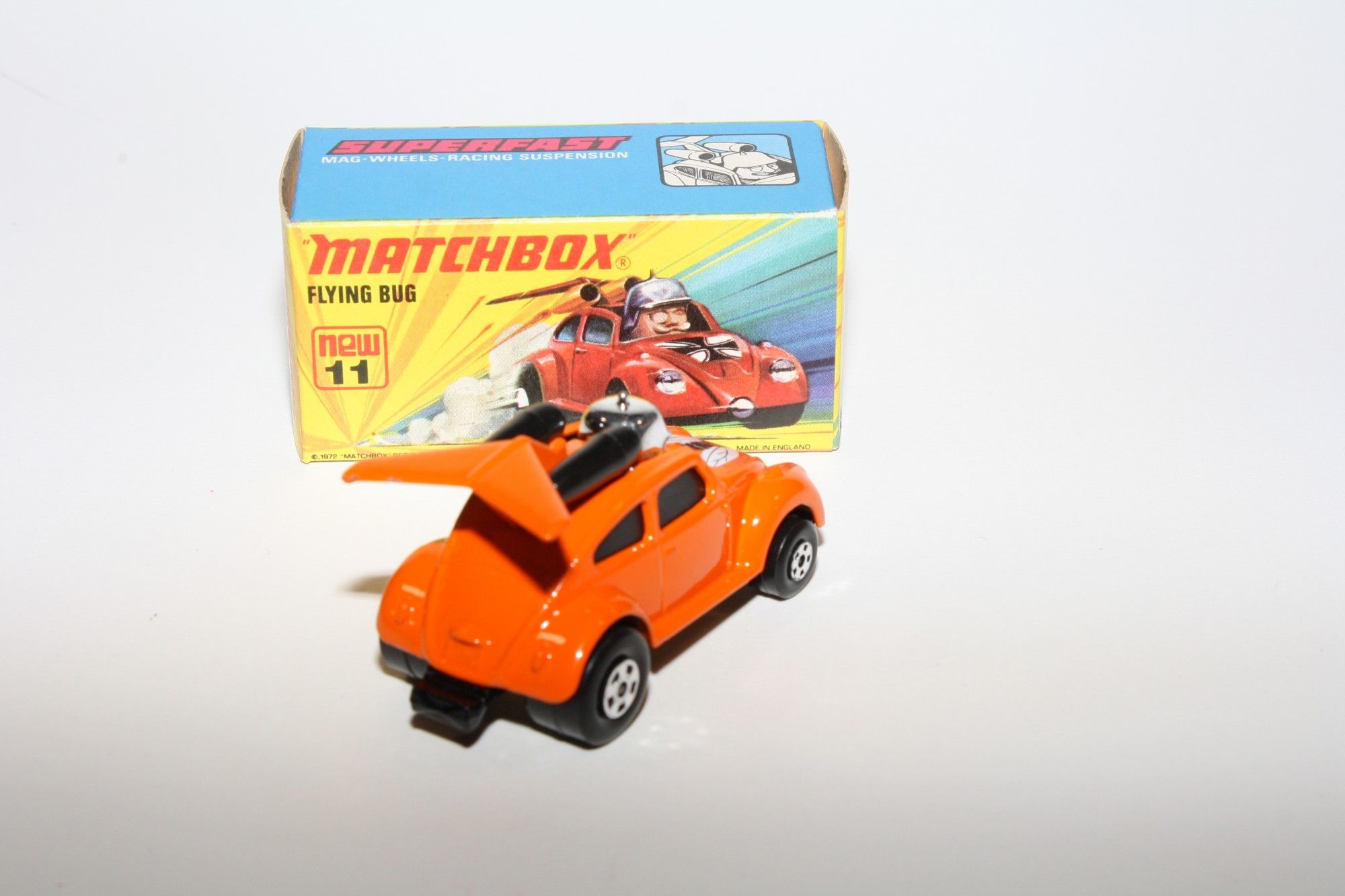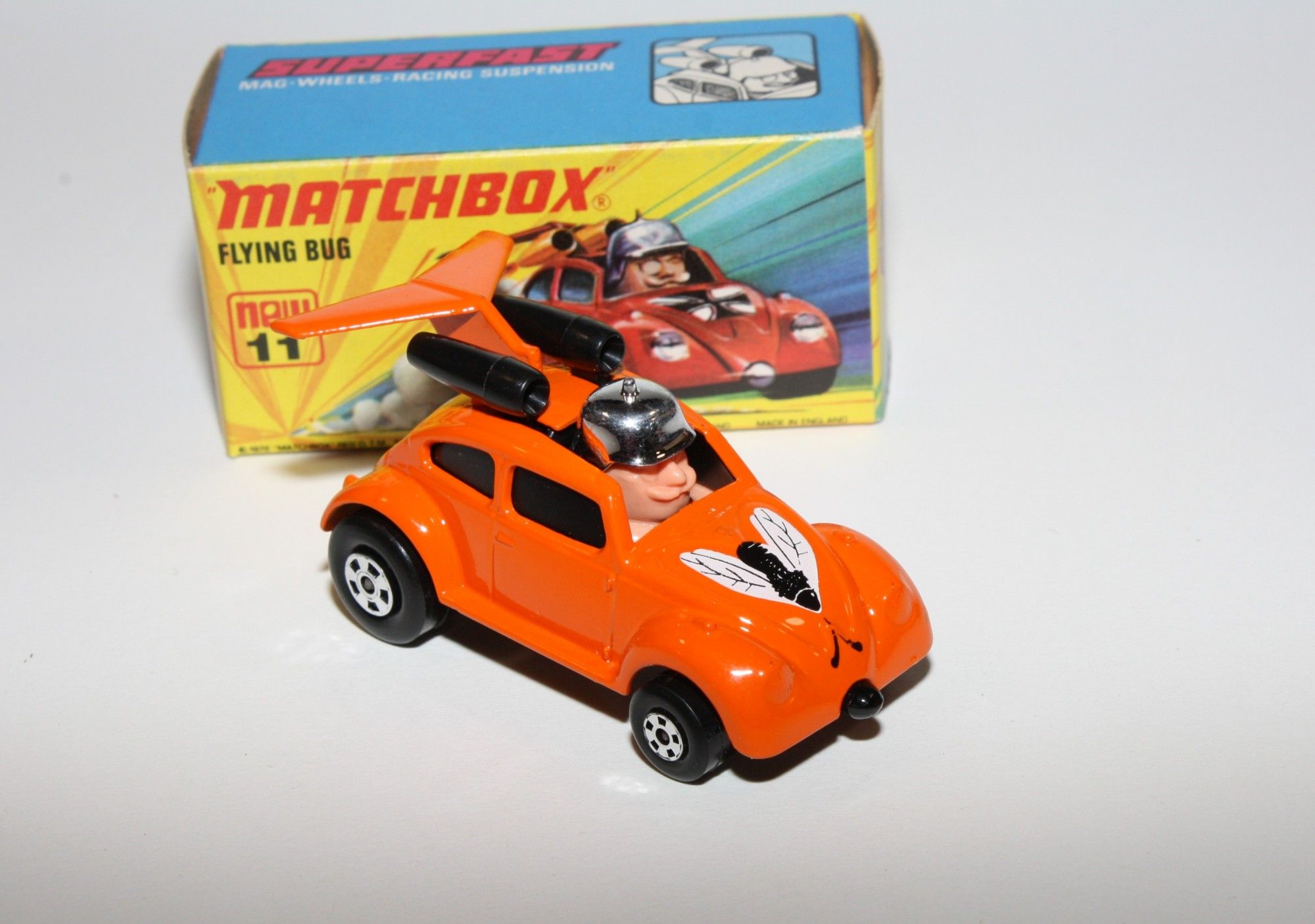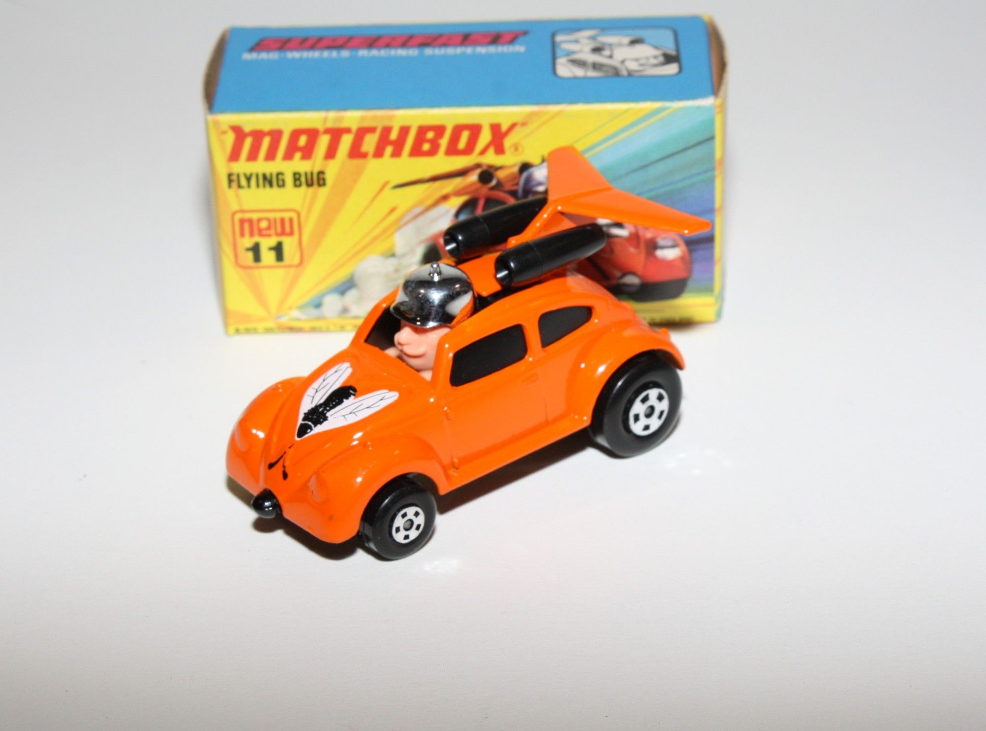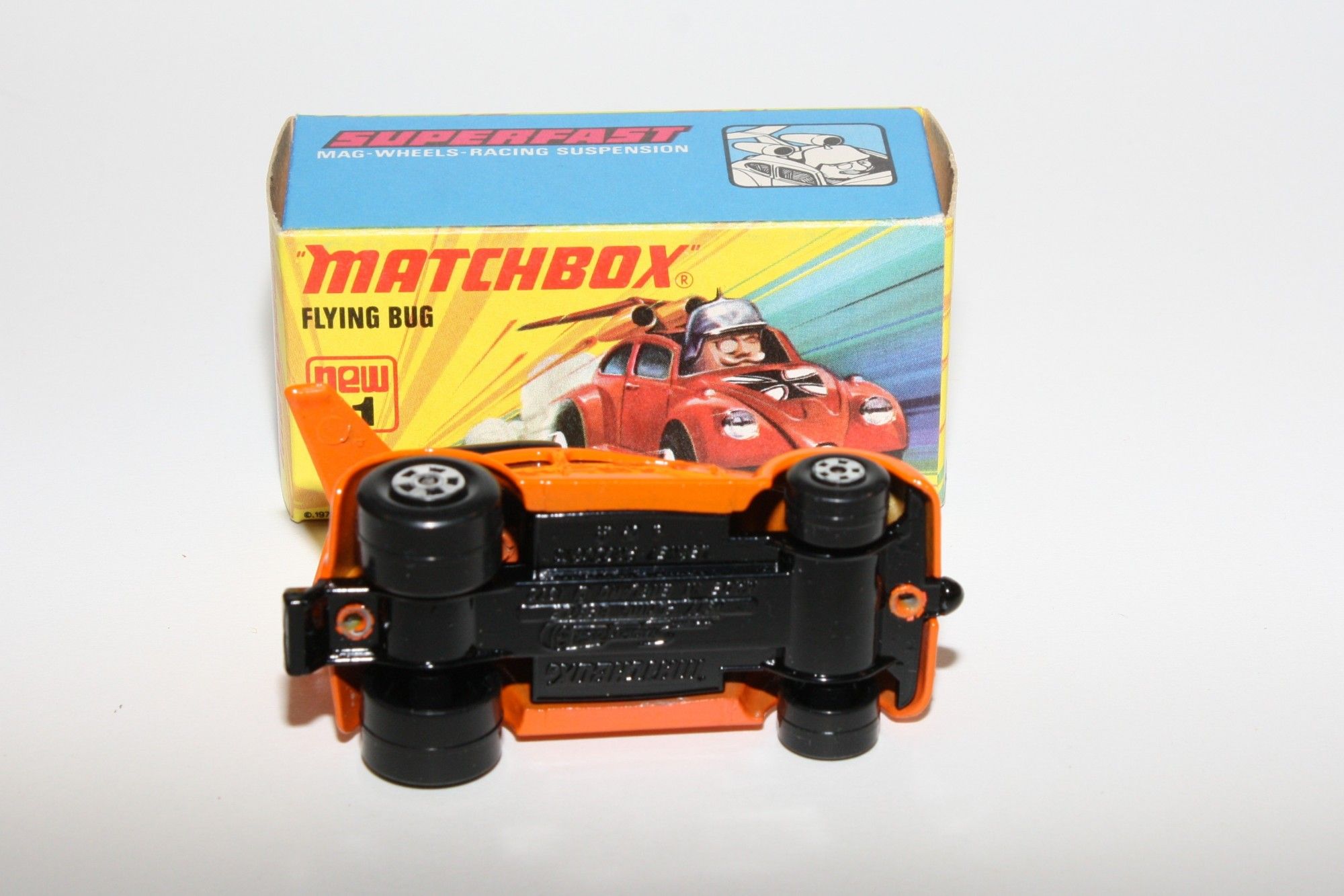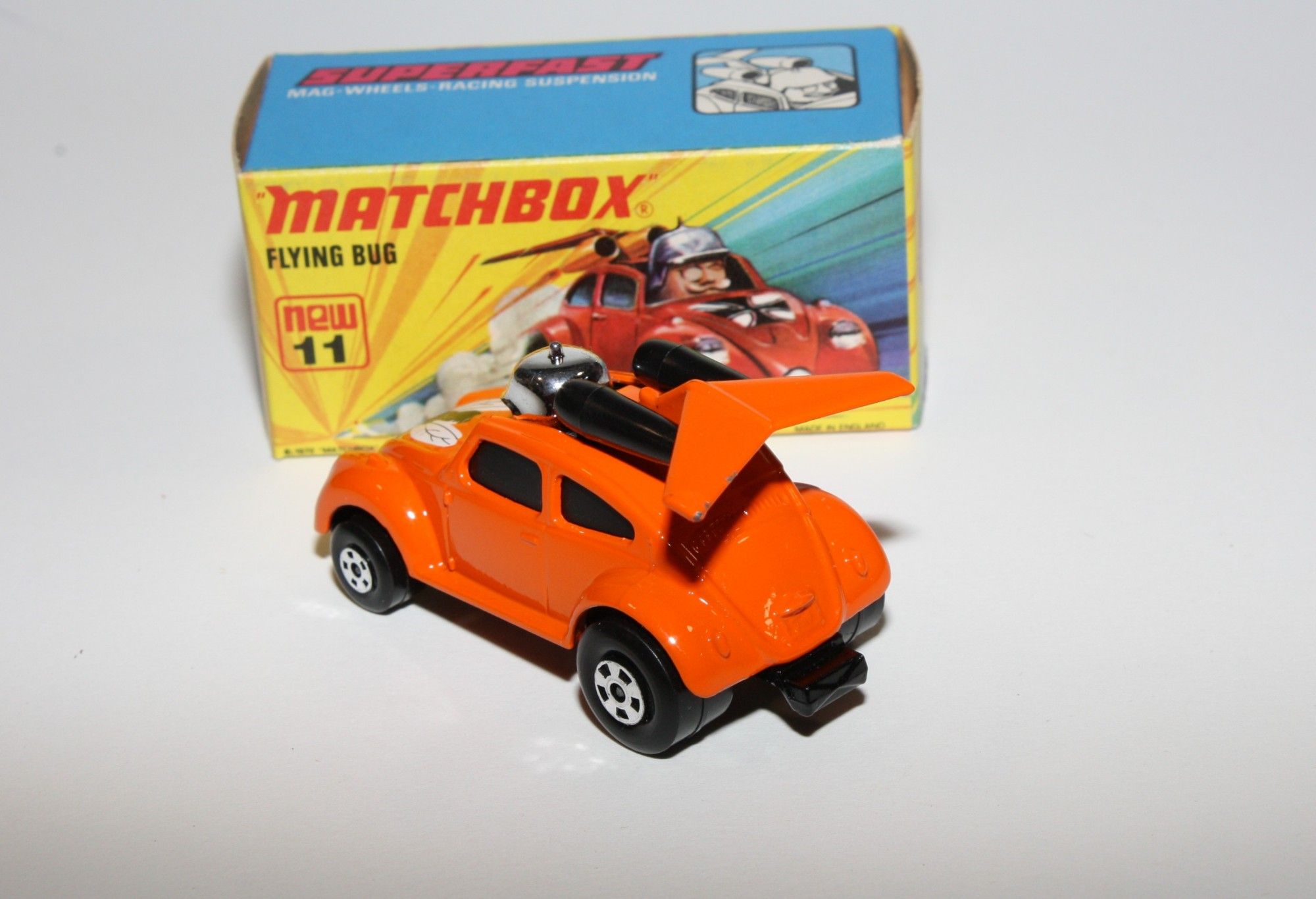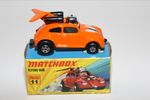 A stunning example of this 1970's Matchbox model. Gleaming orange paintwork, near mint condition, a couple fleabite nicks to rear spoile,r very hard to find Limited USA Edition, black windows, exhausts and flying beetle bonnet logo. Black base