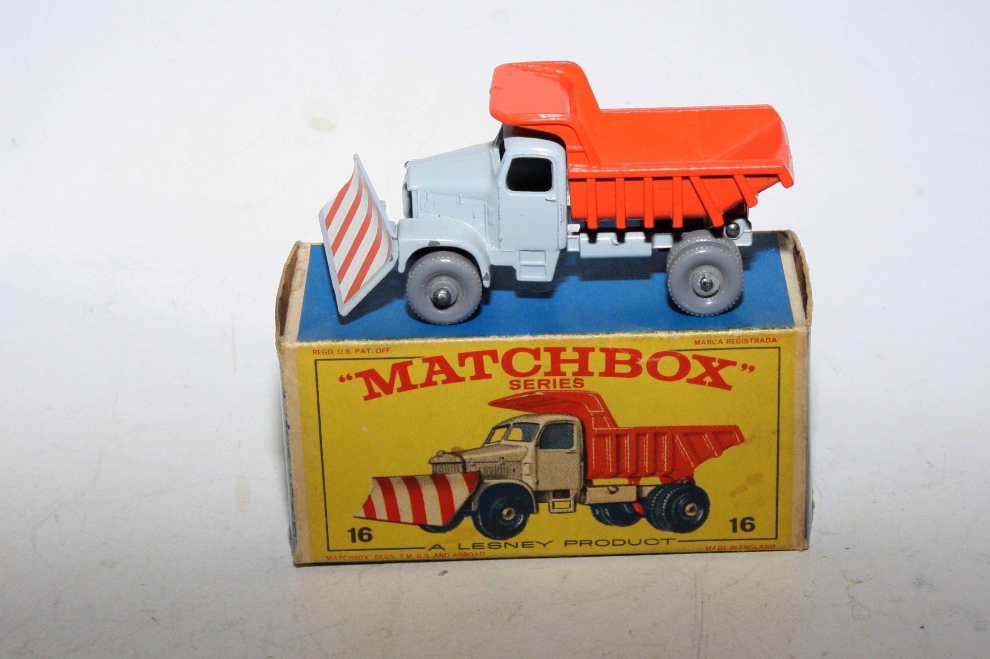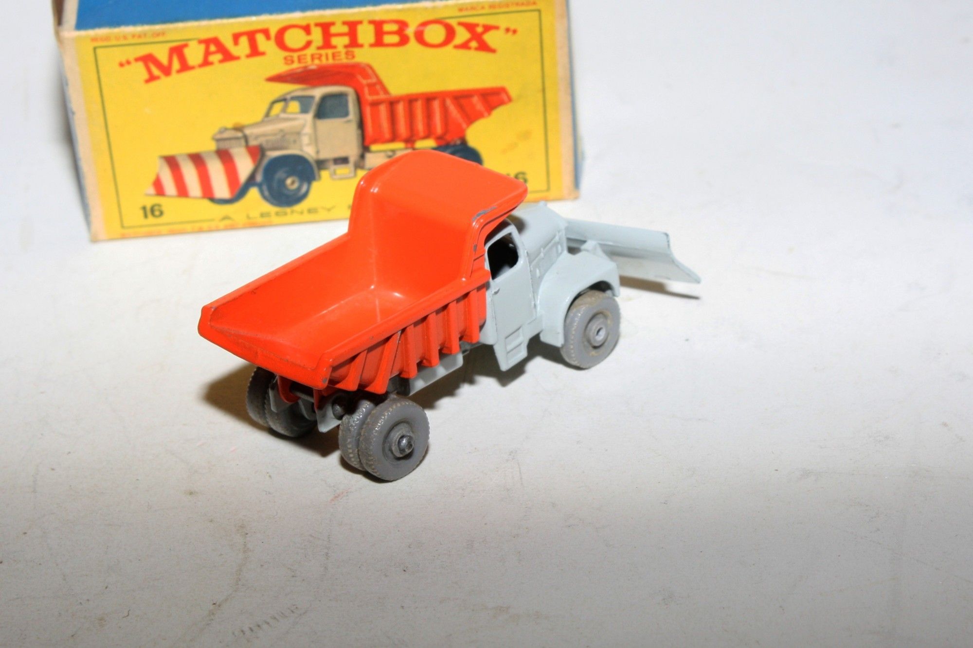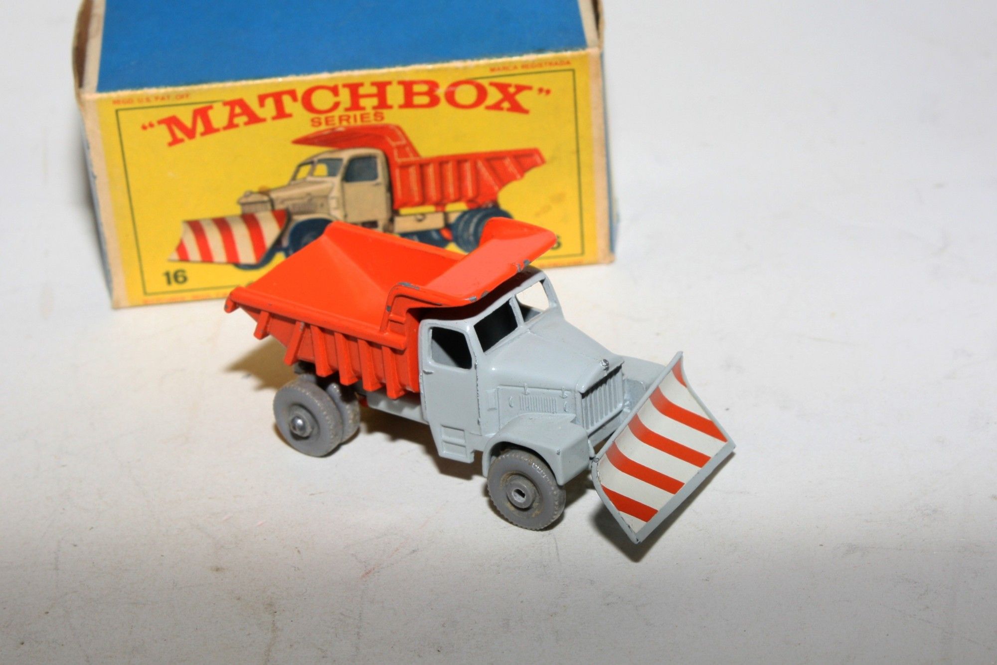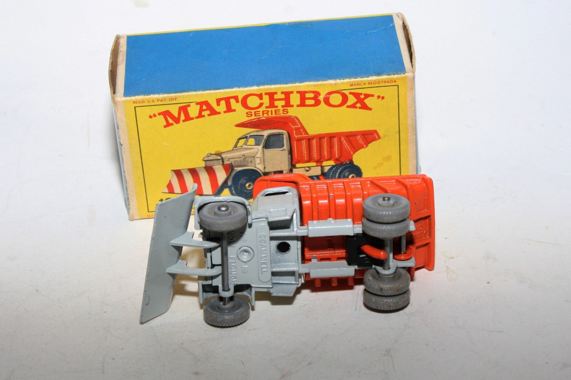 A stunning example of this hard to find early issue1960's Matchbox. Gleaming original grey & orange paintwork is near mint, some small chips to raised edges, please study the photos for exact condition. Rarer grey plastic wheels, perfect plough sticker, mint underside.