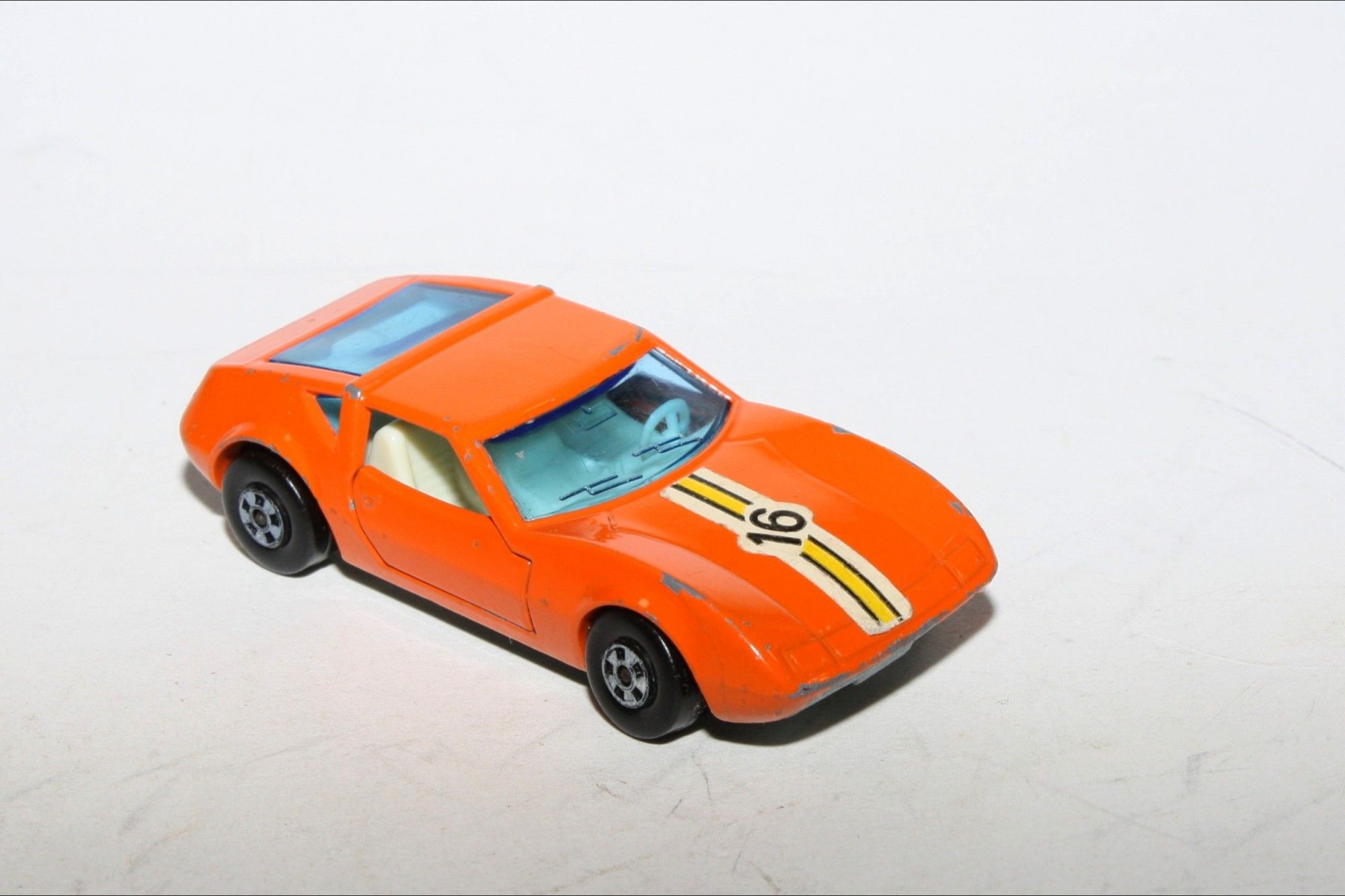 A superb example of this early 1970's Matchbox Superfast model. Part of a large collection bought as an investment in the 1970's and stored so never displayed. Gleaming original red paintwork is mint, please study the photos for exact condition. Superfast wheels, crystal clear windows, off white interior, perfect RN 8 decals,all free rolling, unpainted base