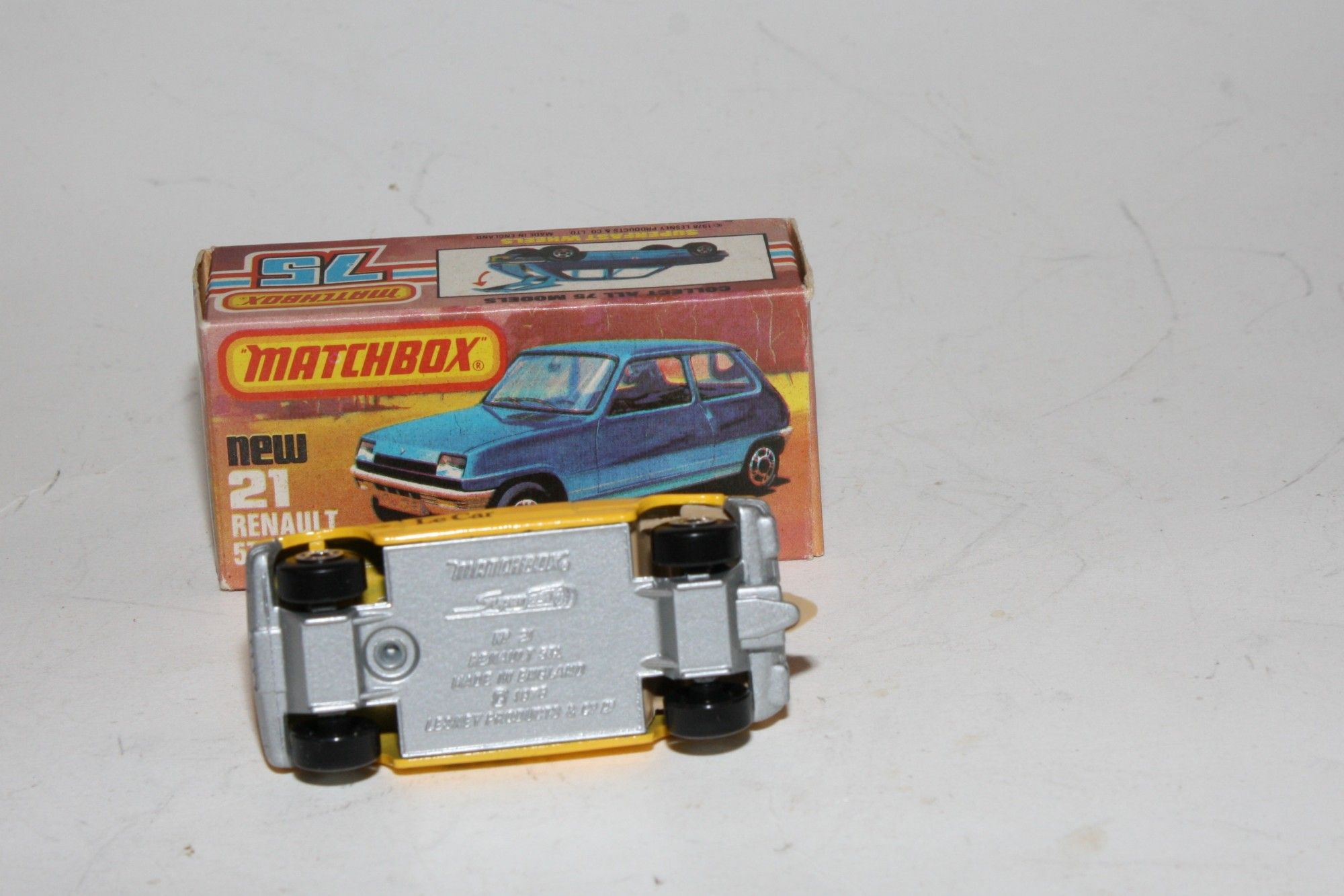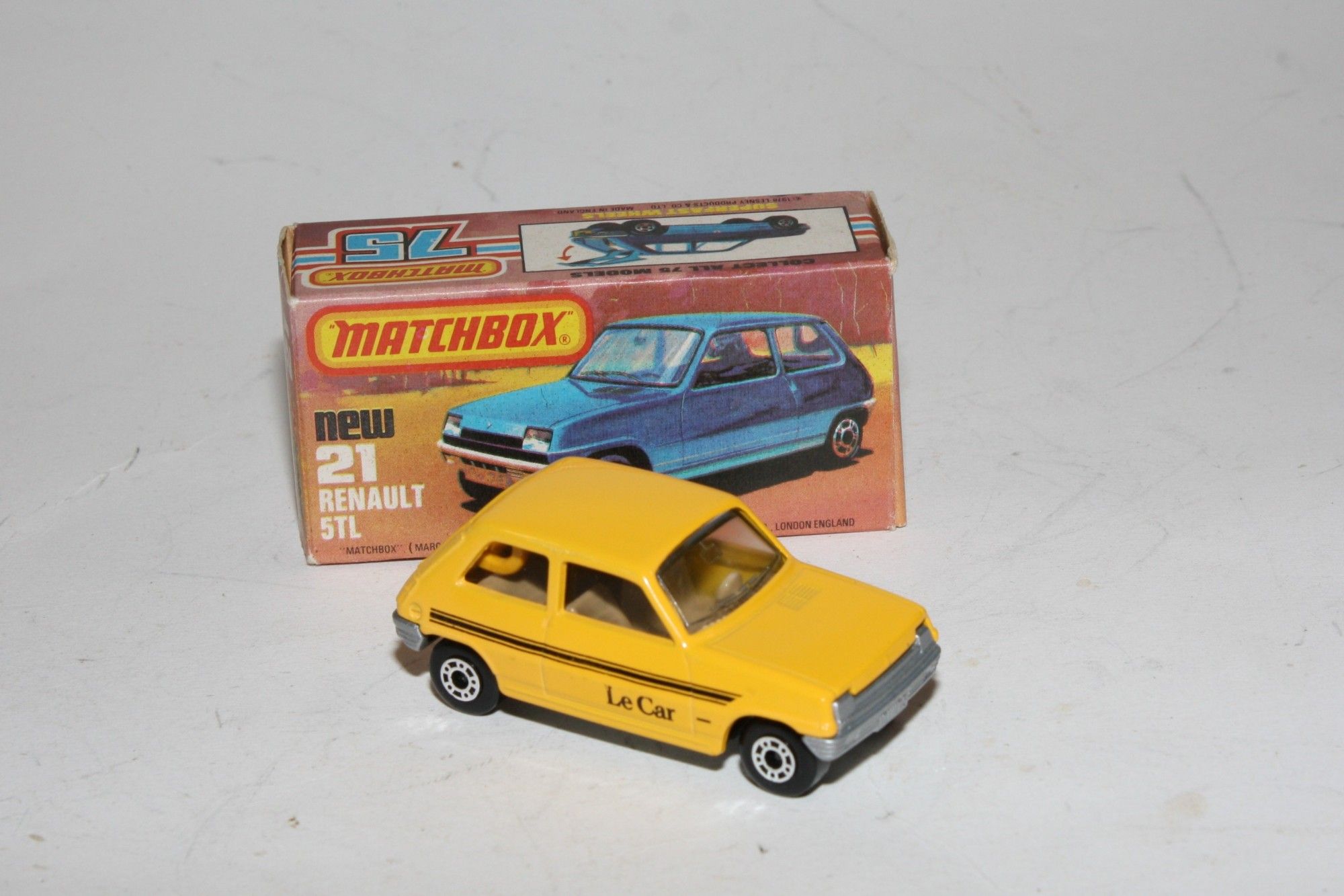 A superb example of this 1970's Matchbox Superfast model. Part of a large collection bought as an investment in the 1970's and stored so never displayed. Gleaming original yellow paintwork is mint, please study the photos for exact condition. Superfast wheels, crystal clear windows, mint Le Car decals, tan interior, all free rolling, silver base
