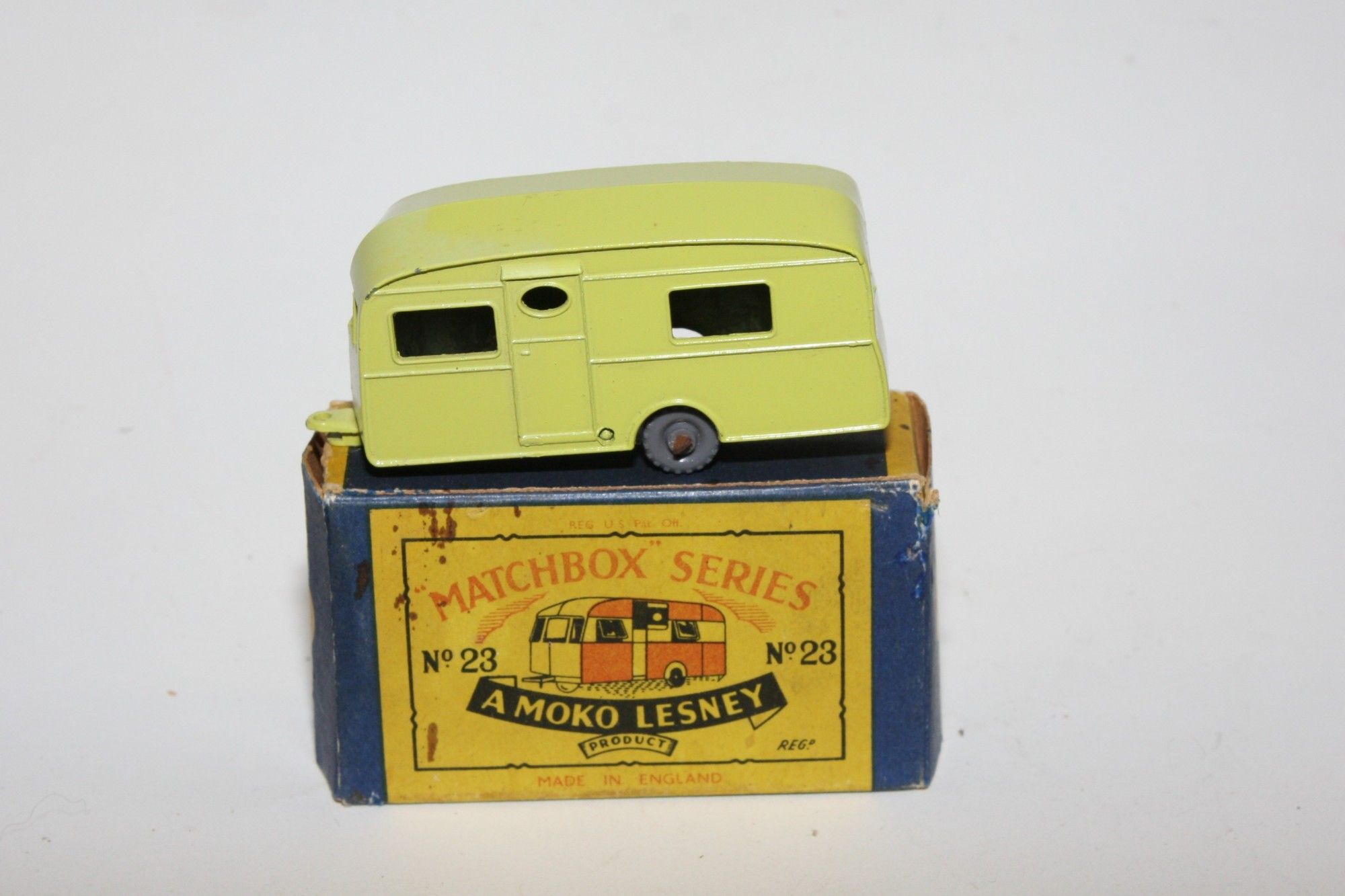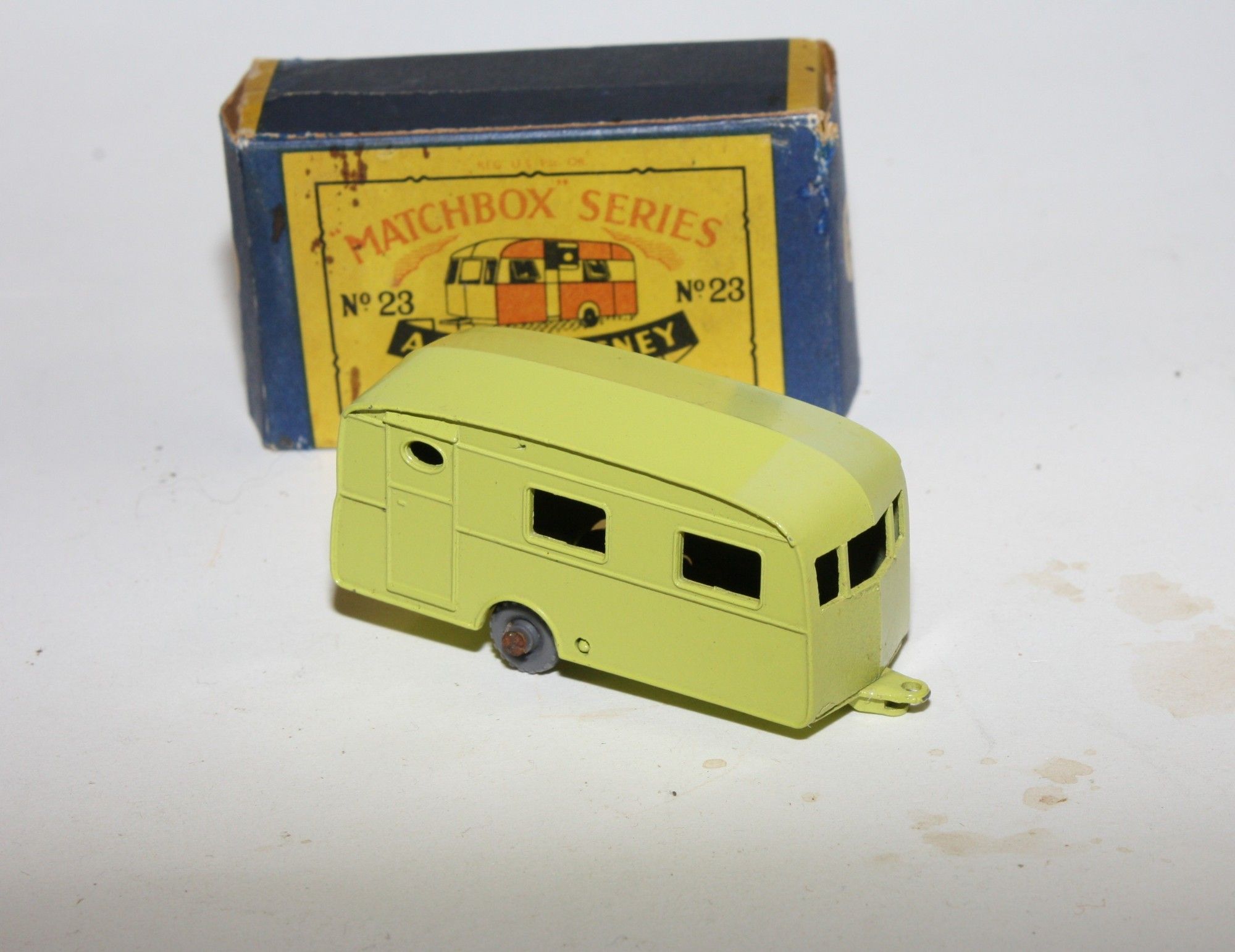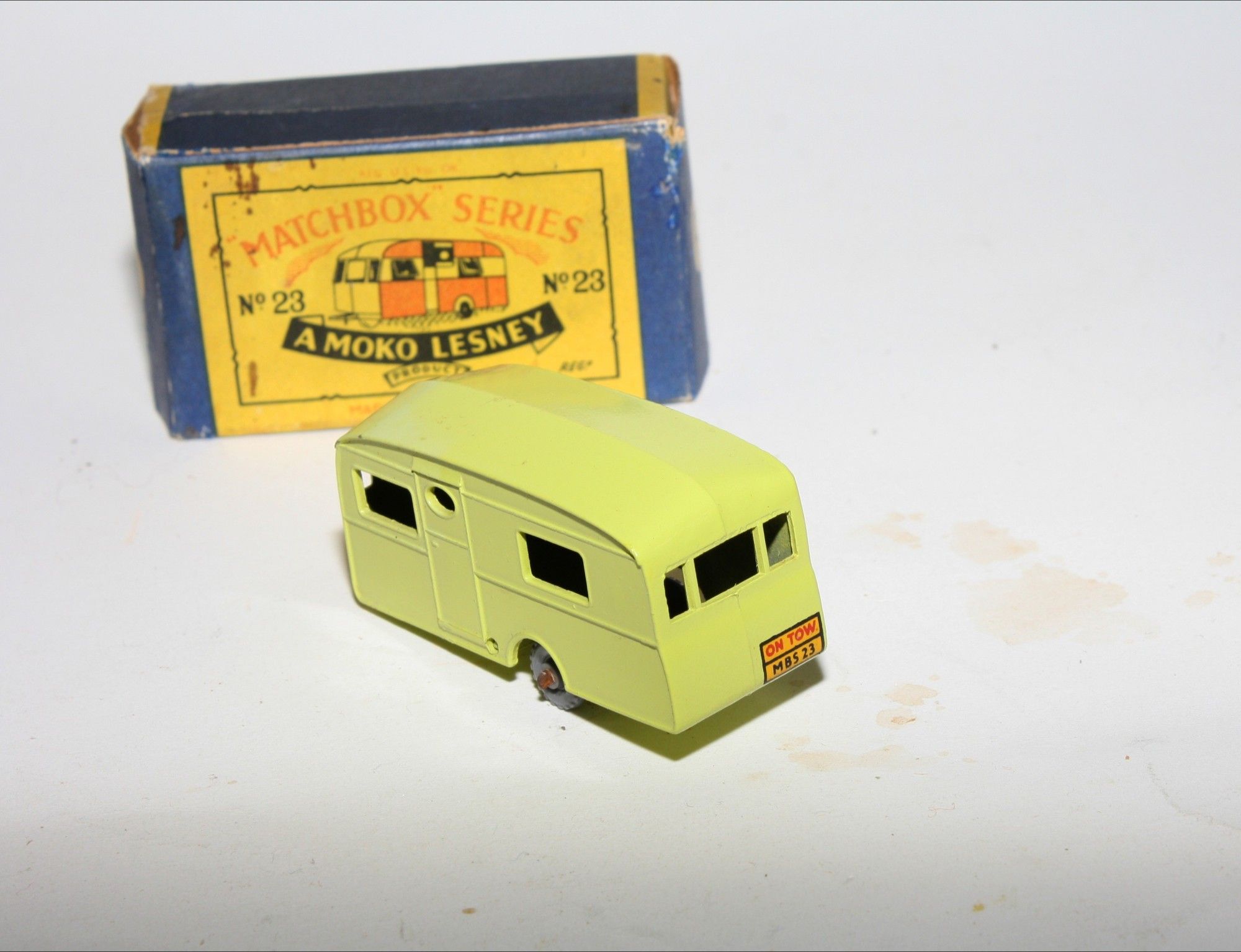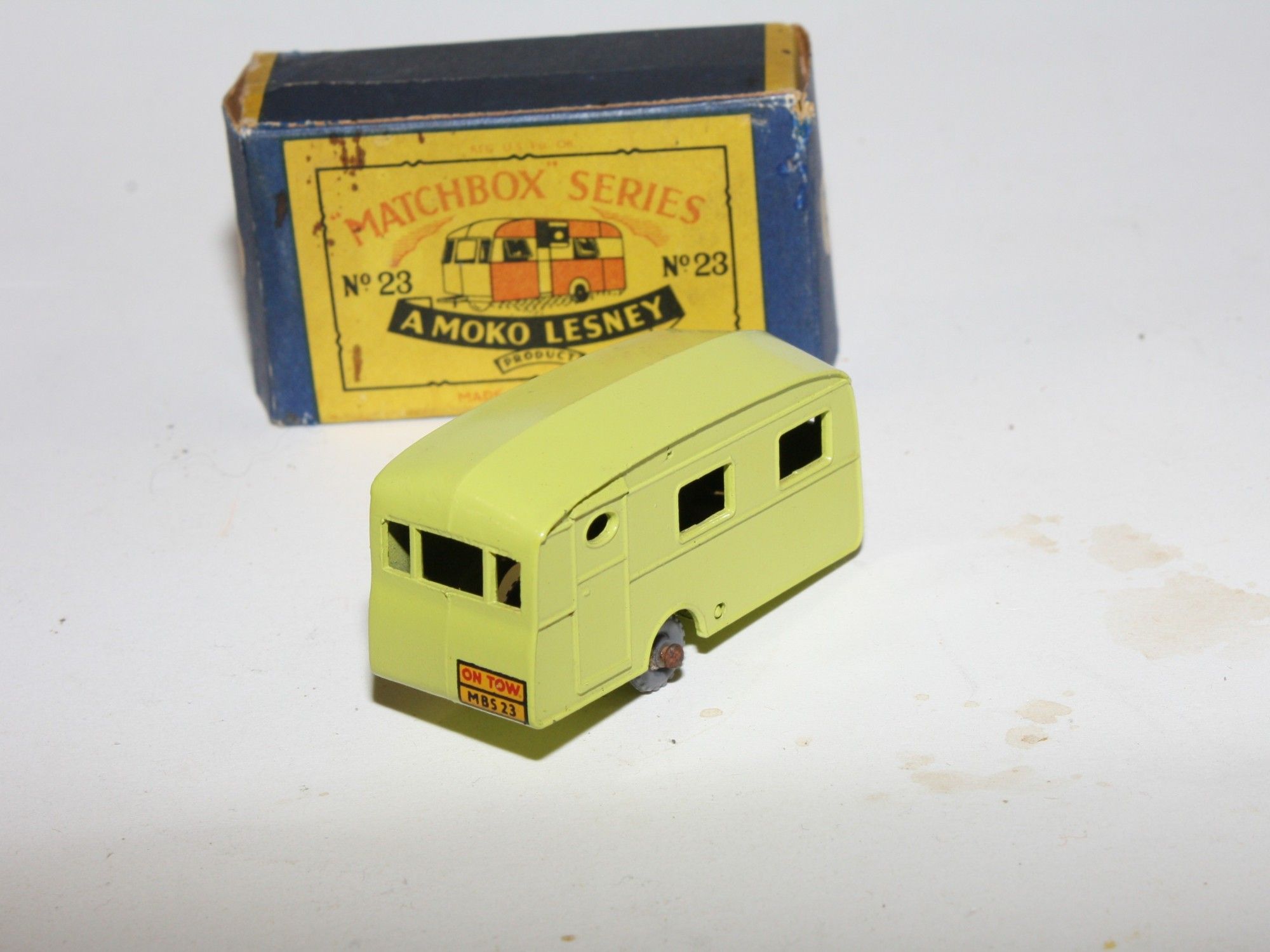 A lovely example of this harder to find 1950's Matchbox model. Gleaming original lime paintwork is virtually mint, just a couple of fleabites, please study the photos for exact condition. GPW, a little surface rust to axel, perfect original On Tow decal, tow bar intact and excellent underside.