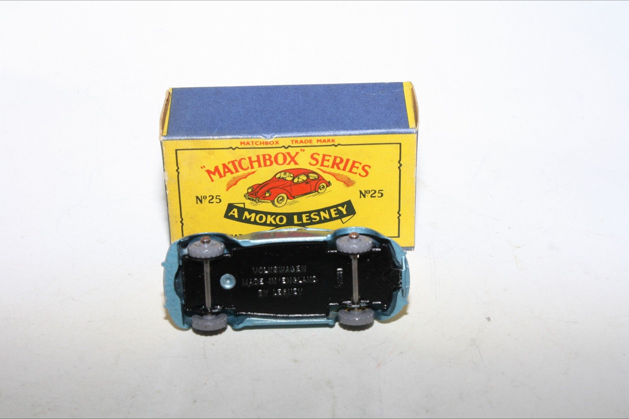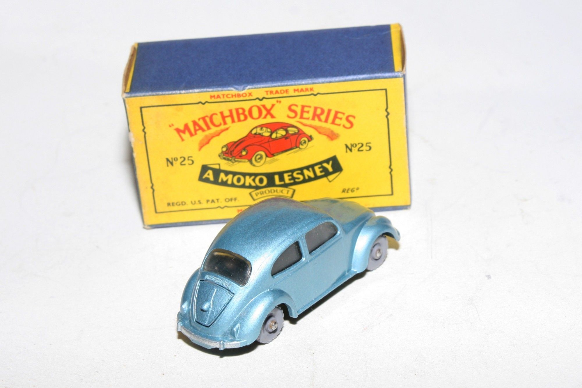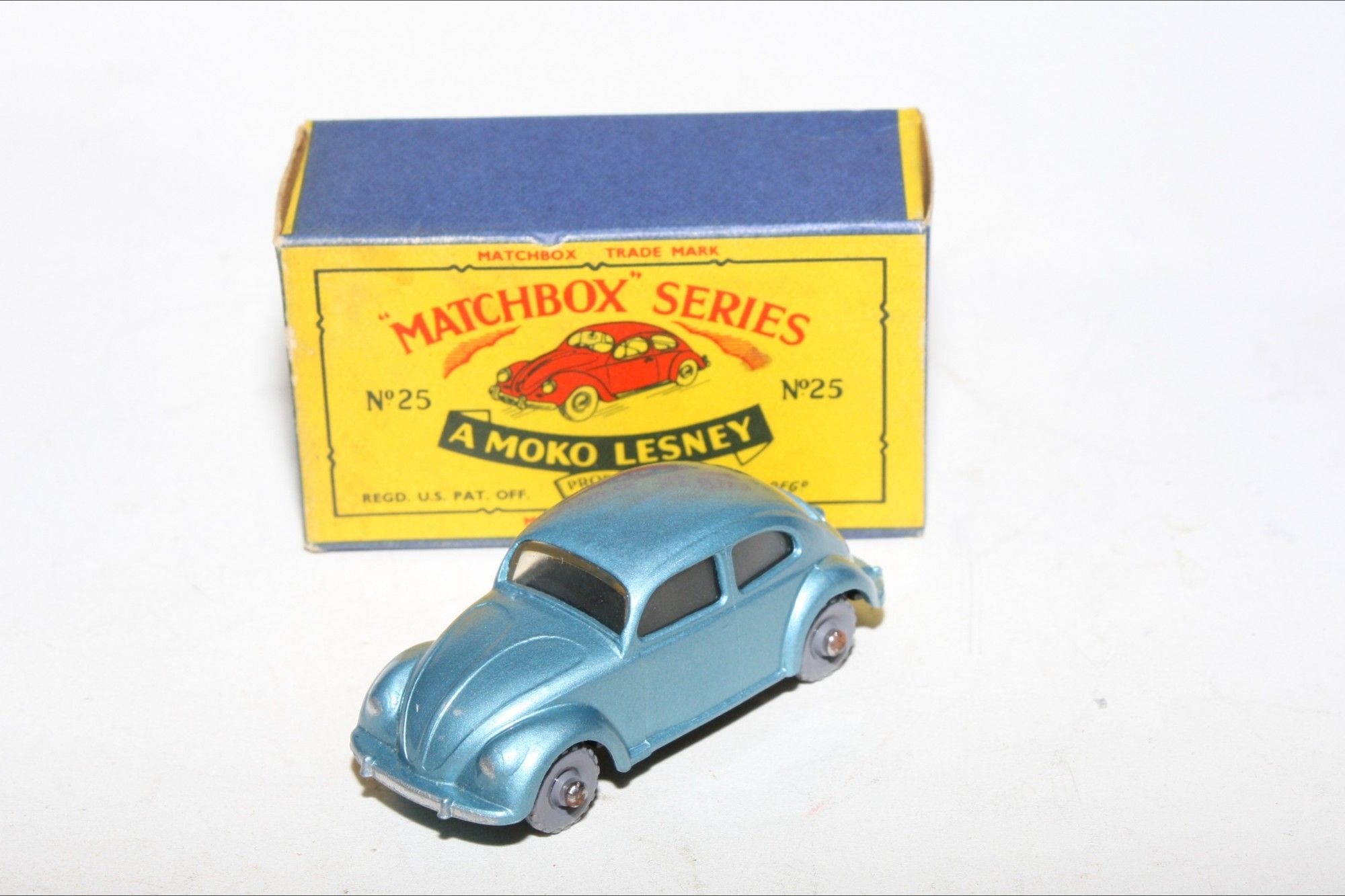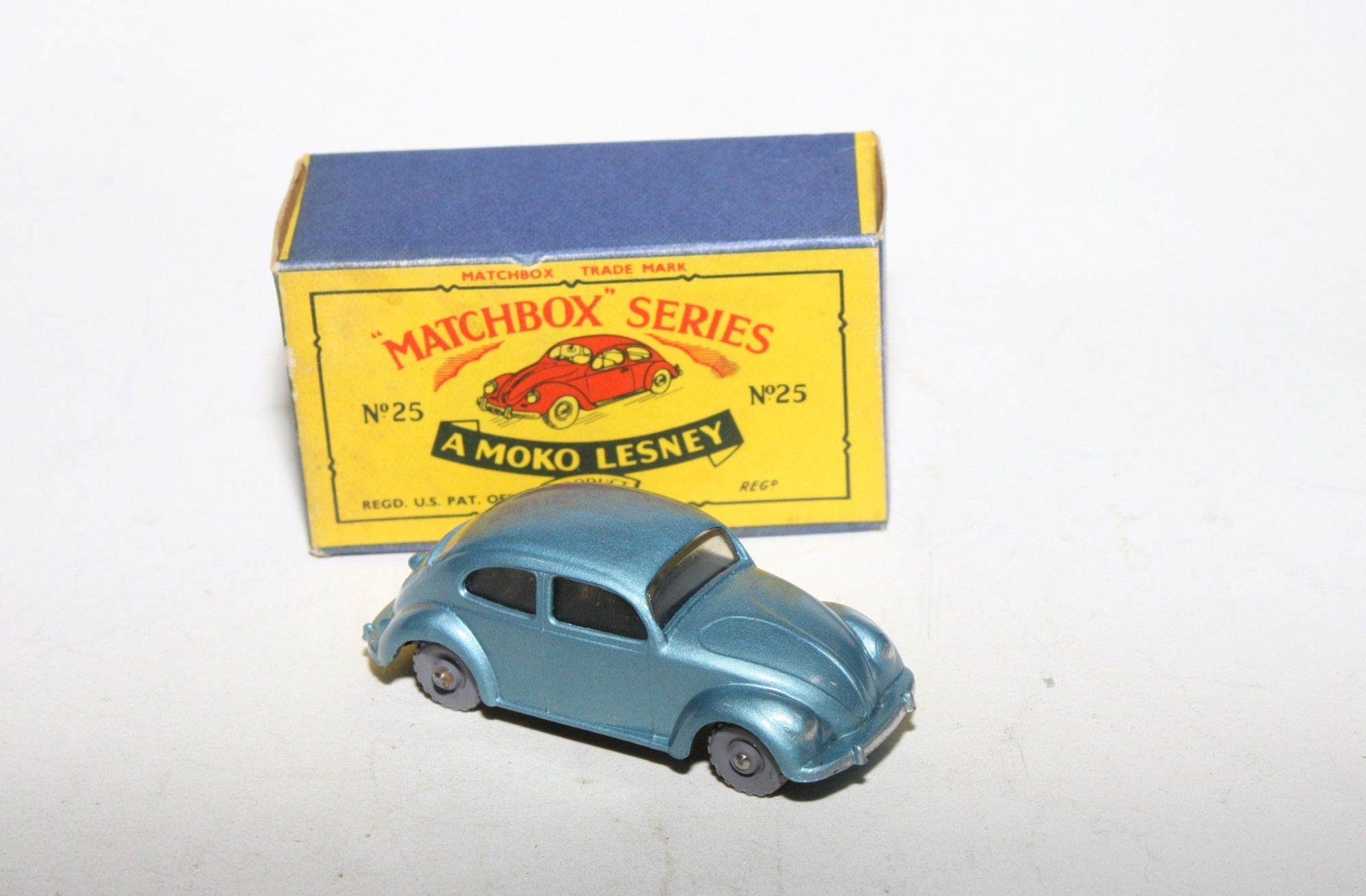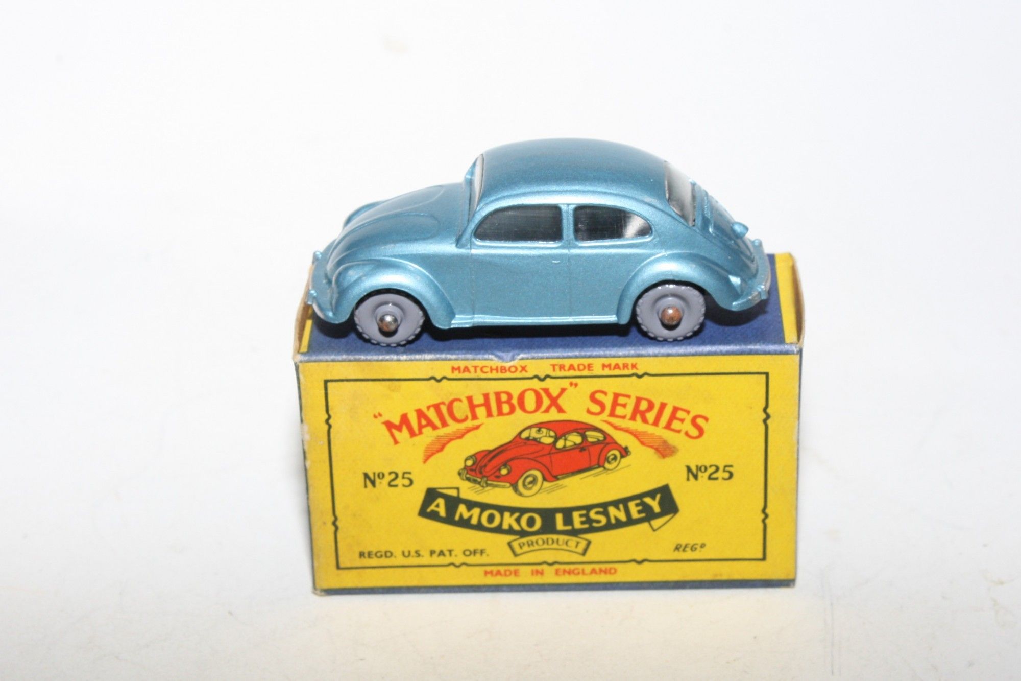 A stunning example of this hard to find early issue1960's Matchbox. Gleaming original silver blue metallic paintwork is mint, please study the photos for exact condition. KGPW, clear winows, must be one of the best available.