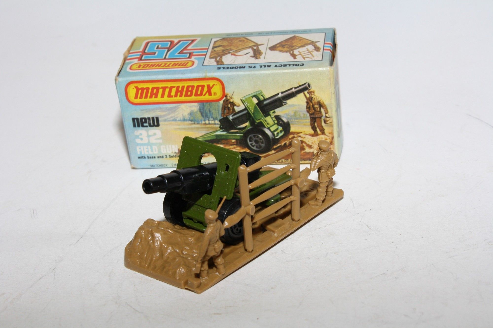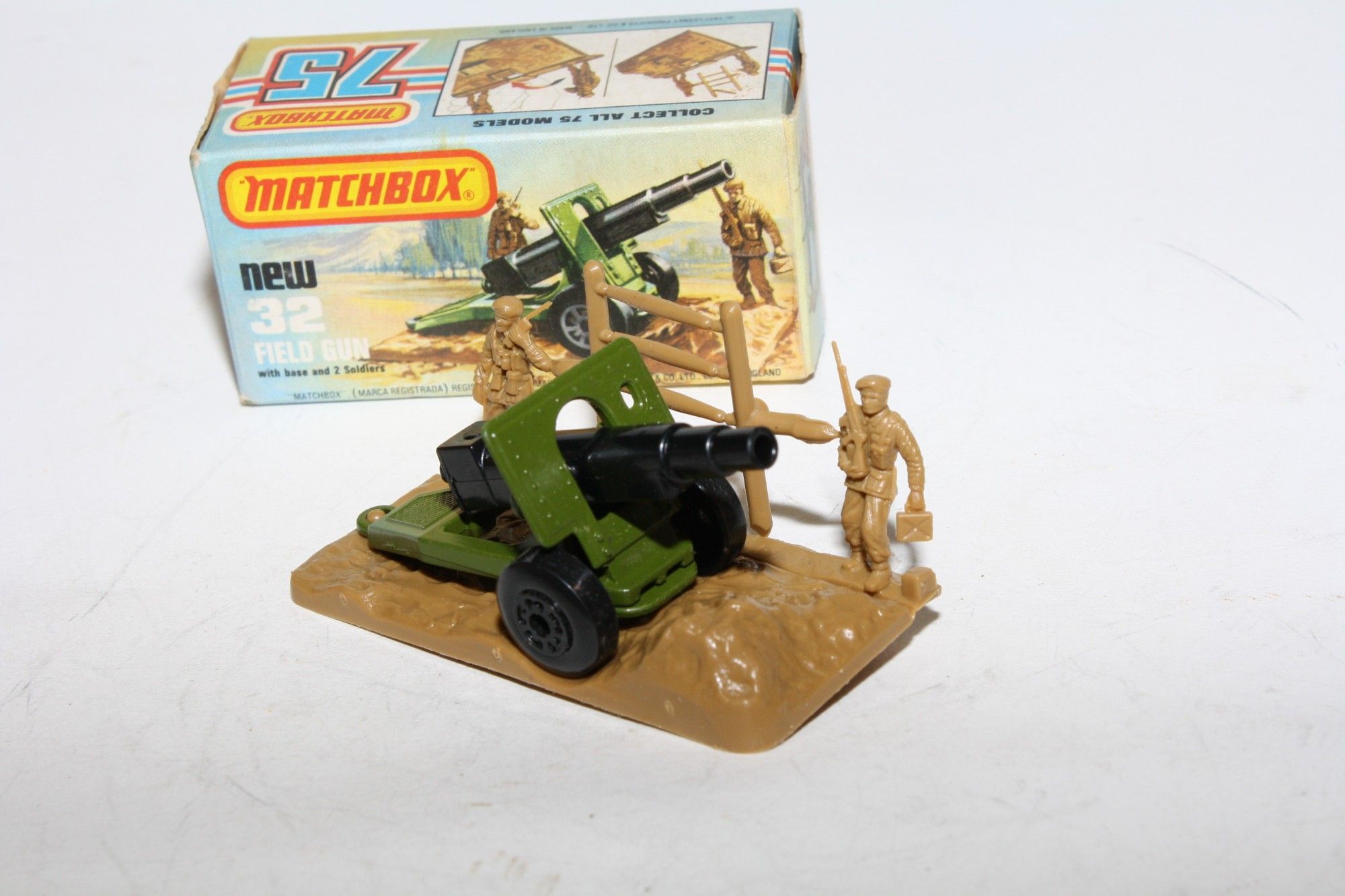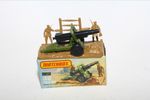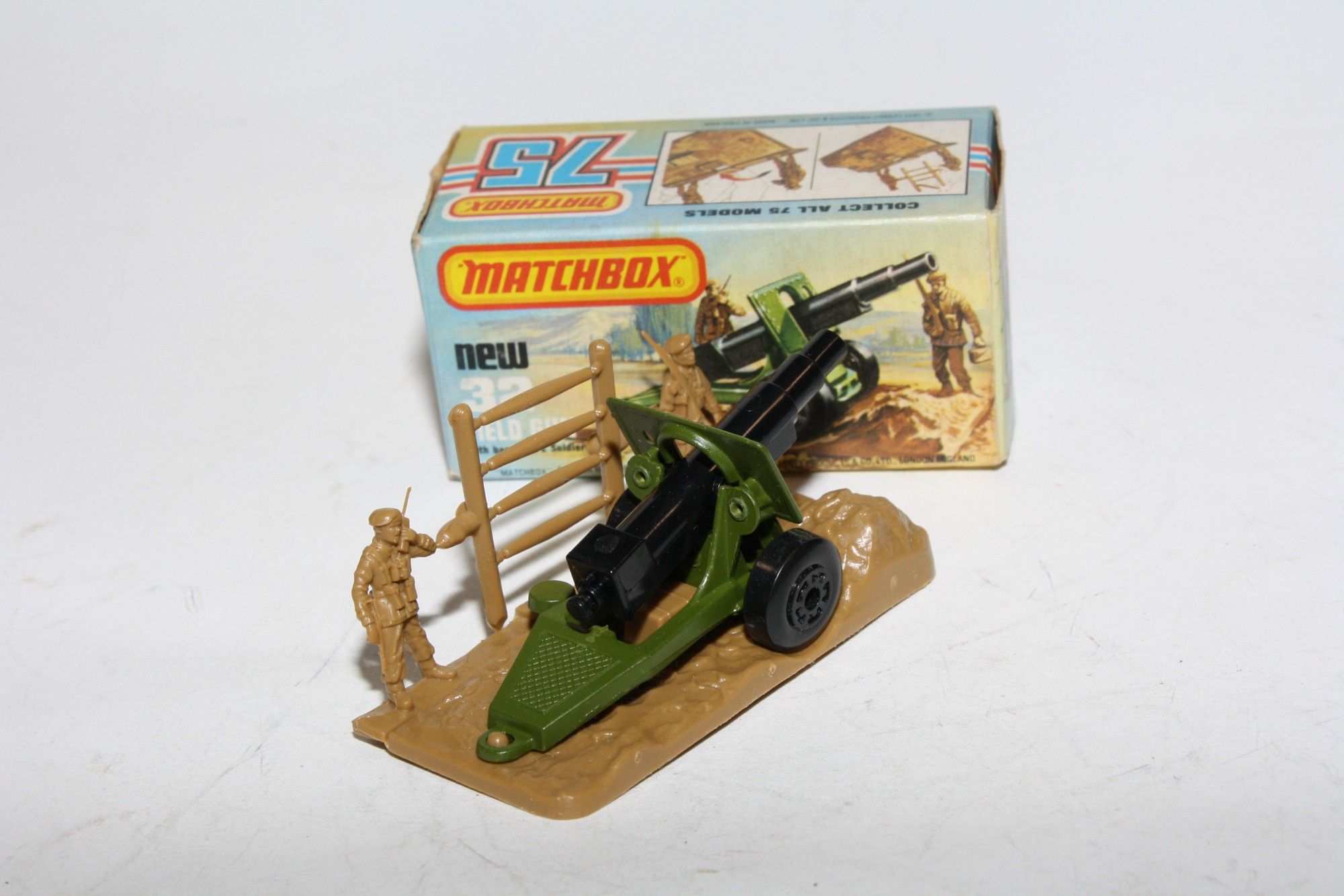 A superb example of this Matchbox military model. Green metal is perfect with black plastic wheels and barrel. Please study the photos for exact condition. Complete with plastic base, two figures and 4 missiles attached to sprue.