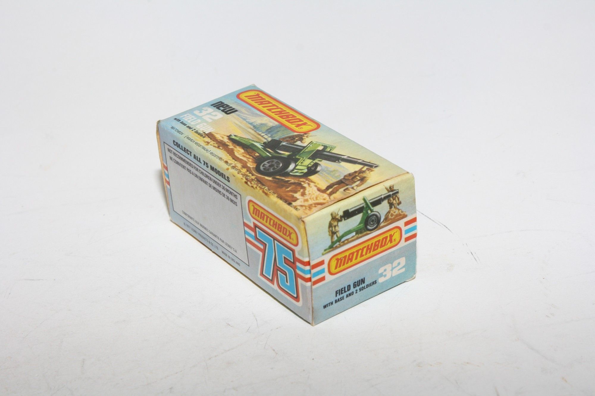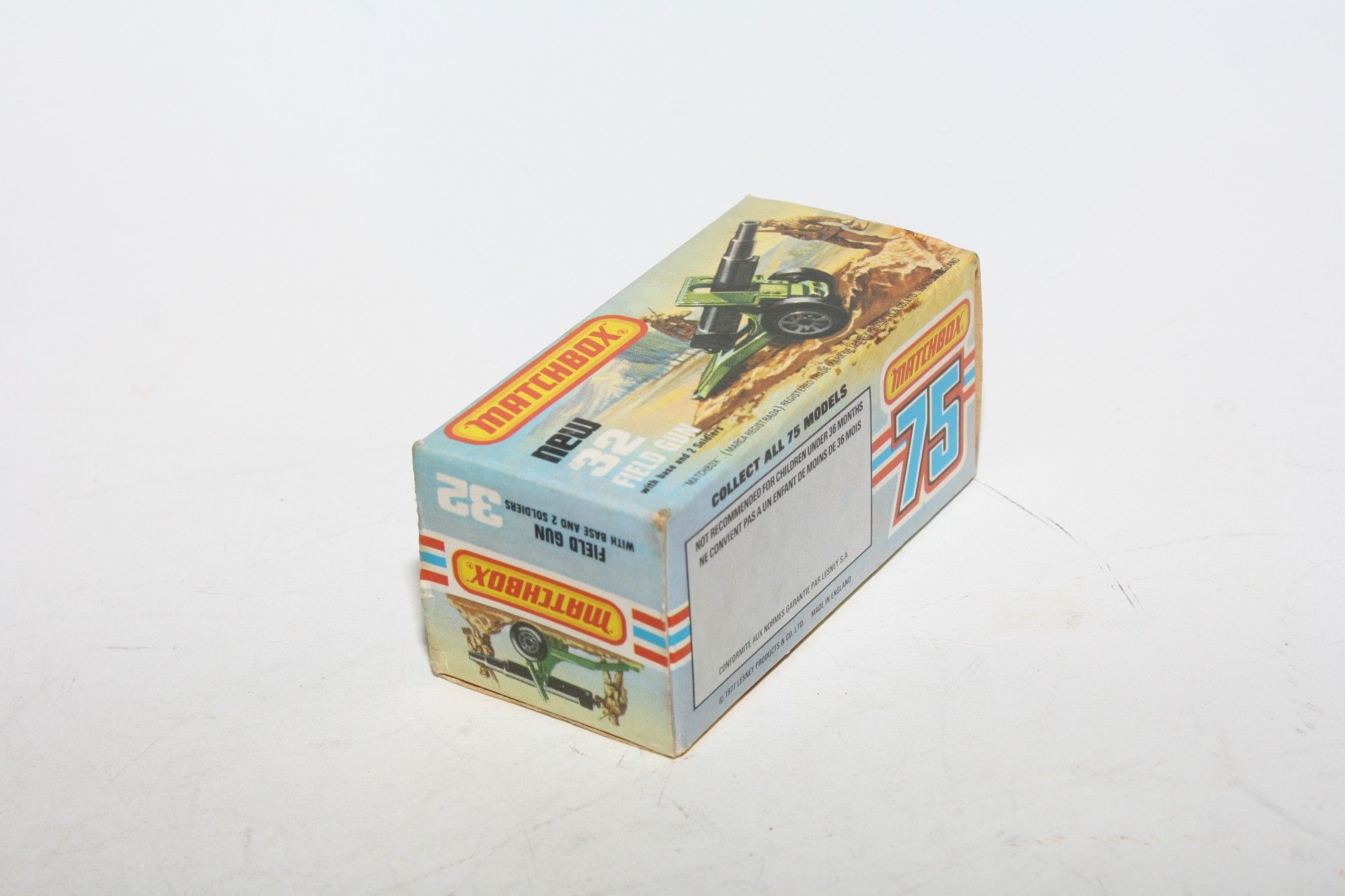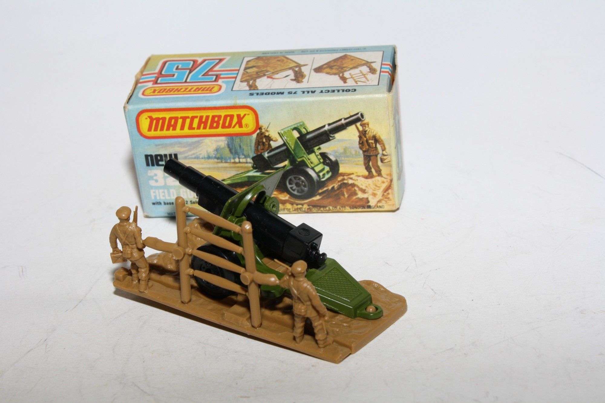 A superb example of this Matchbox military model. Green metal is perfect with black plastic wheels and barrel. Please study the photos for exact condition. Complete with plastic base, two figures and 4 missiles attached to sprue.