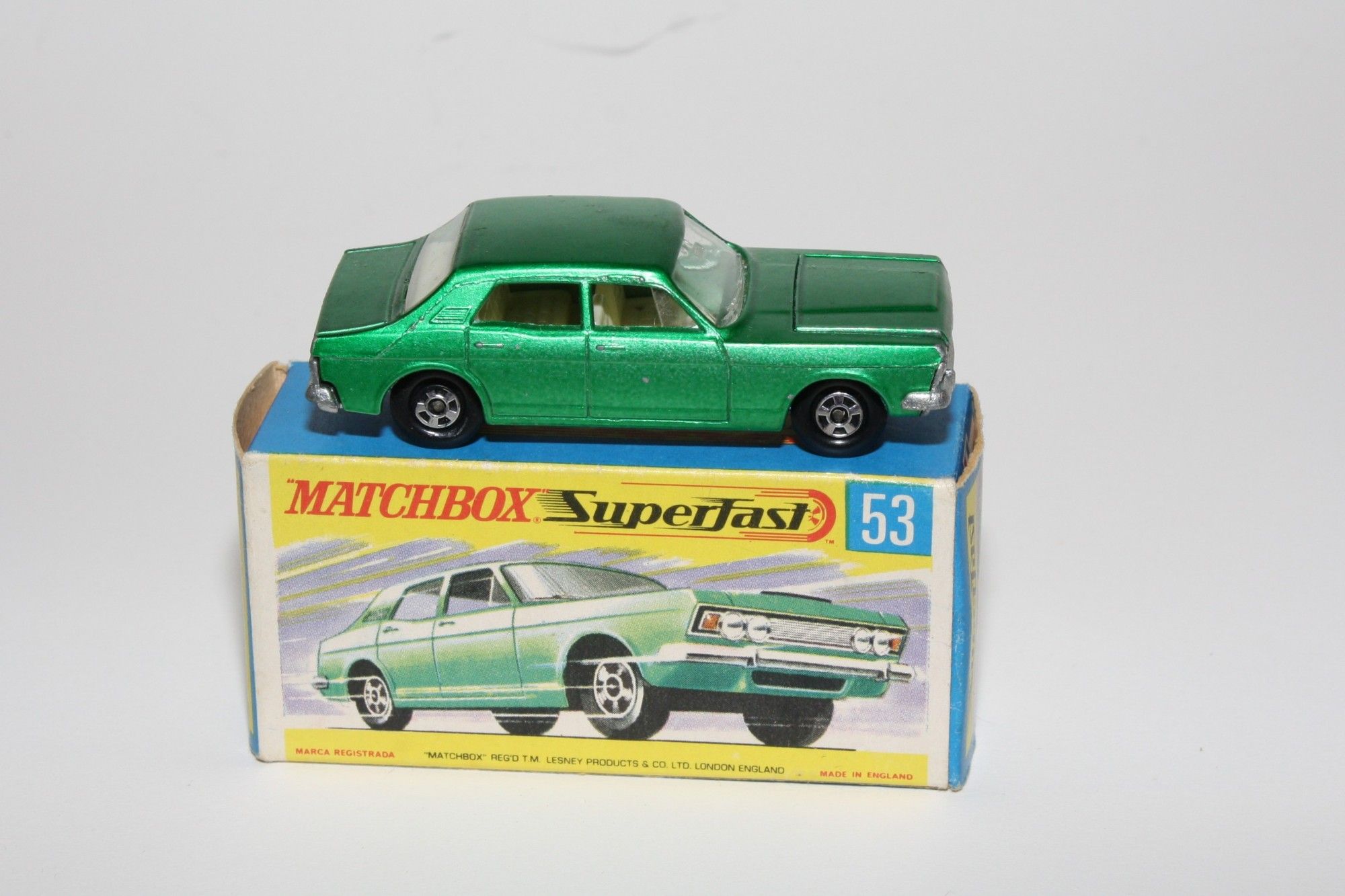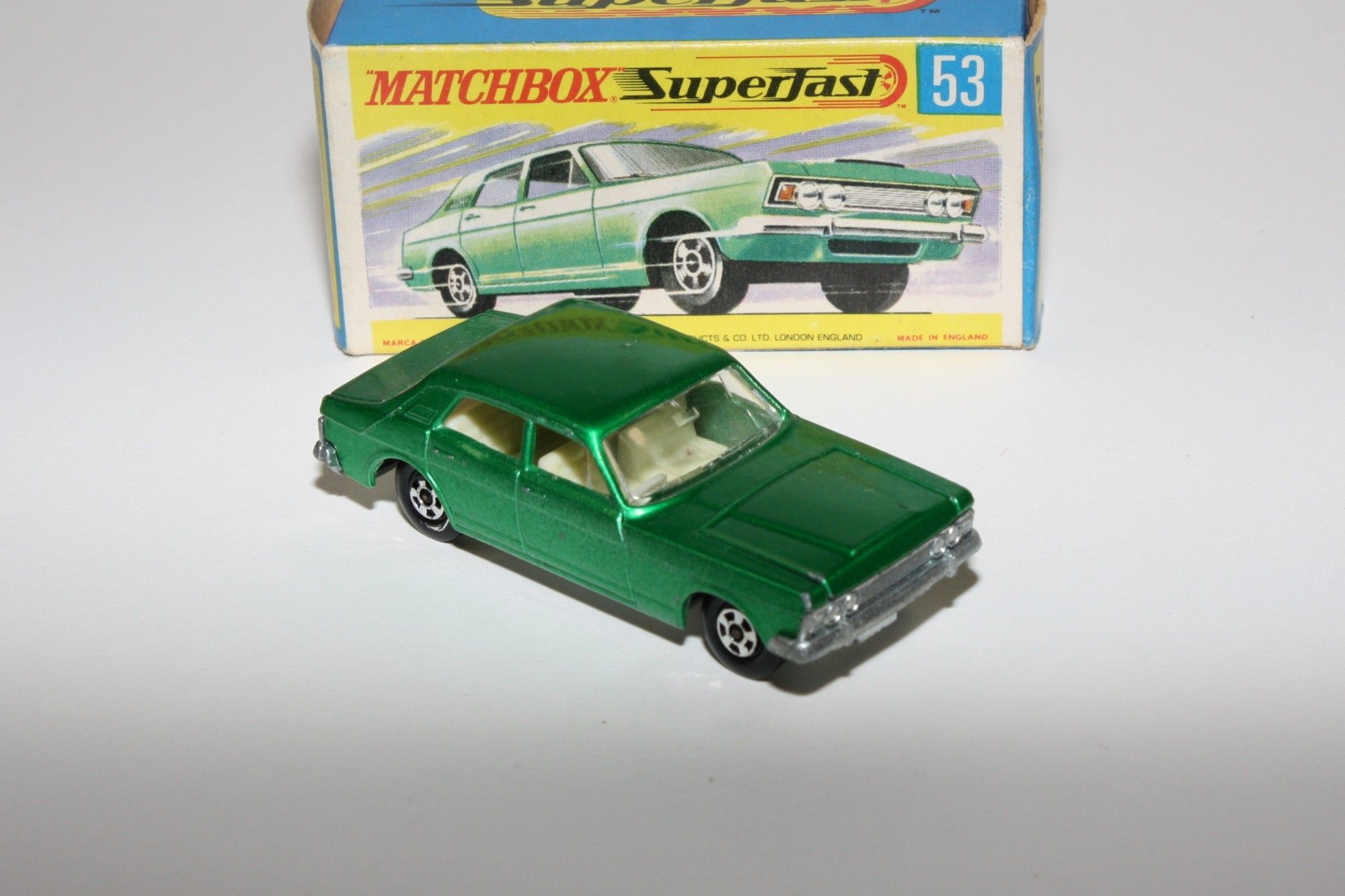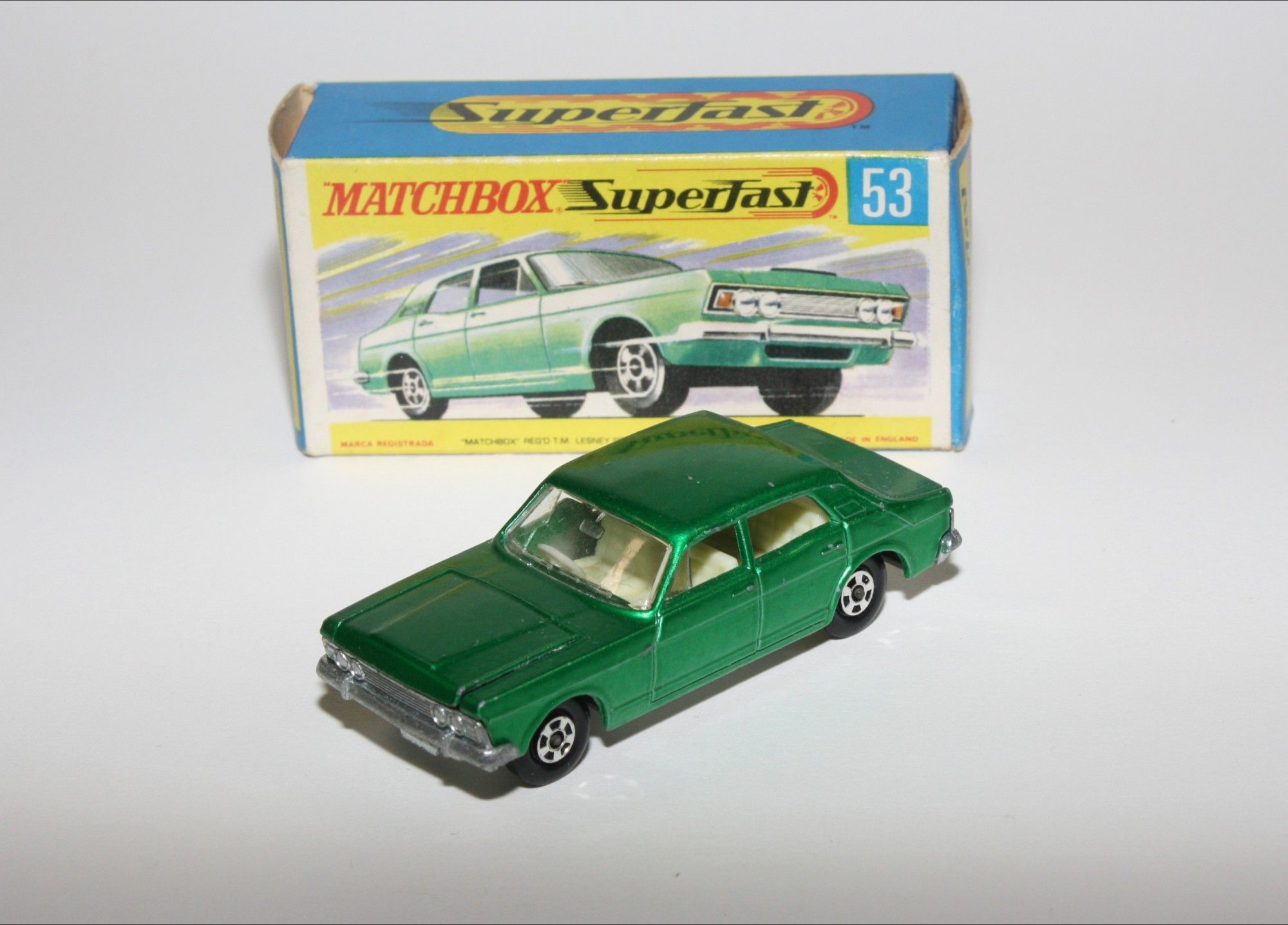 A nice example of this early 1970's Matchbox model. Original harder to find darker green metallic paintwork is near mint with just a few fleabite blister nicks, please study the photos for exact condition. Superfast wheels all free rolling, strong suspension, crystal clear windows with white interior. Excellent unpainted underside.