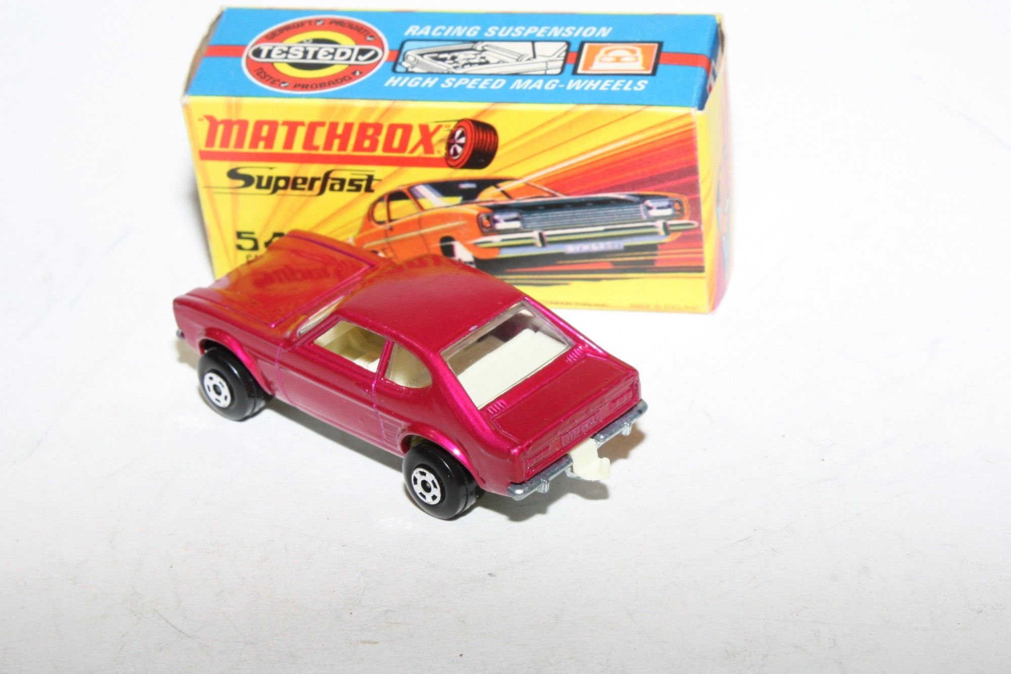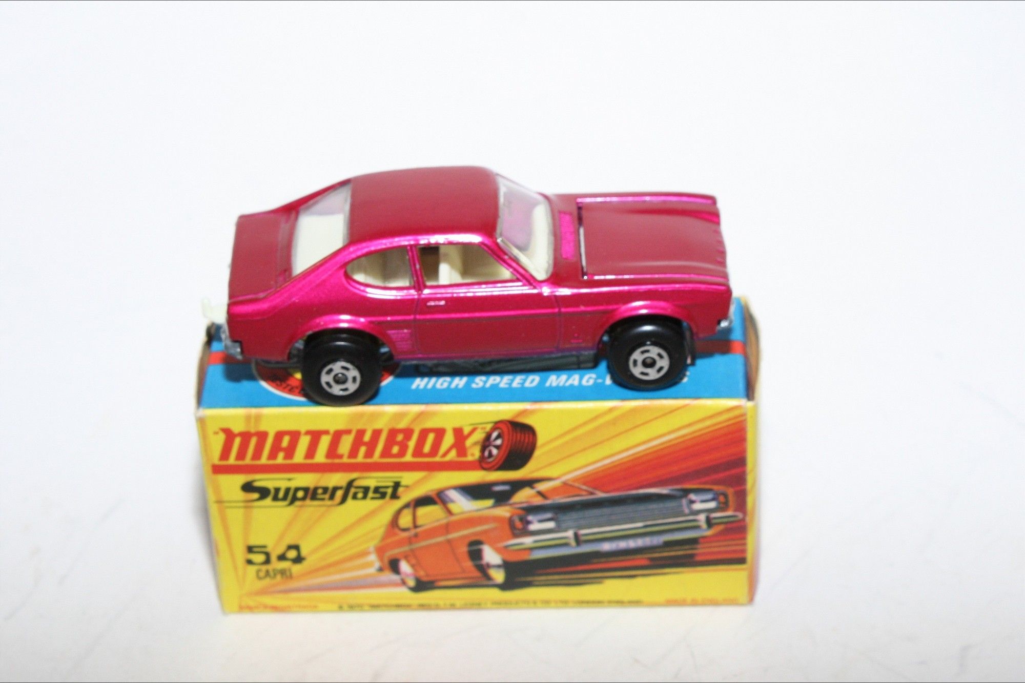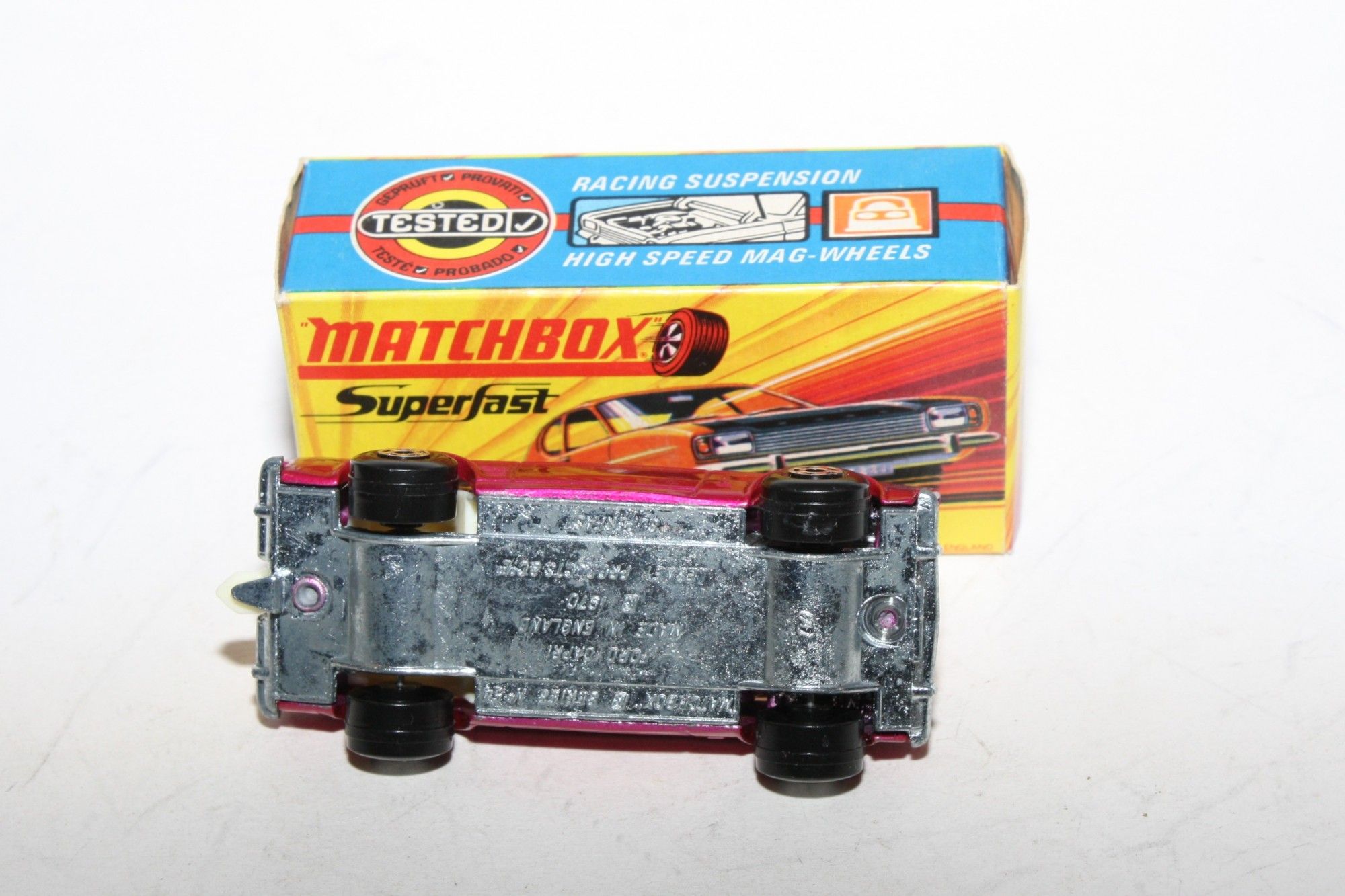 A superb example of this Matchbox model. Gleaming original metallic purple paintwork is mint, please study the photos for exact condition. Perfect Superfast wheels, all free rolling, crystal clear windows, white interior , tow hook, bare metal underside.