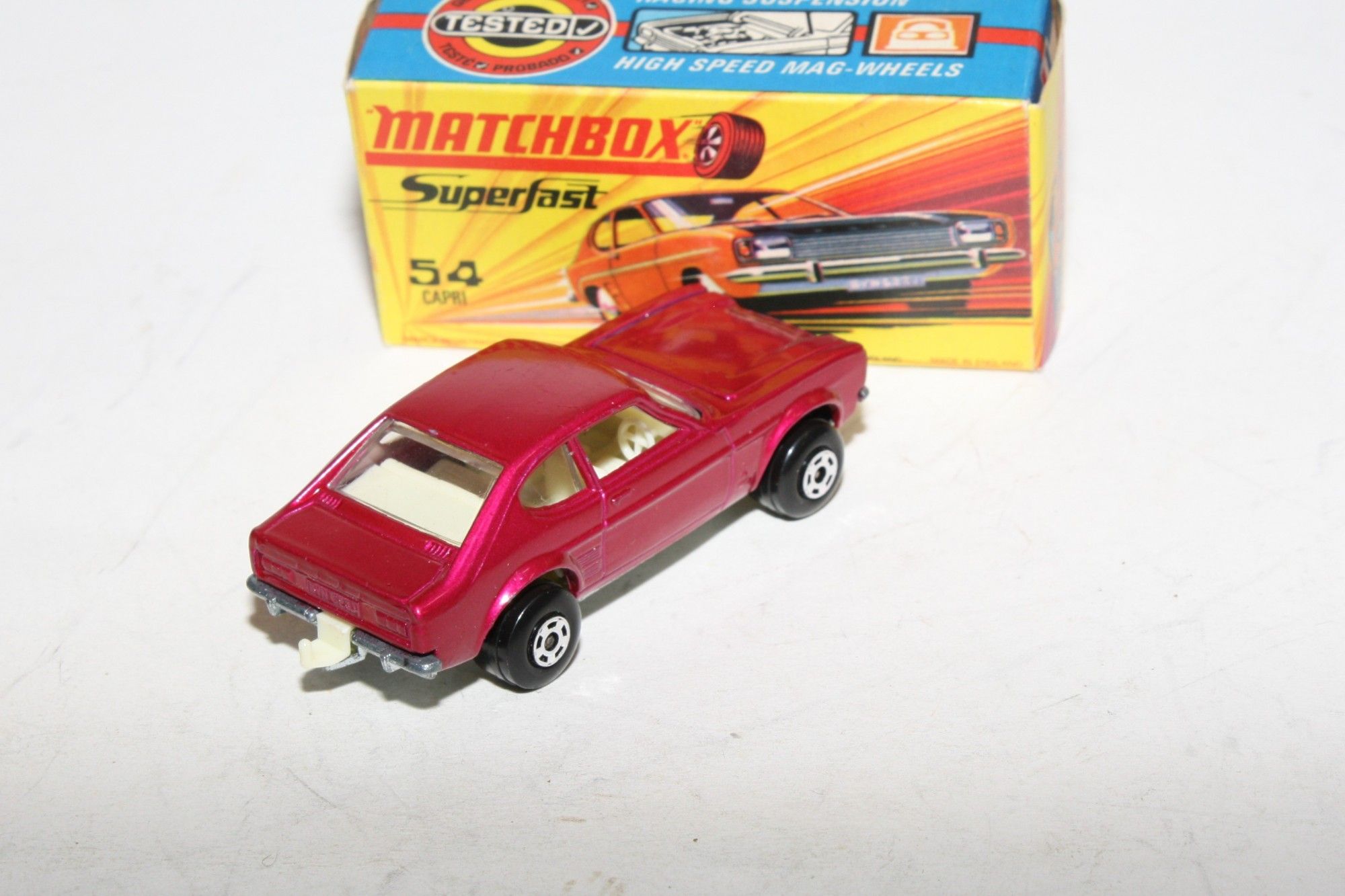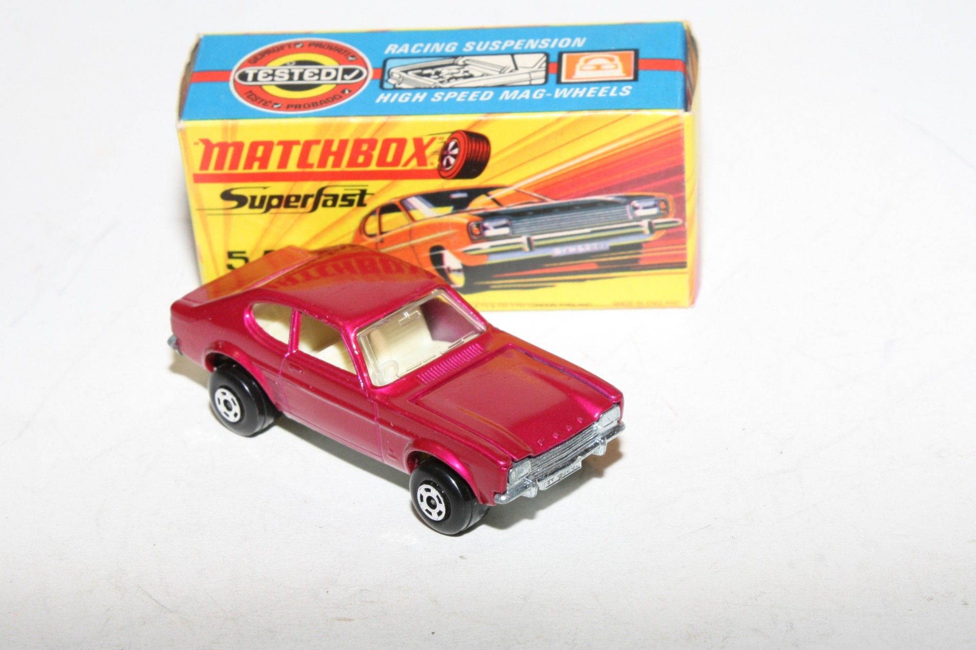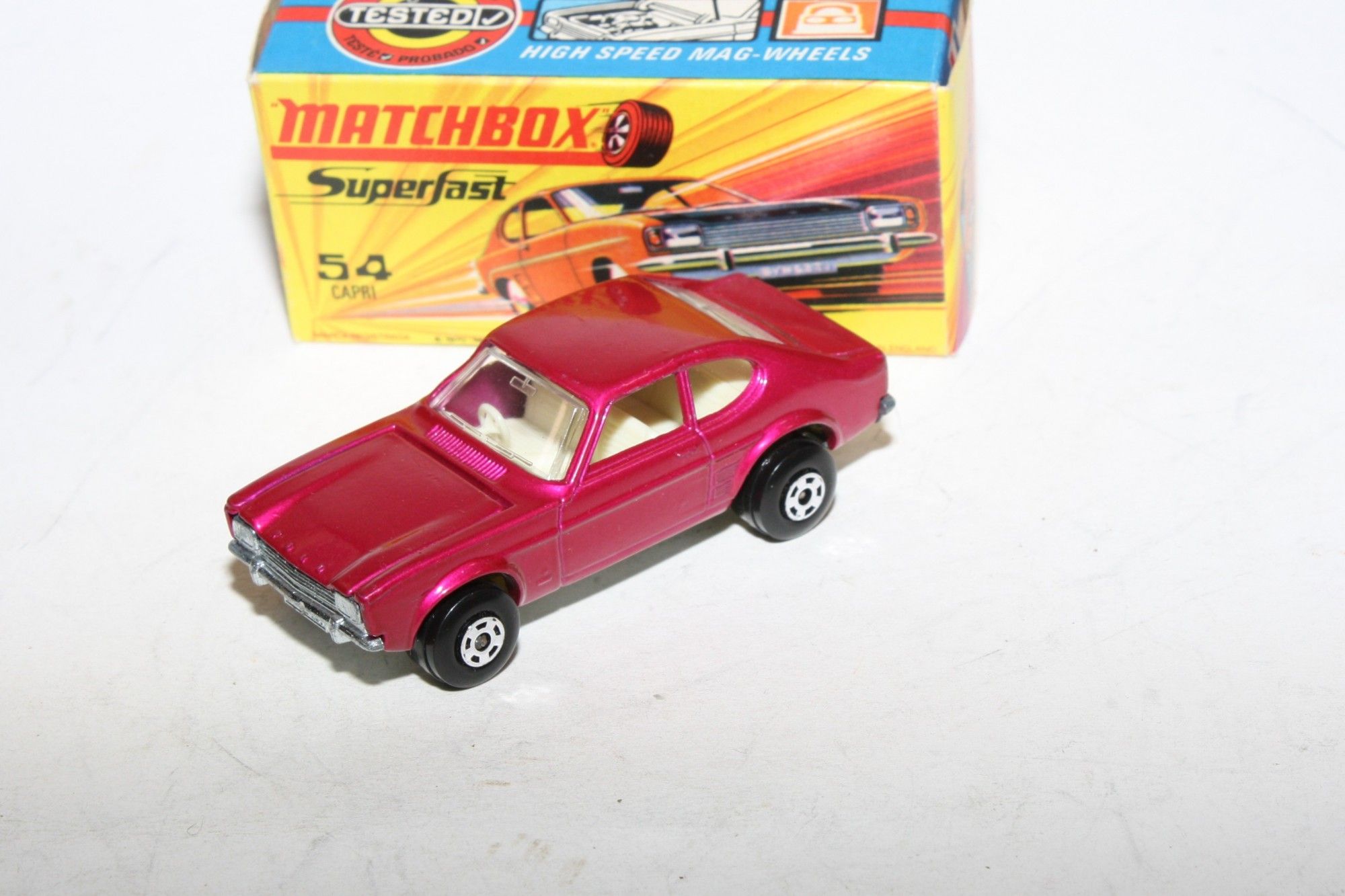 A superb example of this Matchbox model. Gleaming original metallic purple paintwork is mint, please study the photos for exact condition. Perfect Superfast wheels, all free rolling, crystal clear windows, white interior , tow hook, bare metal underside.