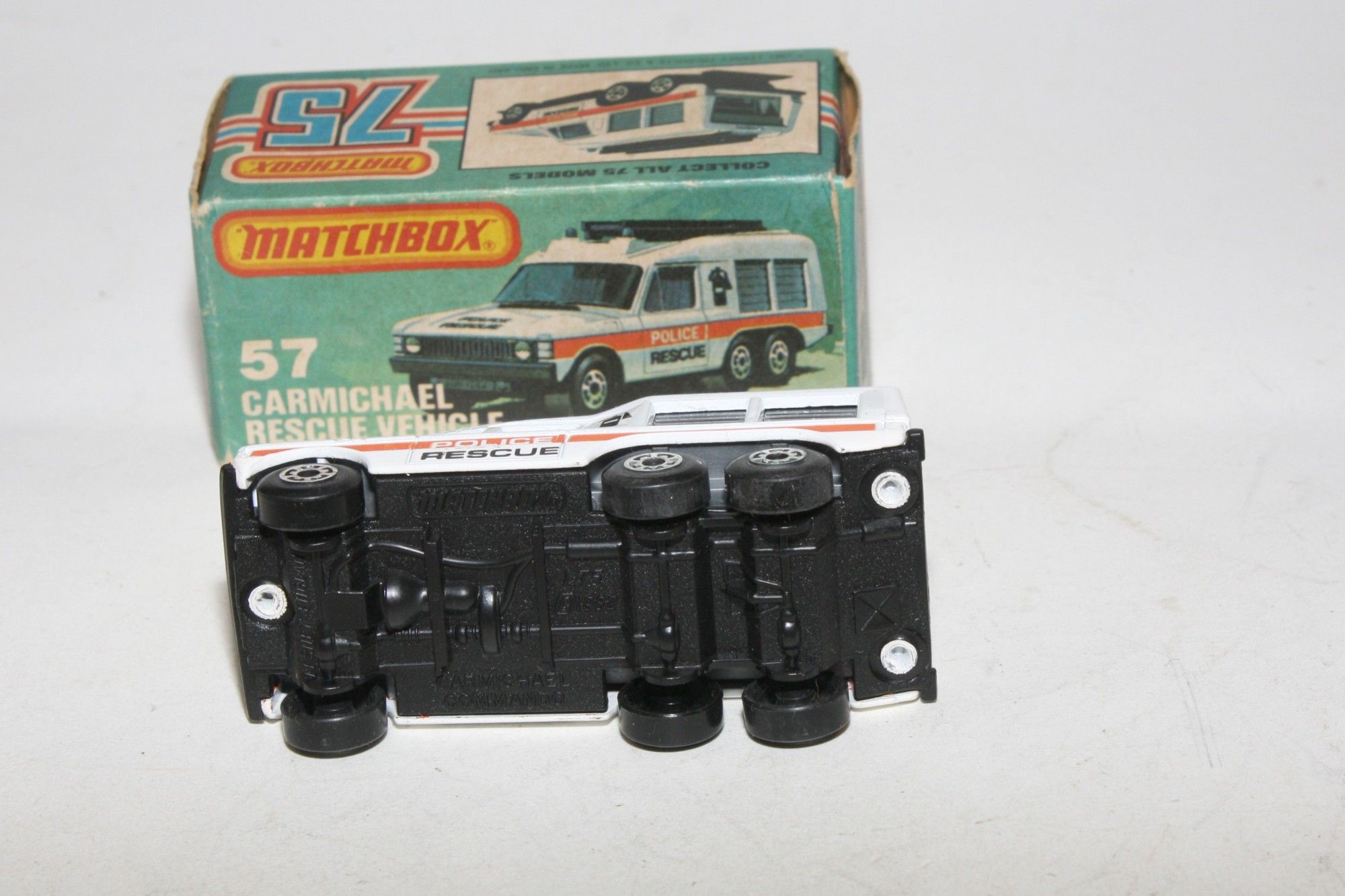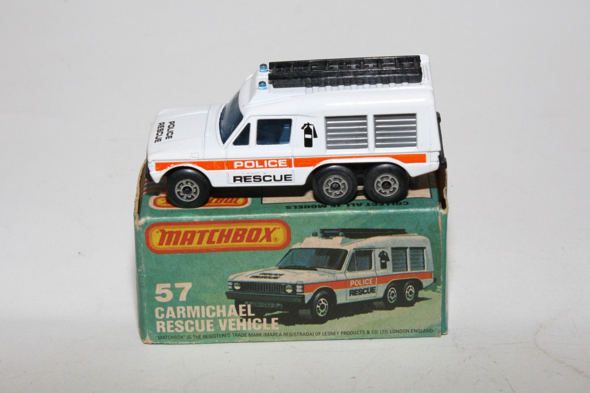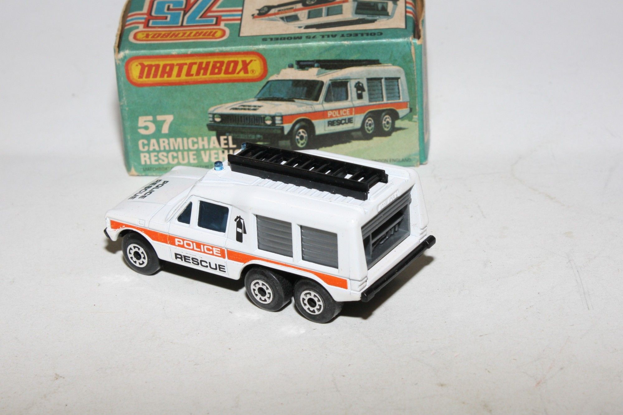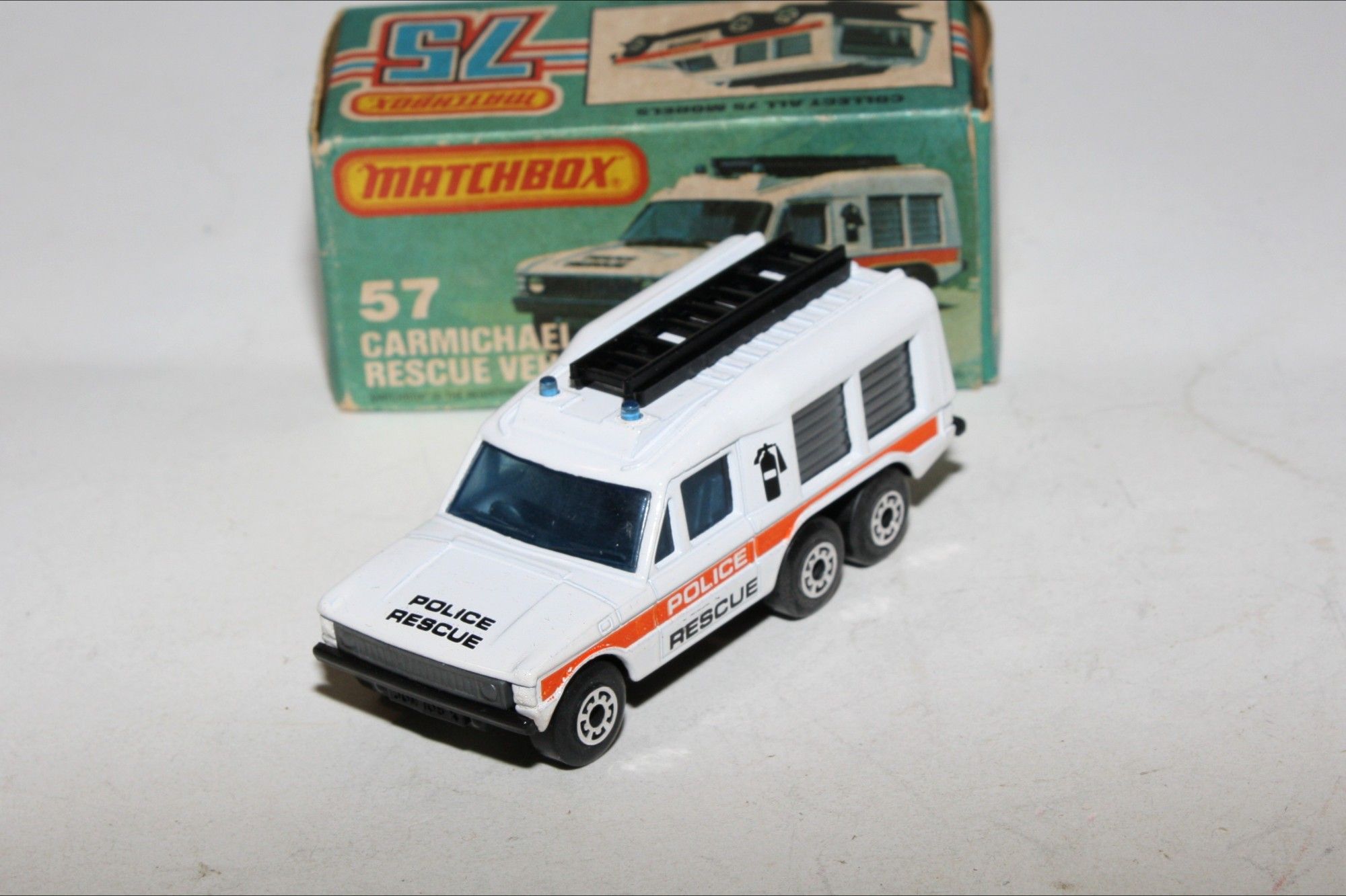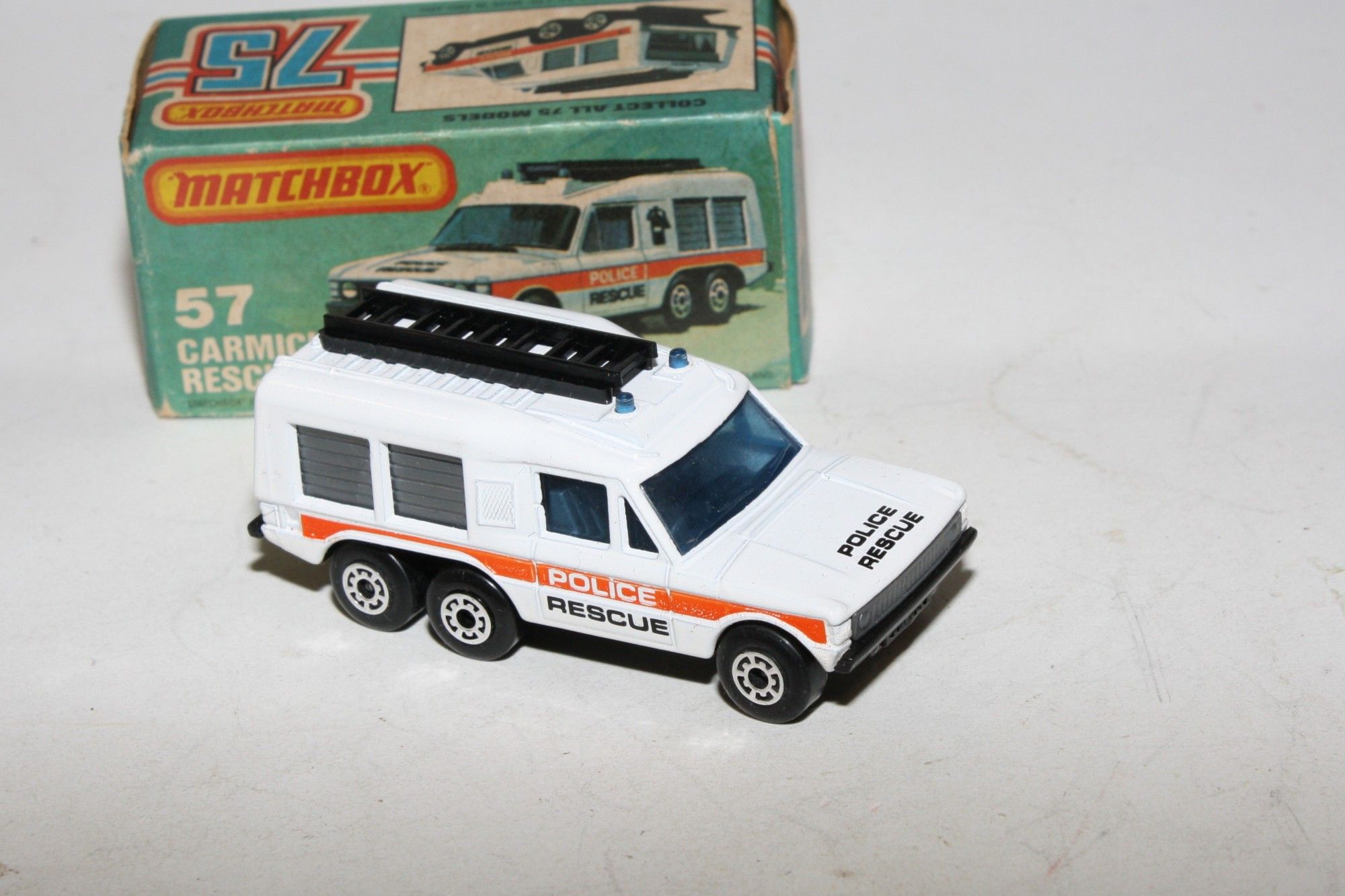 A superb example of this early 1980's Matchbox Superfast model. Gleaming original white paintwork is mint, please study the photos for exact condition. Superfast wheels, all free rolling, blue glass, roof beacons and ladders, excellent Police rescue decals, black base