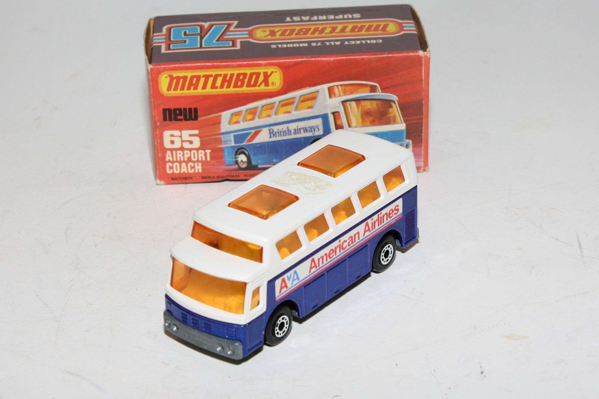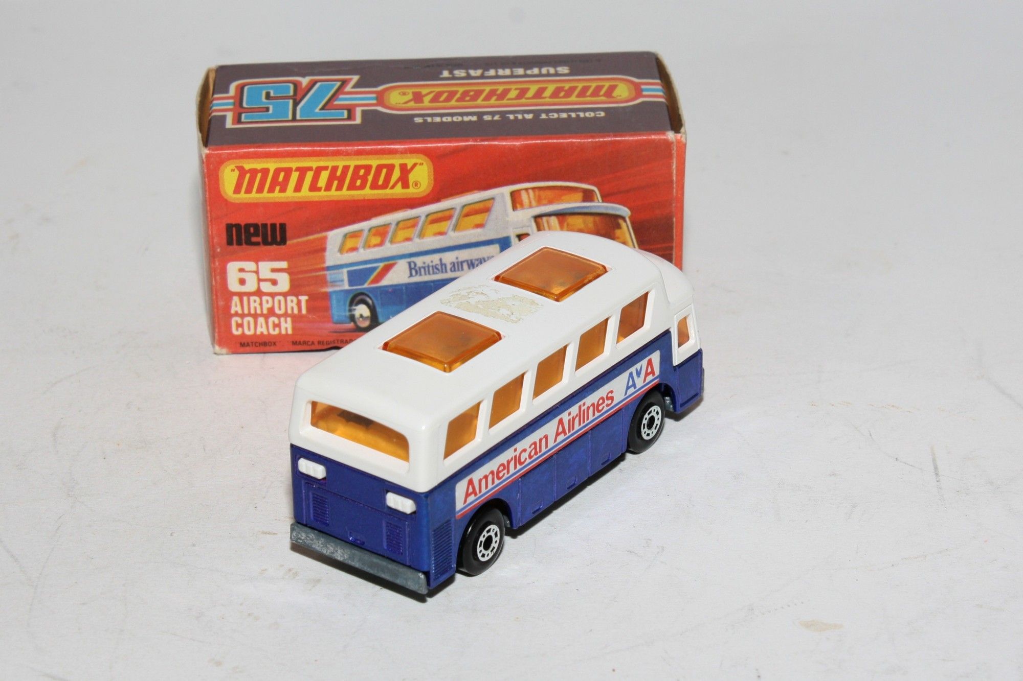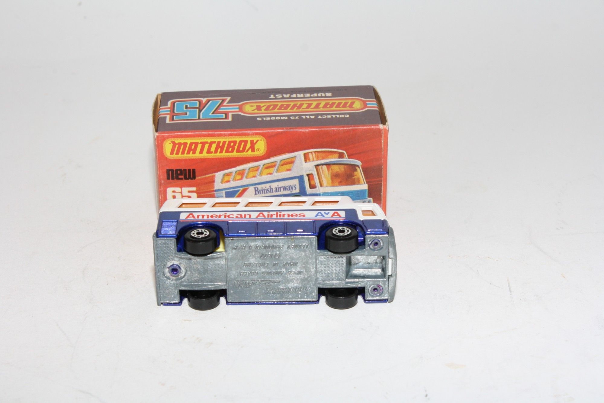 A superb example of this 1970's Matchbox model. Gleaming original paintwork is mint with white plastic top section (old sticker residue has been removed and plastic is mint), please study the photos for exact condition. Superfast wheels, all free rolling, crystal clear amber windows, white interior, perfect harder to find American Airlines livery stickers, bare metal base.