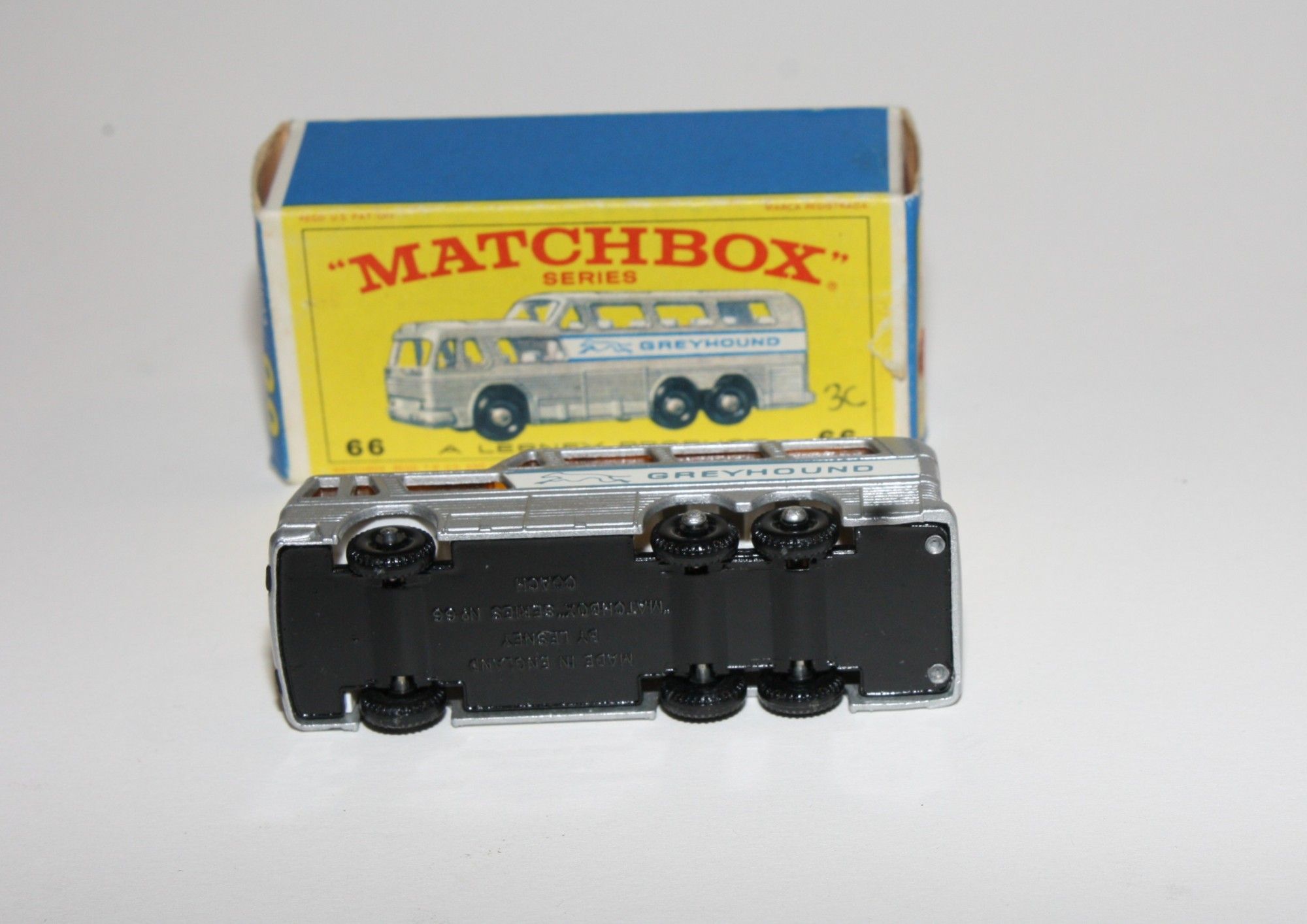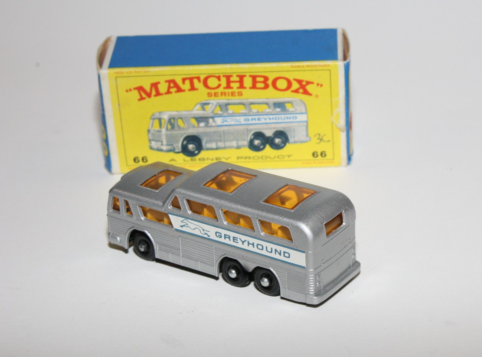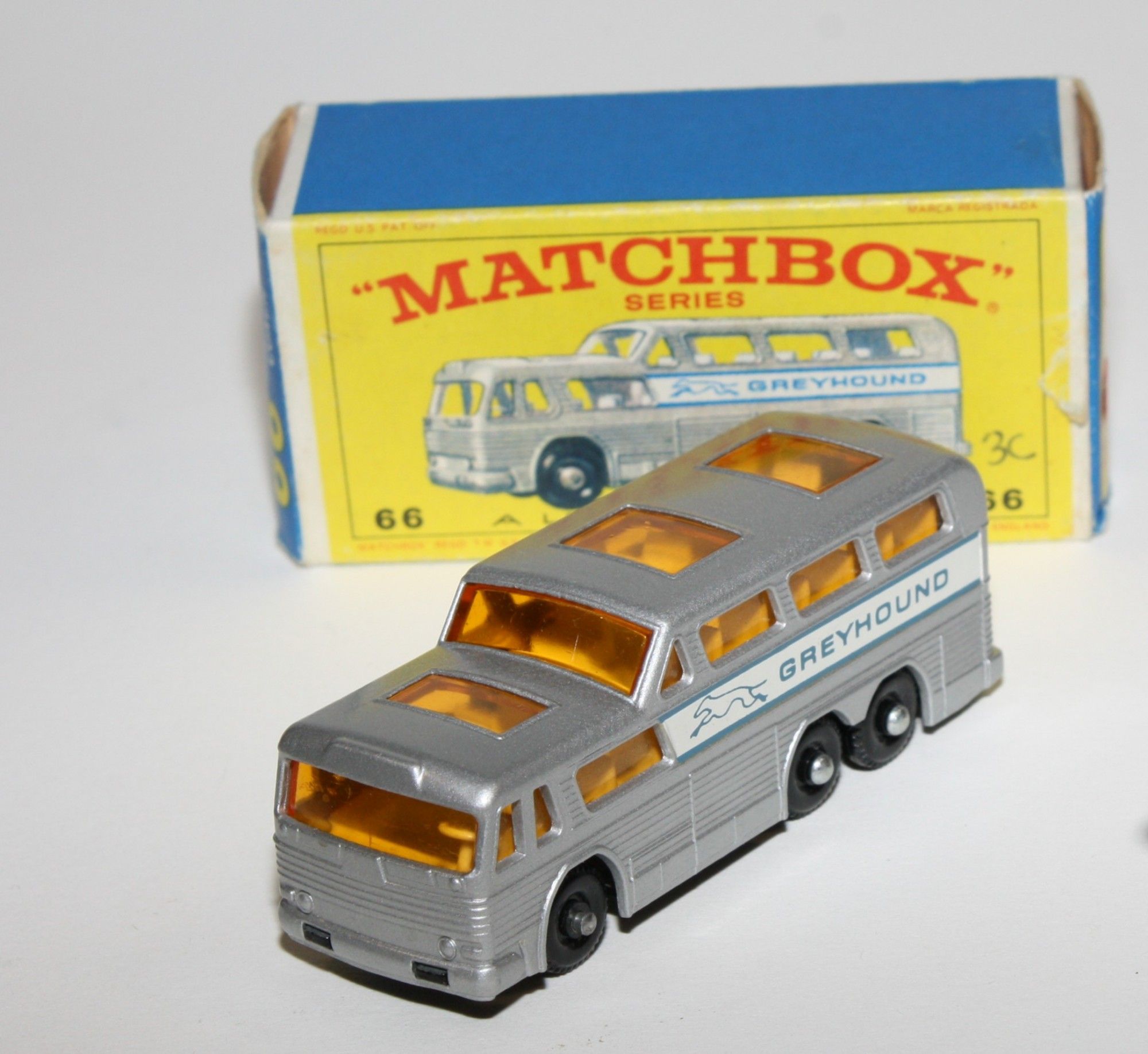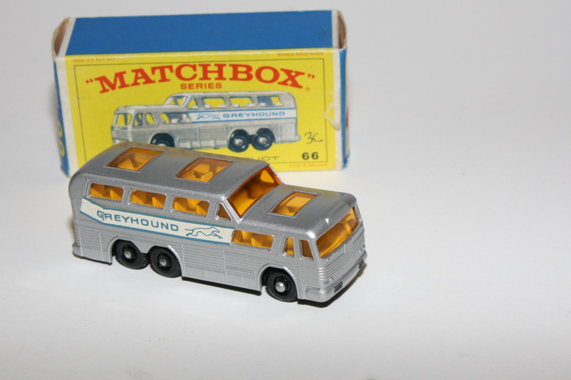 A lovely example of this 1960's Matchbox model. Gleaming original silver paintwork is mint, please study the photos for exact condition. BPW, good suspension, amber glass, white interior, mint grey edged labels, black base.