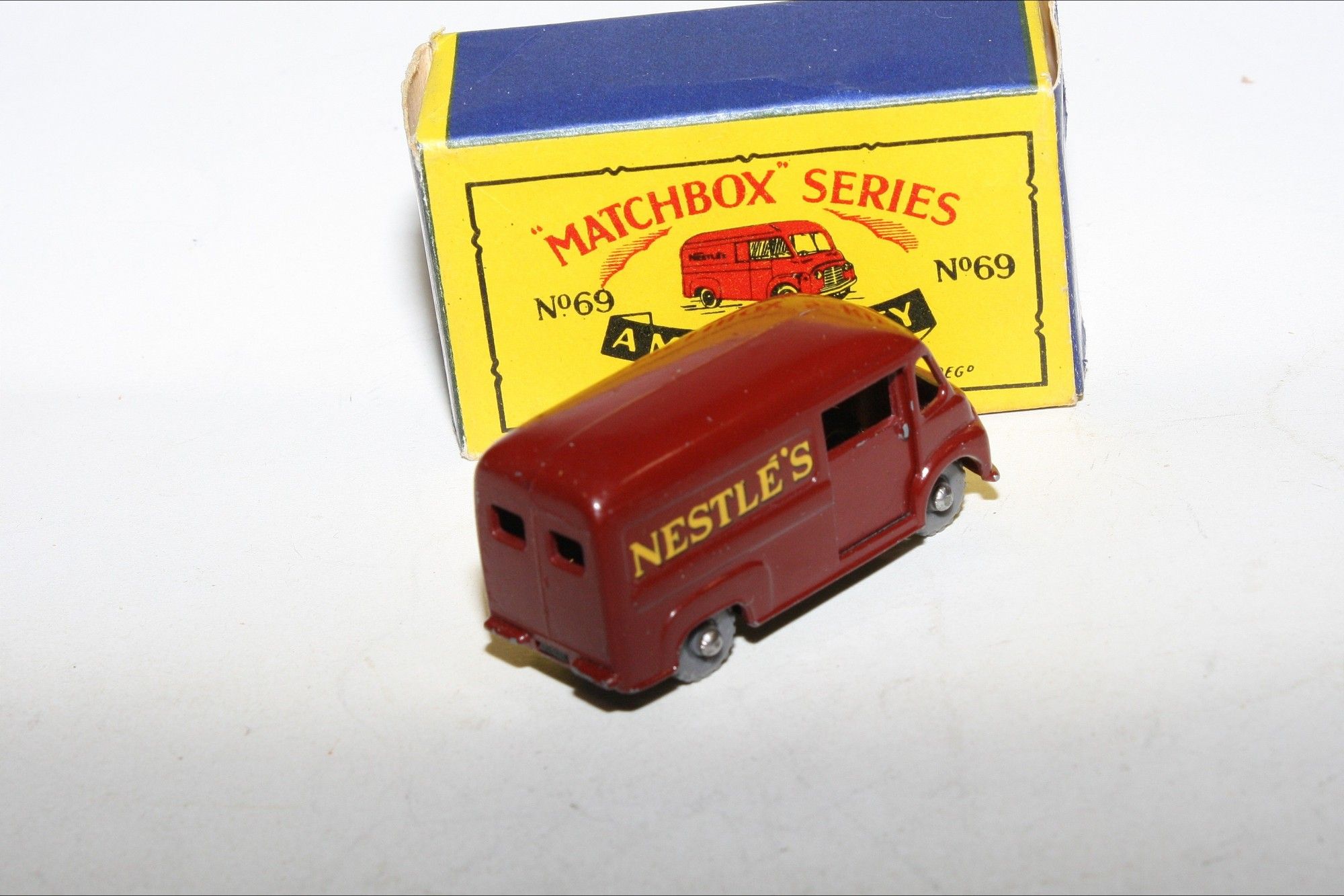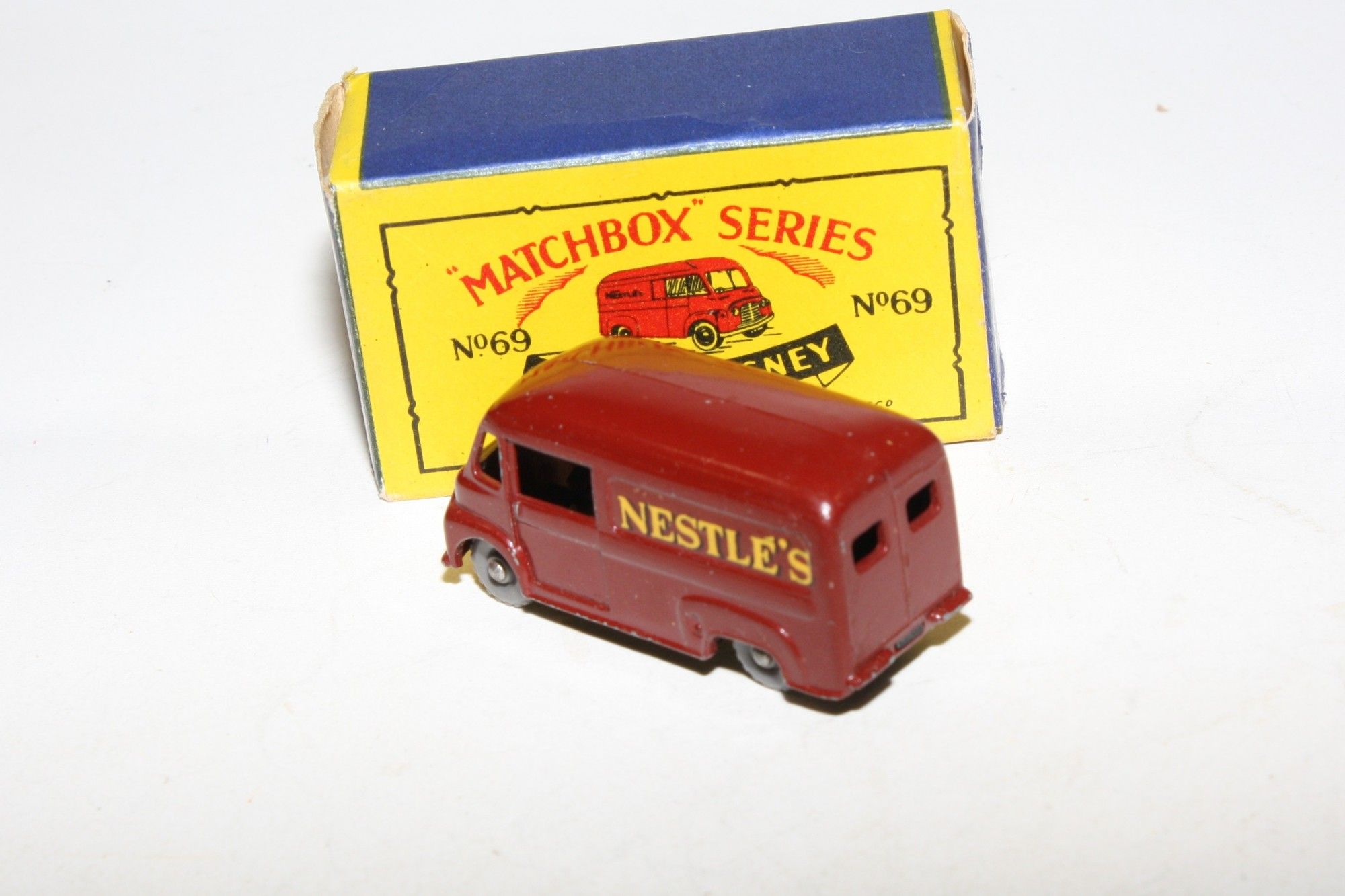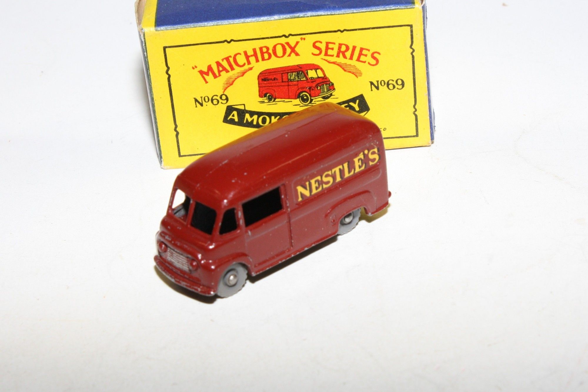 A lovely example of this harder to find late 1950's Matchbox. Gleaming original maroon paintwork is excellent, has a few nicks on raised edges, please study the photos for exact condition. KGPW, sliding door, perfect original Nestle's livery decals, black underside.