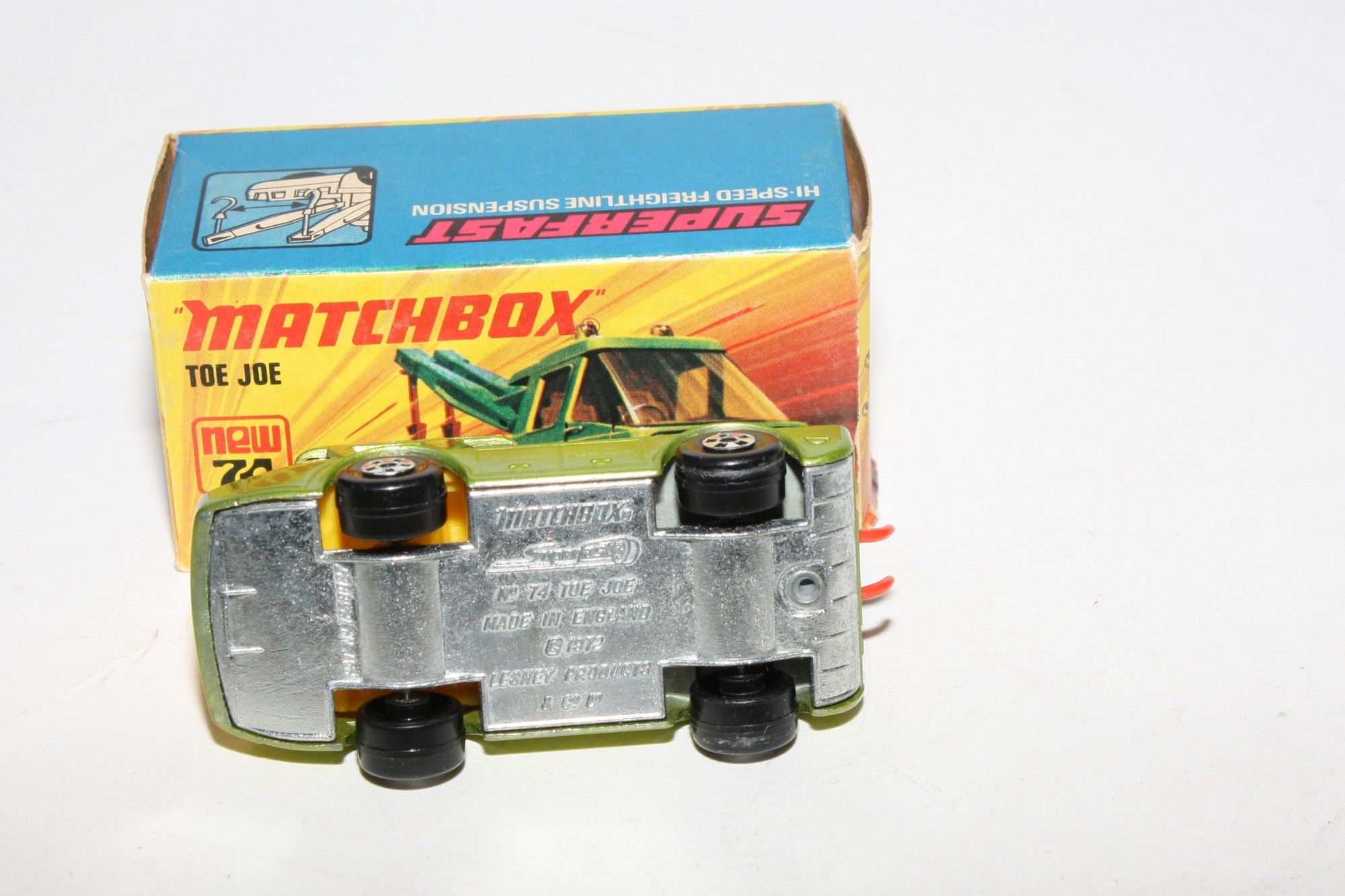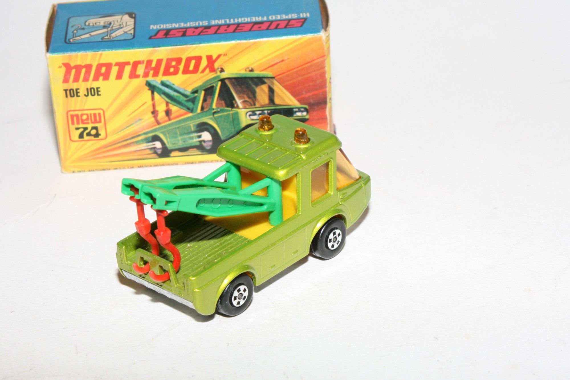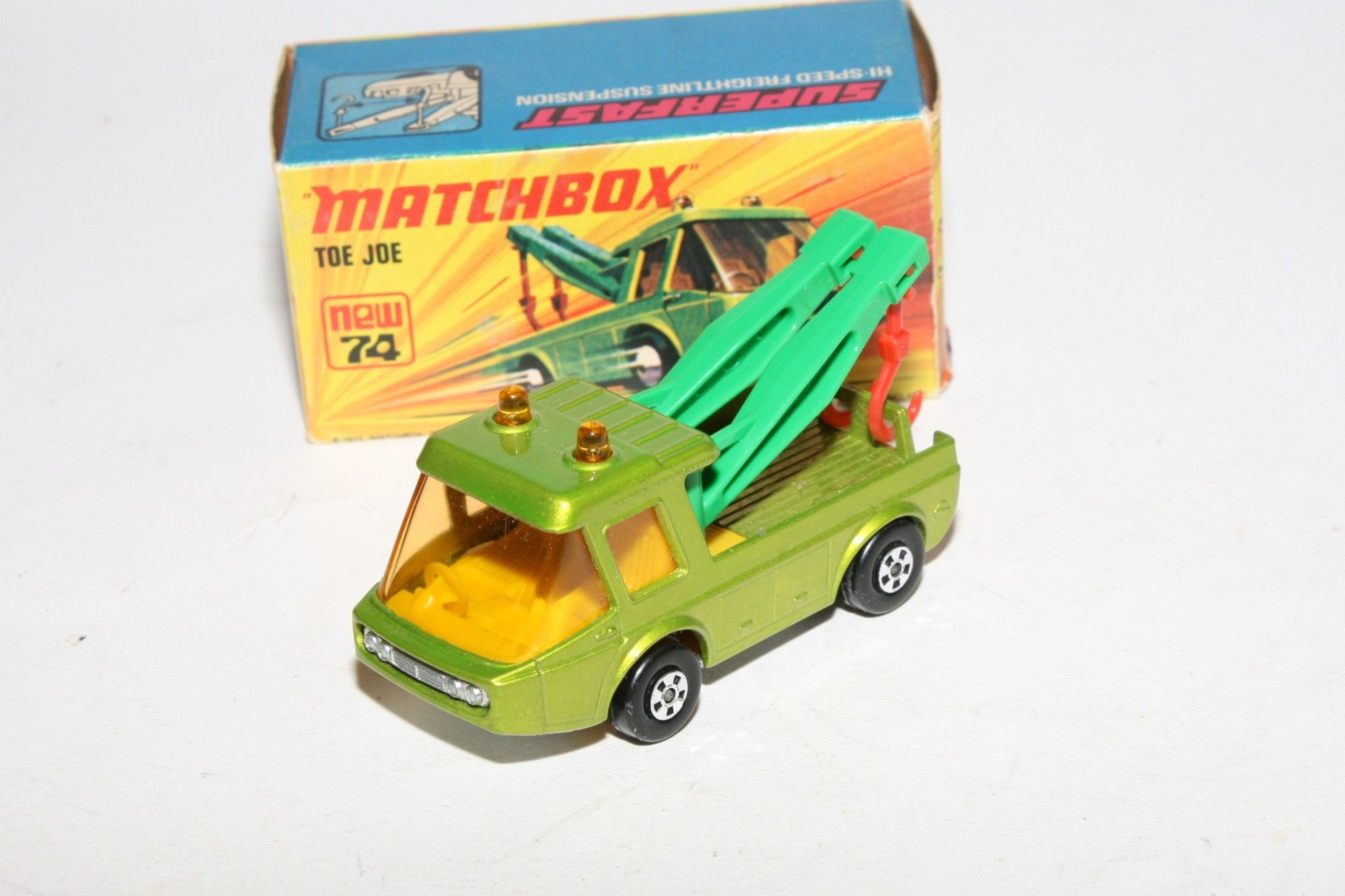 A superb example of this Matchbox model. Gleaming original metallic green paintwork is mint, please study the photos for exact condition. Perfect Superfast wheels, crystal clear amber windows, roof lights and green jibs with red hooks, unpainted base.