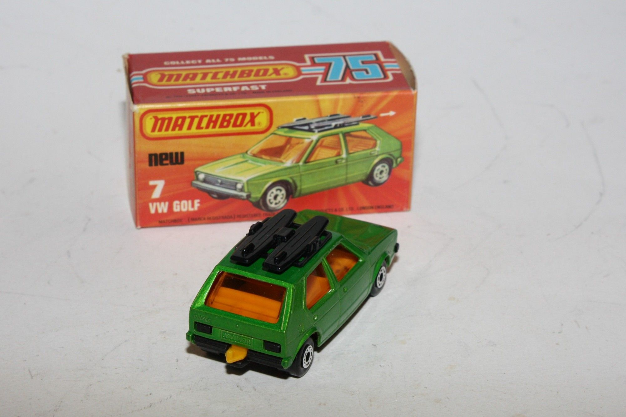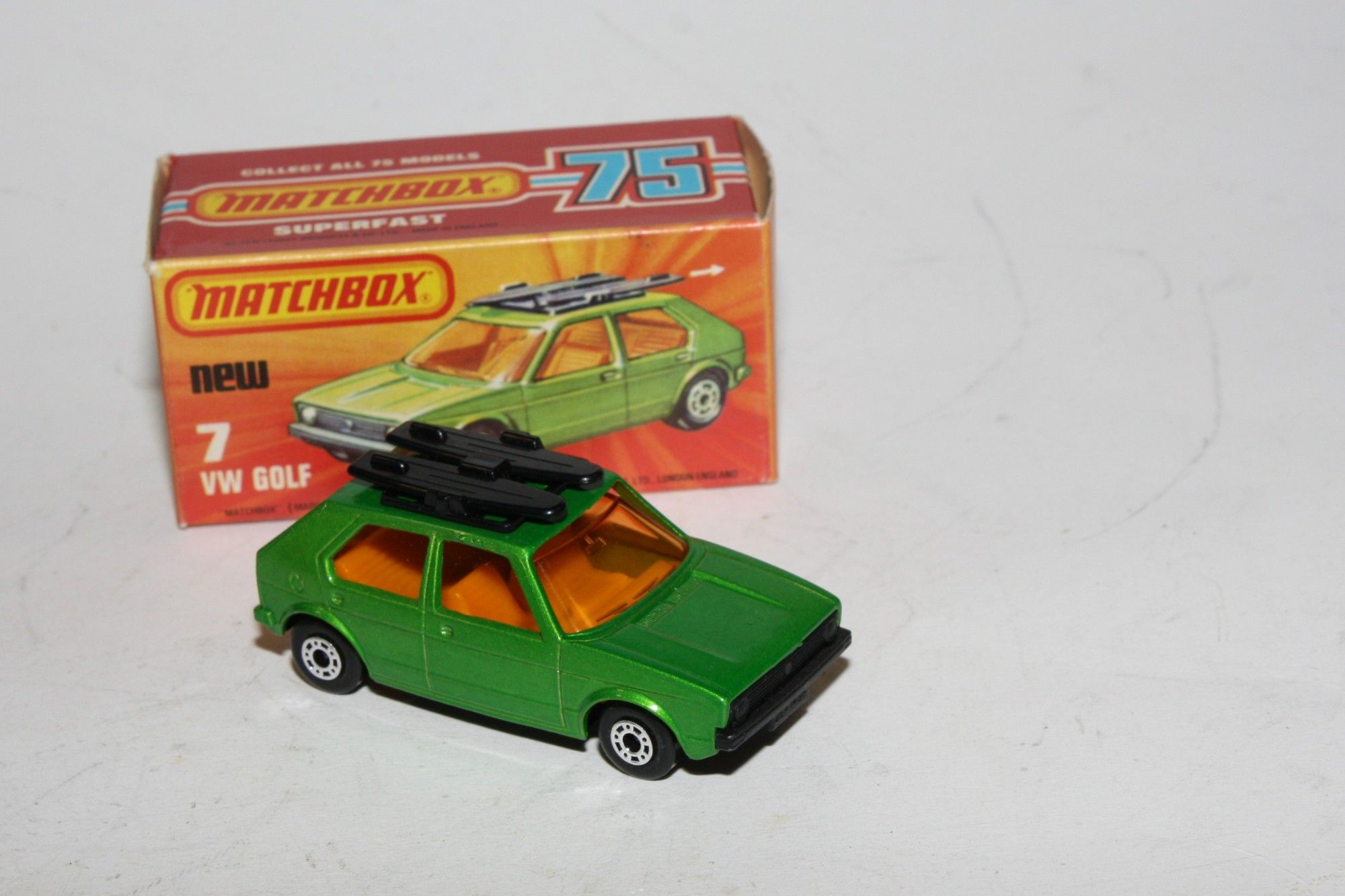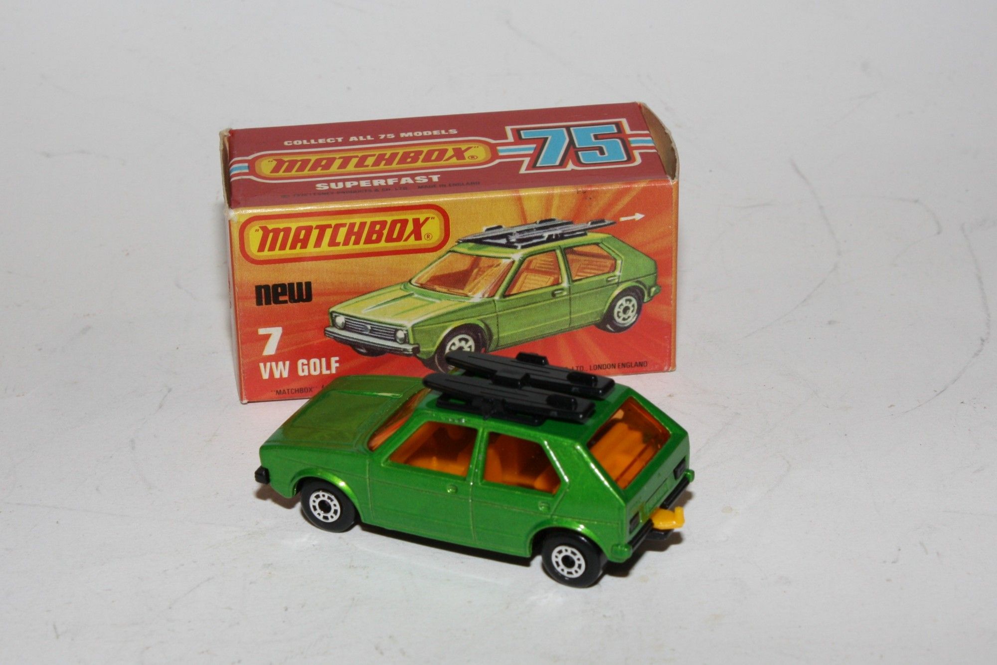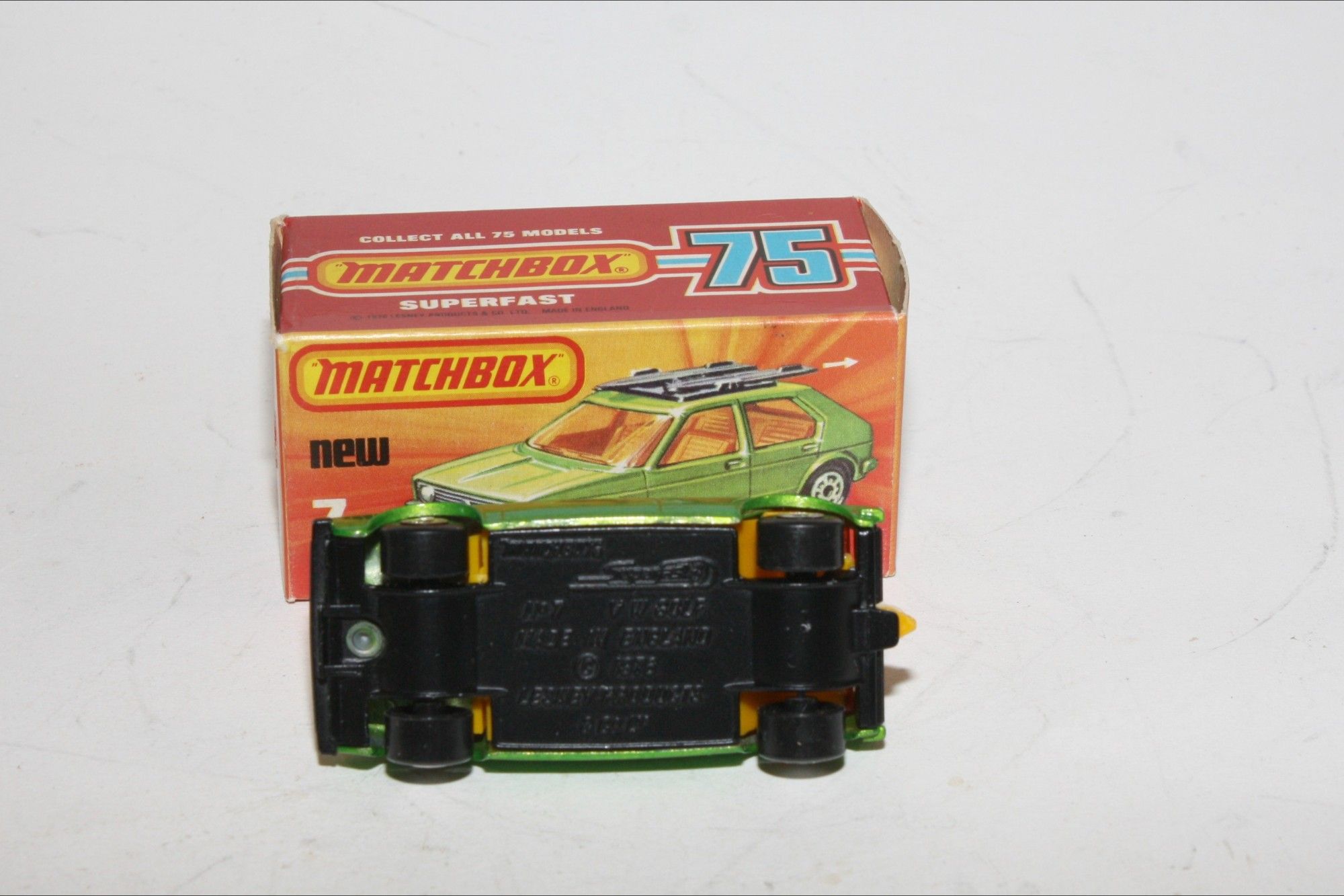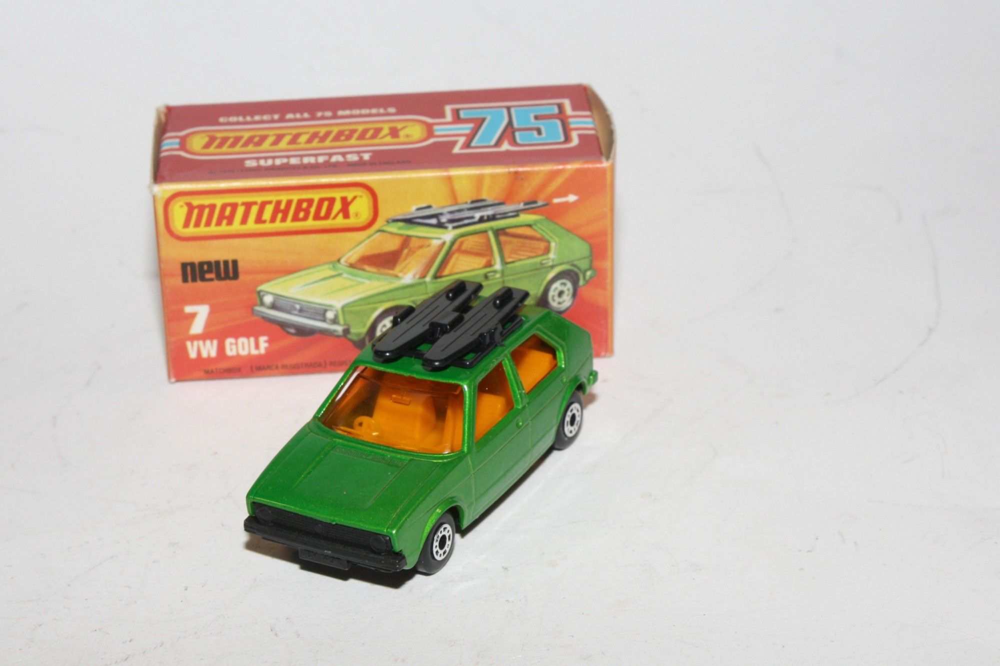 A superb example of this early 1970's Matchbox Superfast model. Part of a large collection bought as an investment in the 1970's and stored so never displayed. Gleaming original metallic green paintwork is mint, please study the photos for exact condition. Superfast wheels, original surfboards, yellow interior, all free rolling, black base