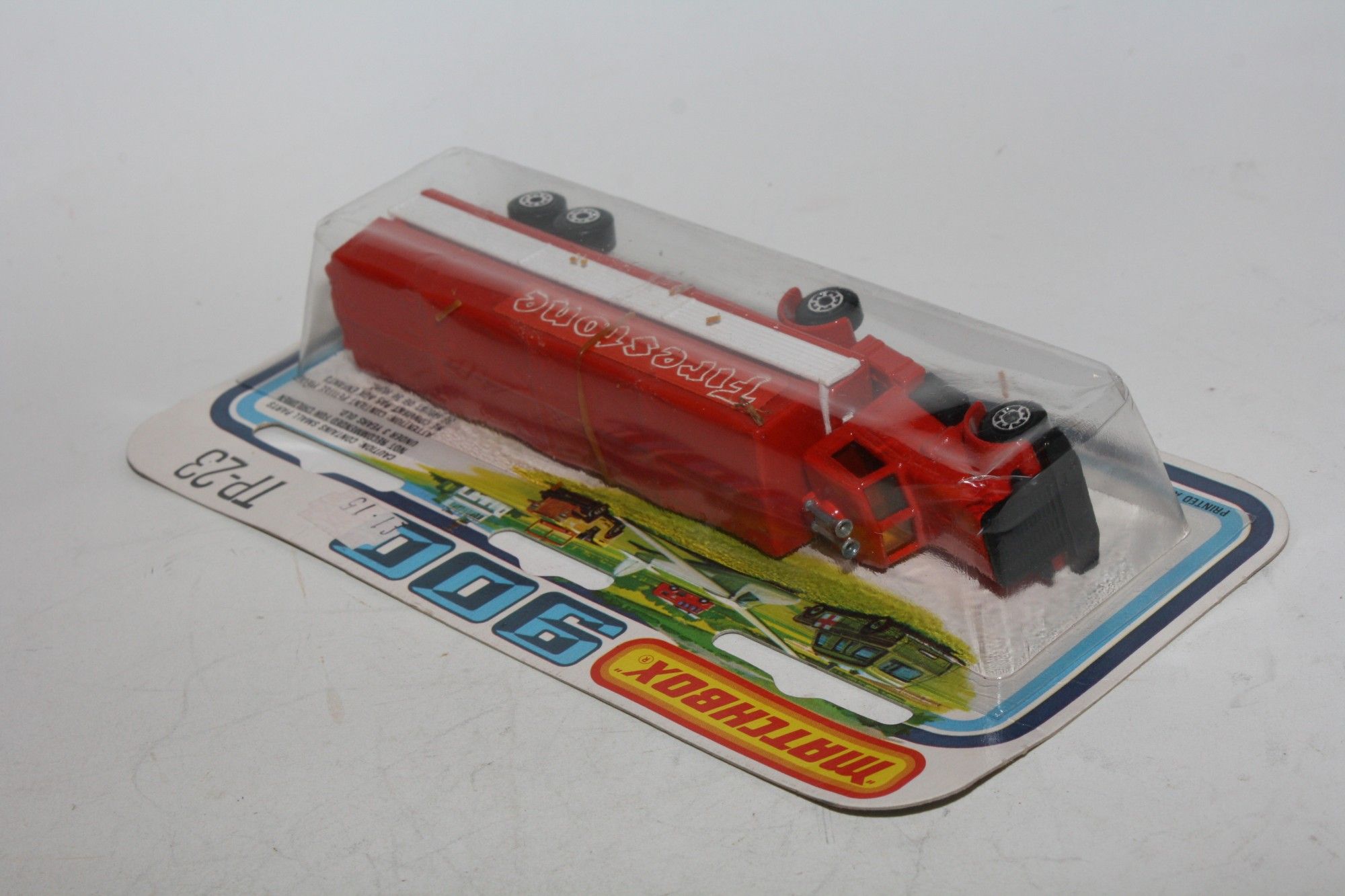 A good example of this Peterbilt Articulated Truck and Dropside Trailer with "Firestone" branding. It was part of the Matchbox 900 Series, also known as the Long Haul series, first issued in 1979. Model comes in its original blister which is in excellent condition on very good backing card with only minimal signs of wear, internal elastic band has degraded..