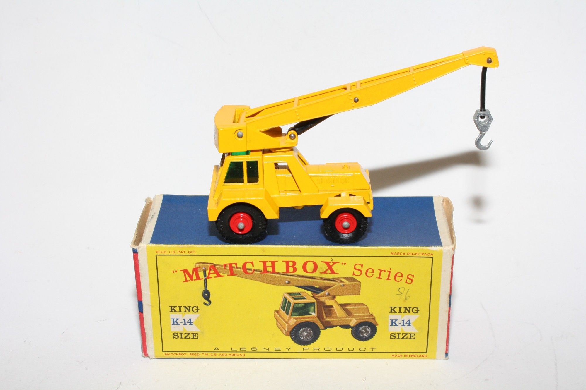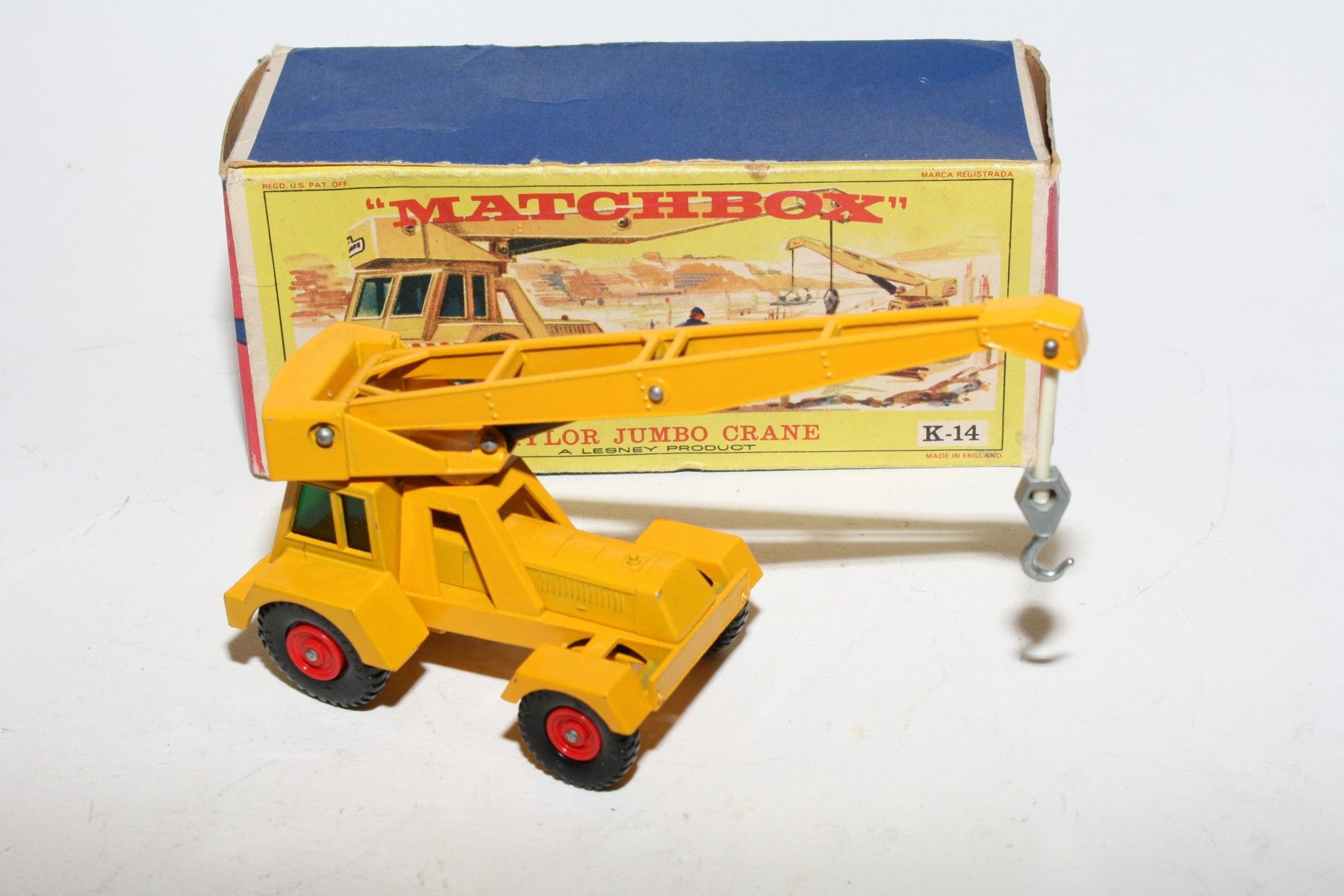 A superb example of this 1960's King Size. Gleaming yellow paintwork is near mint, just some small rubs please study the photos for exact condition. Original plastic tyres on red plastic hubs, green tint windows are perfect, jib and hook all correct. Mint Taylor Jumbo Crane decal. Mint underside.