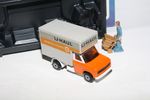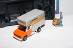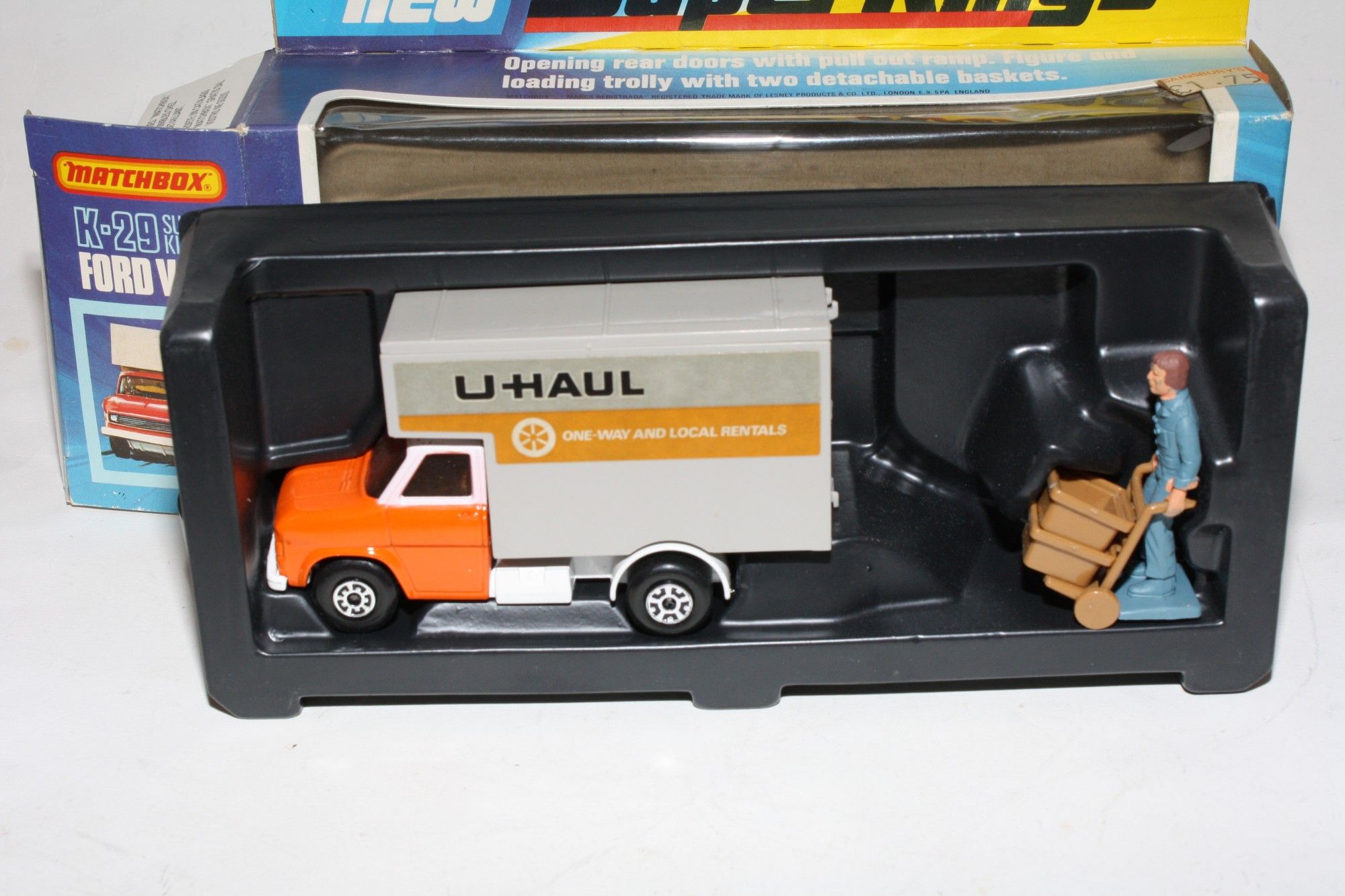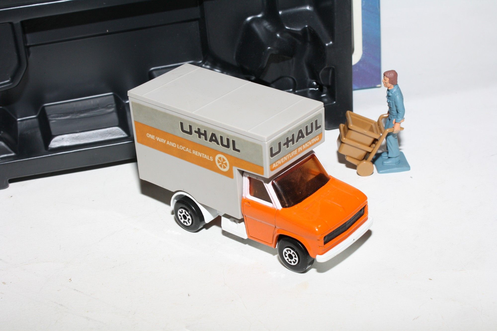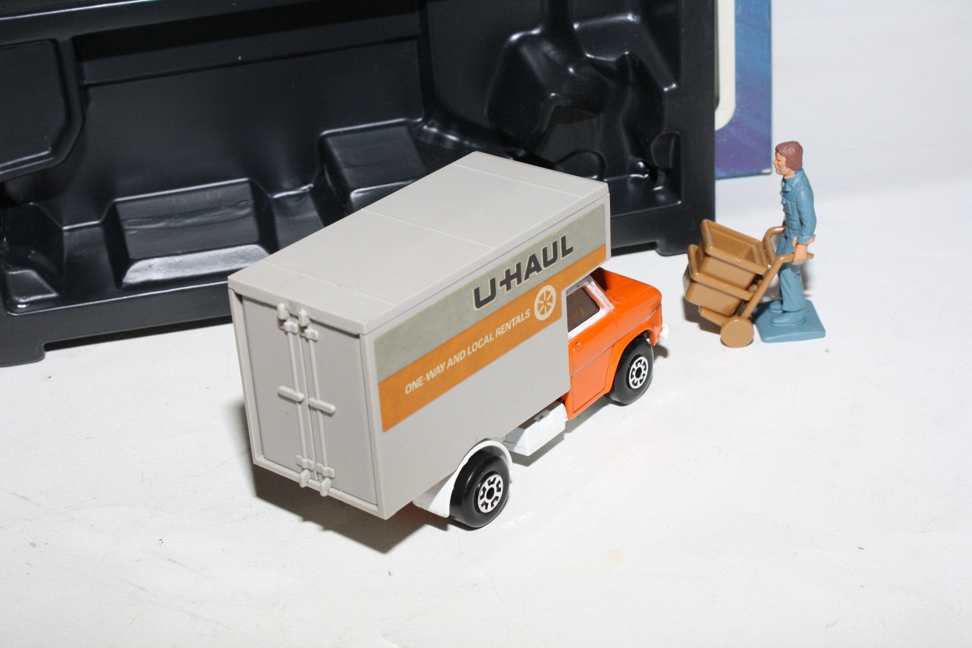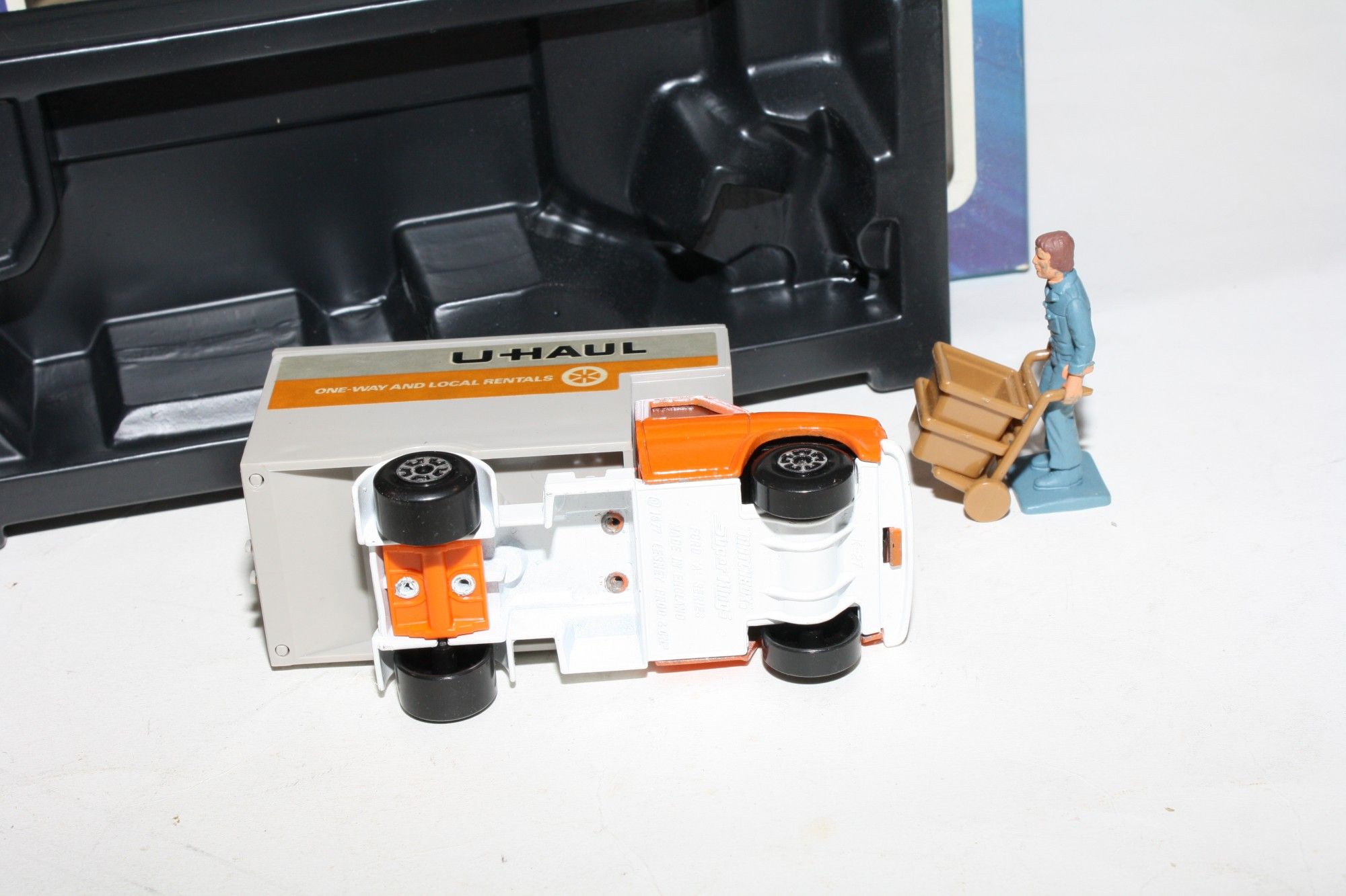 A superb example of this delivery truck. Gleaming orange/white paintwork is mint, please study the photos for exact condition. Original plastic tyres & plastic hubs, perfect U-Haul livery, shiny chrome, perfect figure with sack barrow and boxes, mint underside.