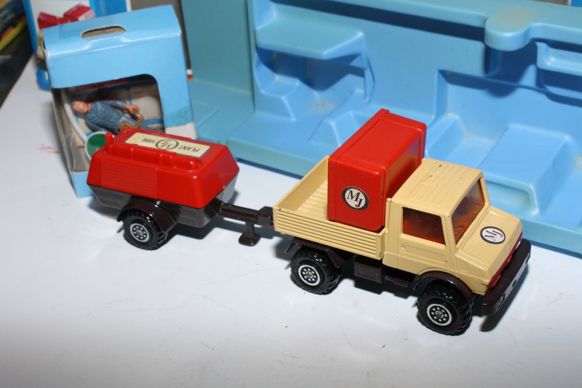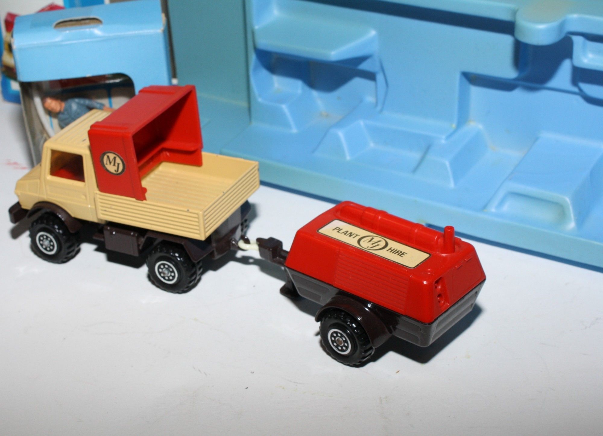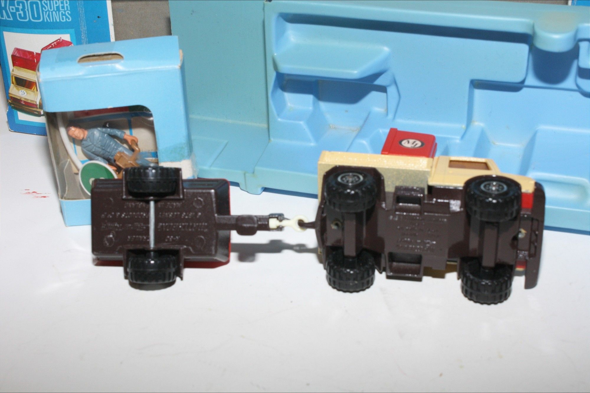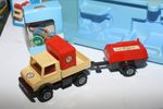 A good example of this 1970's set. Gleaming paintwork is excellent with a few nicks, please study the photos for exact condition. Original plastic tyres & plastic hubs, crystal clear windows with red interior, red plastic tilt and compressor top both perfect, tow hitch complete, comes with signs, pip and figures in the original pack which has been opened with stickers applied