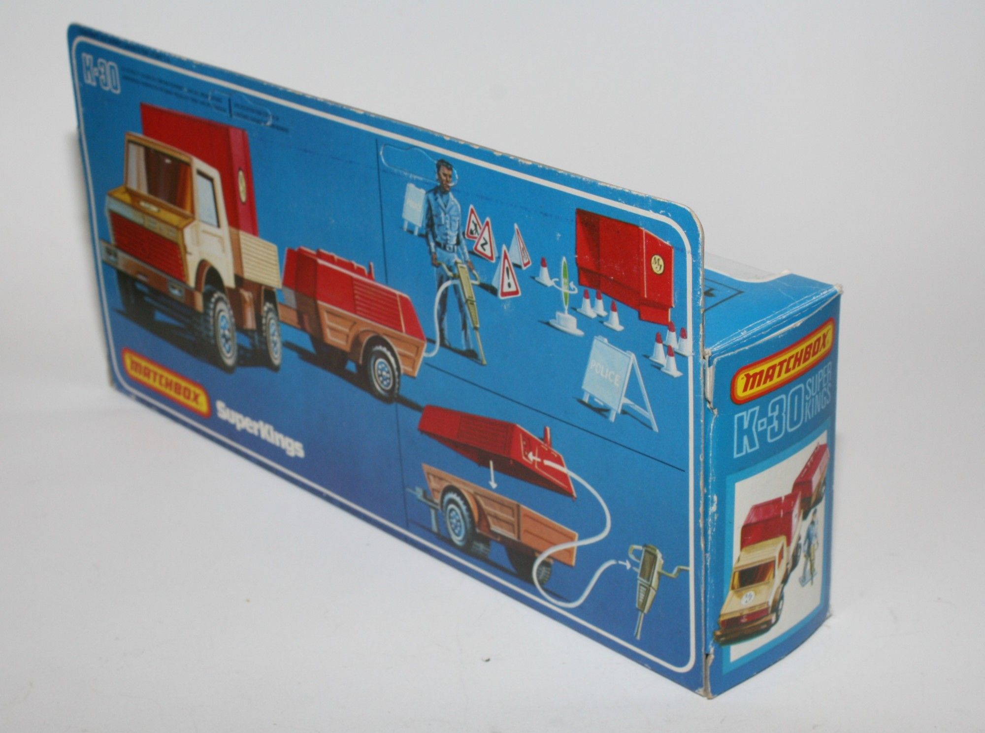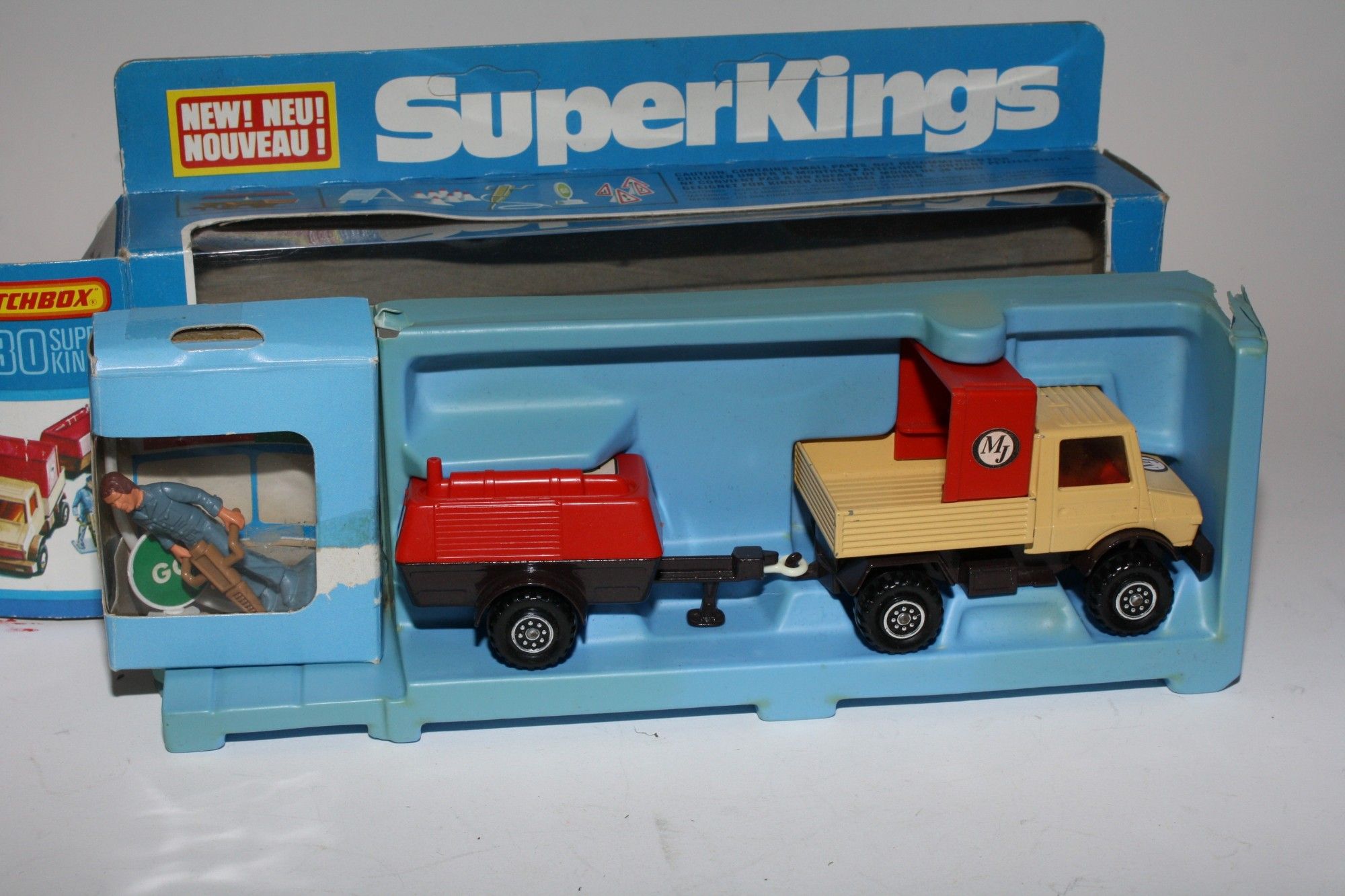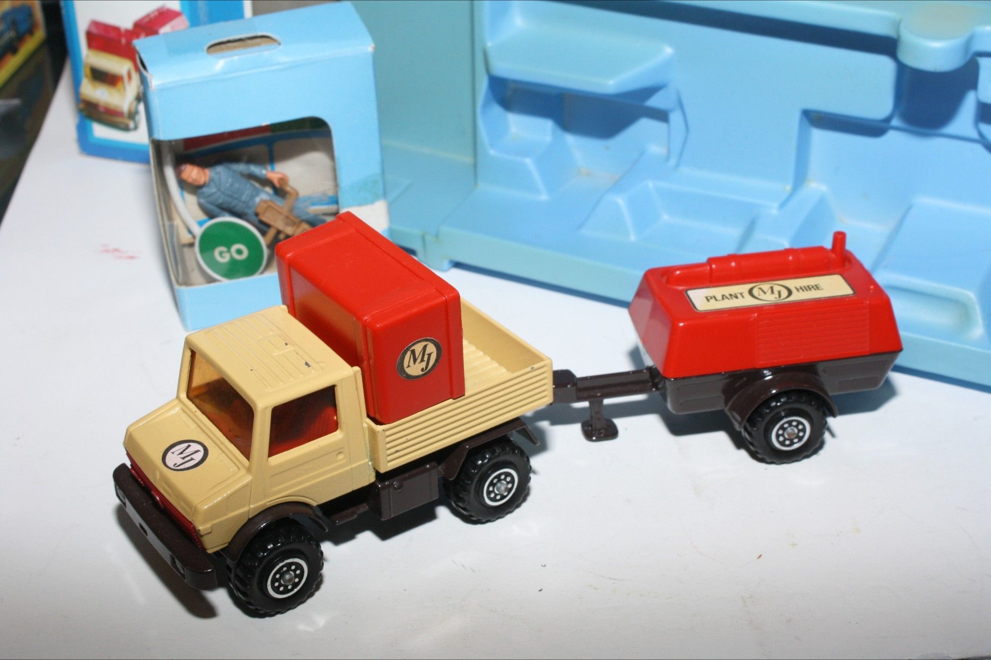 A good example of this 1970's set. Gleaming paintwork is excellent with a few nicks, please study the photos for exact condition. Original plastic tyres & plastic hubs, crystal clear windows with red interior, red plastic tilt and compressor top both perfect, tow hitch complete, comes with signs, pip and figures in the original pack which has been opened with stickers applied