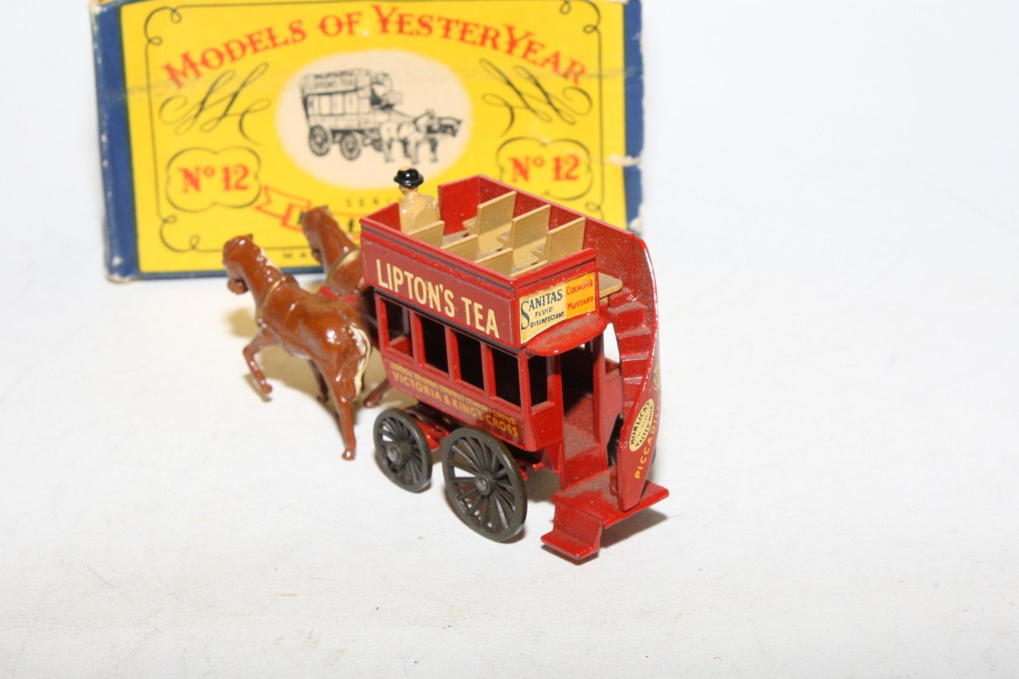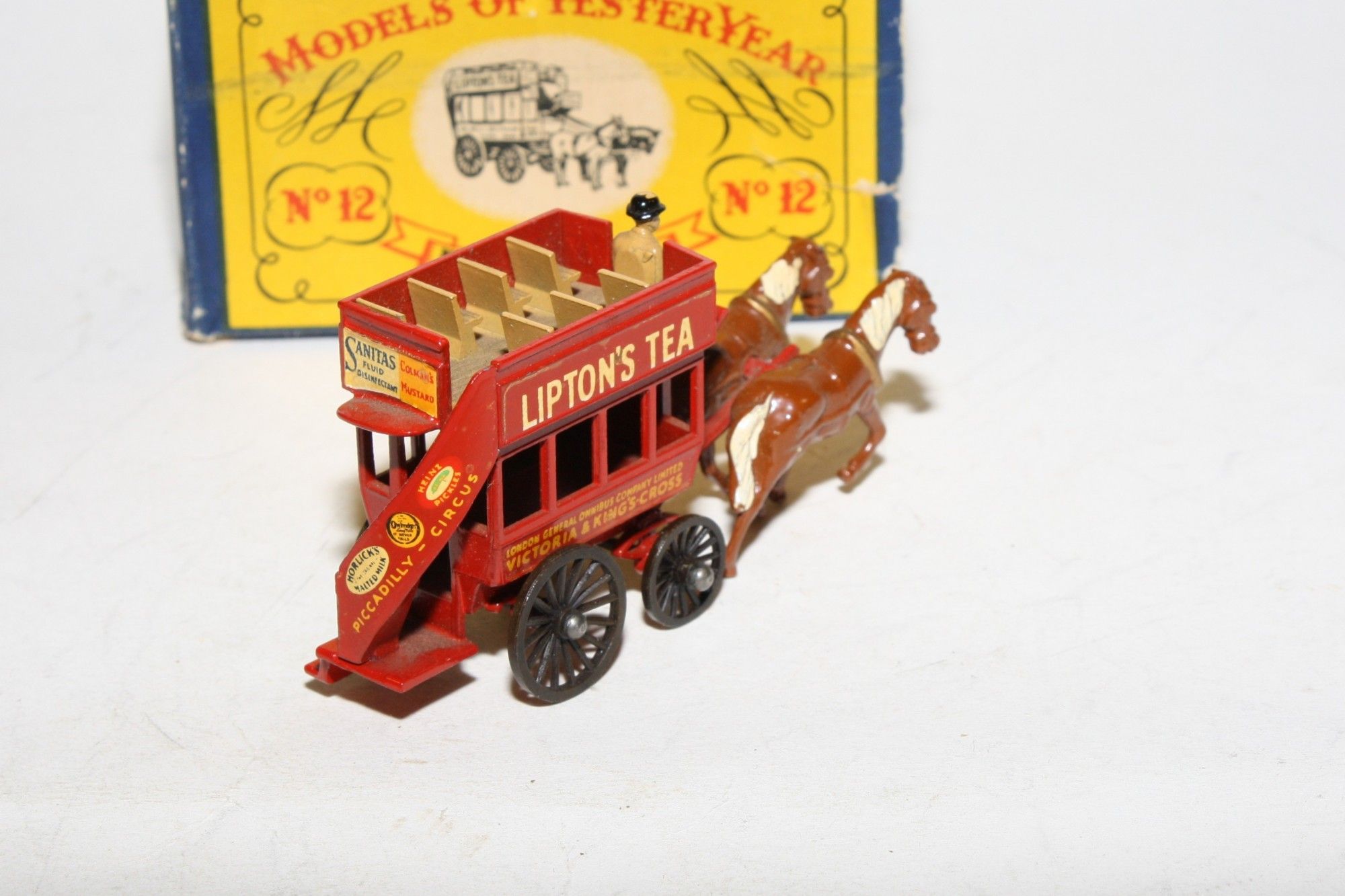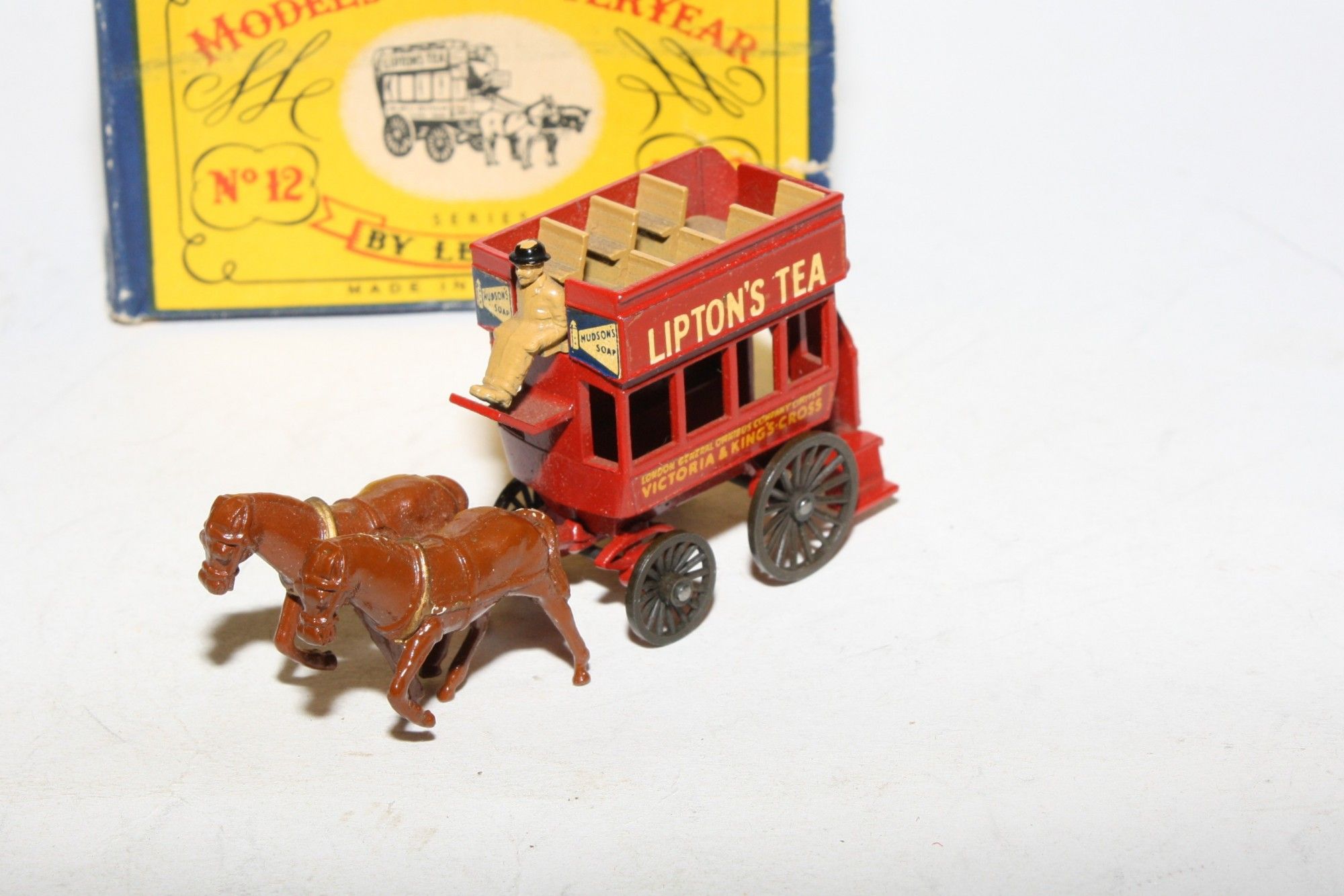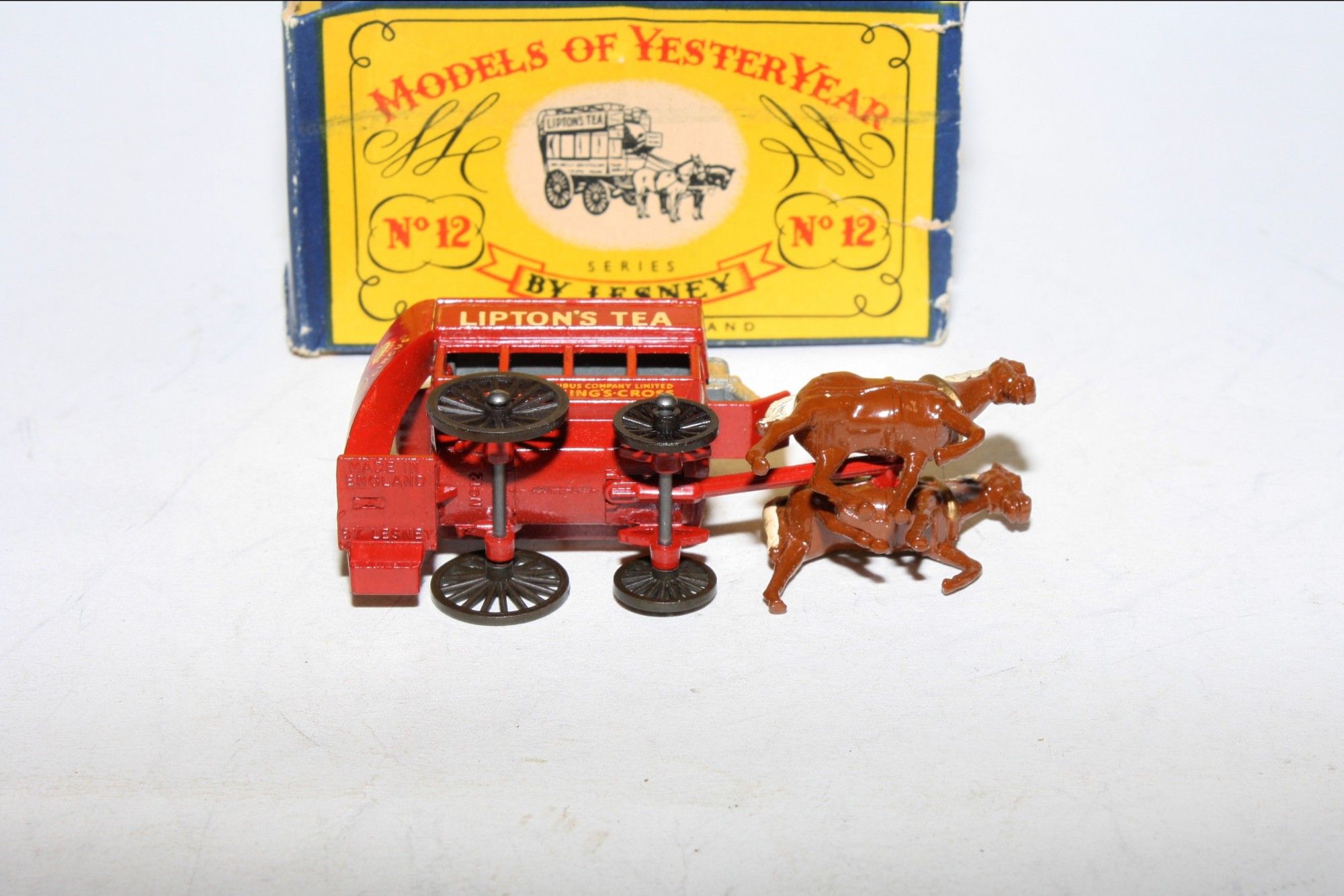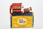 A superb 1st issue example of this early Matchbox model. Gleaming original red paint is mint, please study the photos for exact condition. Liptons Tea advertising with metal wheels and brown horses. Mint underside