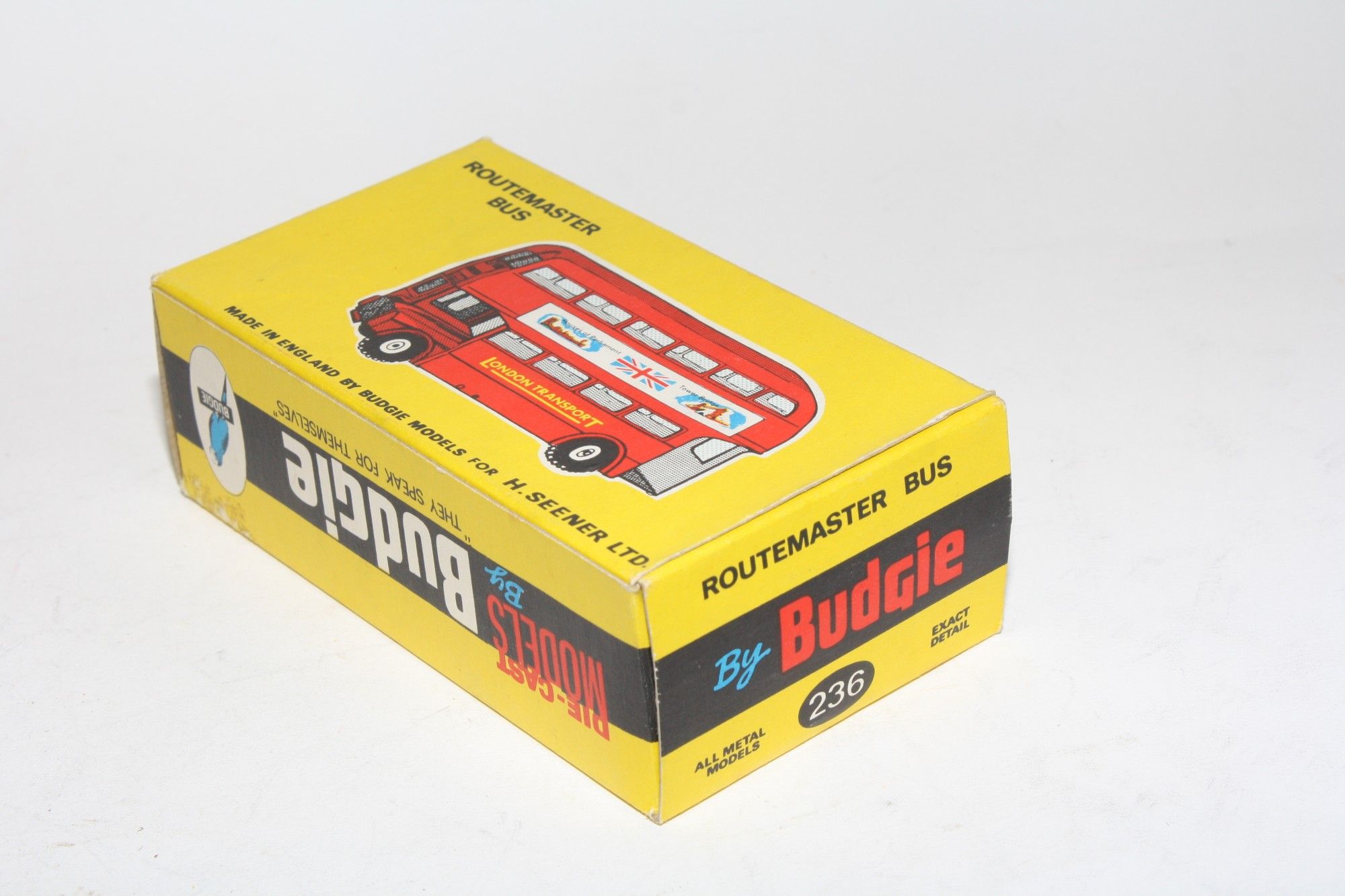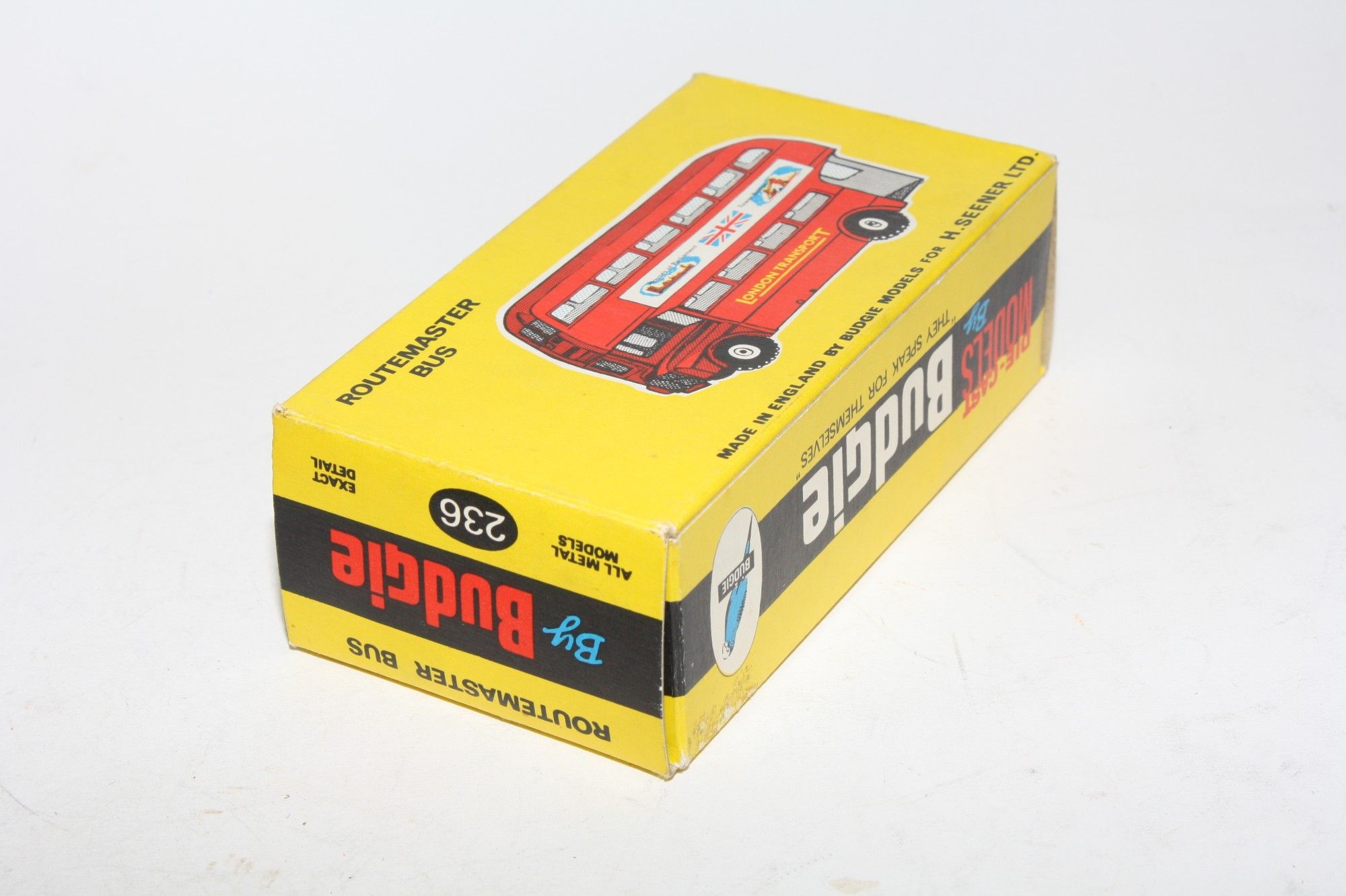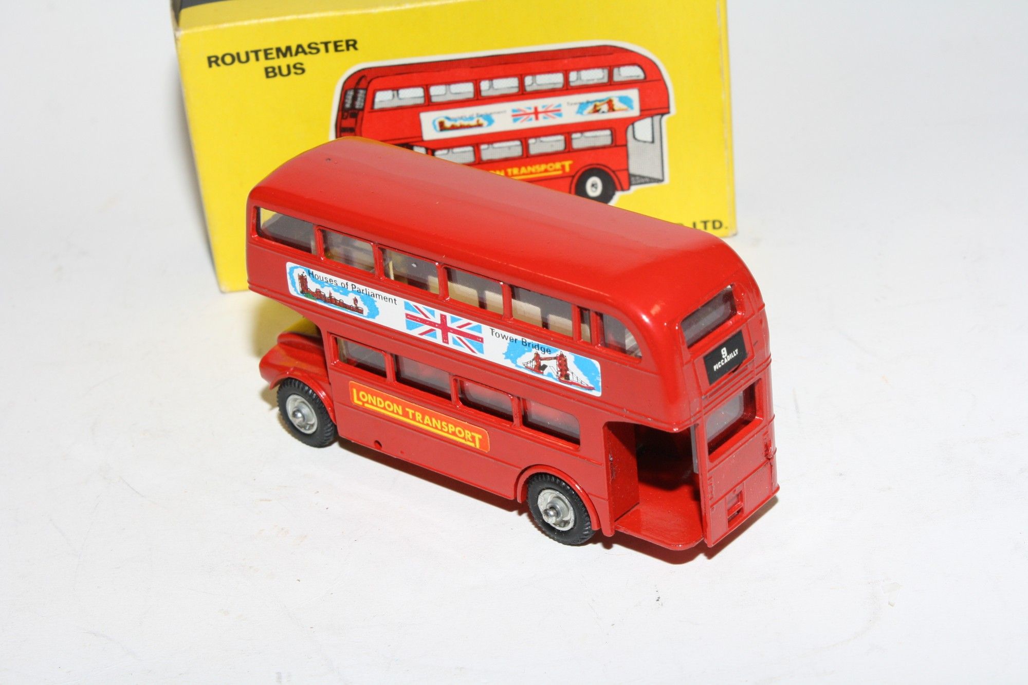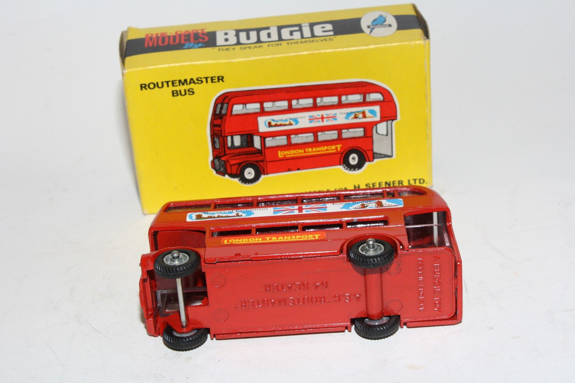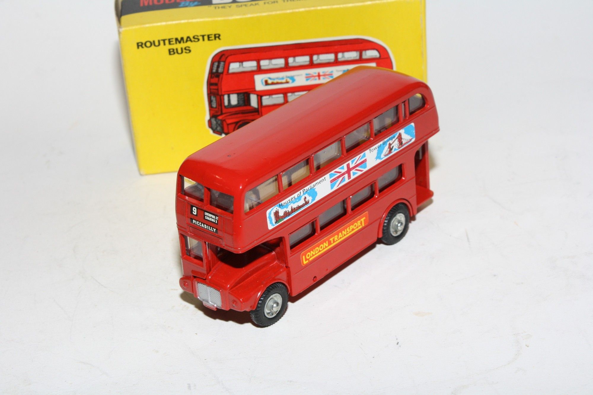 A lovely example of this model from Budgie. Gleaming red paintwork is mint, as new, free rolling wheels, metal hubs and original tyres, crystal clear windows, mint Houses of Parliament stickers and baseplate, please study the photos for exact condition