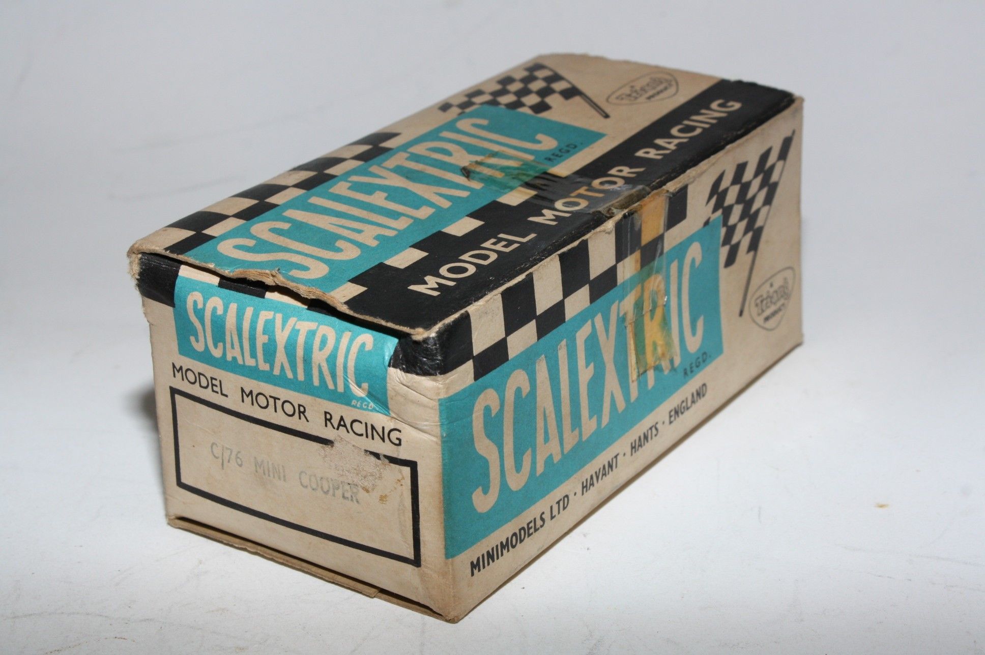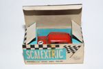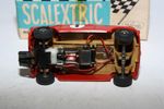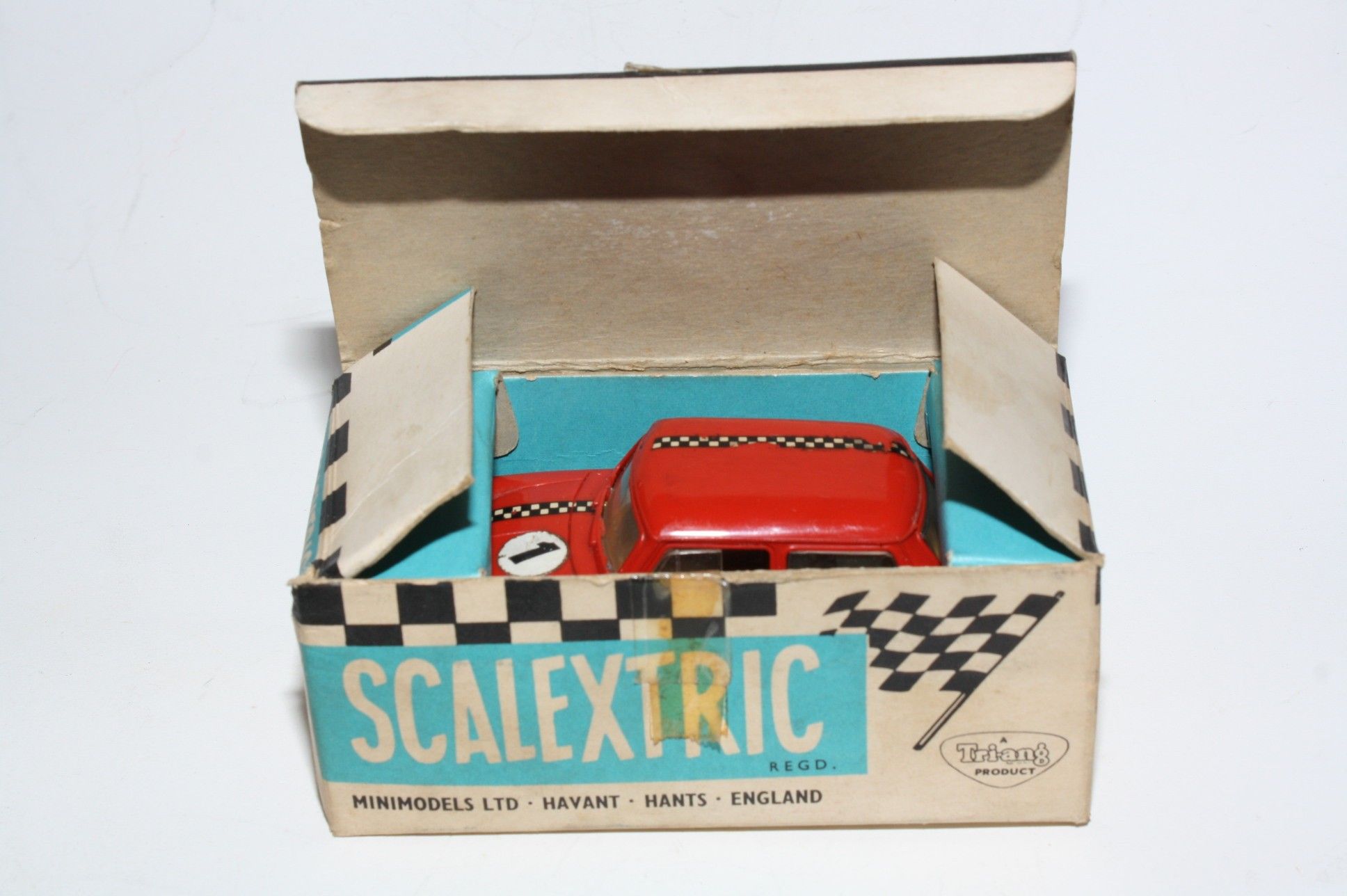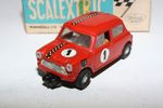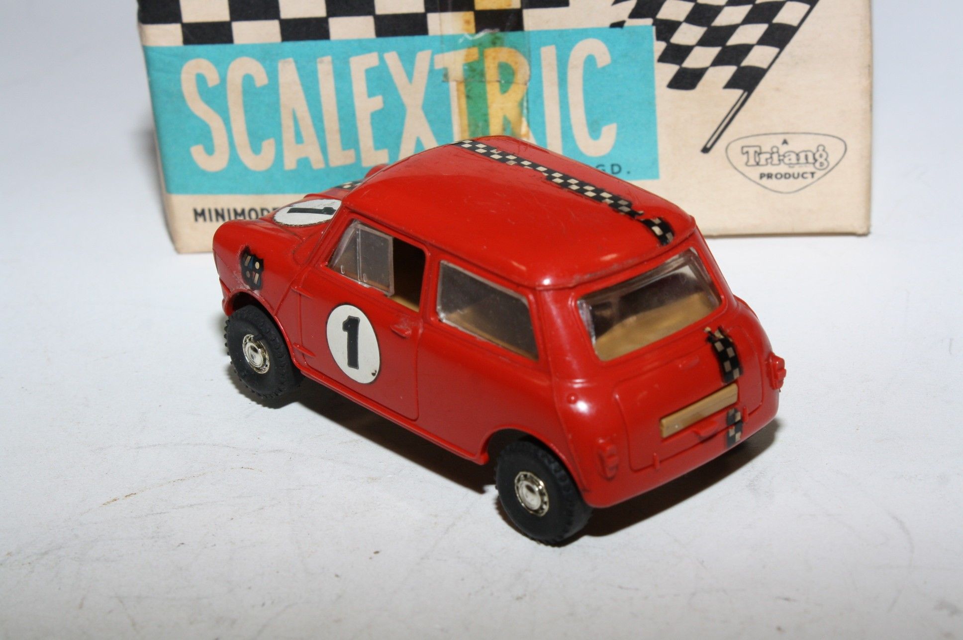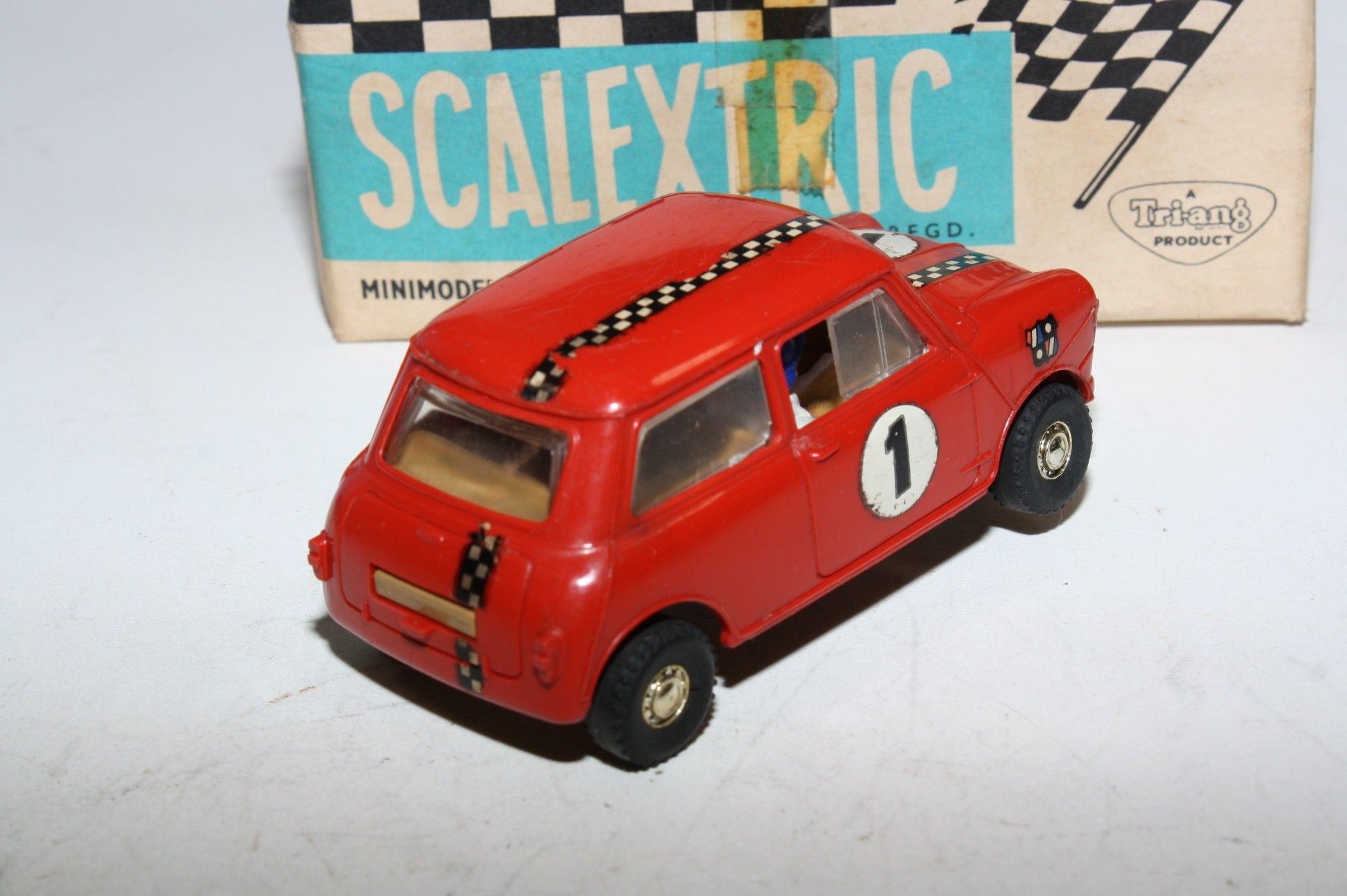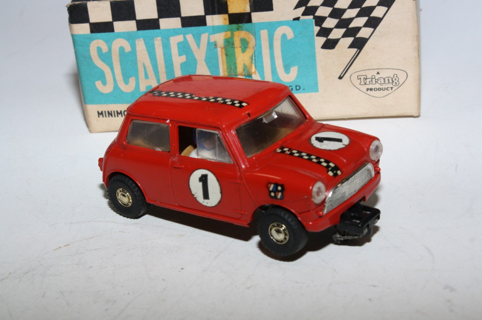 Classic Tri-ang Scalextric model racing/slot Mini Cooper racing car with red body, chrome style hubs, white driver figure with blue helmet, tested and running, may need brushes and servicing. Racing number 1, slight loss to decals. Comes with original box with correct colour spot in good condition but with some age related wear, please study the photos for exact condition.