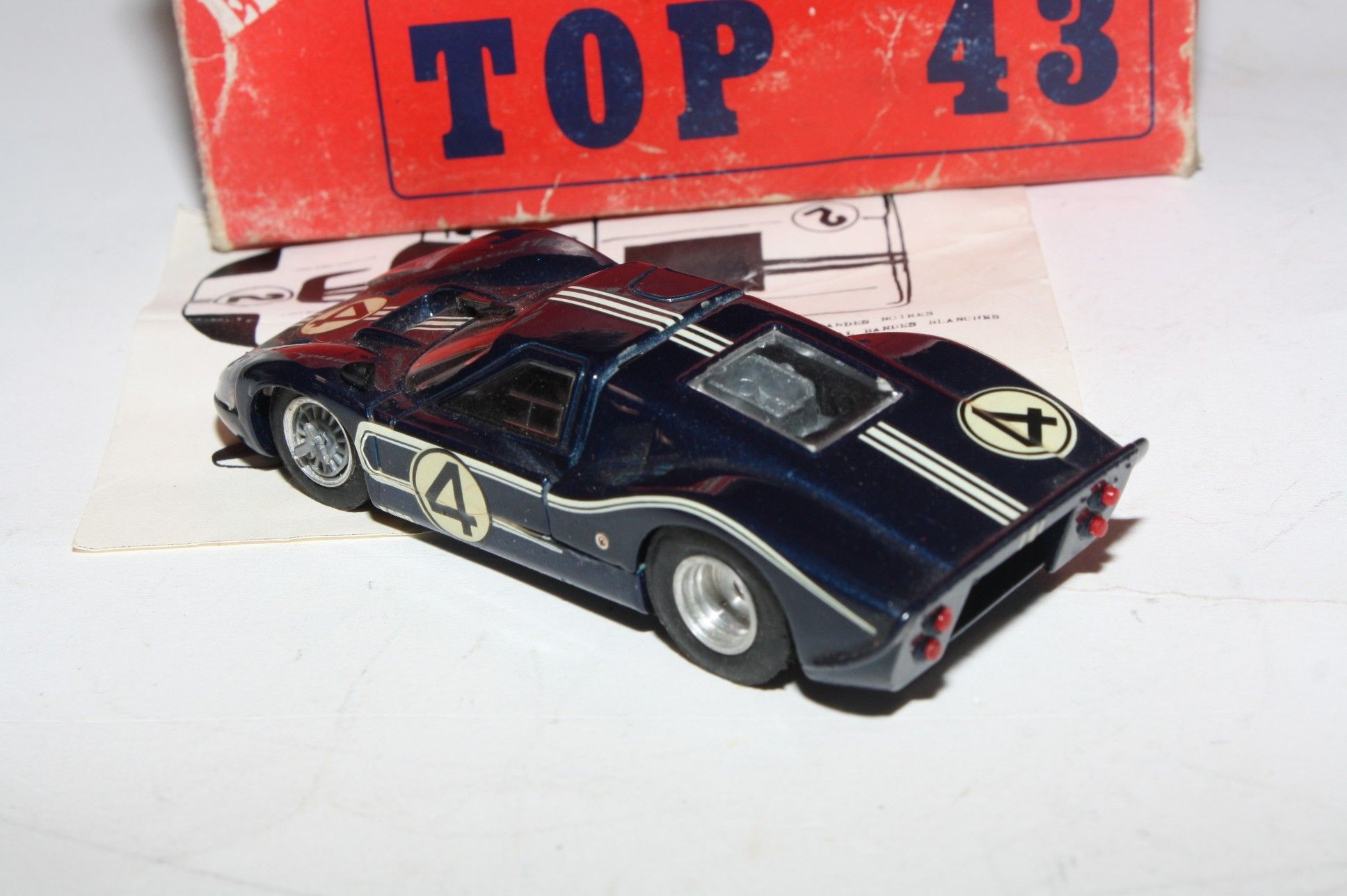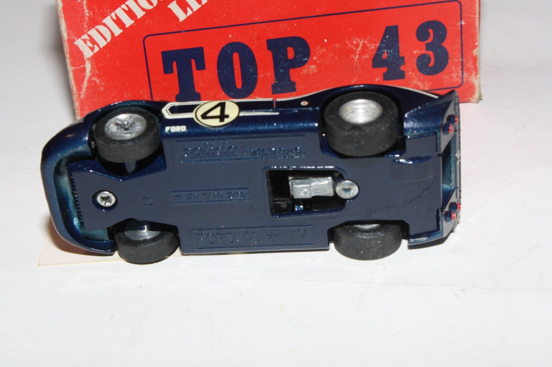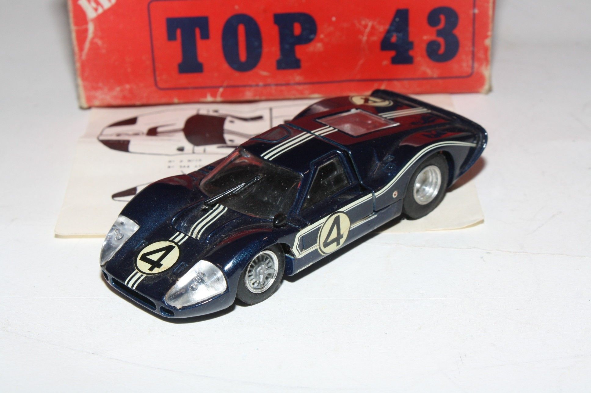 A nice example of this Le Mans classic racer Solido model. Model has been assembled and decals applied. Original navy blue paintwork is near mint with a couple of small nicks, please study the photos for exact condition. Original slick tyres on alloy hubs,good windowsm black interior, plastic light covers and windscreen wiper present, good racing numbers and stripes, underside mint.