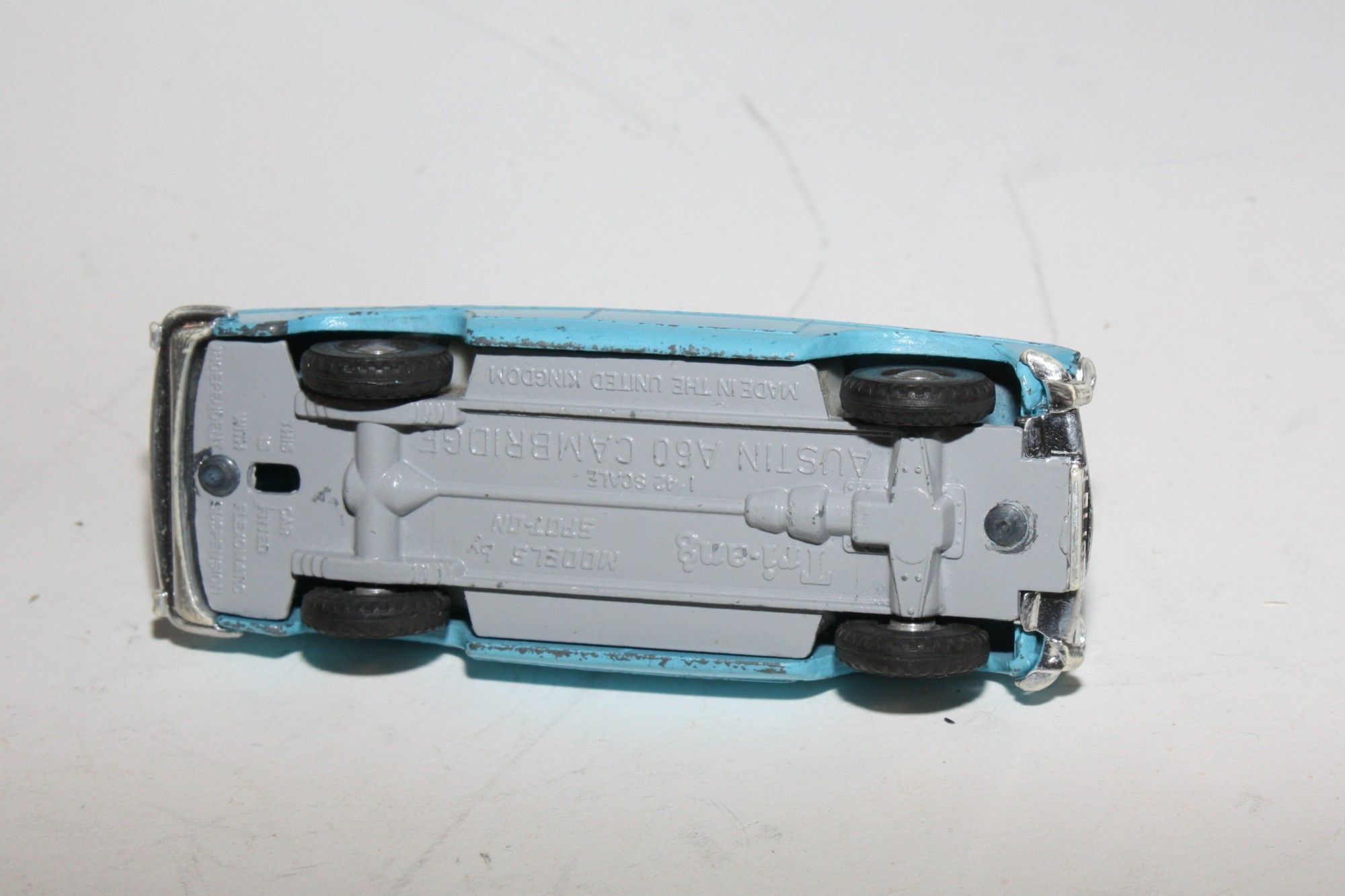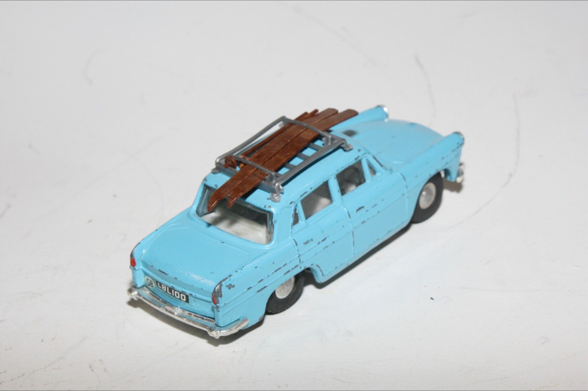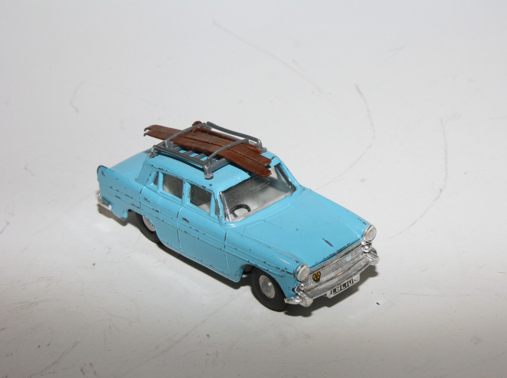 A nice example of this Spot On model. Original pale blue paintwork is good with a few small chips and rubs mainly to raised edges, please study the photos for exact condition. Good tyres on spun hubs, good windows, white interior and steering wheel. Bumpers intact, . Roof rack good and complete with original skis and poles. Good gloss grey baseplate.