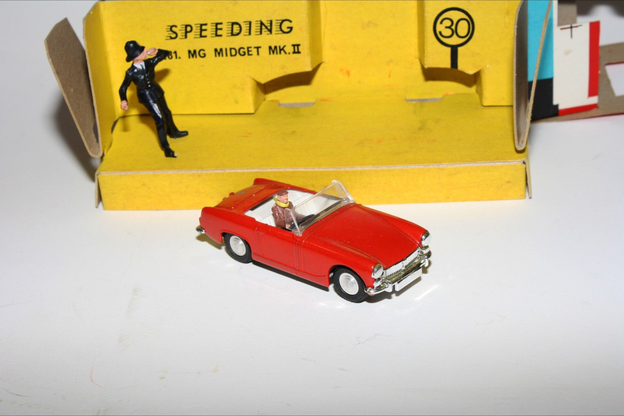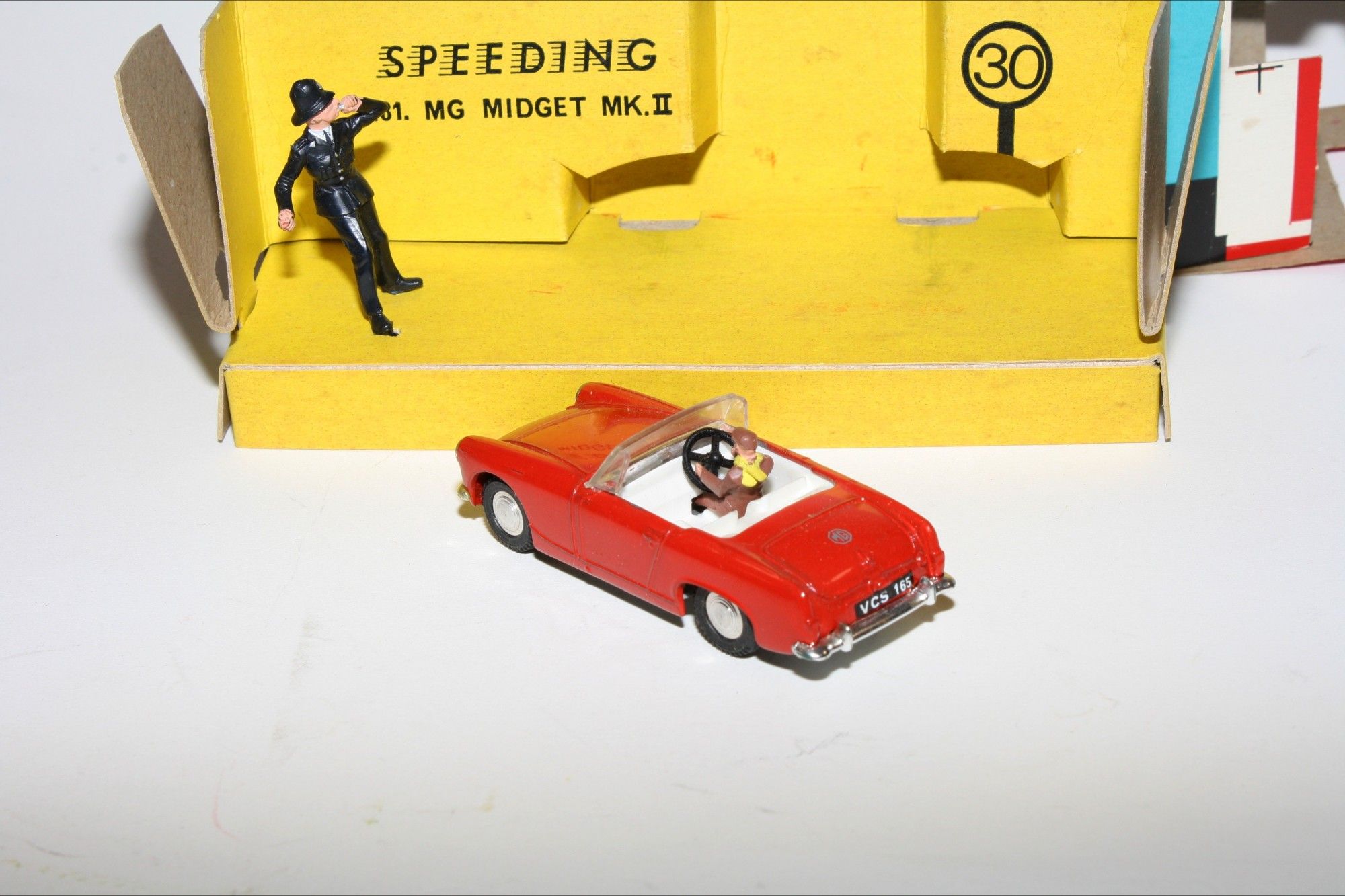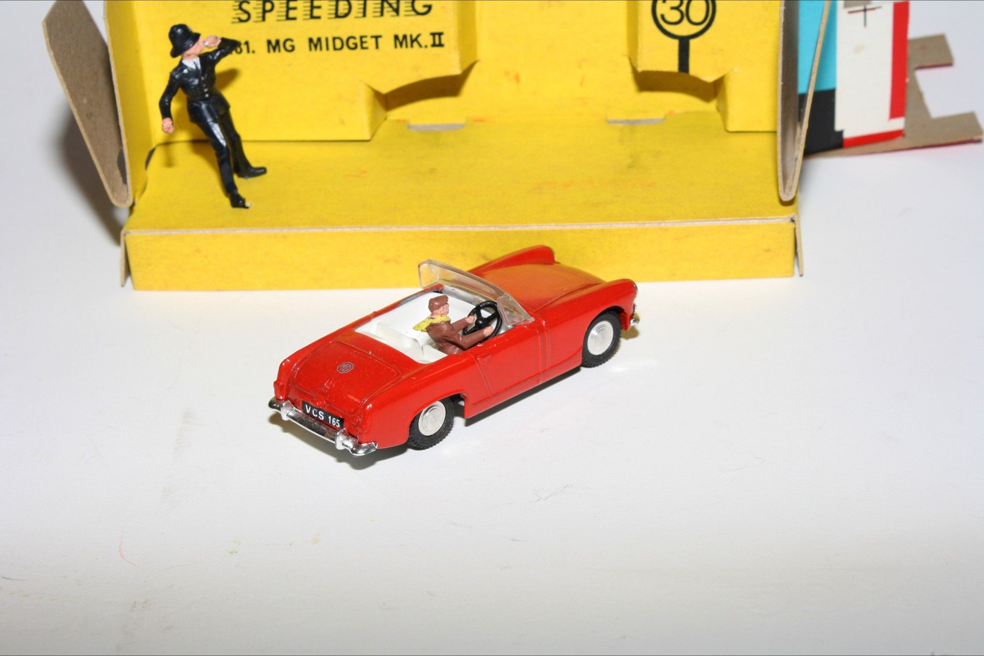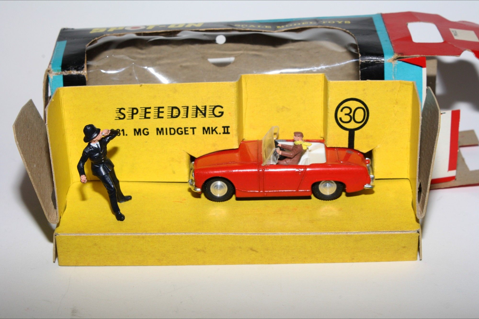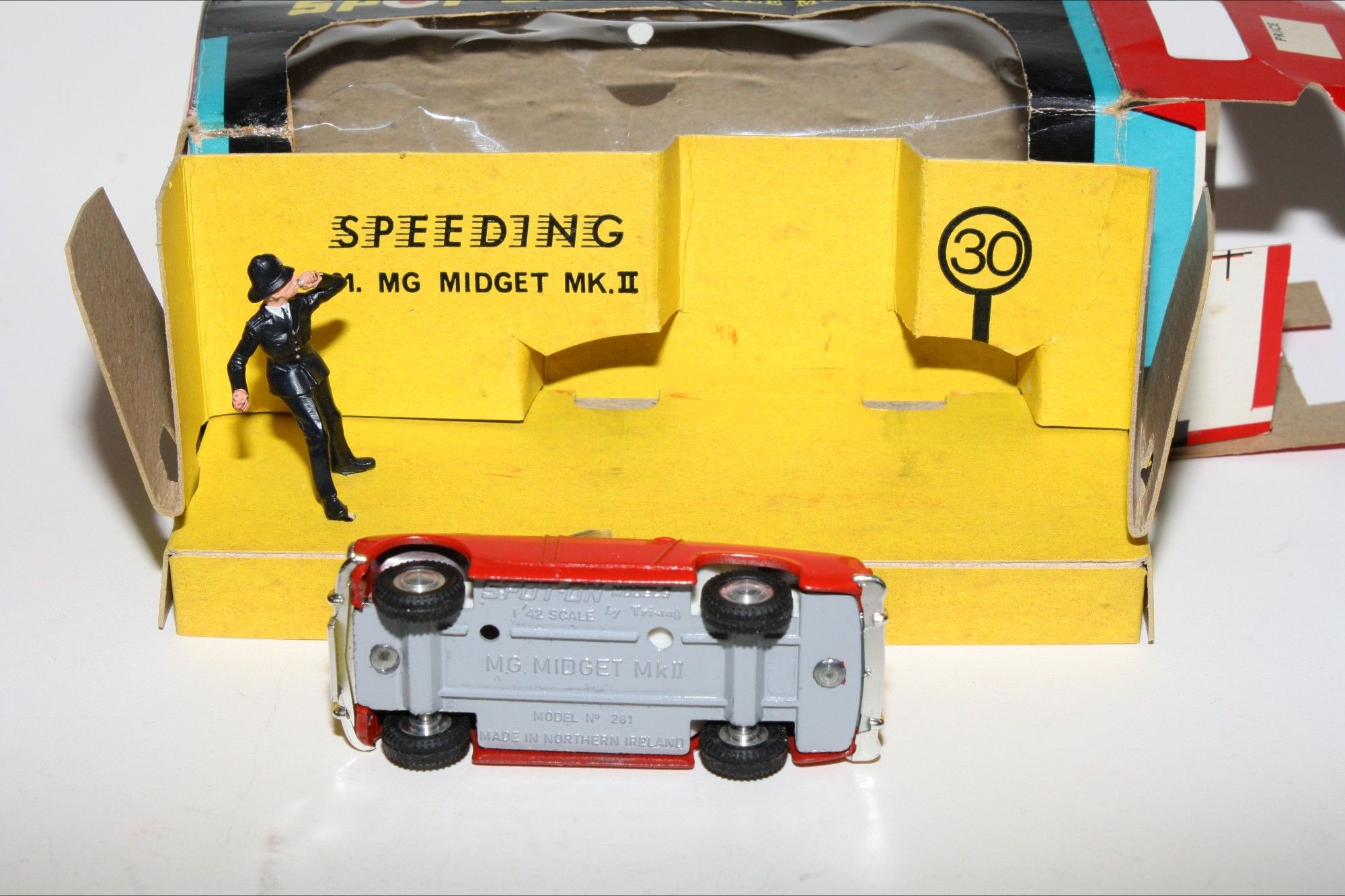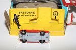 A superb example of this beautiful Spot On model model set. Gleaming red paintwork is mint, please study the photos for exact condition. Good tyres on spun hubs with perfect windscreen, interior and steering wheel. Driver and policeman figures mint.