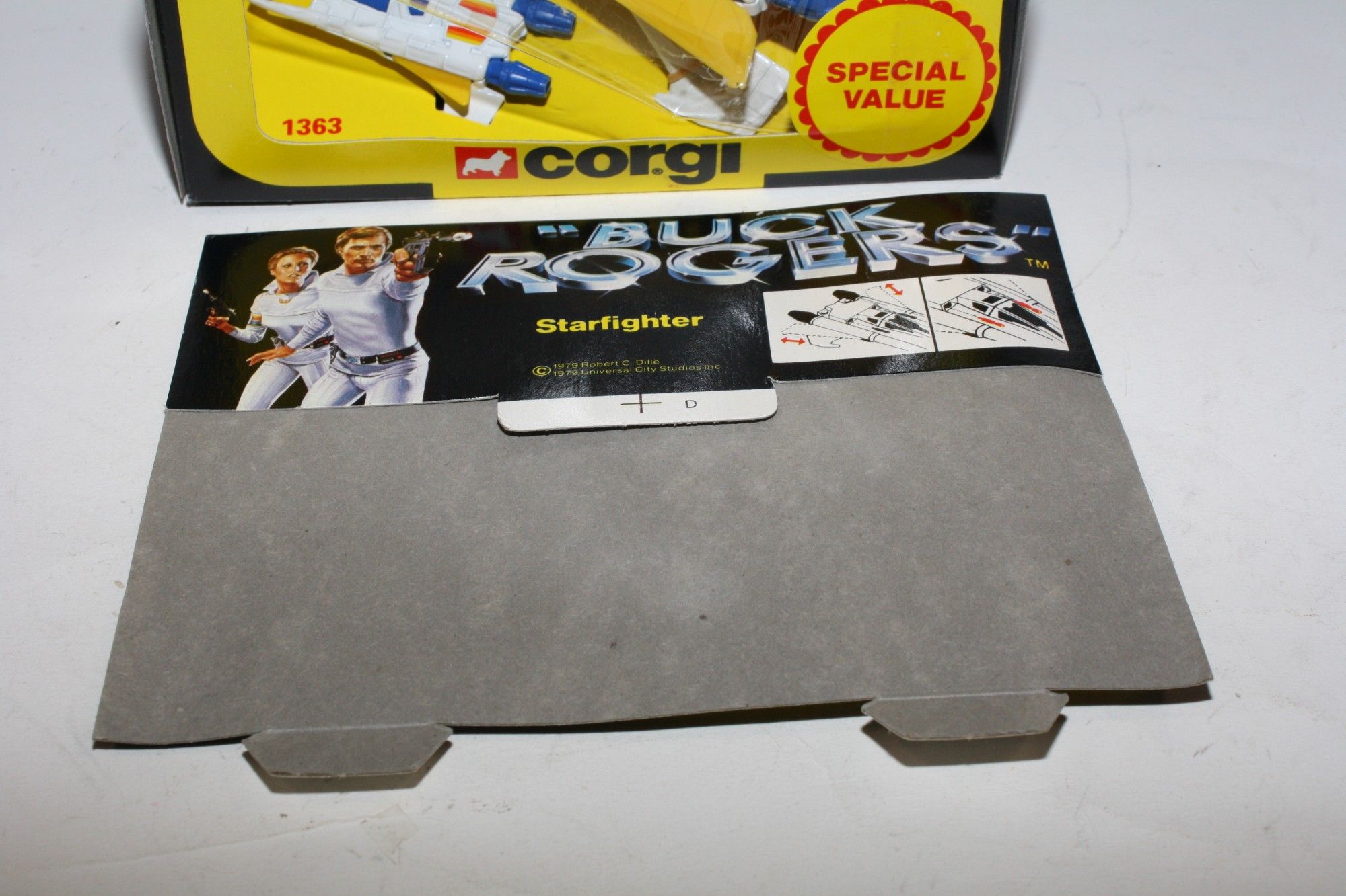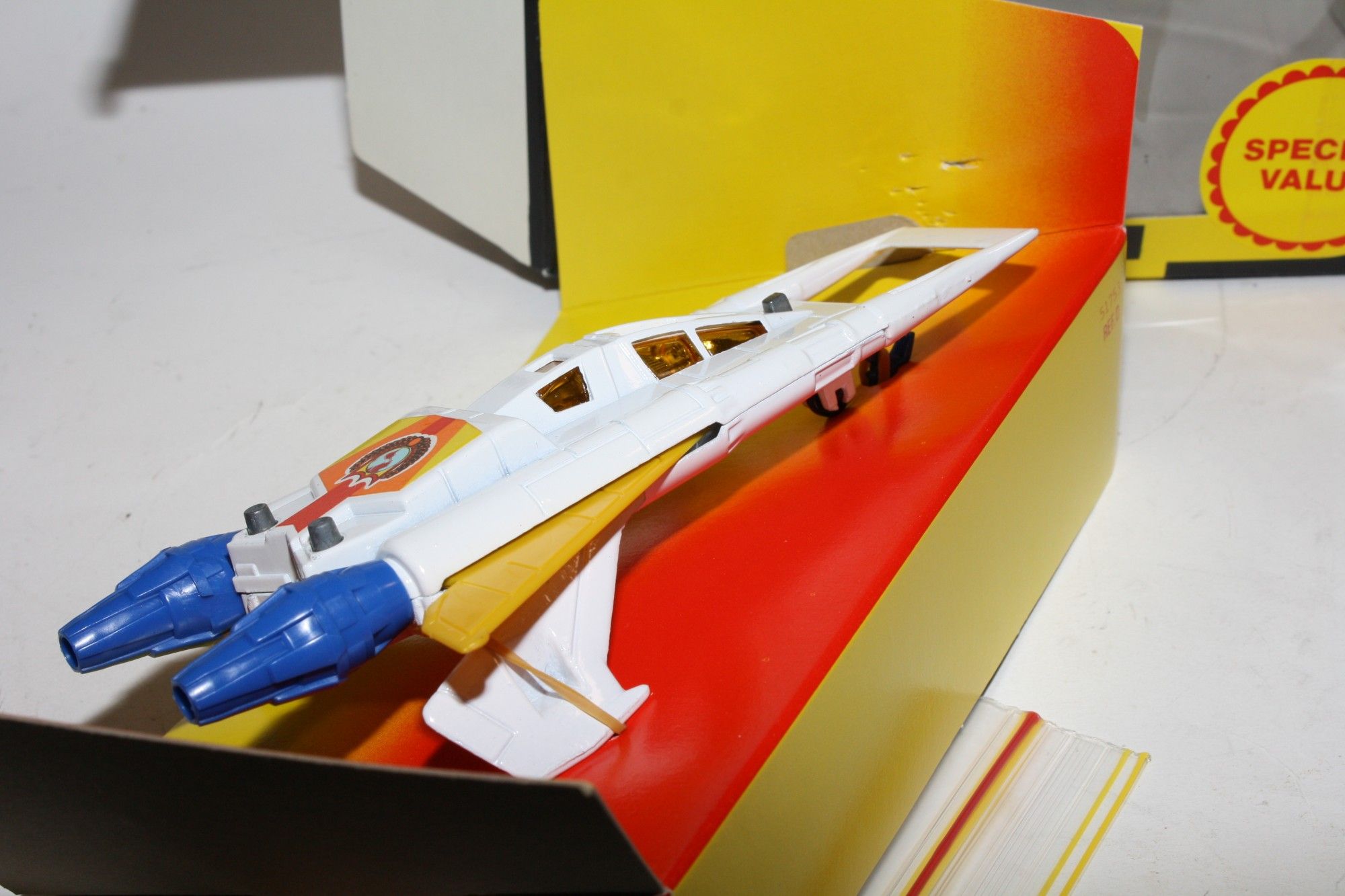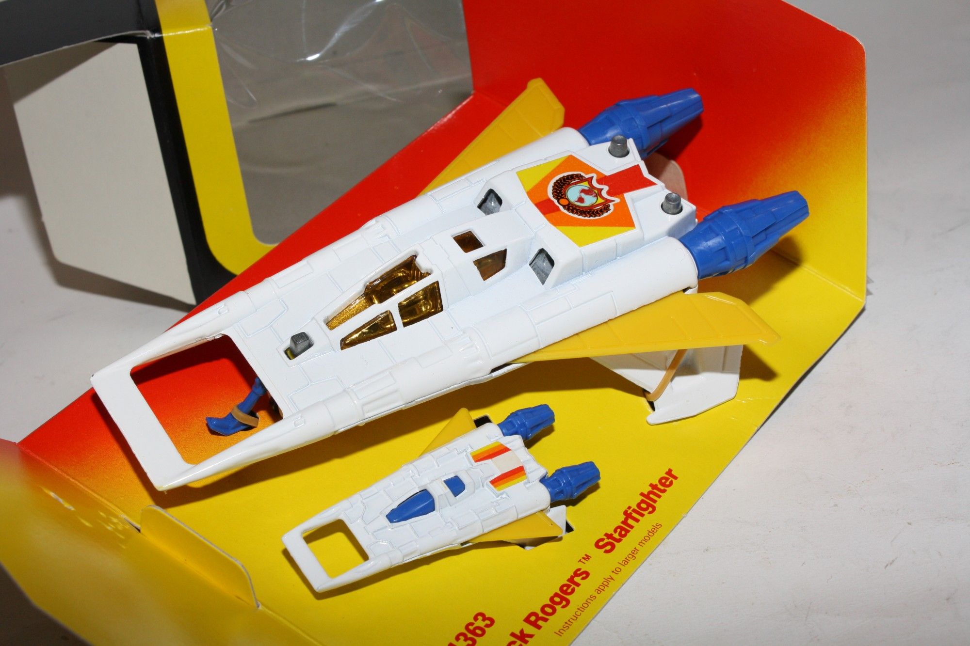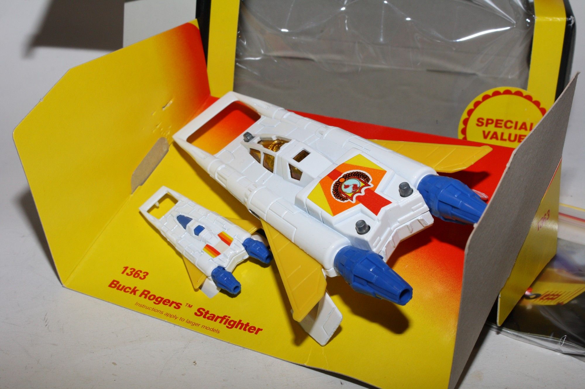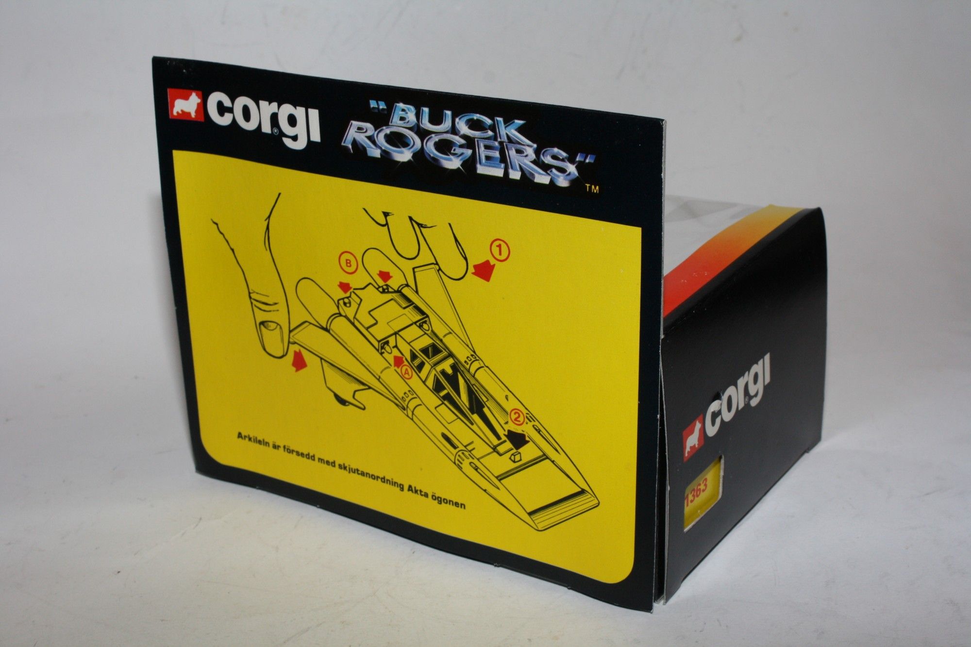 A superb example of this sort after Corgi Buck Rogers set, I have acquired a number of these ex shop stock sets from a colleague in Australia following a shop closure. Gleaming white paintwork is mint on both Starfighters, please study the photos for exact condition. All features full working with mint stickers. Still attached to plinth with original band. Comes with original unused sprue with missiles and correct period catalogue supplied with set.