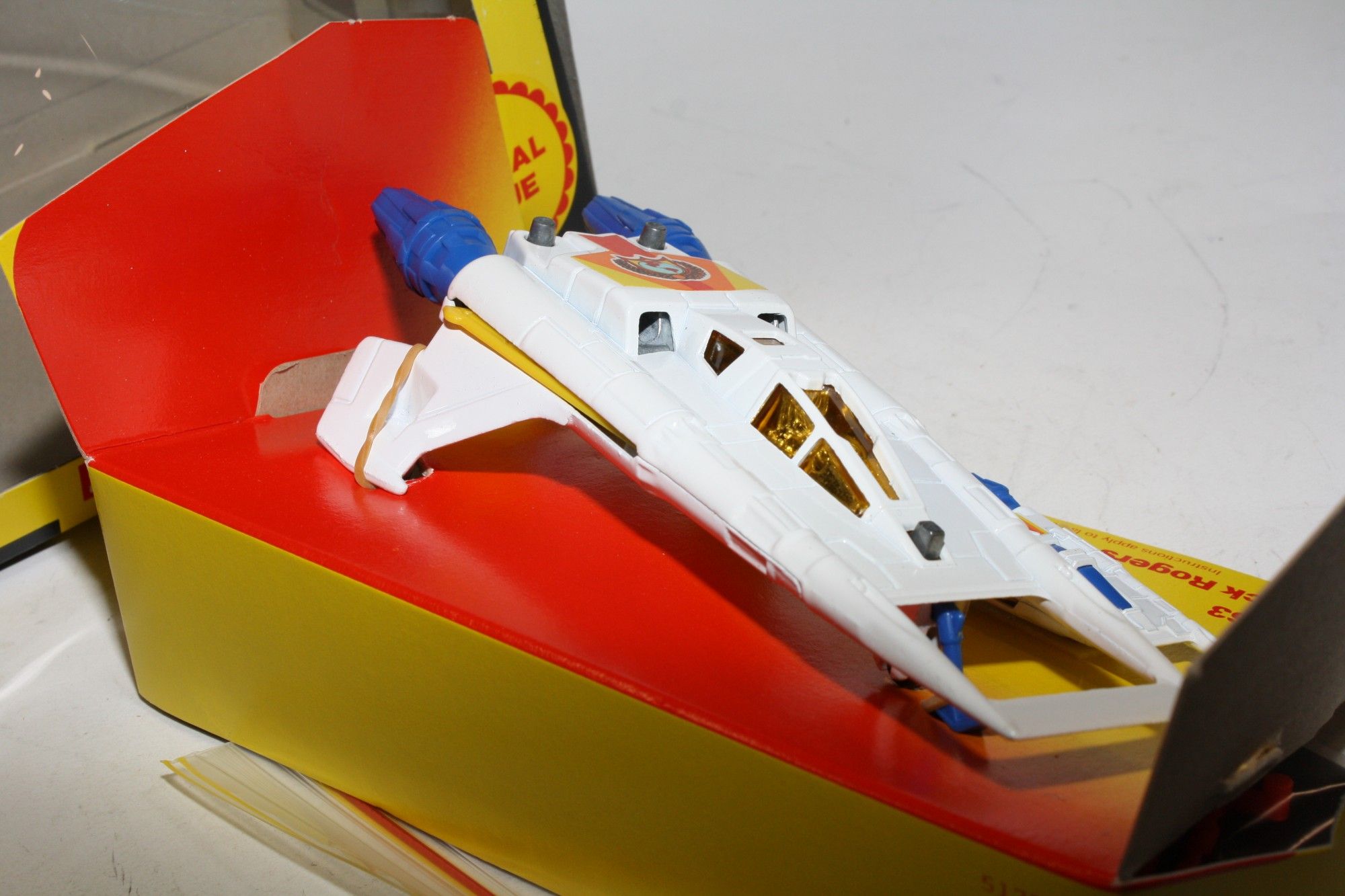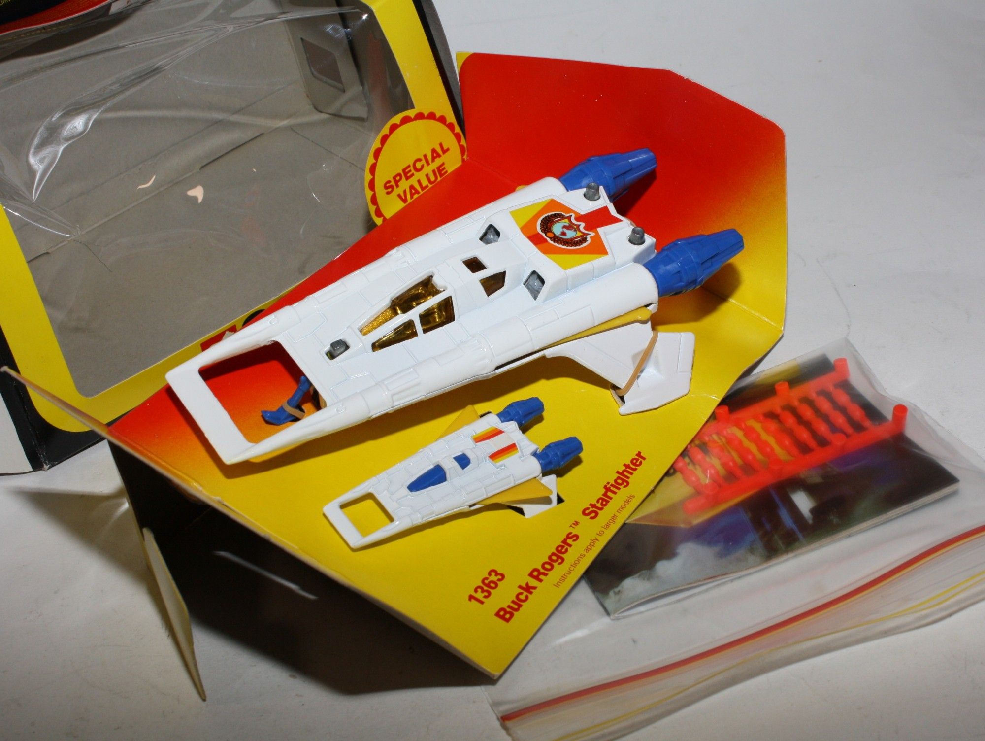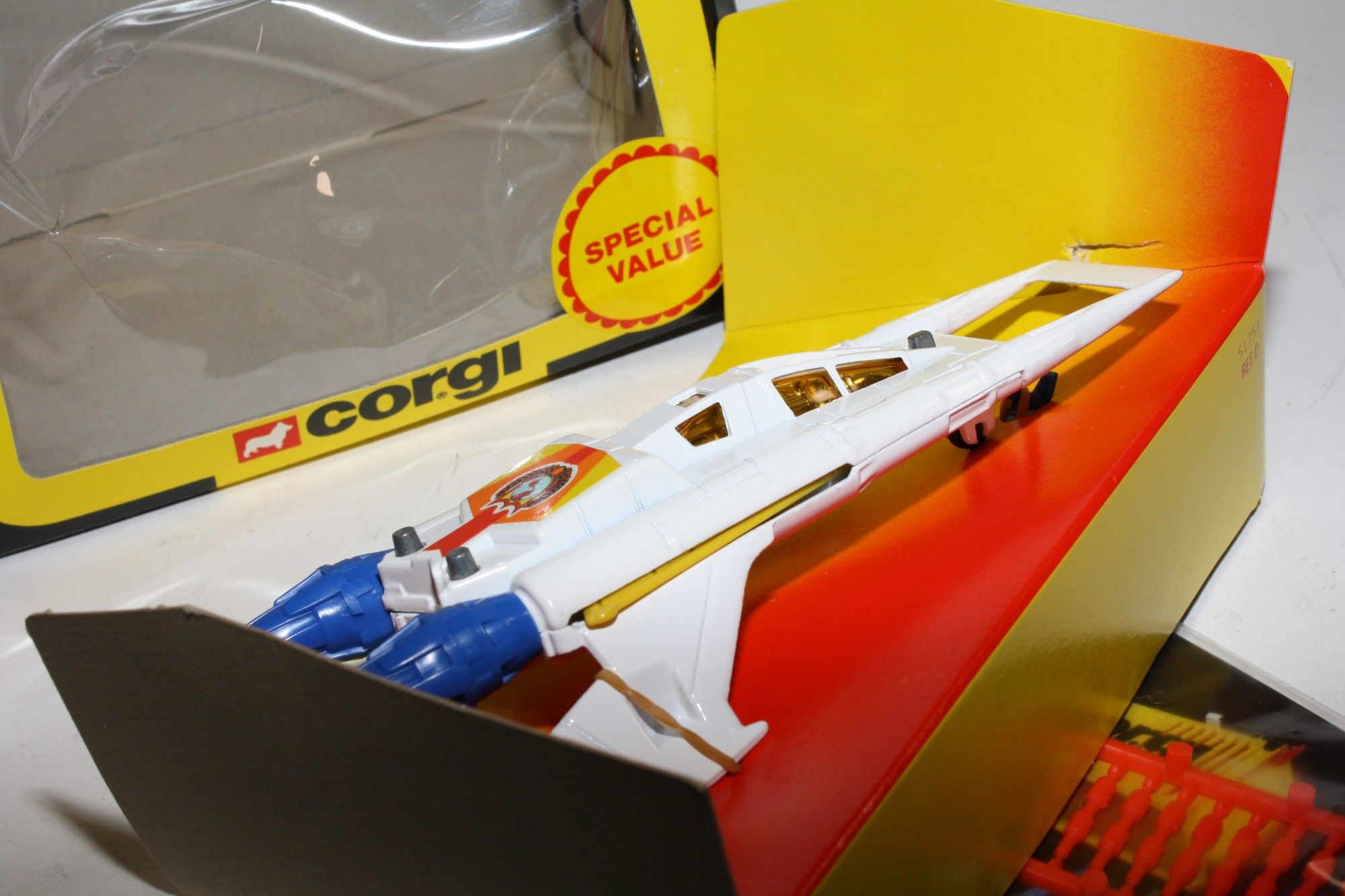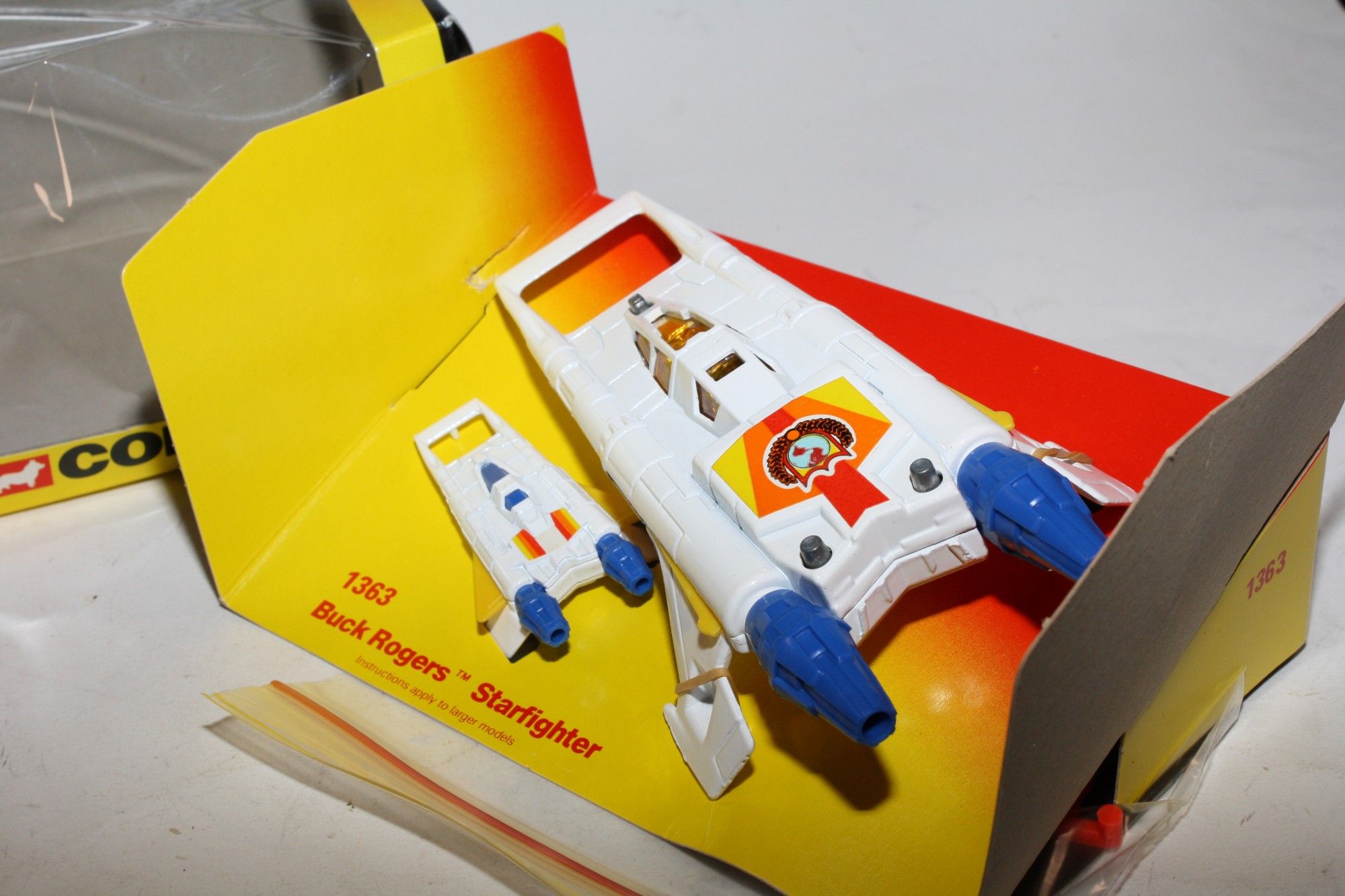 A superb example of this sort after Corgi Buck Rogers set, I have acquired a number of these ex shop stock sets from a colleague in Australia following a shop closure. Gleaming white paintwork is mint on both Starfighters, please study the photos for exact condition. All features full working with mint stickers. Still attached to plinth with original band. Comes with original unused sprue with missiles and the correct period catalogue supplied with set.
