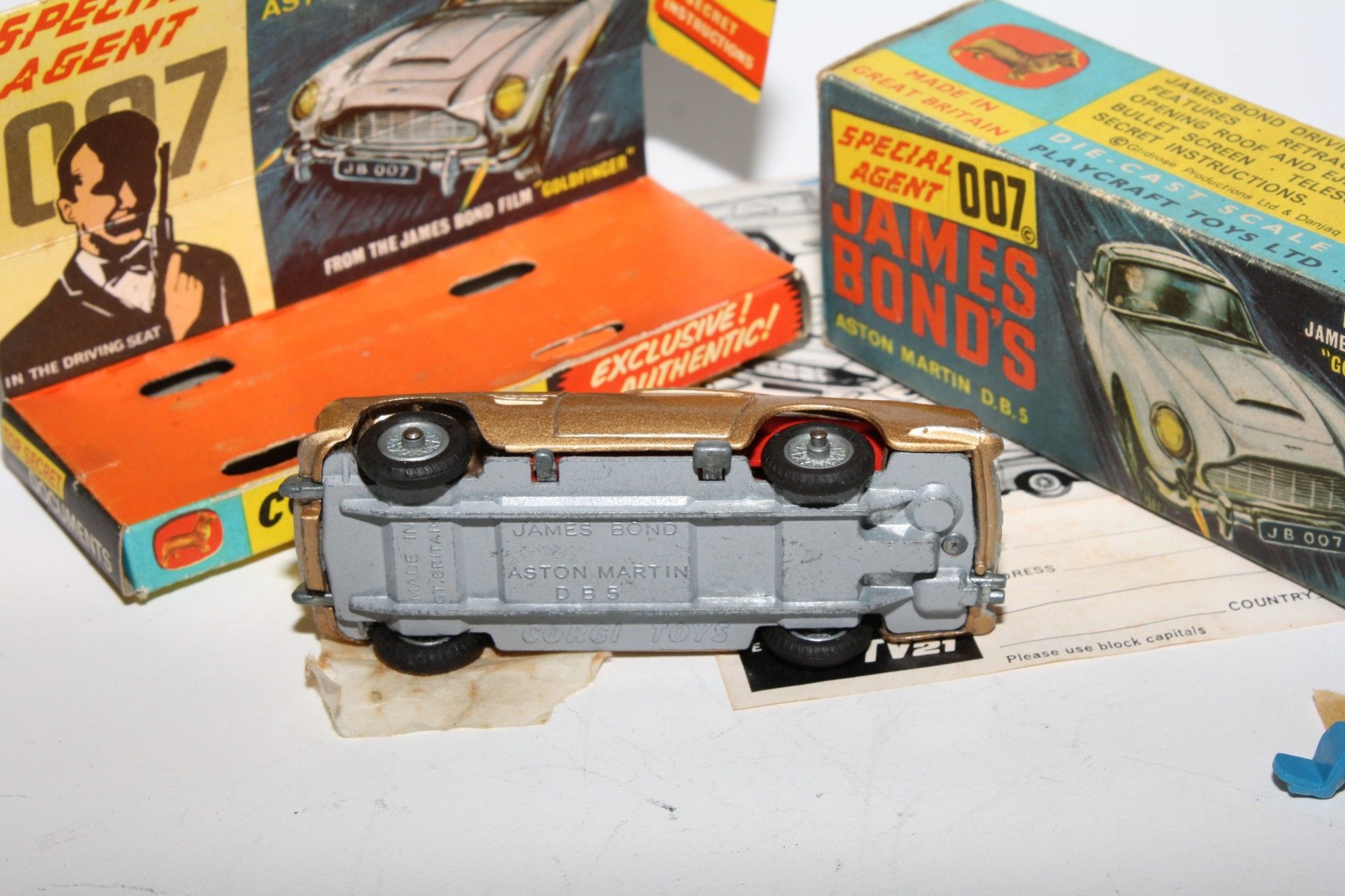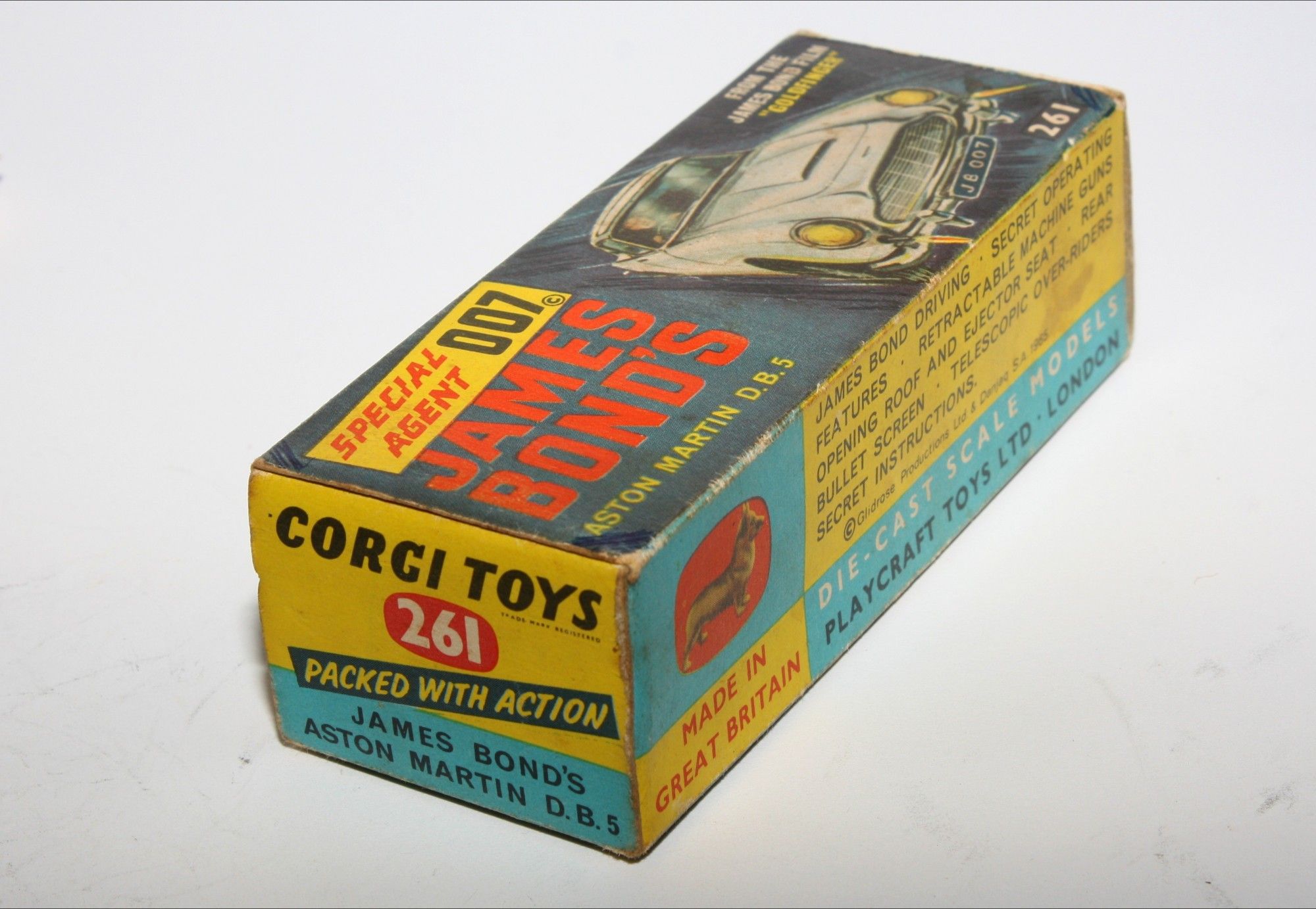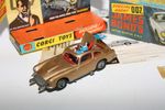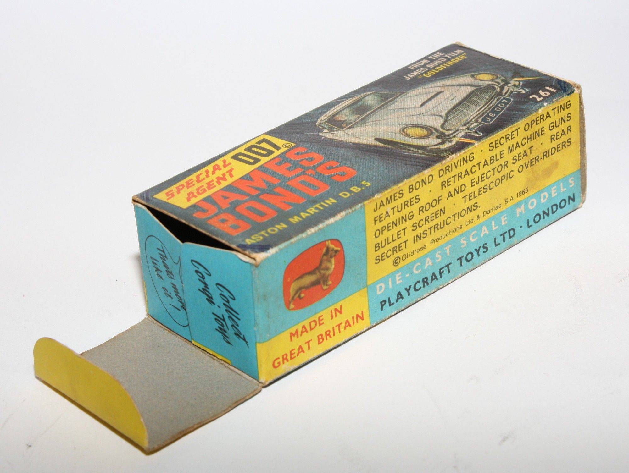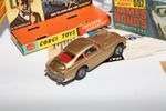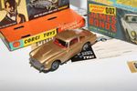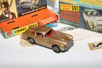 A beautiful example of this iconic Corgi James Bond model. Gleaming gold paintwork is virtually mint, please study the photos for exact condition. All original tyres and spoked hubs, suspension excellent. Clear windows and perfect interior with James Bond figure present. All features work, machine guns, rear shield and ejector seat all good. Roof sits nice and flush and clicks nicely into position. Base plate very good.