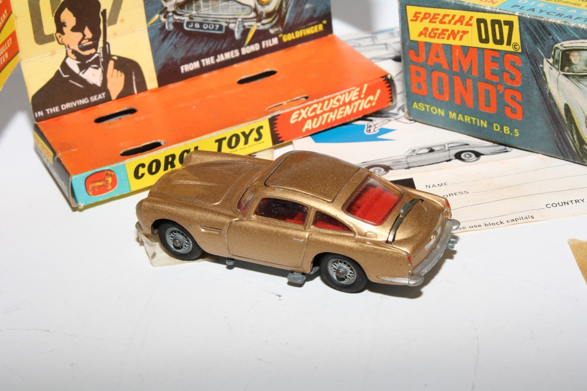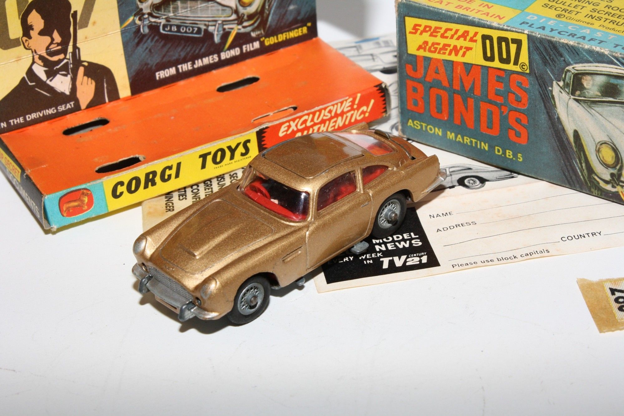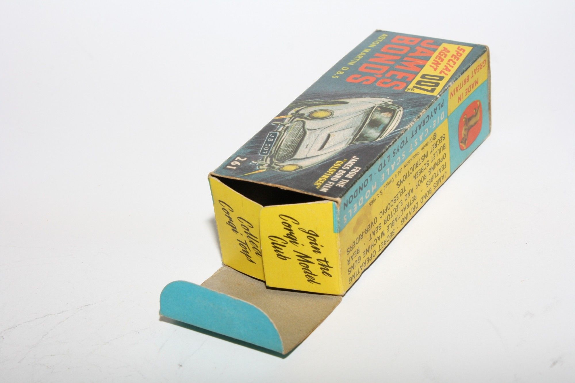 A beautiful example of this iconic Corgi James Bond model. Gleaming gold paintwork is virtually mint, please study the photos for exact condition. All original tyres and spoked hubs, suspension excellent. Clear windows and perfect interior with James Bond figure present. All features work, machine guns, rear shield and ejector seat all good. Roof sits nice and flush and clicks nicely into position. Base plate very good.