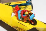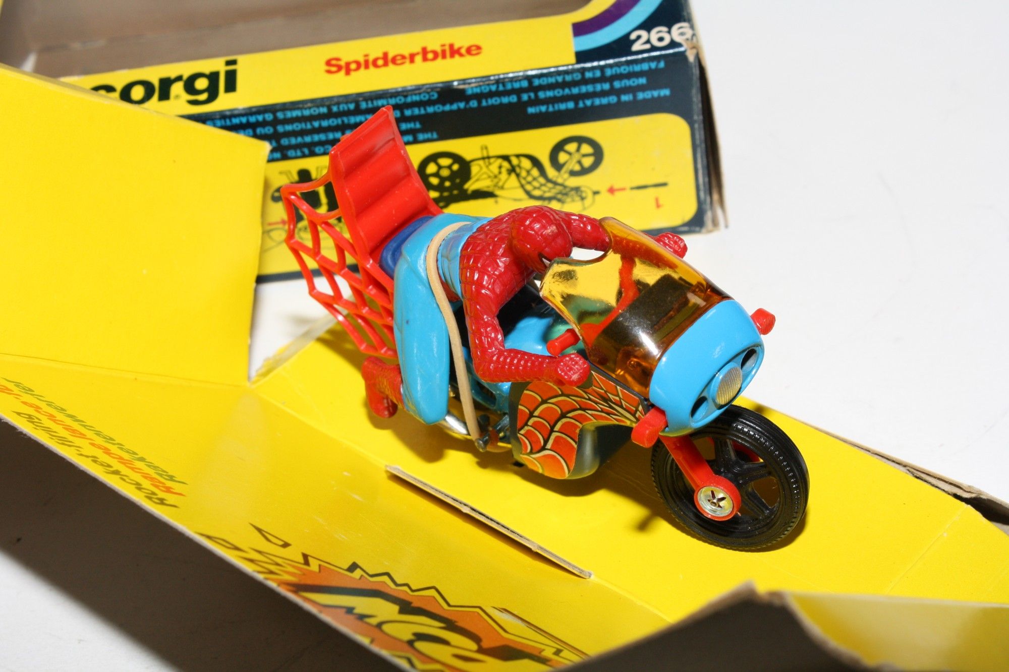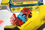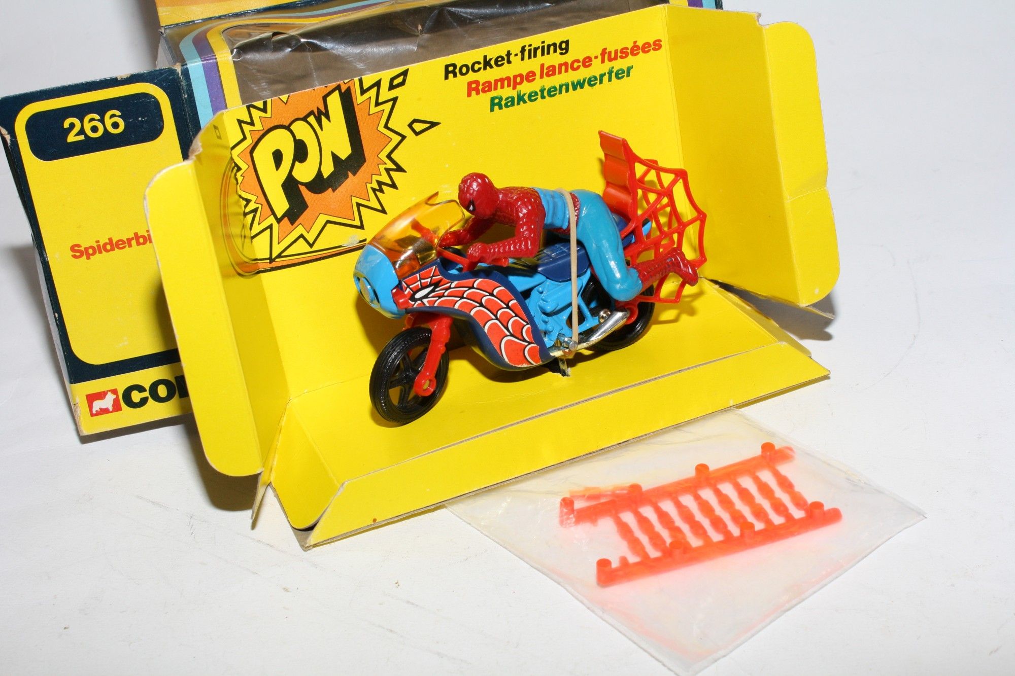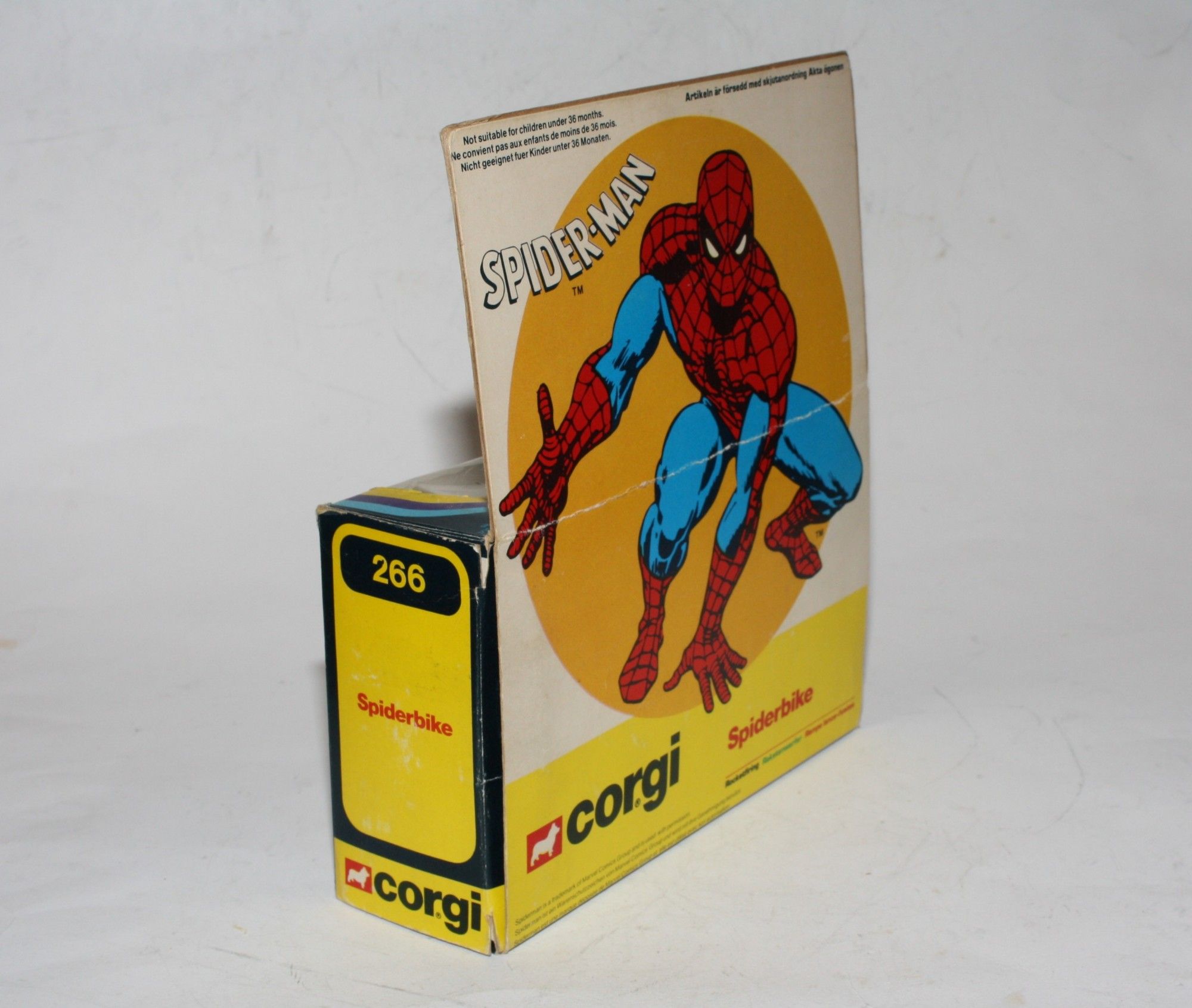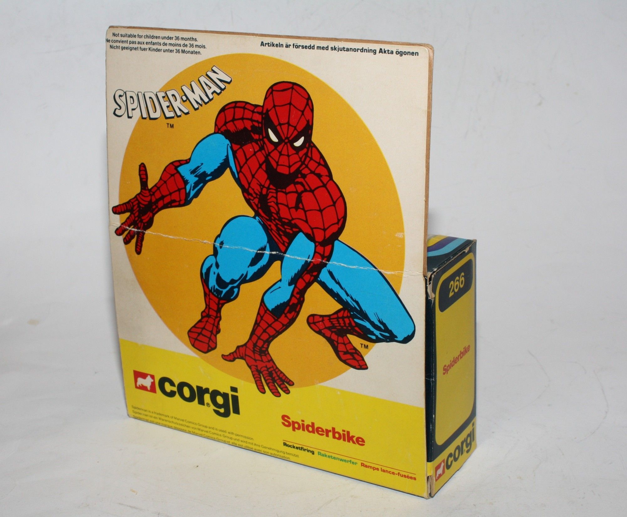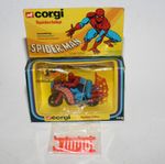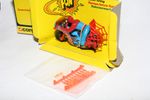 A superb example of this Spiderbike model. Paintwork is original and mint, never played with, please study the photos for exact condition. Perfect black plastic wheels, fairing, stickers, windscreen, handlebars and Spiderman figure. Bike stand intact and red plastic web seat back, powerful missile launchers and comes with 10 original unused missiles on sprue (1 detached). model is held by correct retainer to plinth. Underside perfect.