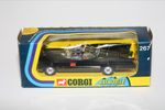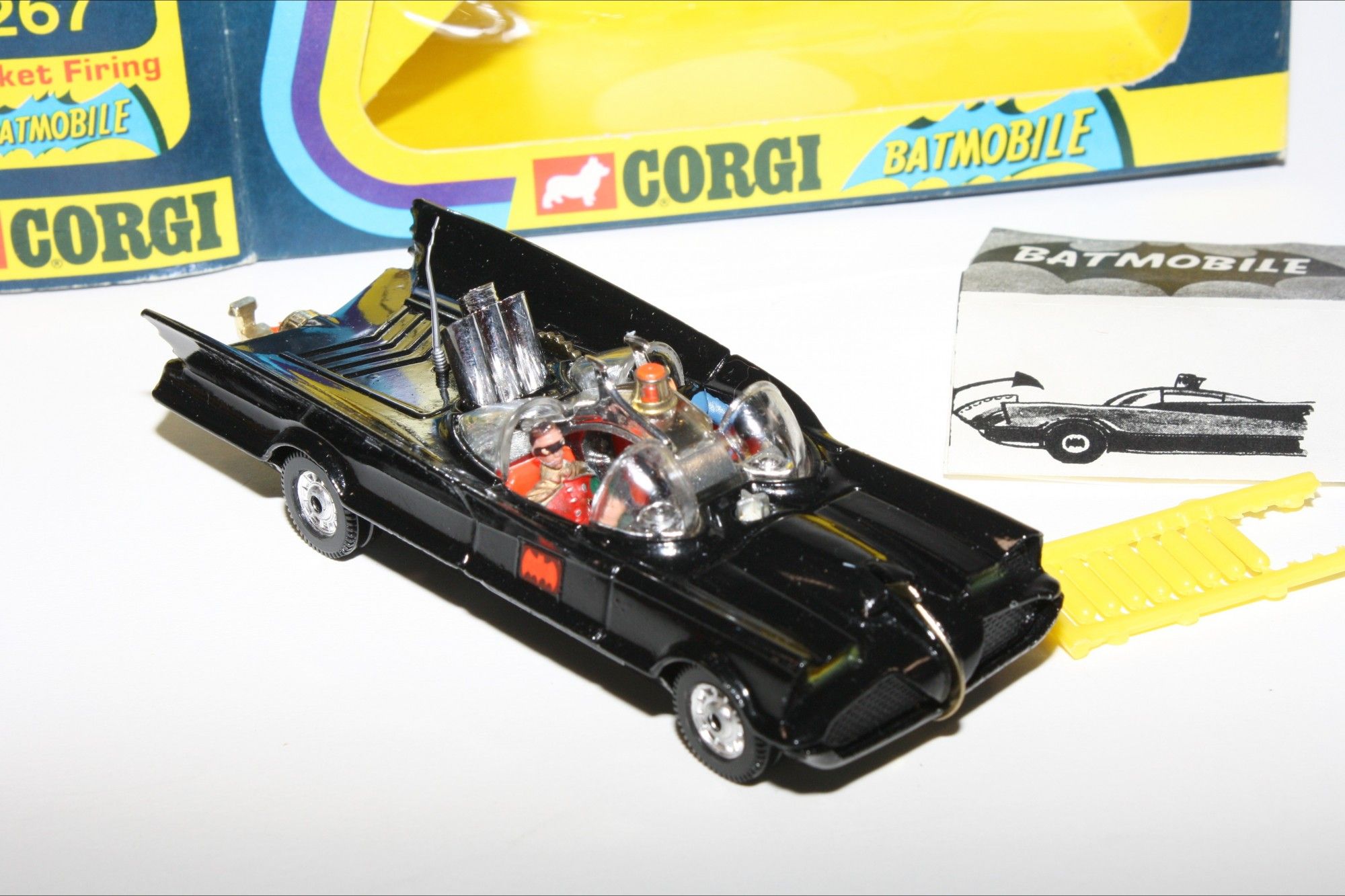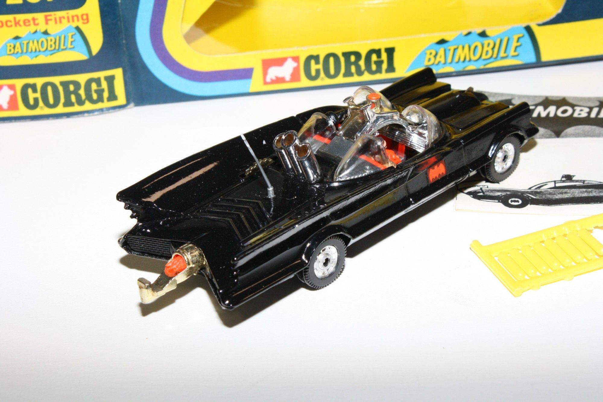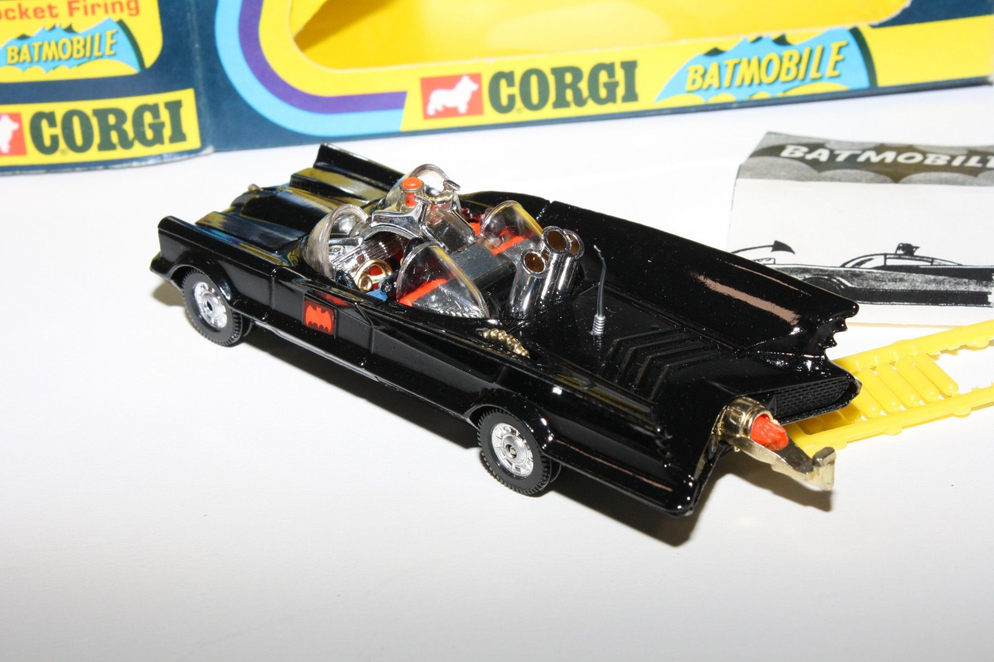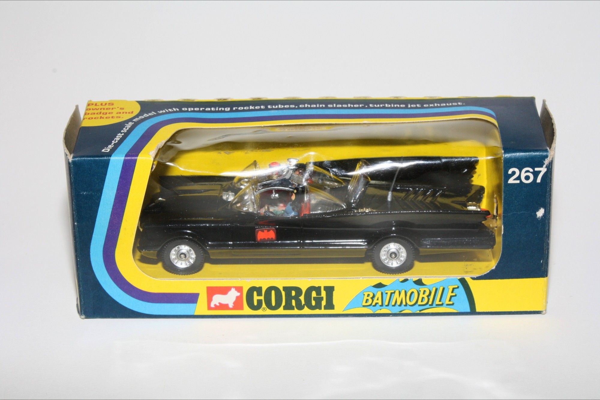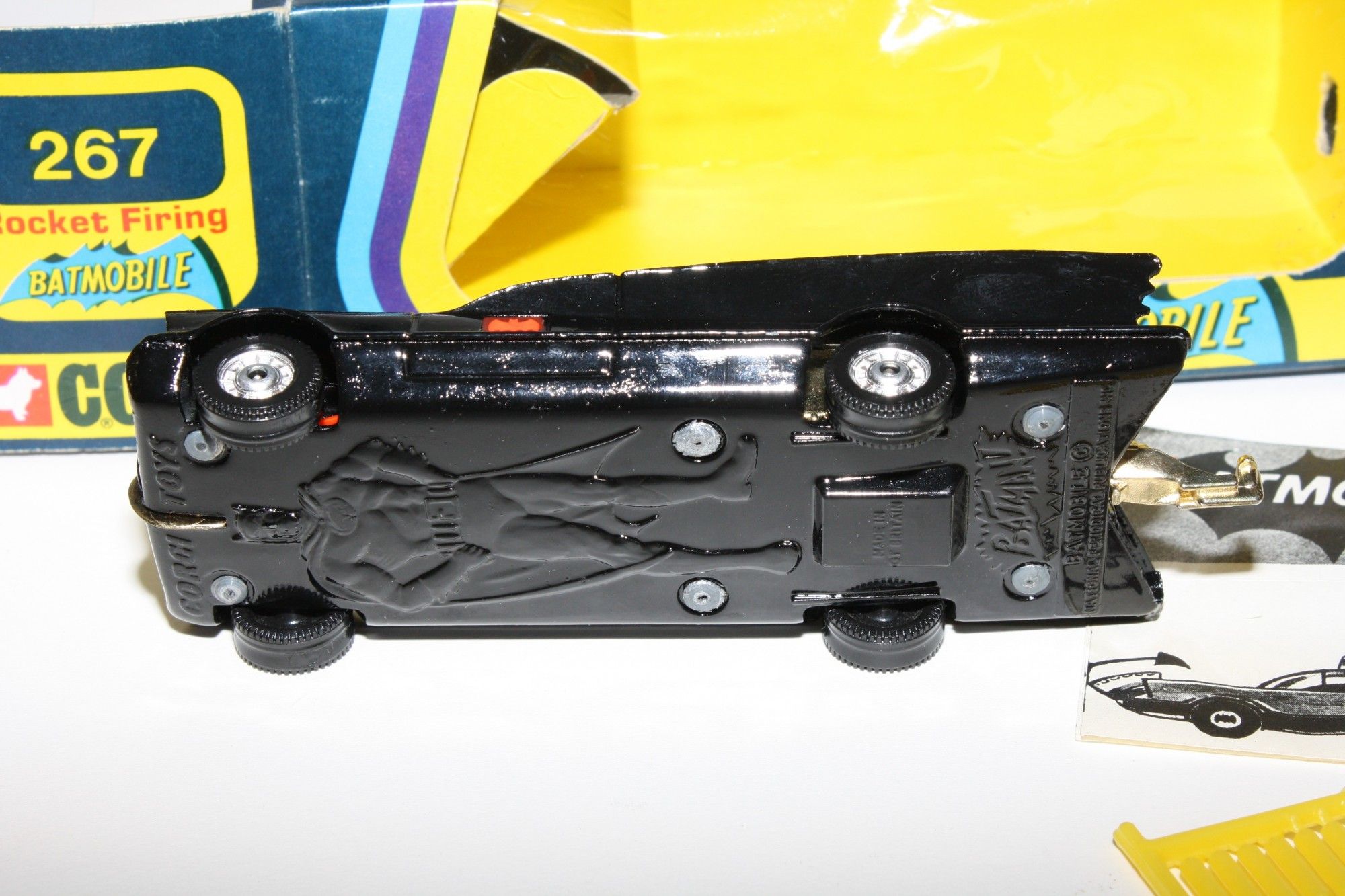 Gleaming original gloss black paintwork in mint condition, please study the photos. All perfect chrome 12 spoke Whizzwheels, perfect strong suspension all round, perfect harder to find clear cockpit windscreens with no cracks, original Batman and Robin figures present, roof beacon, all features working, rocket launchers and chain cutter, gleaming gold tow hook with flame (static version), Bat logos on doors present and excellent, aerial present, mint underside.