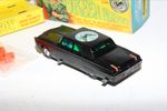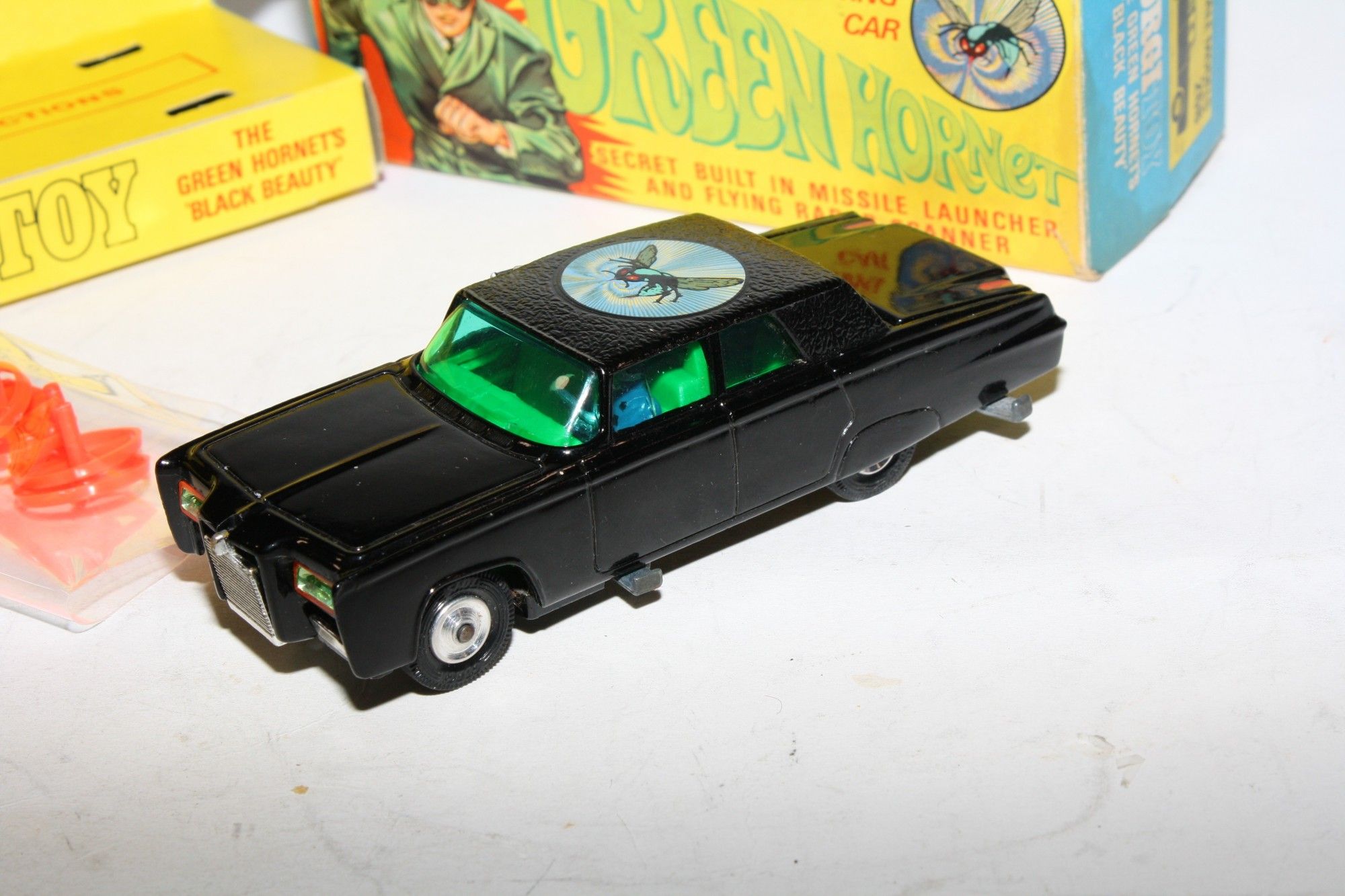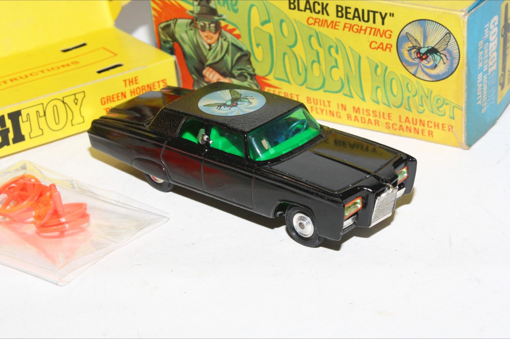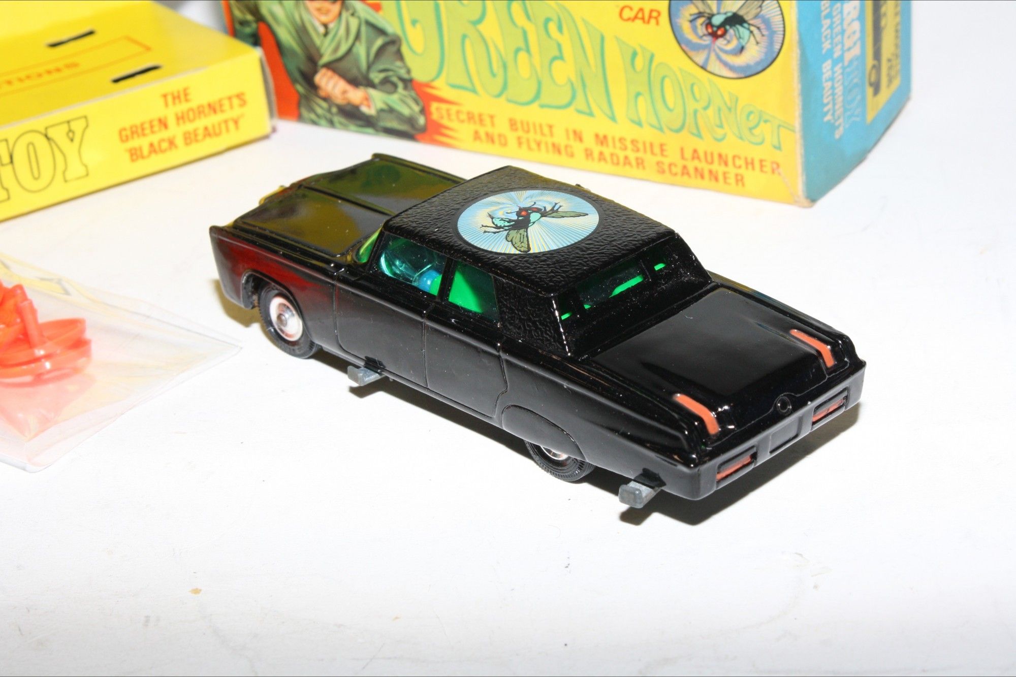 A superb example of this iconic Black Beauty model from the 1960's TV series The Green Hornet. Gleaming gloss black paintwork is mint, please study the photos for exact condition. All original tyres on spun hubs, all windows, interior figures are perfect, original roof decal is mint, jewelled headlights, built in missile launcher and flying radar scanner features are working but front radiator droops, by pushing front button in and moving radiator into position manually it locks upright as you can see from the photos, ideal for display, reverse the procedure to release, excellent underside.