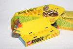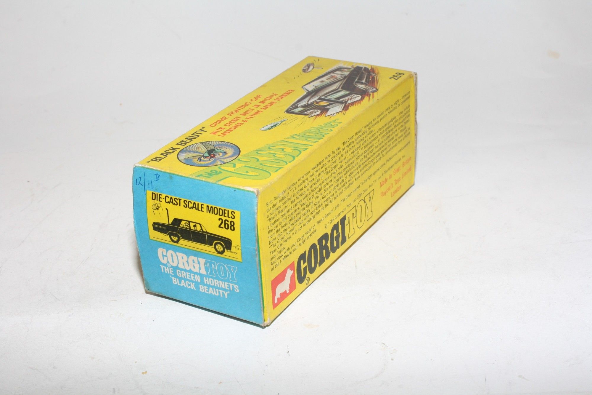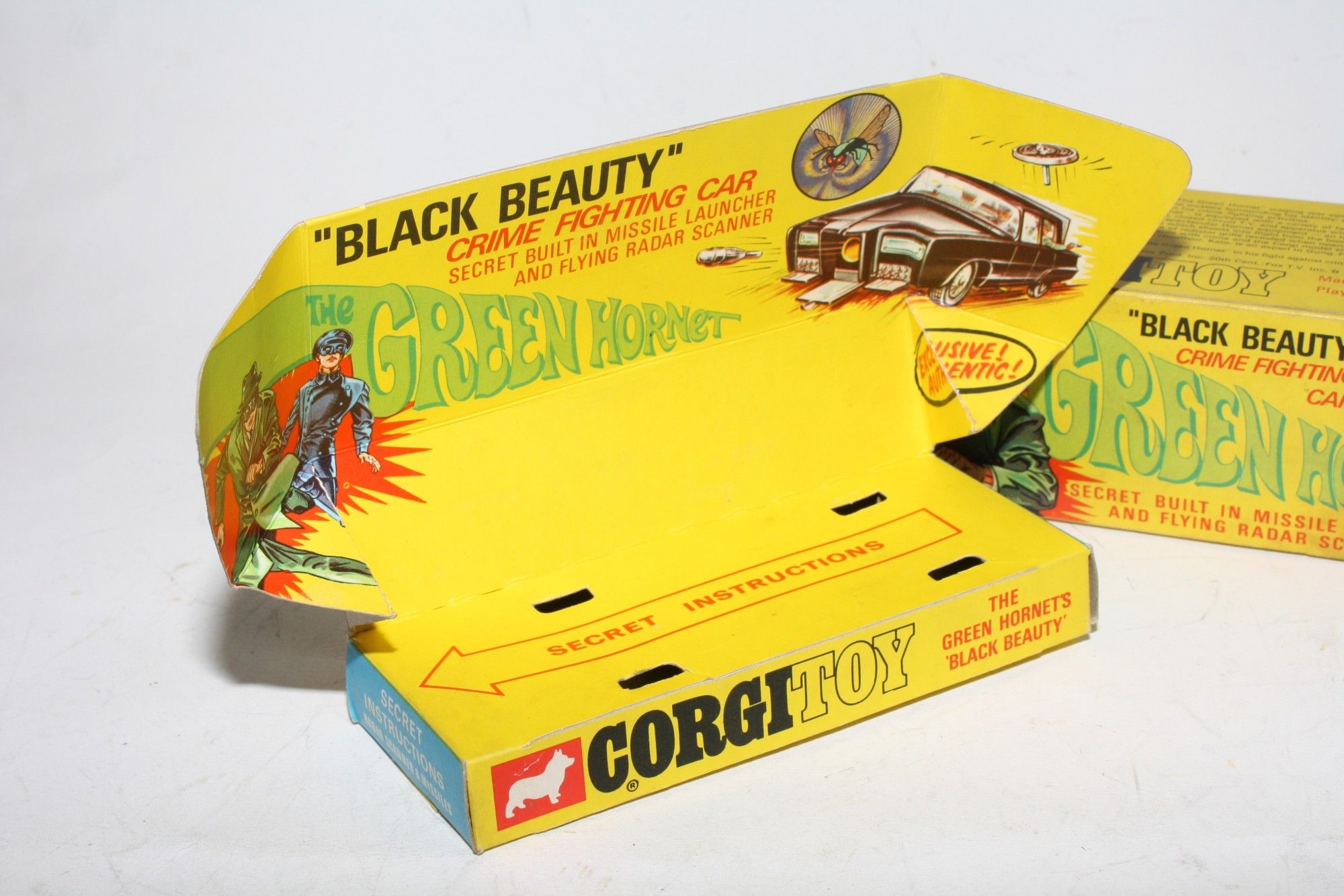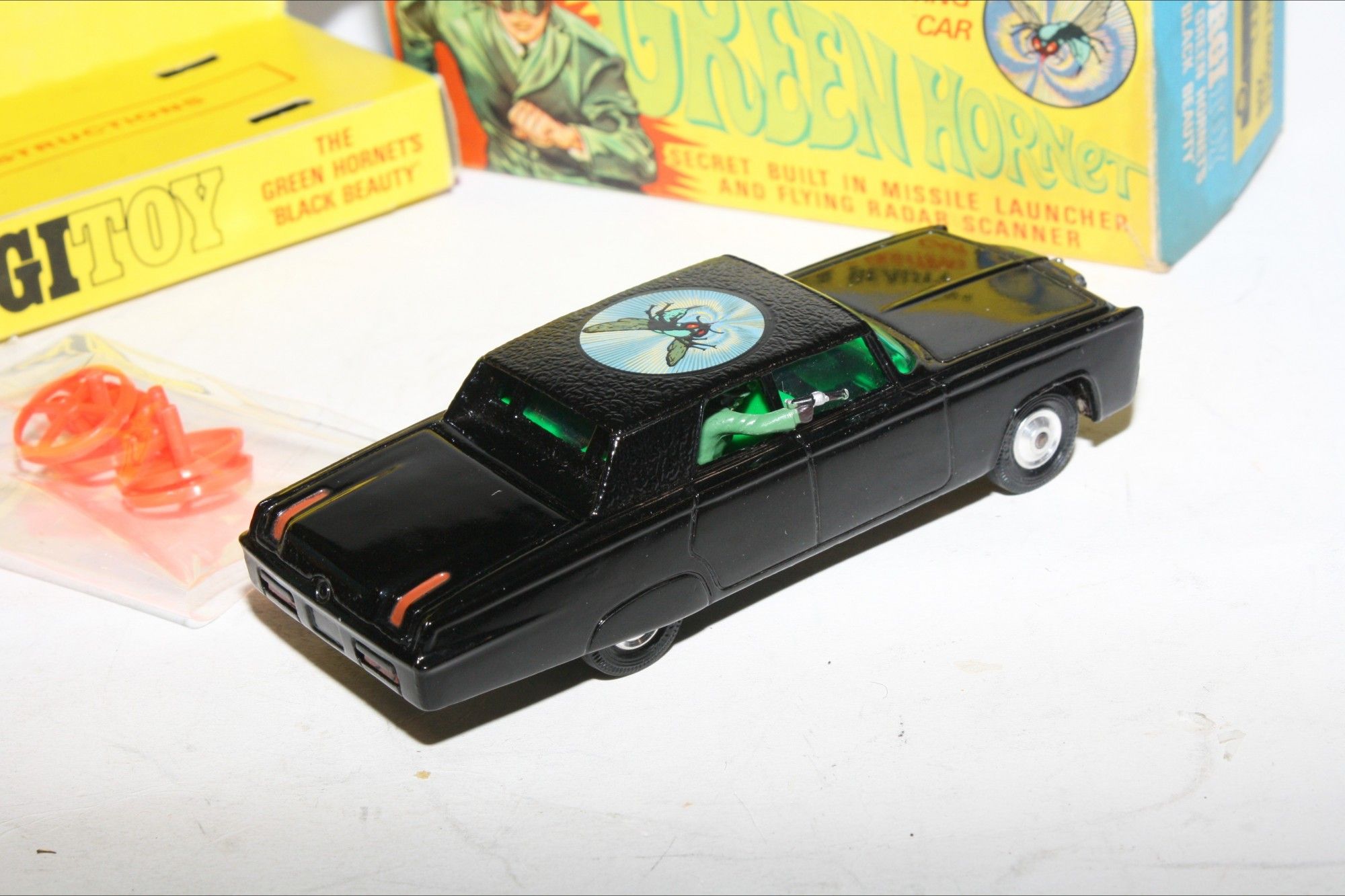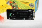A superb example of this iconic Black Beauty model from the 1960's TV series The Green Hornet. Gleaming gloss black paintwork is mint, please study the photos for exact condition. All original tyres on spun hubs, all windows, interior figures are perfect, original roof decal is mint, jewelled headlights, built in missile launcher and flying radar scanner features are working but front radiator droops, by pushing front button in and moving radiator into position manually it locks upright as you can see from the photos, ideal for display, reverse the procedure to release, excellent underside.