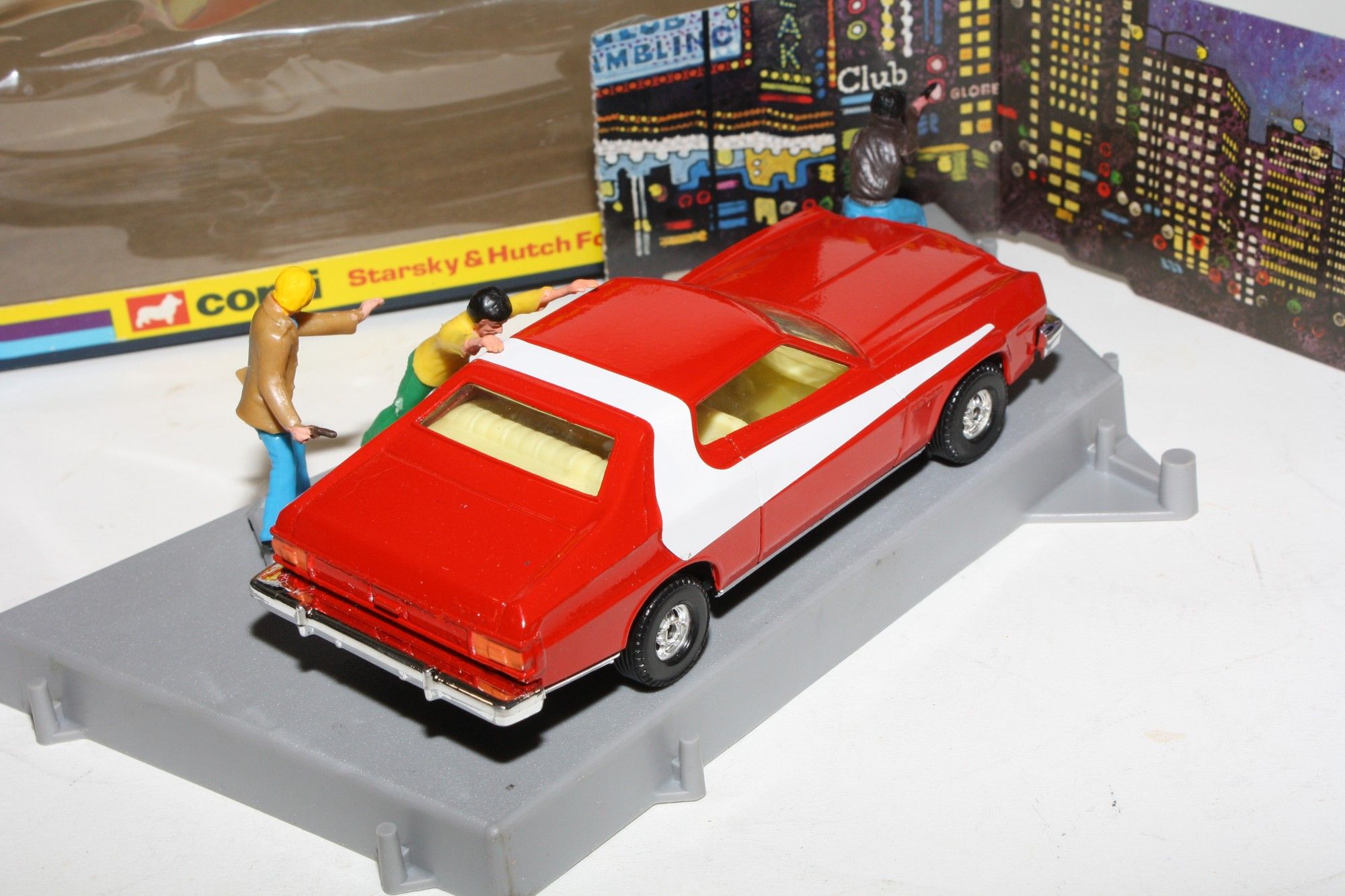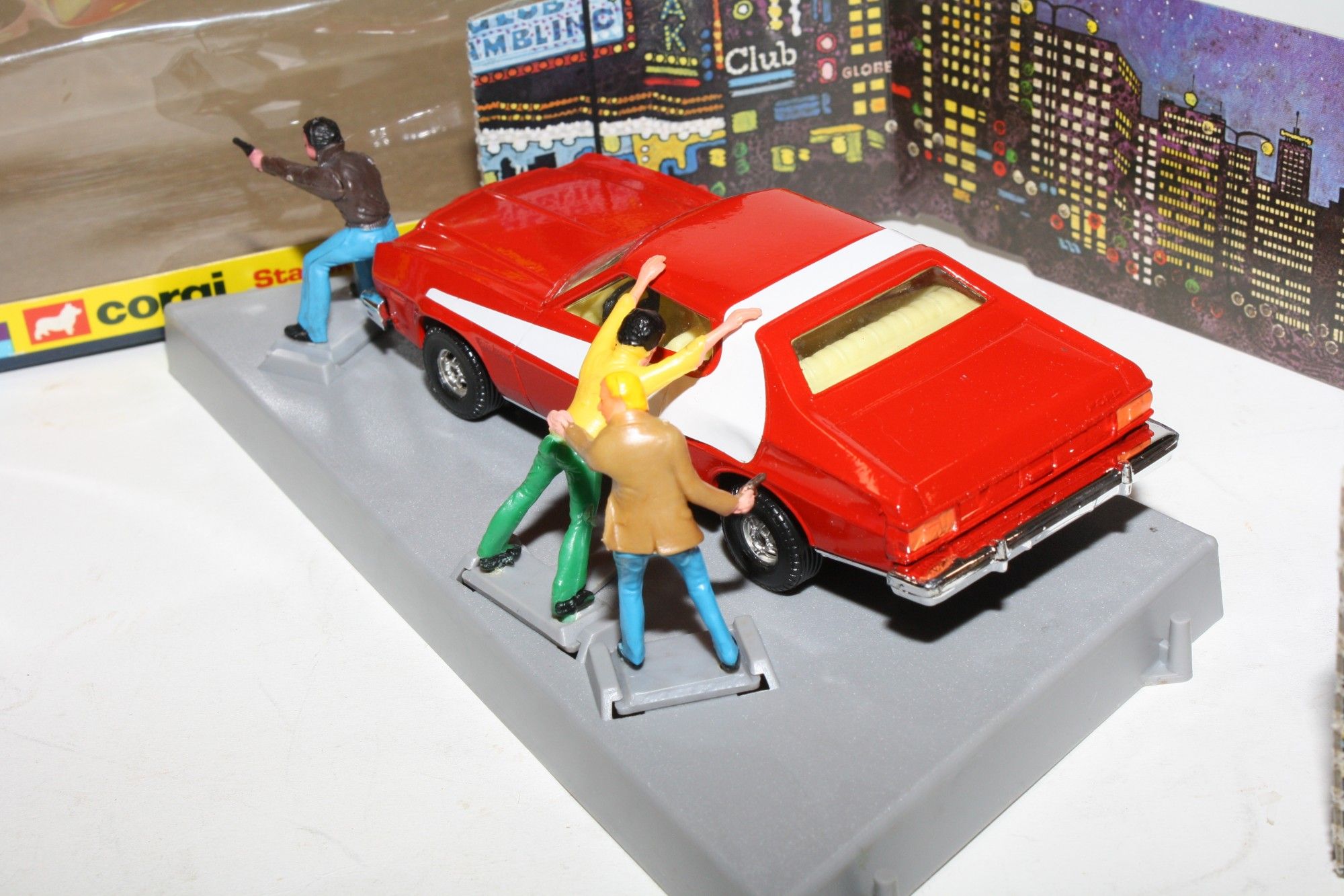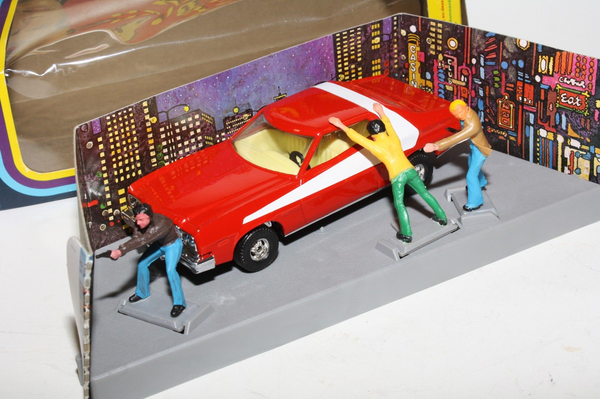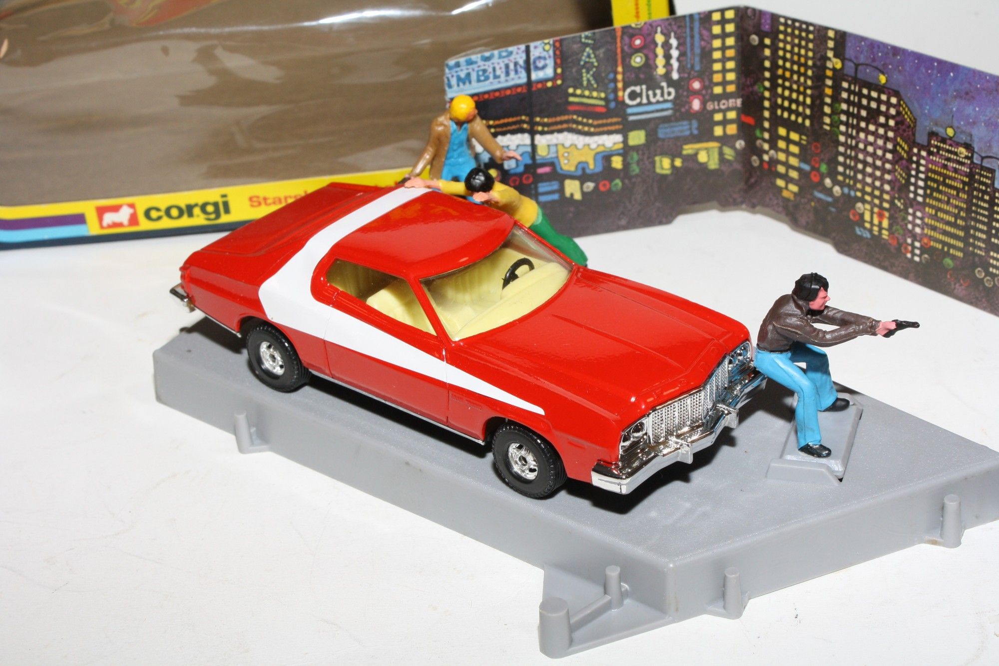 A superb example of this early issue Starsky & Hutch Torino. Gleaming red paintwork is mint and white flash sticker also perfect, please study the photos for exact condition. Perfect Whizzwheels, crystal clear windows with cream interior, good chrome, all original figures present and complete including both gun barrels (often missing).