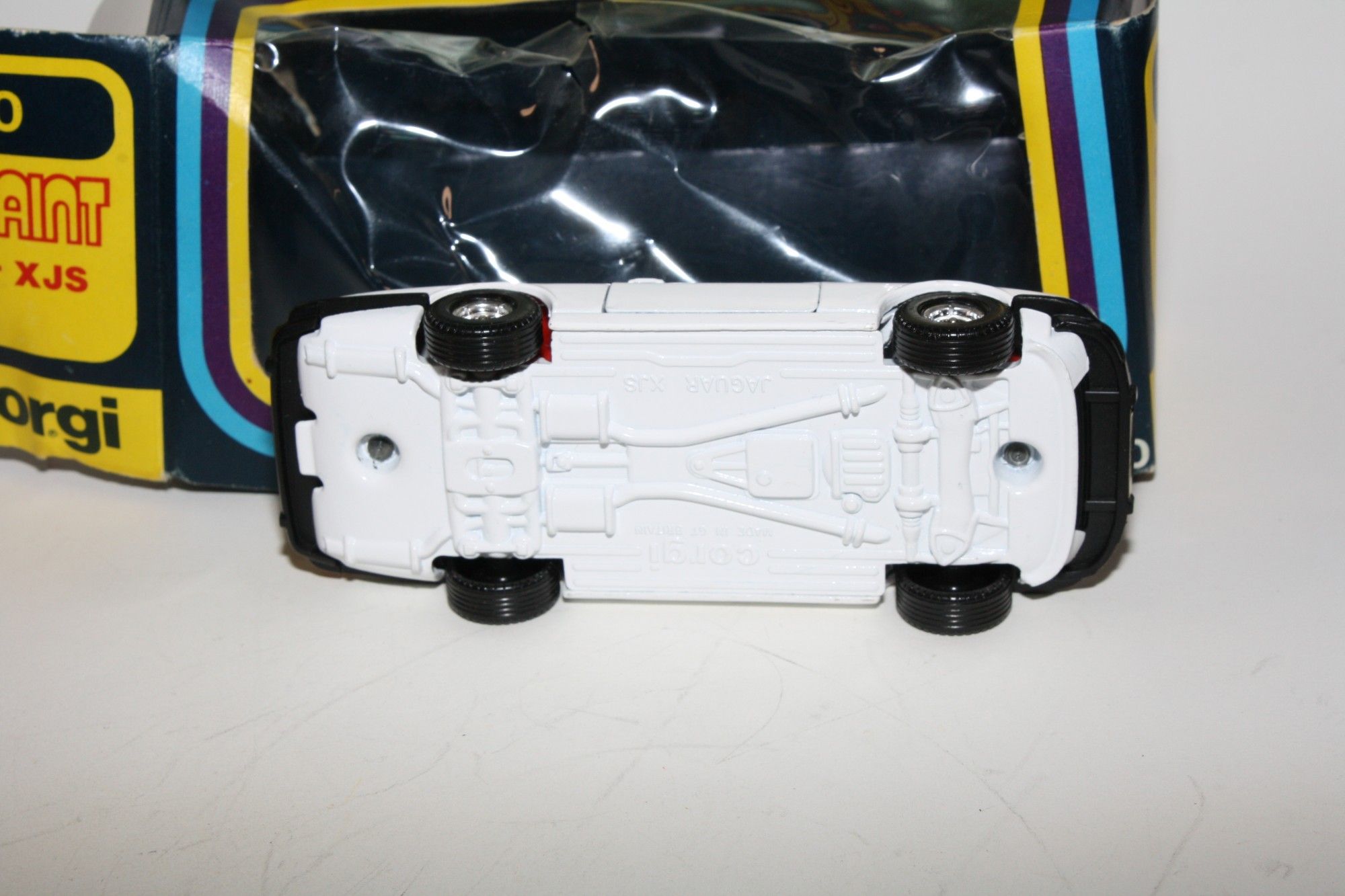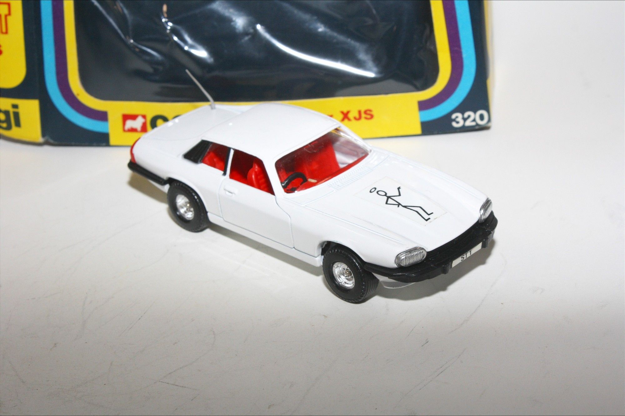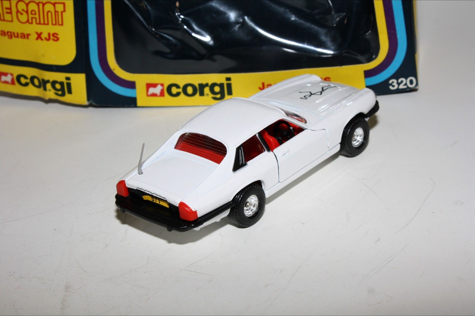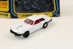 A good example of this Corgi model taken from The Saint TV show. Gleaming white original paintwork is near mint, just a couple of nicks please study the photo for exact condition. Chrome Whizzwheels (missing one centre cap) and free rolling axles, crystal clear windows, red interior, perfect bonnet decal, original aerial. Mint underside.