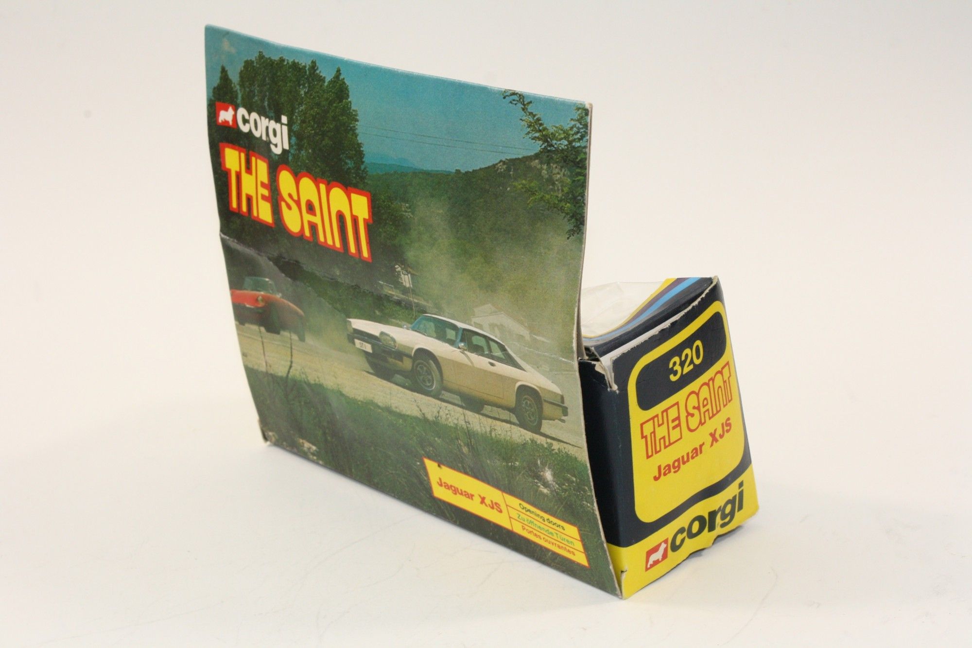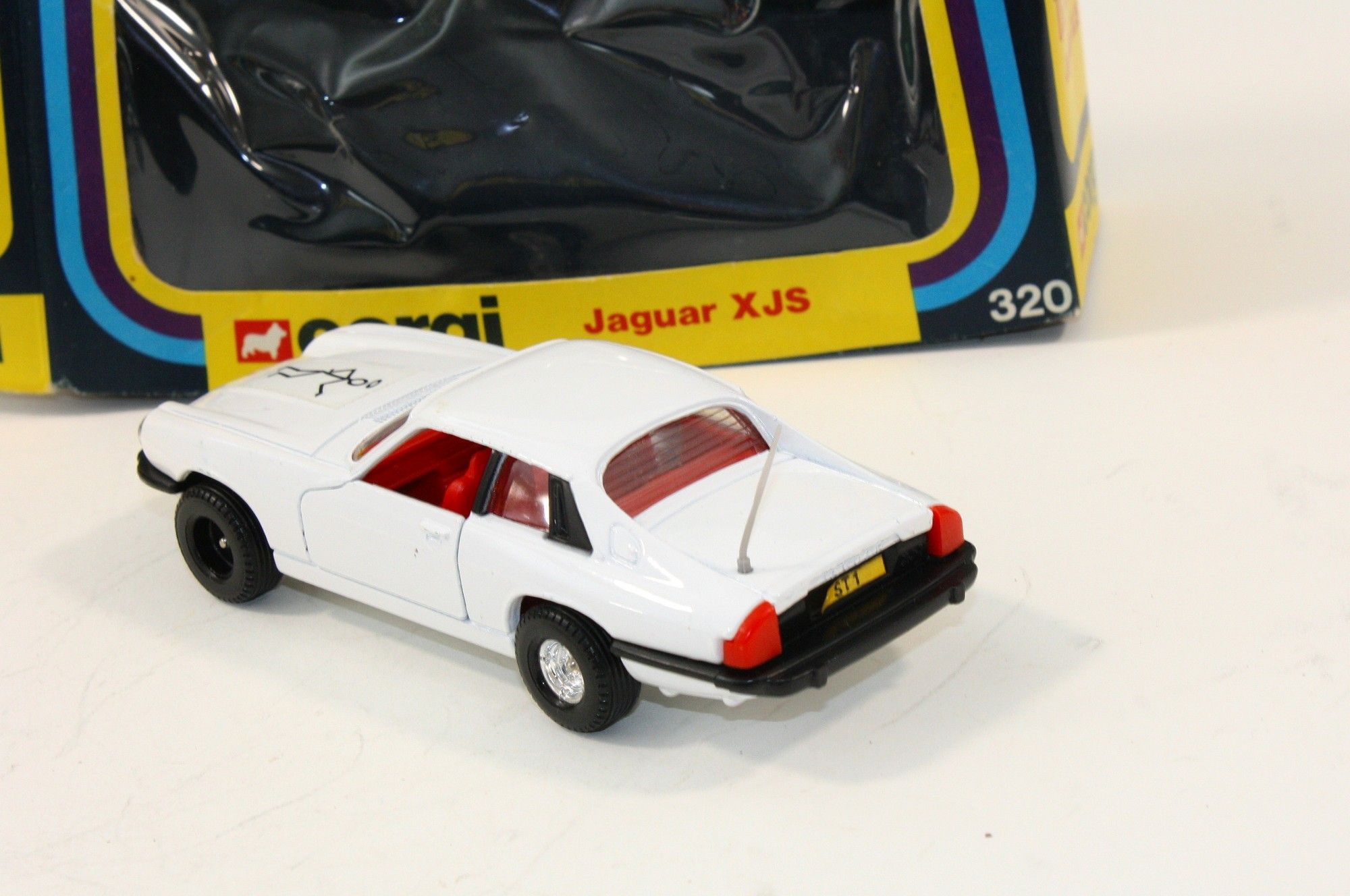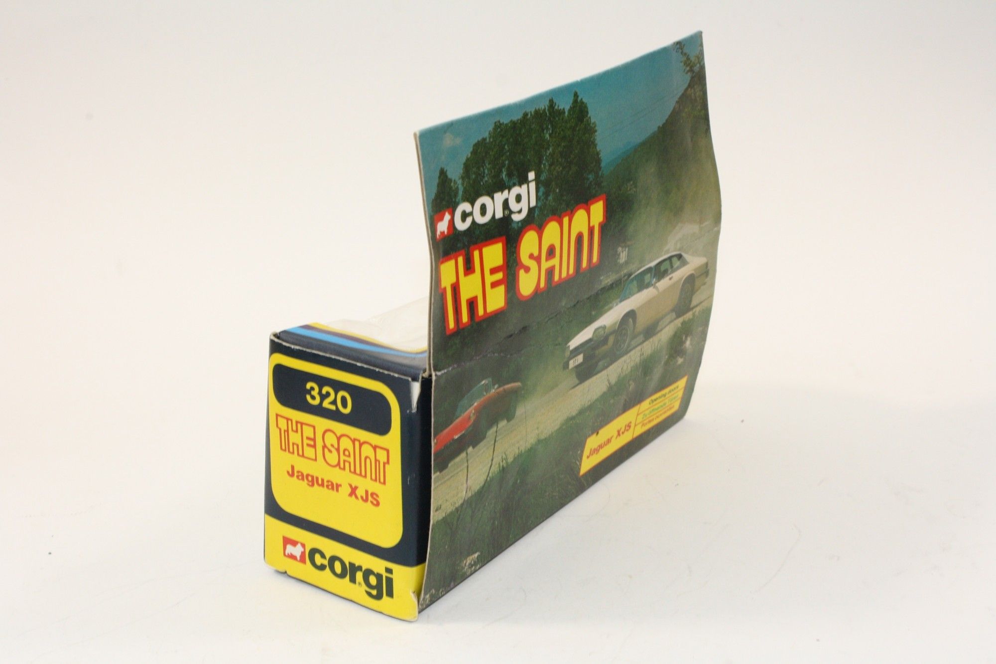 A good example of this Corgi model taken from The Saint TV show. Gleaming white original paintwork is near mint, just a couple of nicks please study the photo for exact condition. Chrome Whizzwheels (missing one centre cap) and free rolling axles, crystal clear windows, red interior, perfect bonnet decal, original aerial. Mint underside.