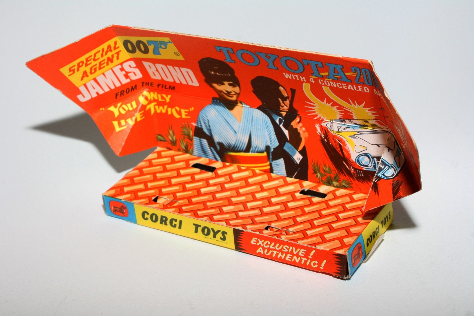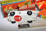 A superb example of this lovely 1960's model from Corgi from the James Bond film "You only Live Twice". Gleaming original paintwork is virtually mint, just a couple of rubs/fleabites, please study the photos. All original tyres are perfect on spoked hubs, suspension good, windscreen crystal clear, black interior, 2 original figures, original red 007 pennant aerial, jewelled lights all present and very good. Boot closes nicely (unusual), missiles fire well when rear pushed down (tested). 8 yellow plastic missiles present, 4 on sprue. Underside is virtually mint with red spot.