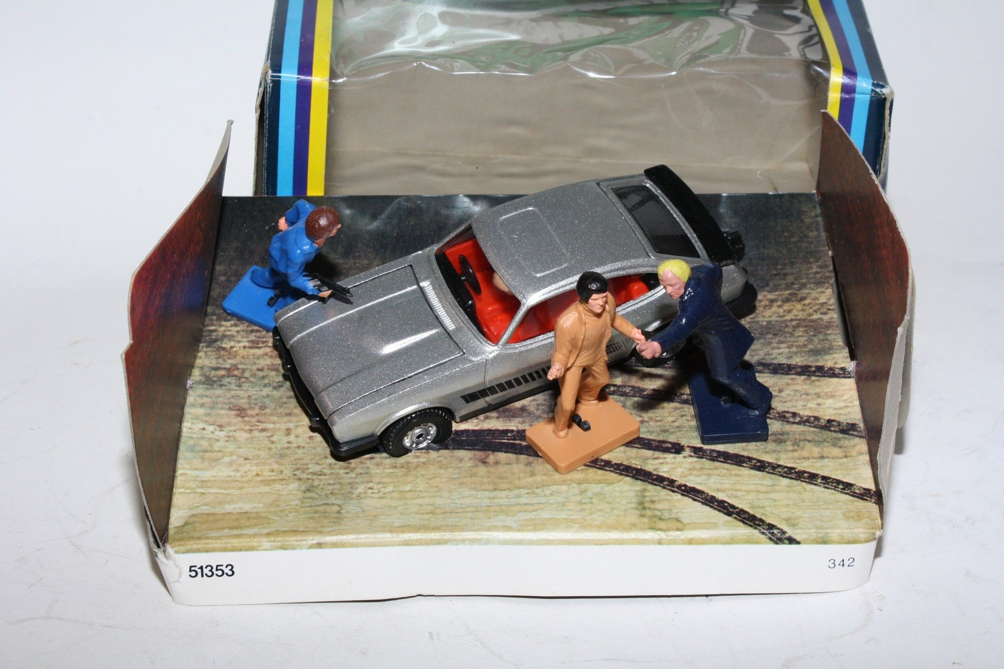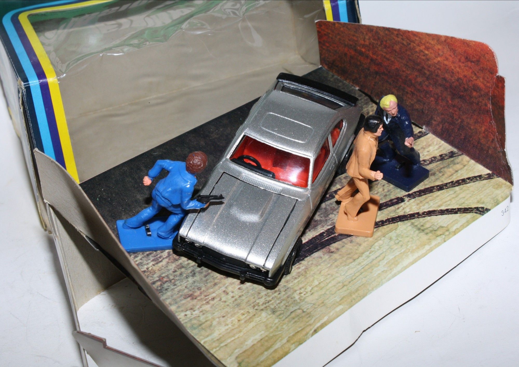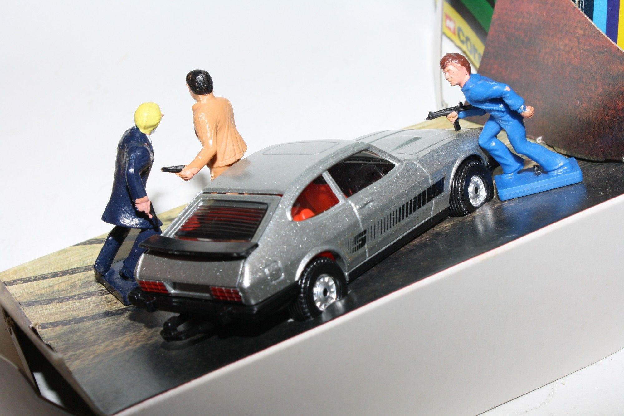 A superb example of this Corgi set from the TV series The Professionals. Gleaming original paint is mint, please study the photos for exact condition. Perfect wheels, crystal clear windows, red interior, mint decals, all three original Bodie, Doyle and Cowley figures are mint and attached to base with correct plastic retainers.