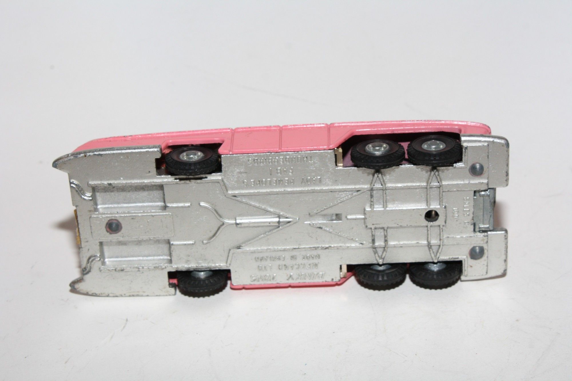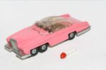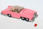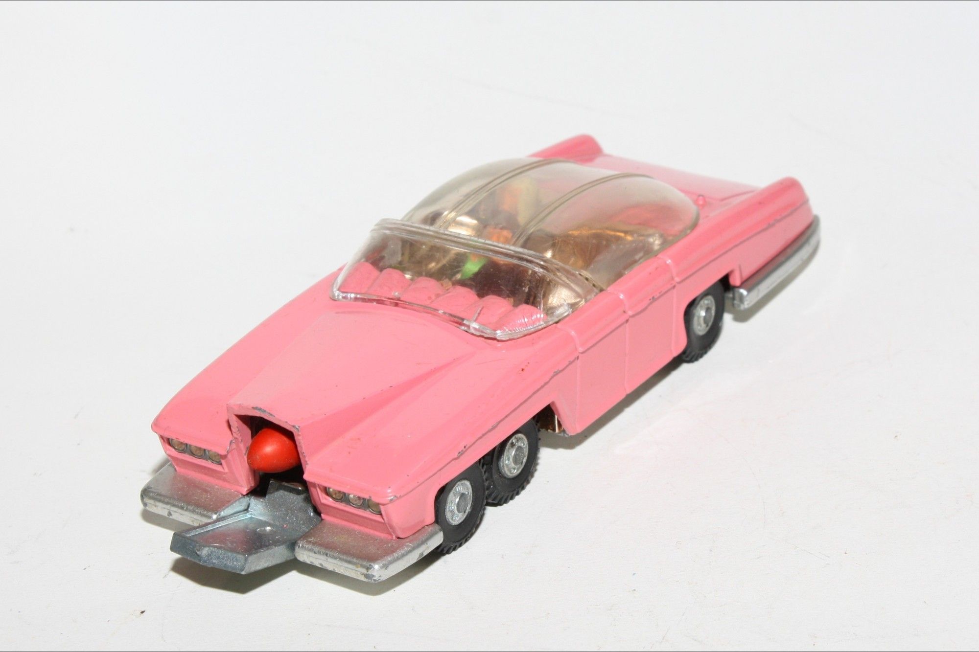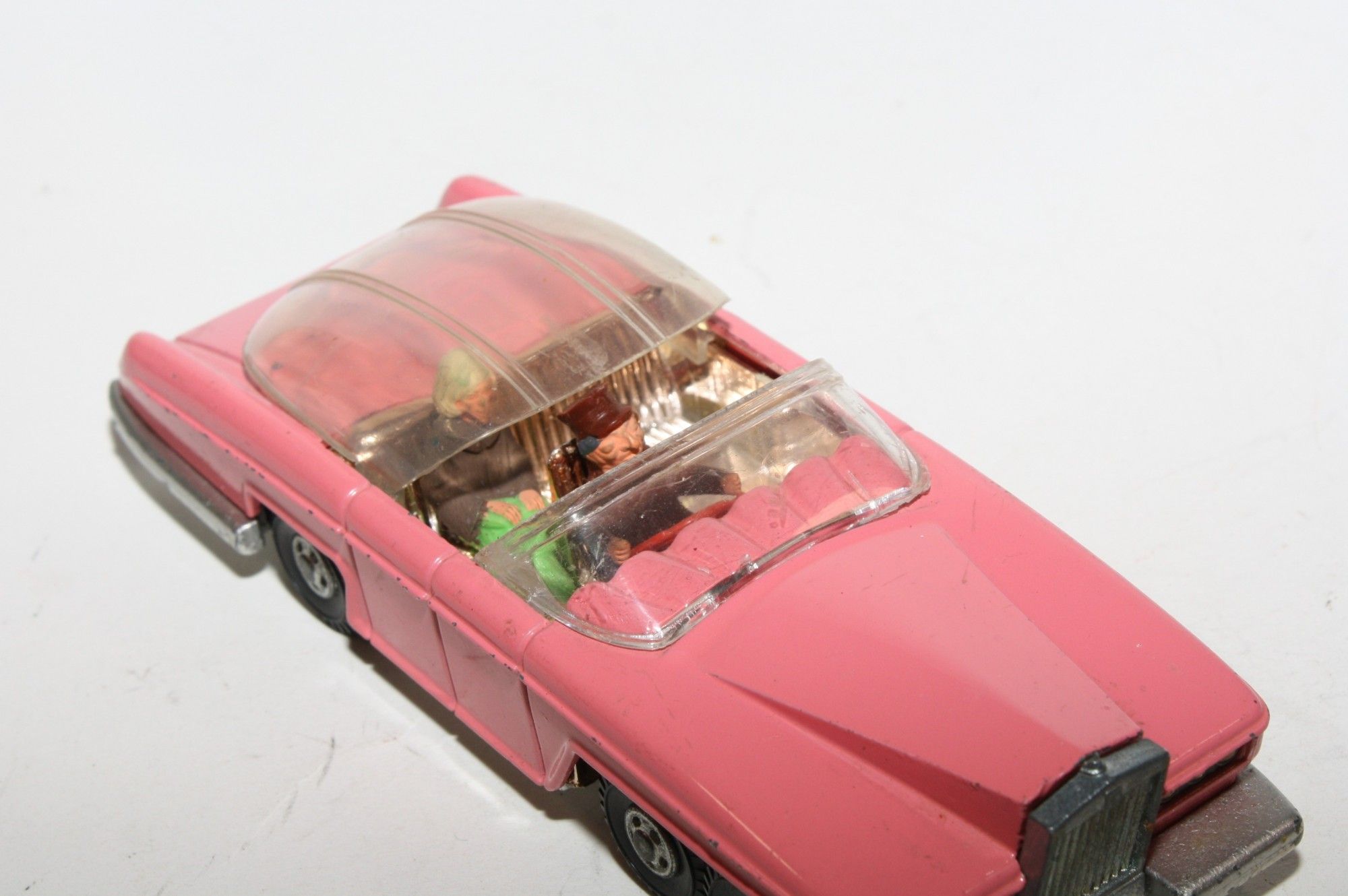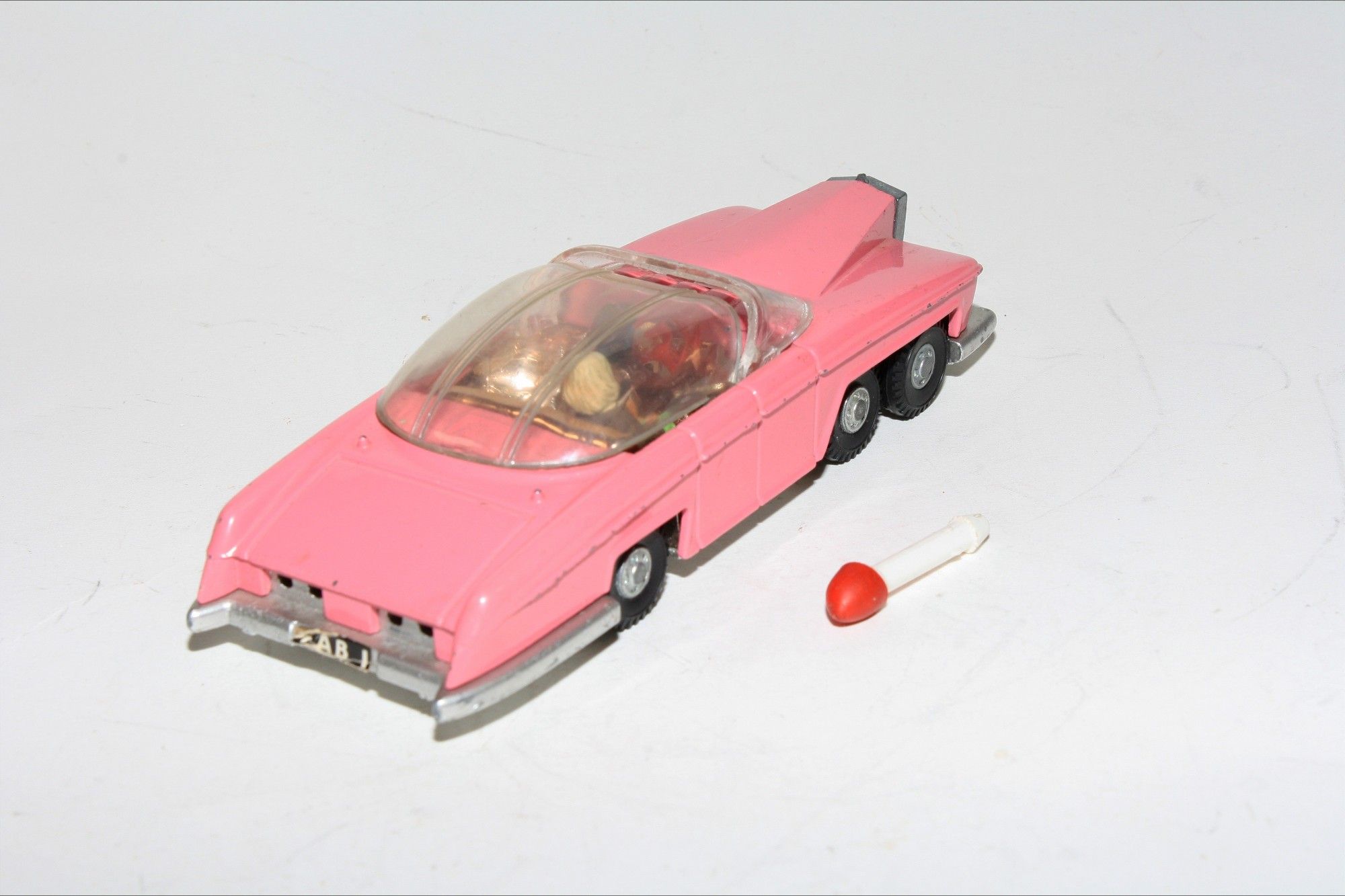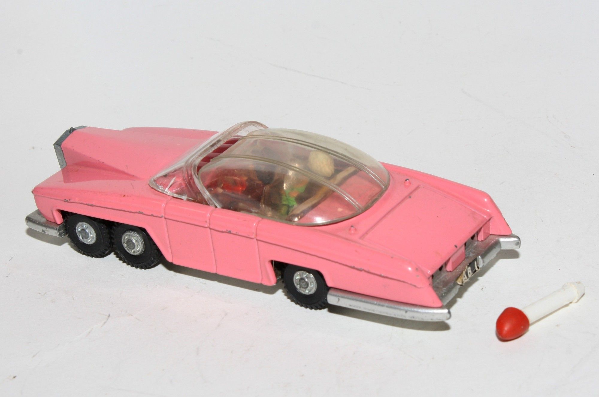 A good example of this iconic Dinky model from the 1960's Gerry Anderson Thunderbirds TV Series. Gleaming original pink paintwork is excellent, just mainly on raised edges, please study the photos for exact condition. Original tyres on cast hubs, suspension perfect, good sliding canopy, gold interior and riginsl Parker and Lady Penelope figures, jewelled headlights, radiator mascot present broken, original missile present, mechanism tested and working fine, clicks into place and fires correctly, no rear harpoons, baseplate all ok