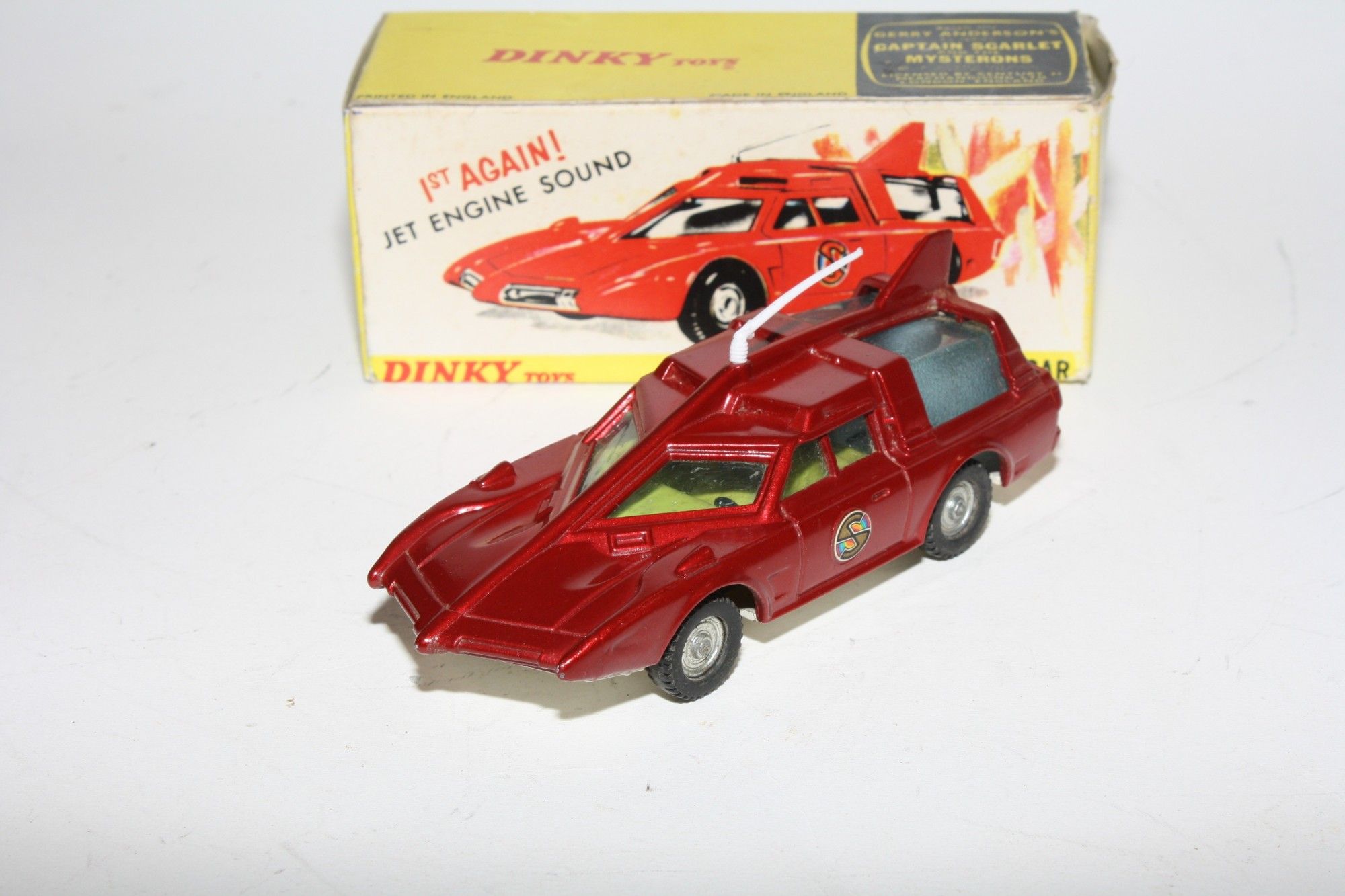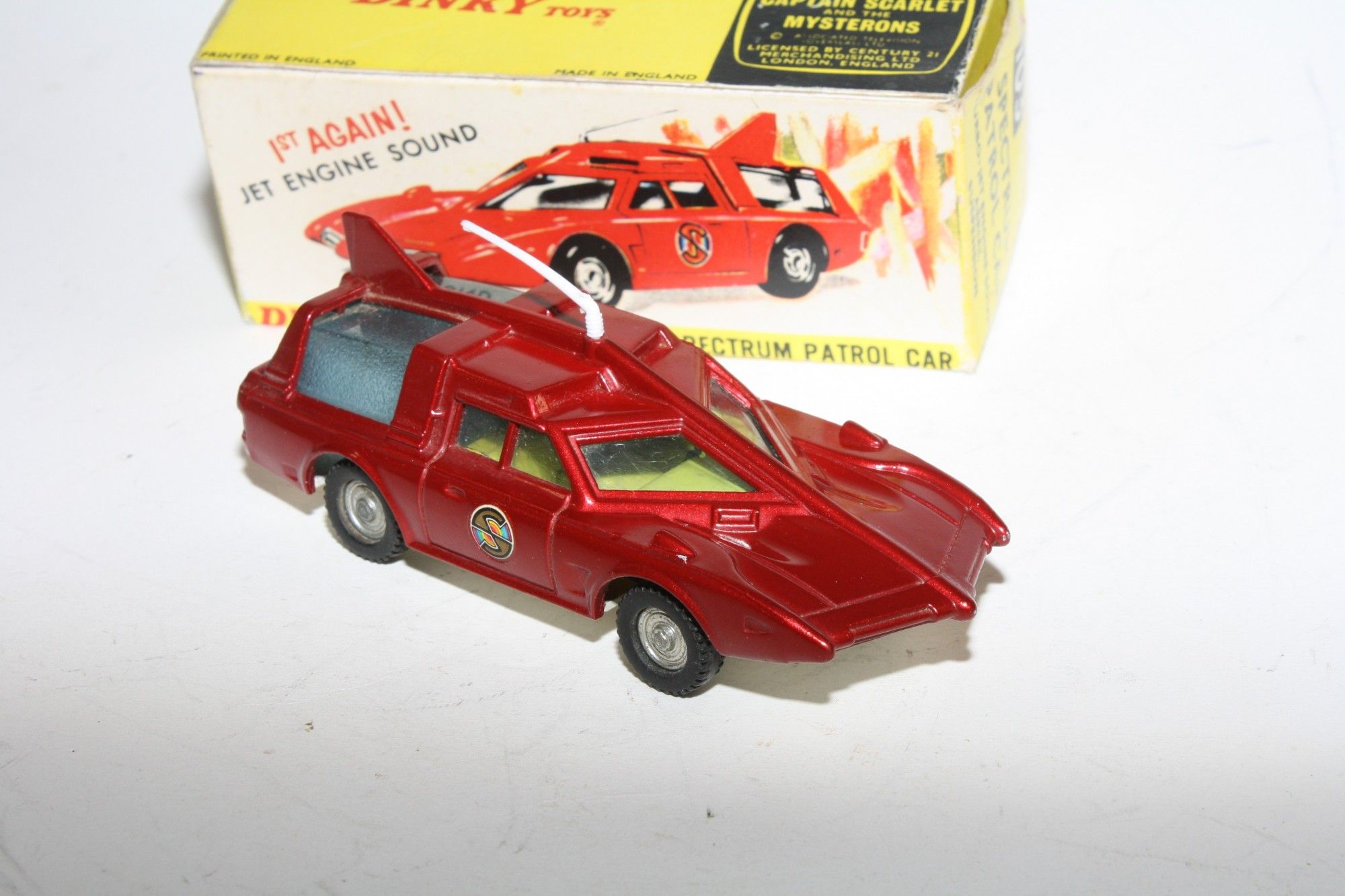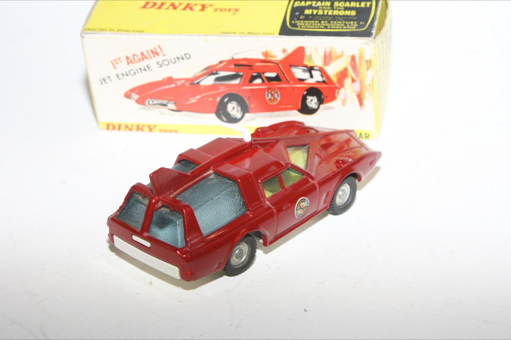 A nicely restored example of this Gerry Anderson inspired Captain Scarlet model. Gleaming metallic paintwork appears mint, please study the photos for exact condition. Perfect tyres on cast hubs, strong suspension, Excellent blue tinted windows, good interior, roof aerial and Spectrum decals all mint, 'jet engine' sound feature working well , underside mint .