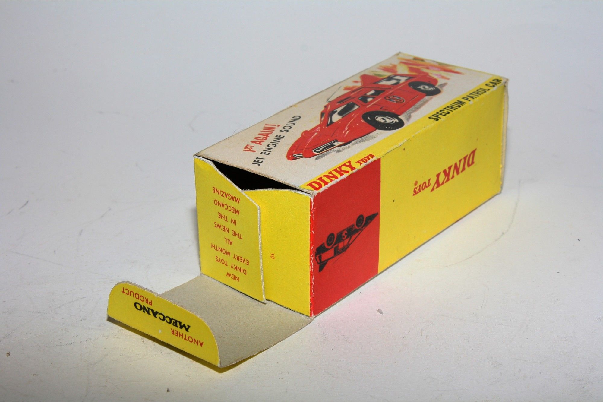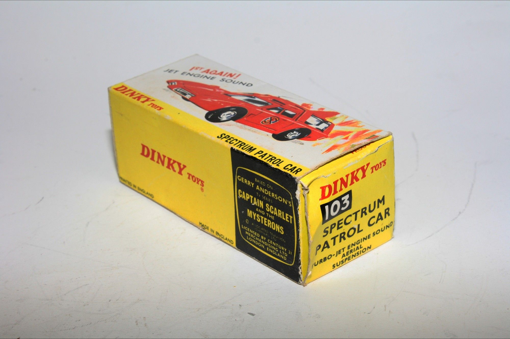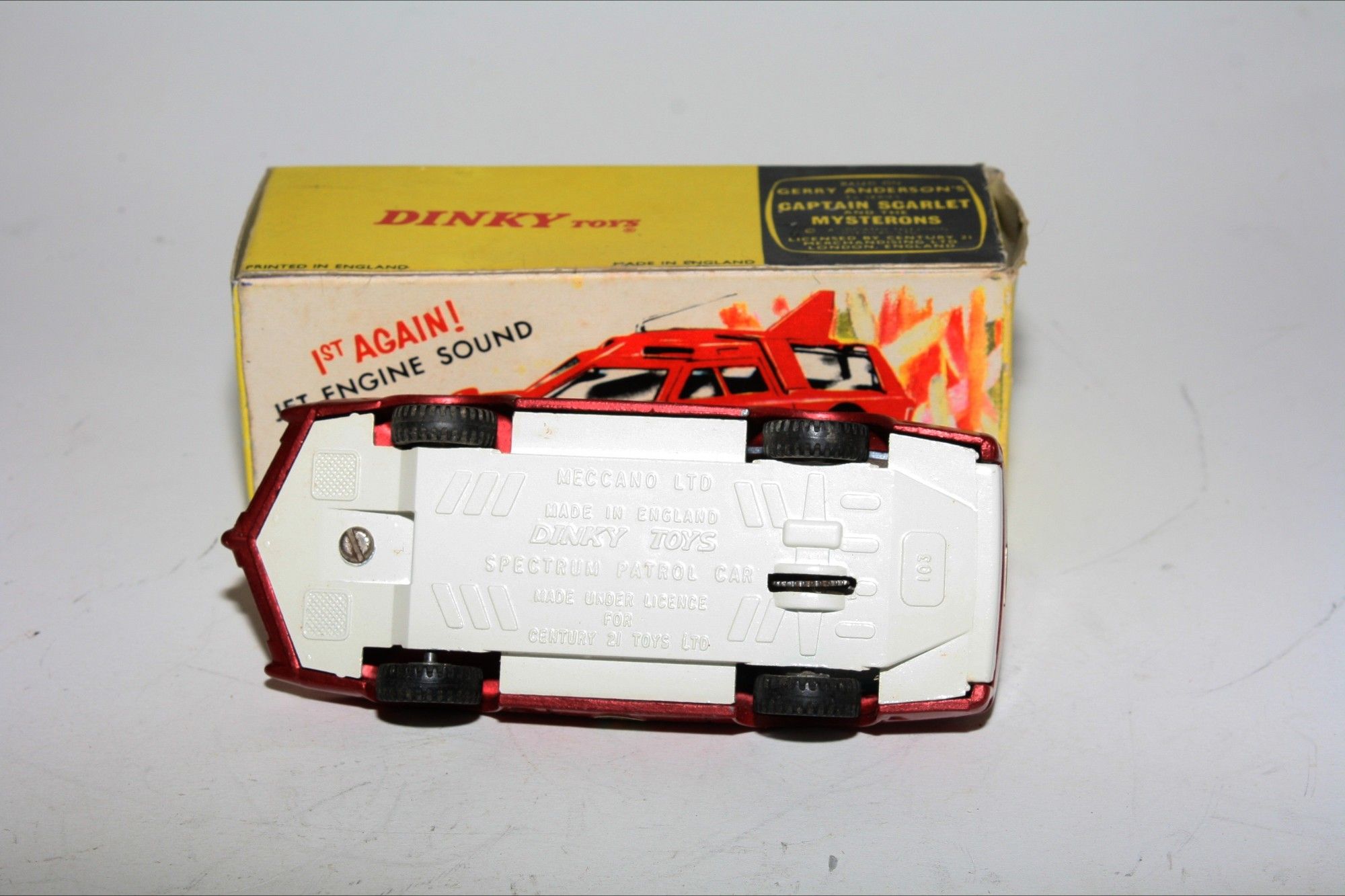 A nicely restored example of this Gerry Anderson inspired Captain Scarlet model. Gleaming metallic paintwork appears mint, please study the photos for exact condition. Perfect tyres on cast hubs, strong suspension, Excellent blue tinted windows, good interior, roof aerial and Spectrum decals all mint, 'jet engine' sound feature working well , underside mint .