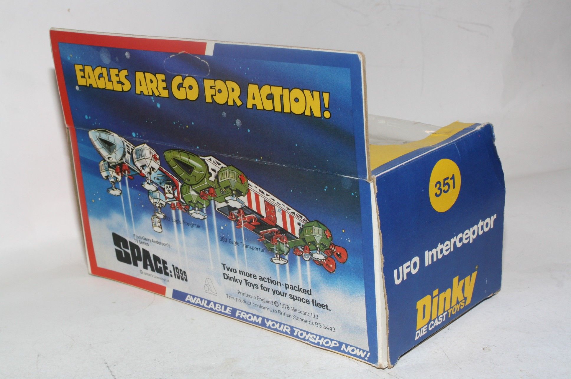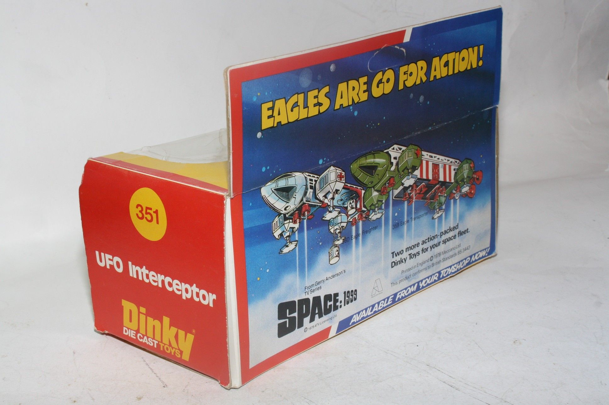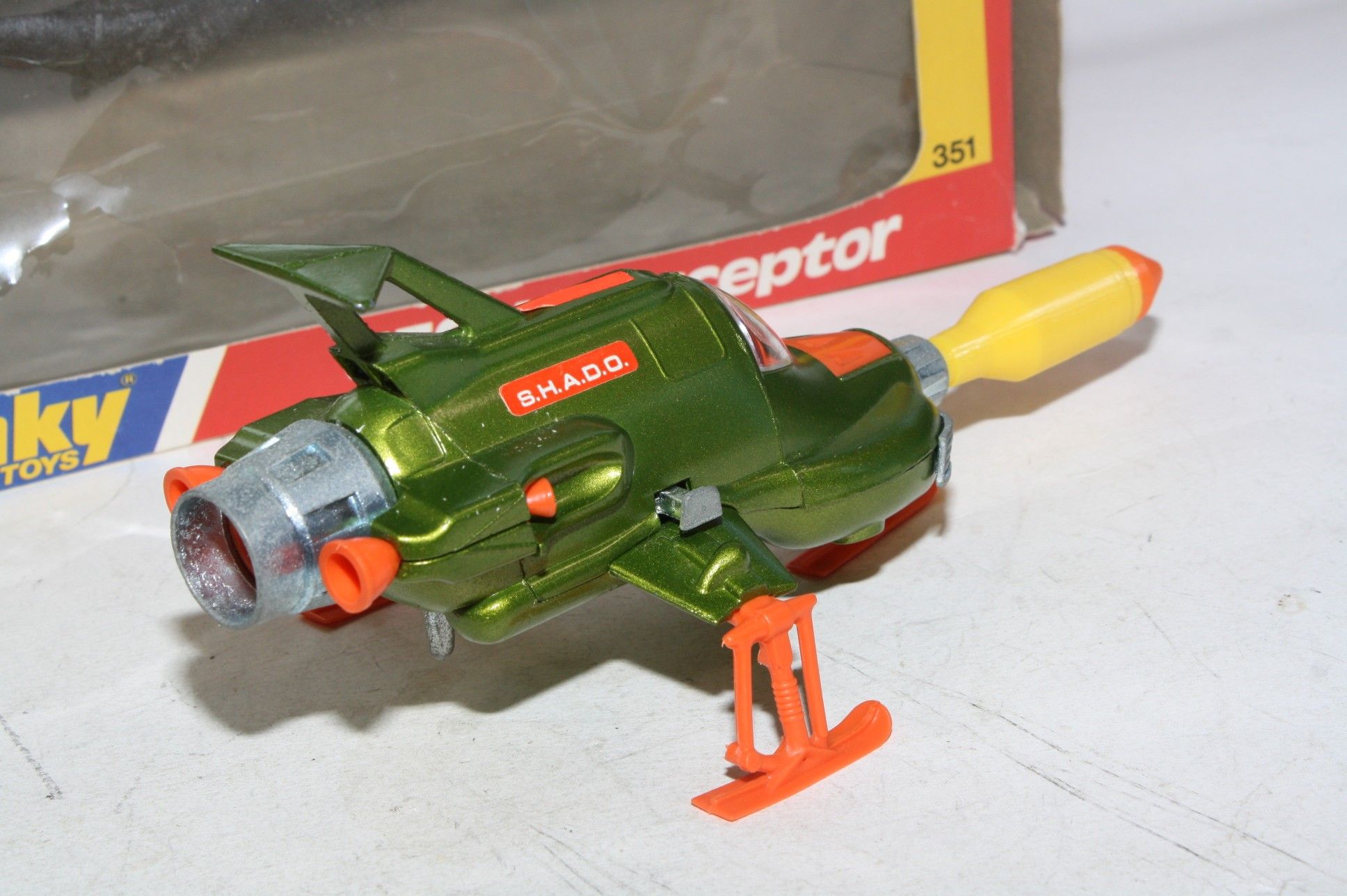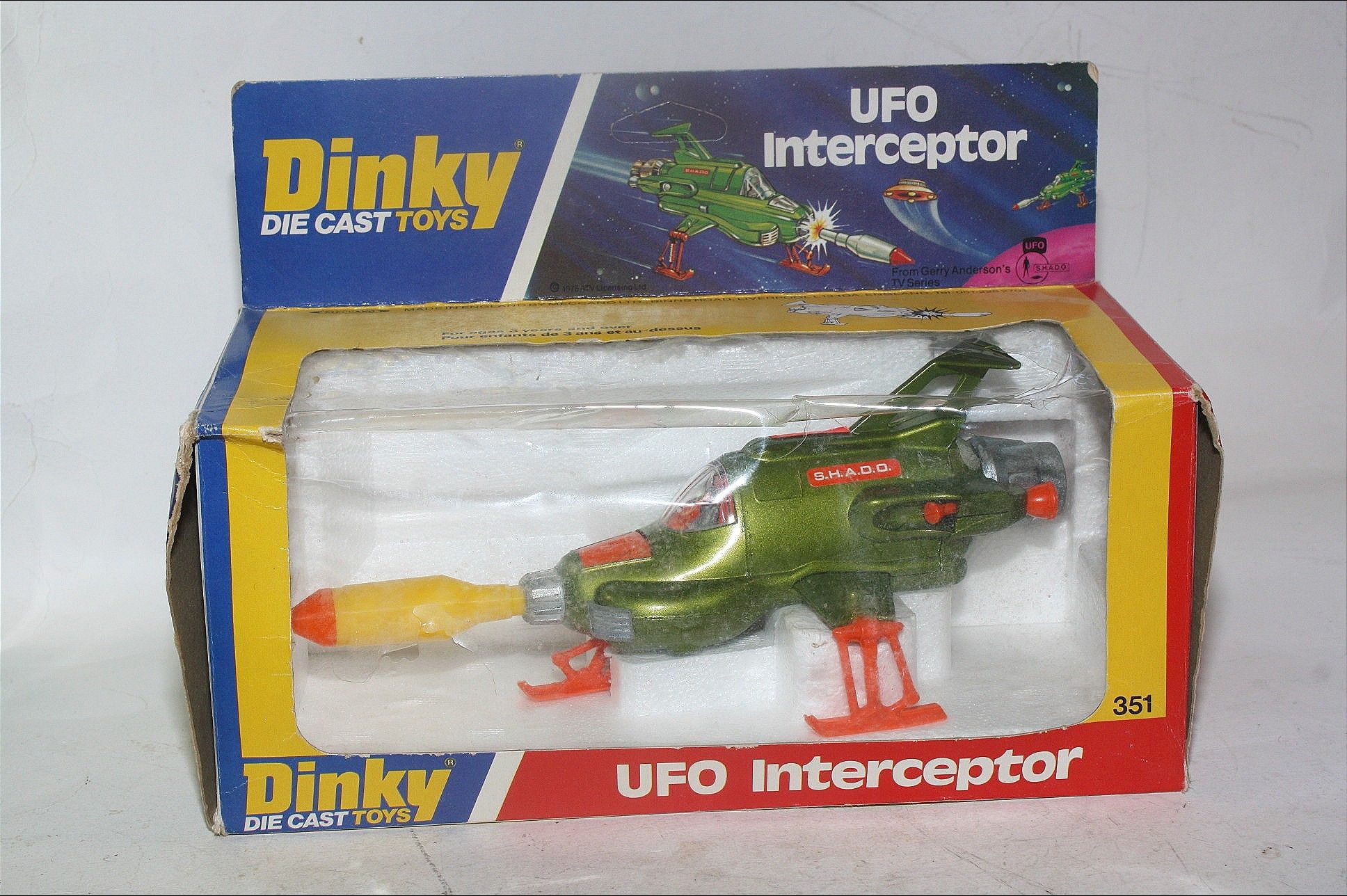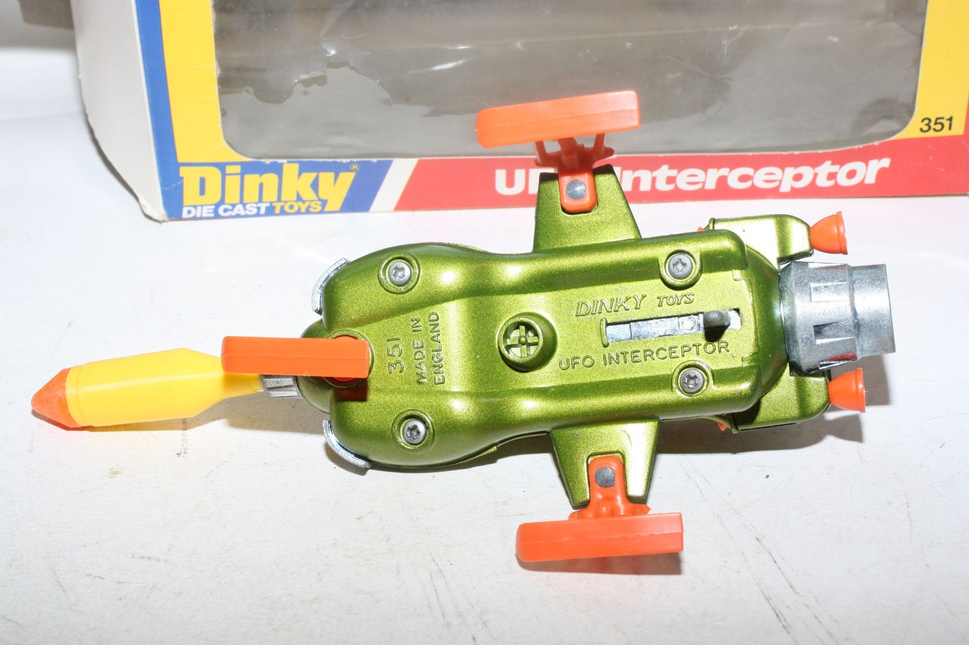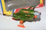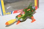 A superb example of this later issue Gerry Anderson UFO Interceptor from Dinky. Metallic green paintwork is mint-, please study the photos for exact condition. All orange skis are perfect, clear cockpit and pilot, mint stickers and fully working powerful firing mechanism. Missile is a replacement. Mint6 underside.