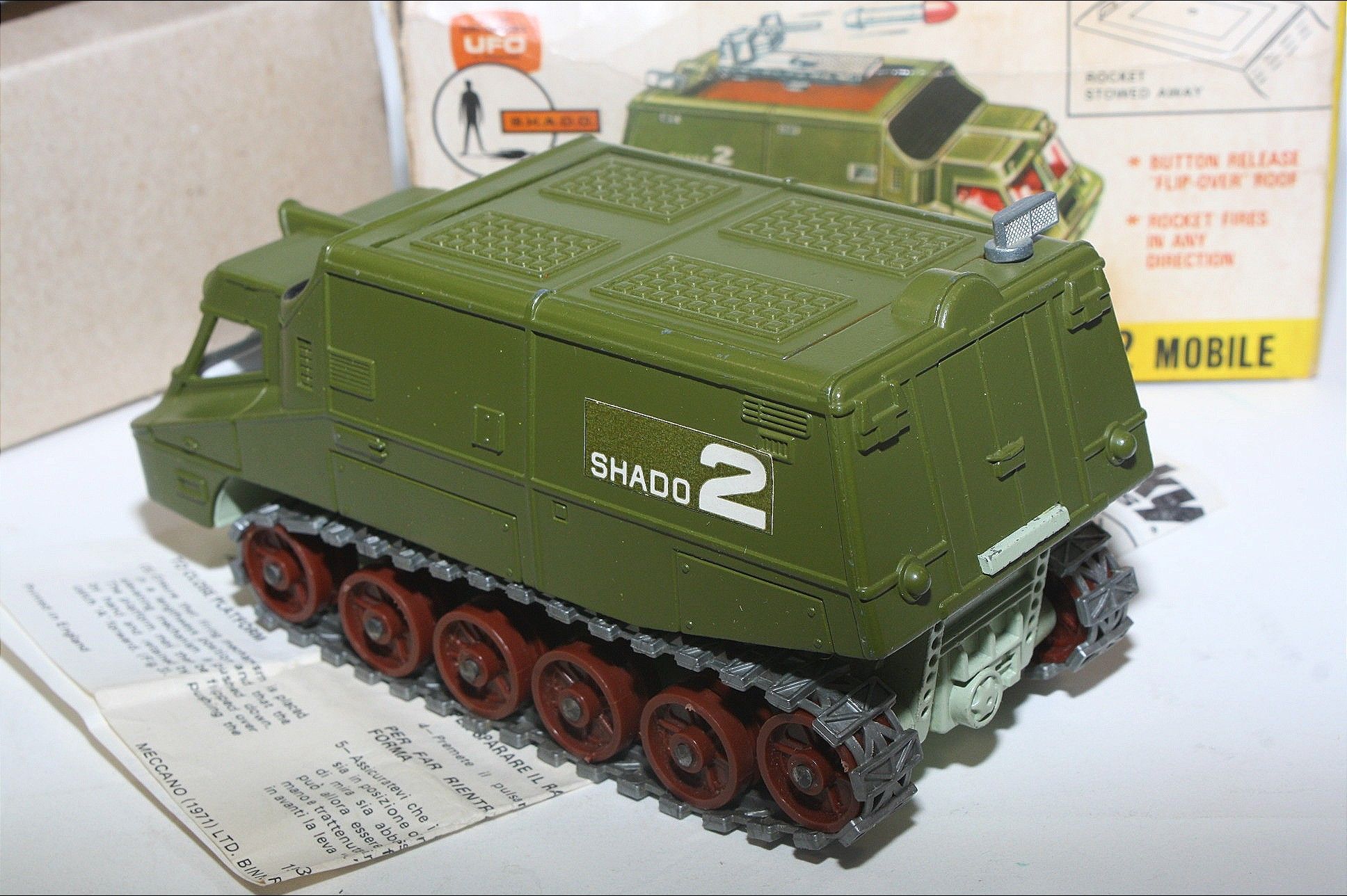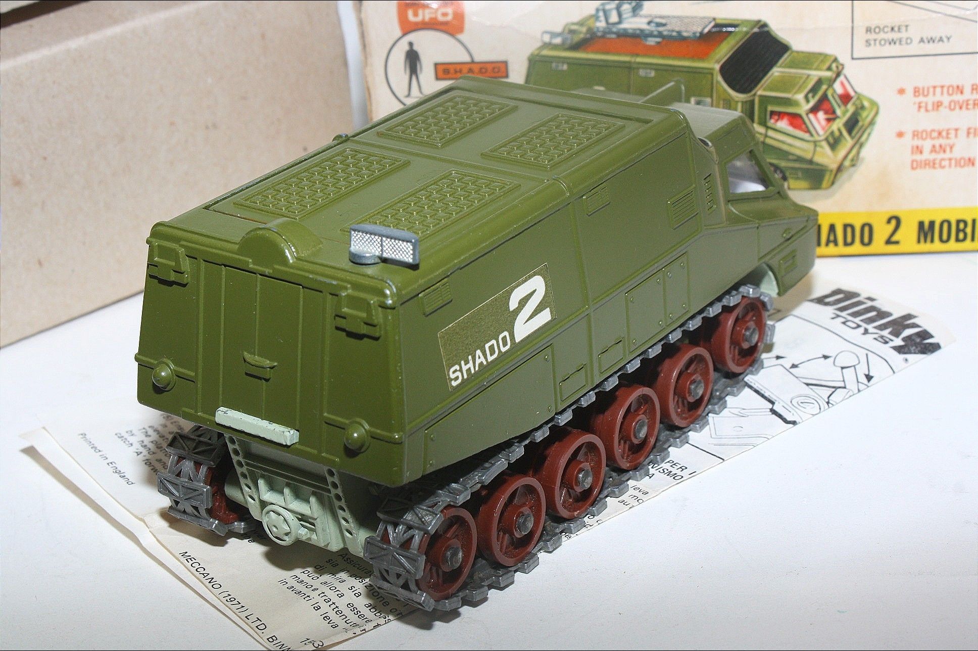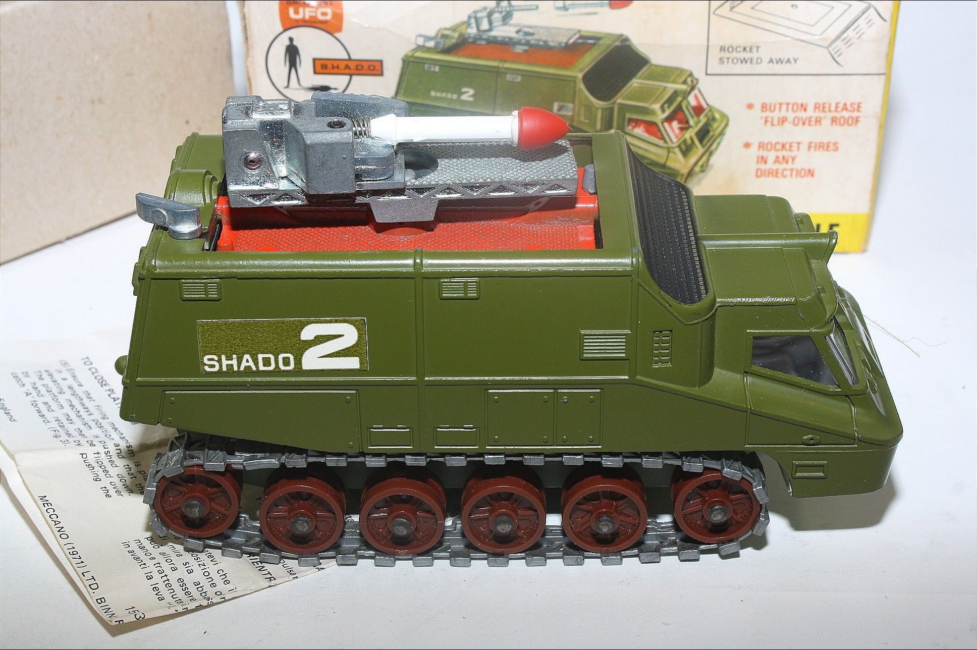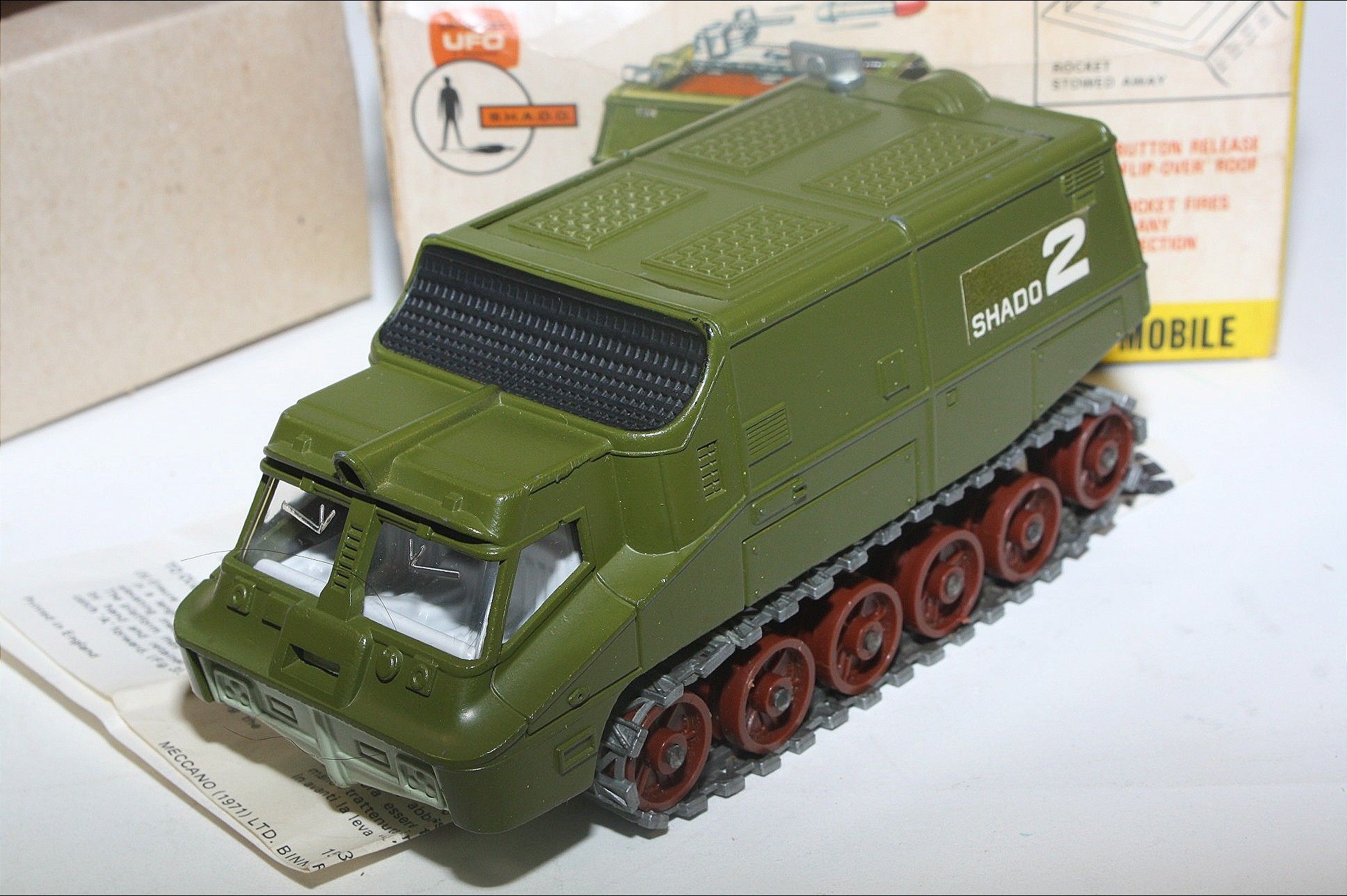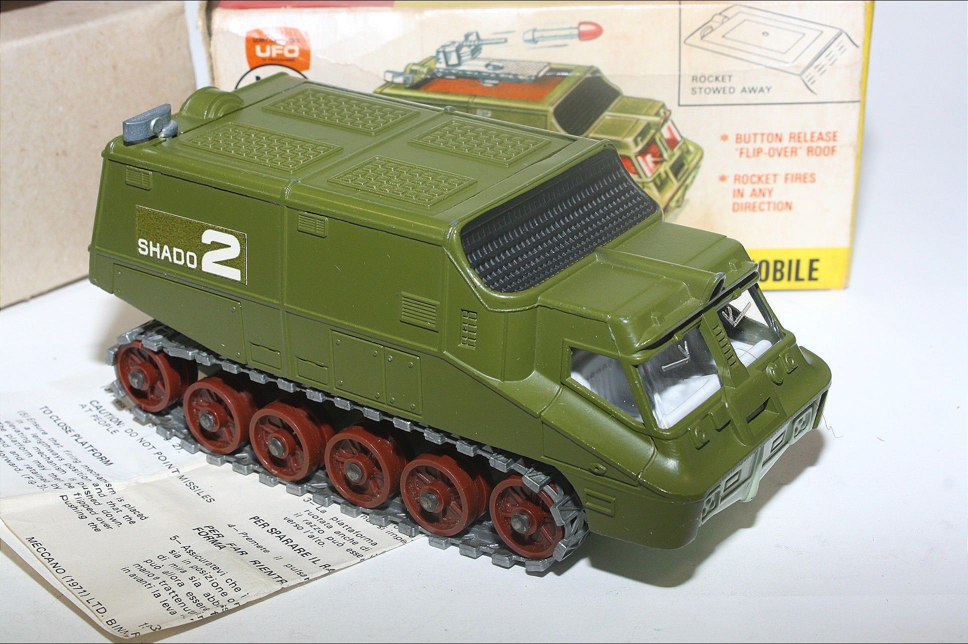 A beautiful example of this early issue UFO Shado 2 Gerry Anderson model. Purchased from the original owner. Part of the Wimborne GA Collection,Green paintwork is mint, please study the photos. Perfect silver tracks on brown rollers, windows perfect, white interior, missile launcher all in good working order with original missile, rotating roof all good and locks into position as it should, original decals are excellent. Baseplate is virtually.