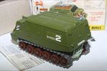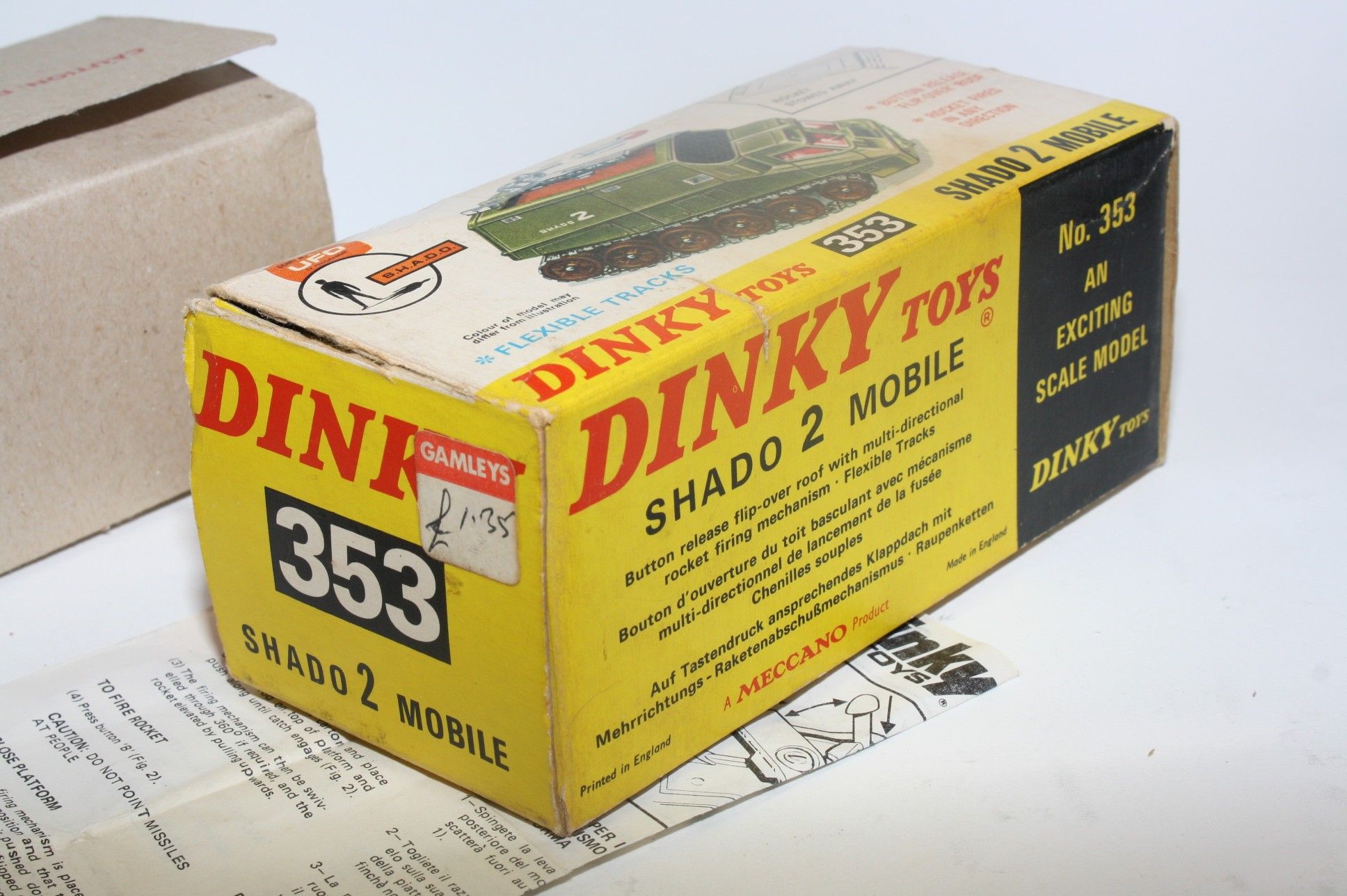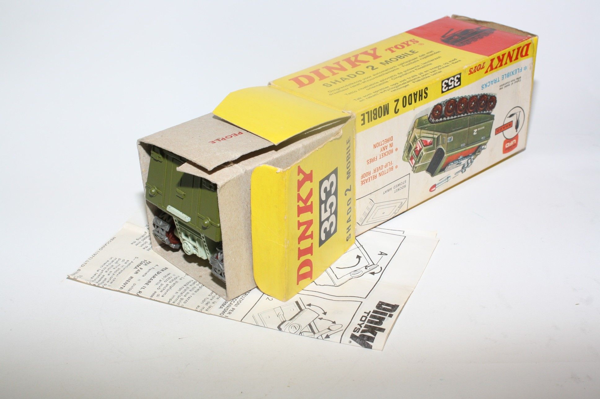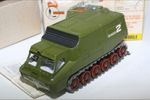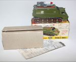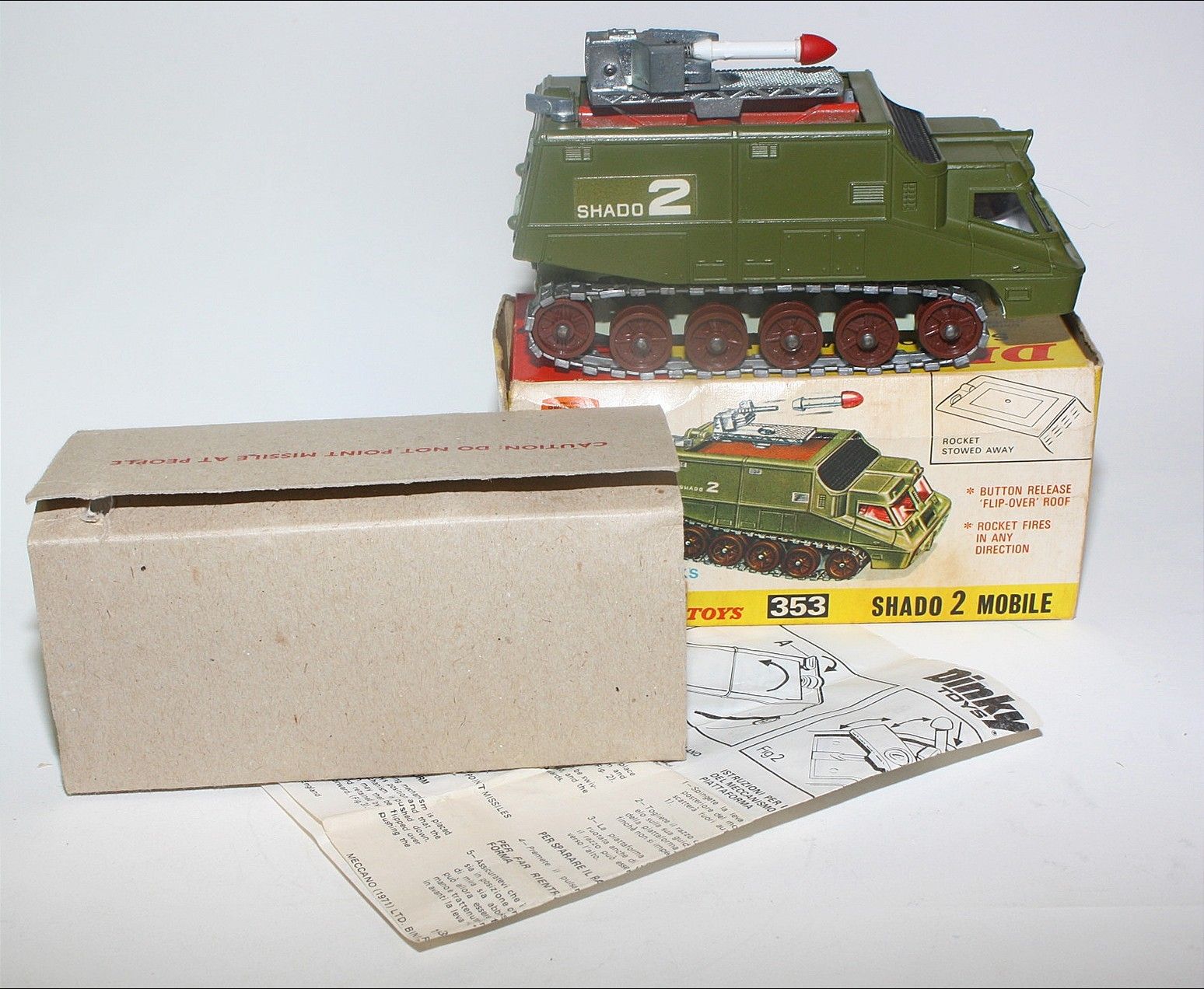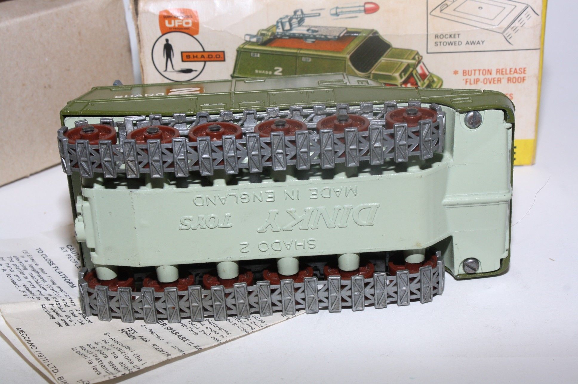 A beautiful example of this early issue UFO Shado 2 Gerry Anderson model. Purchased from the original owner. Part of the Wimborne GA Collection,Green paintwork is mint, please study the photos. Perfect silver tracks on brown rollers, windows perfect, white interior, missile launcher all in good working order with original missile, rotating roof all good and locks into position as it should, original decals are excellent. Baseplate is virtually.