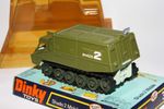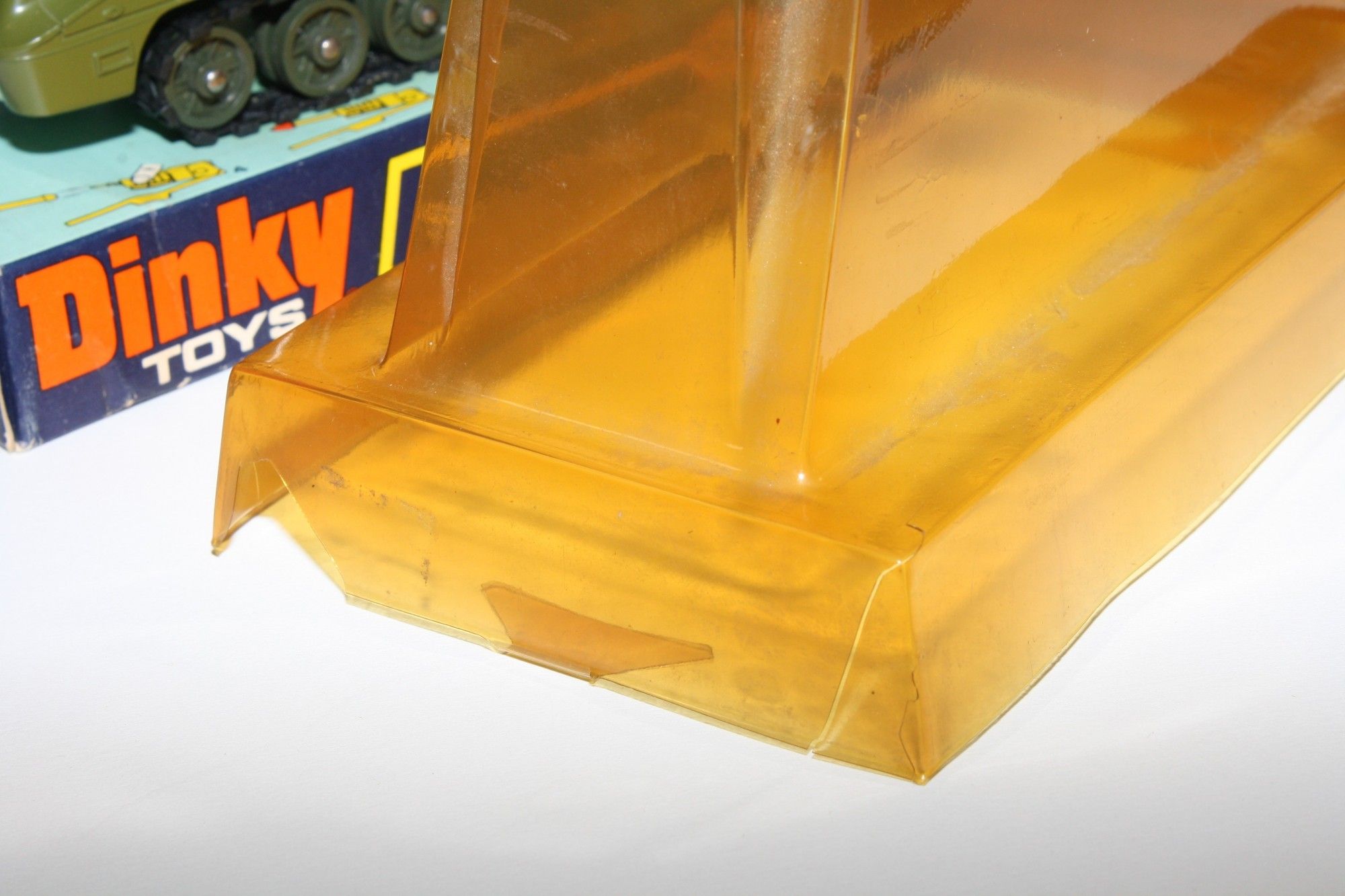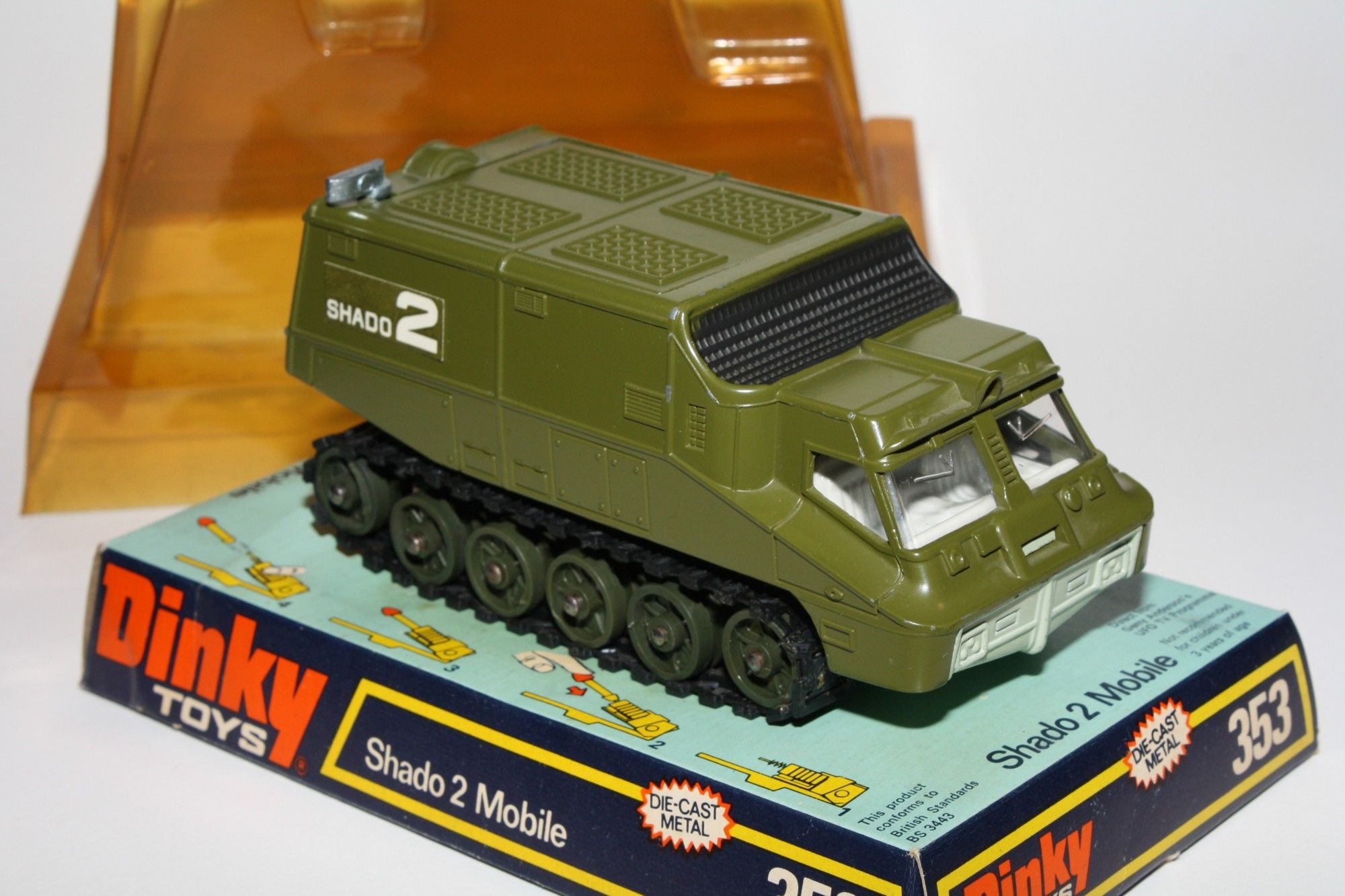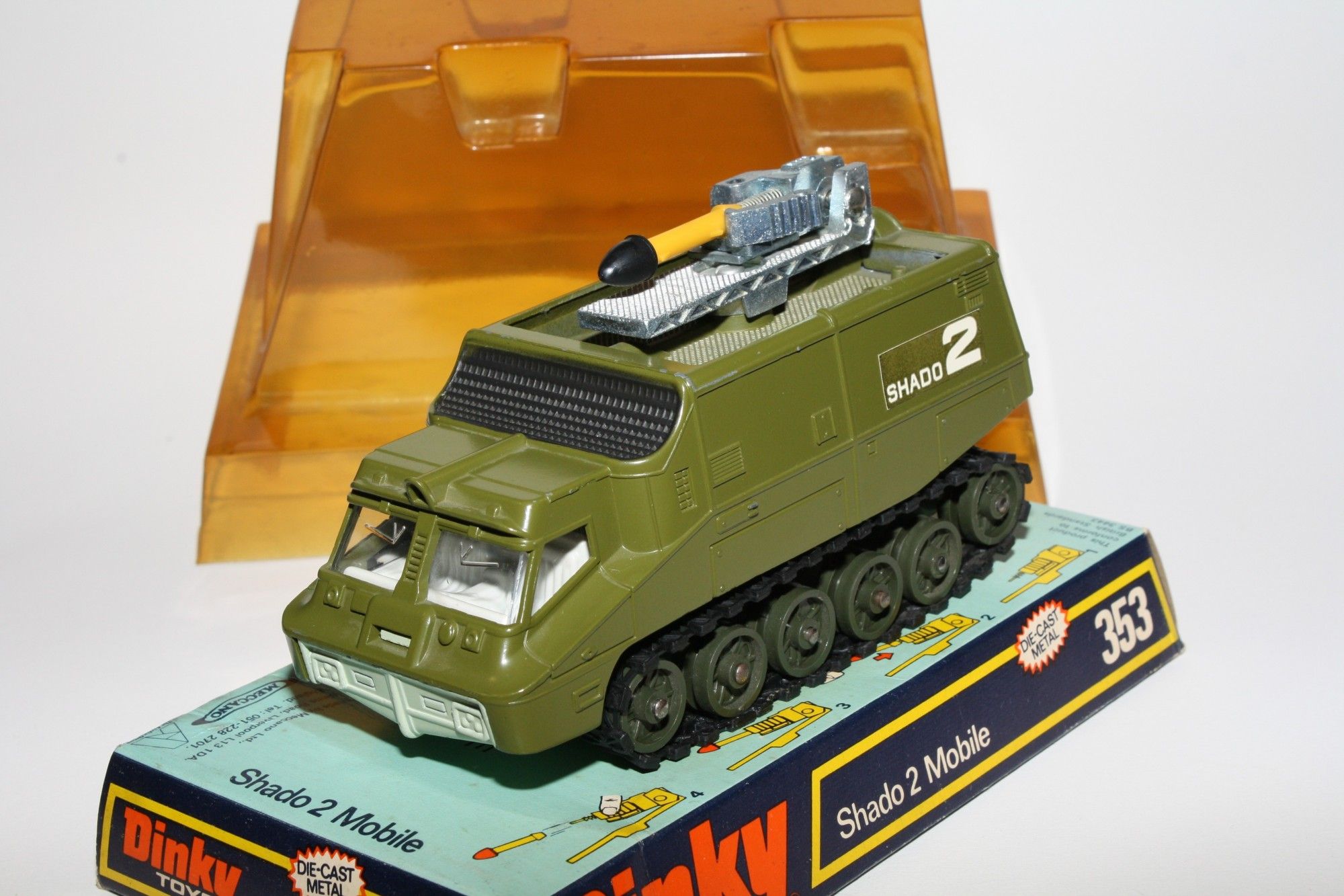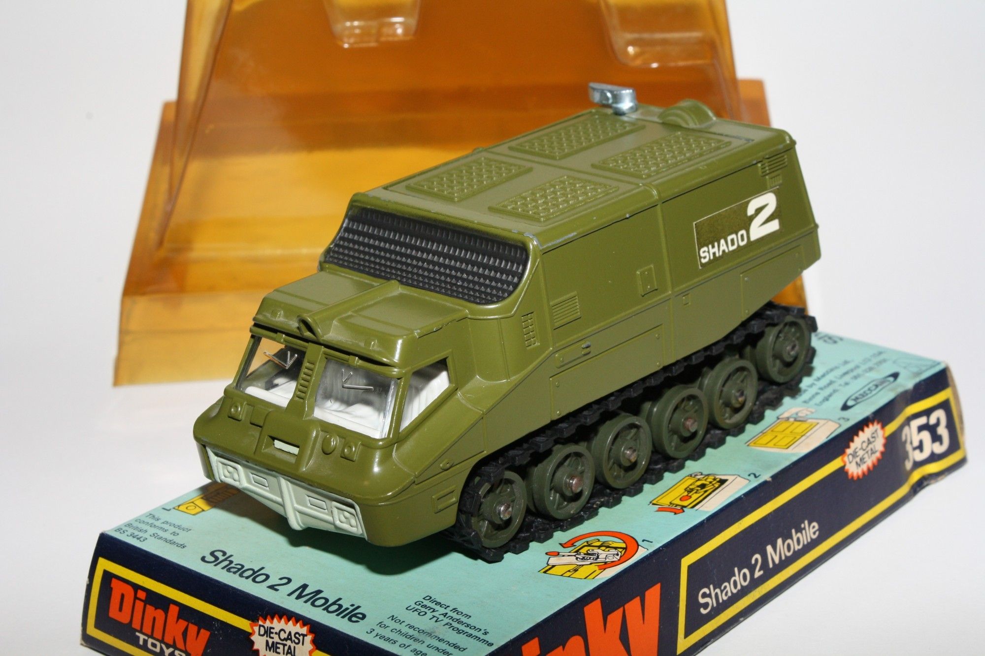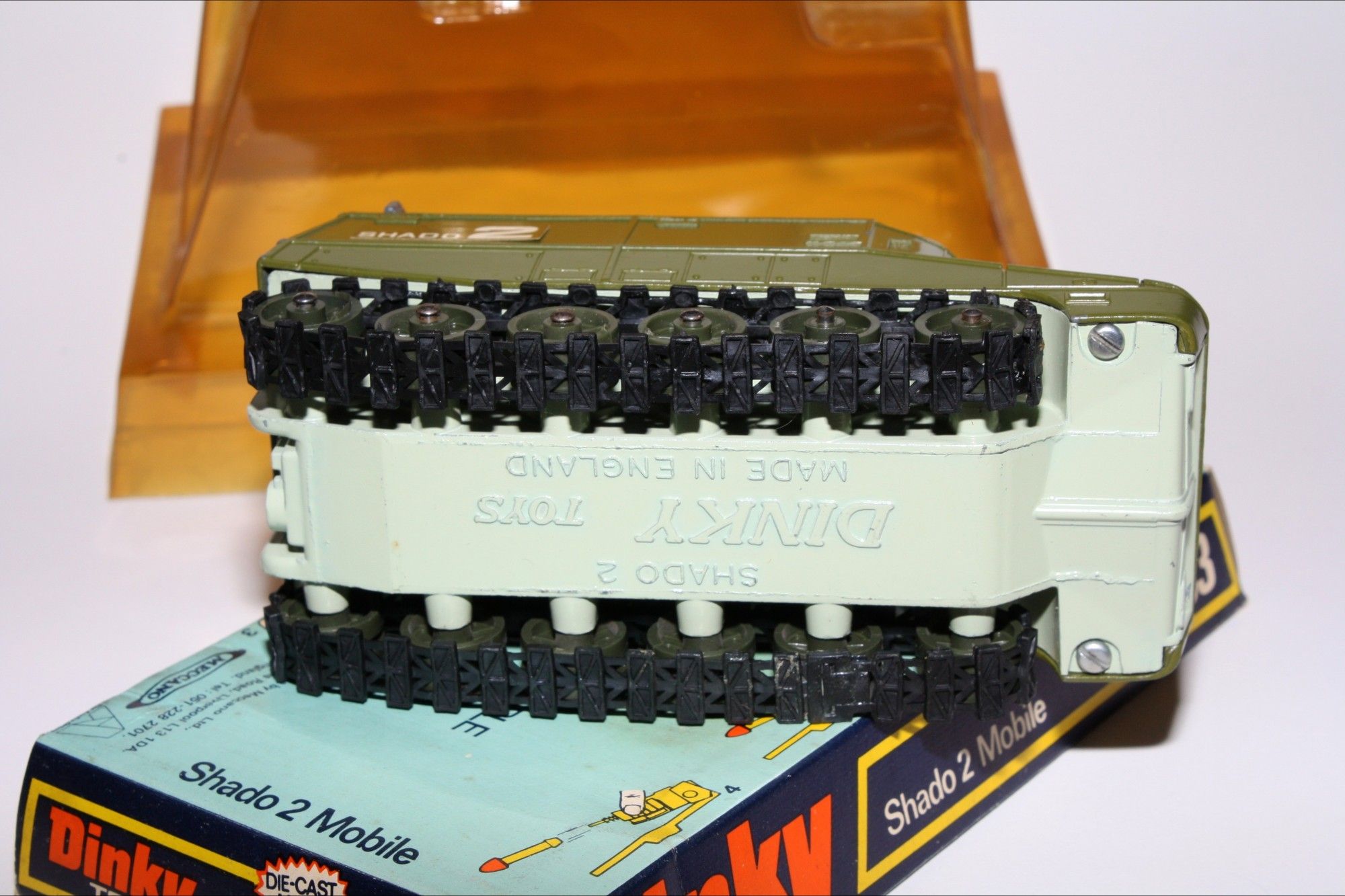 A superb example of this later issue UFO Shado 2 Gerry Anderson model. Gleaming original green paintwork is mint , please study the photos. Perfect black tracks on green rollers, crystal clear windows, white interior, missile launcher all in good working order with original missile, rotating roof all good and locks into position as it should, original decals are excellent. Baseplate is mint.