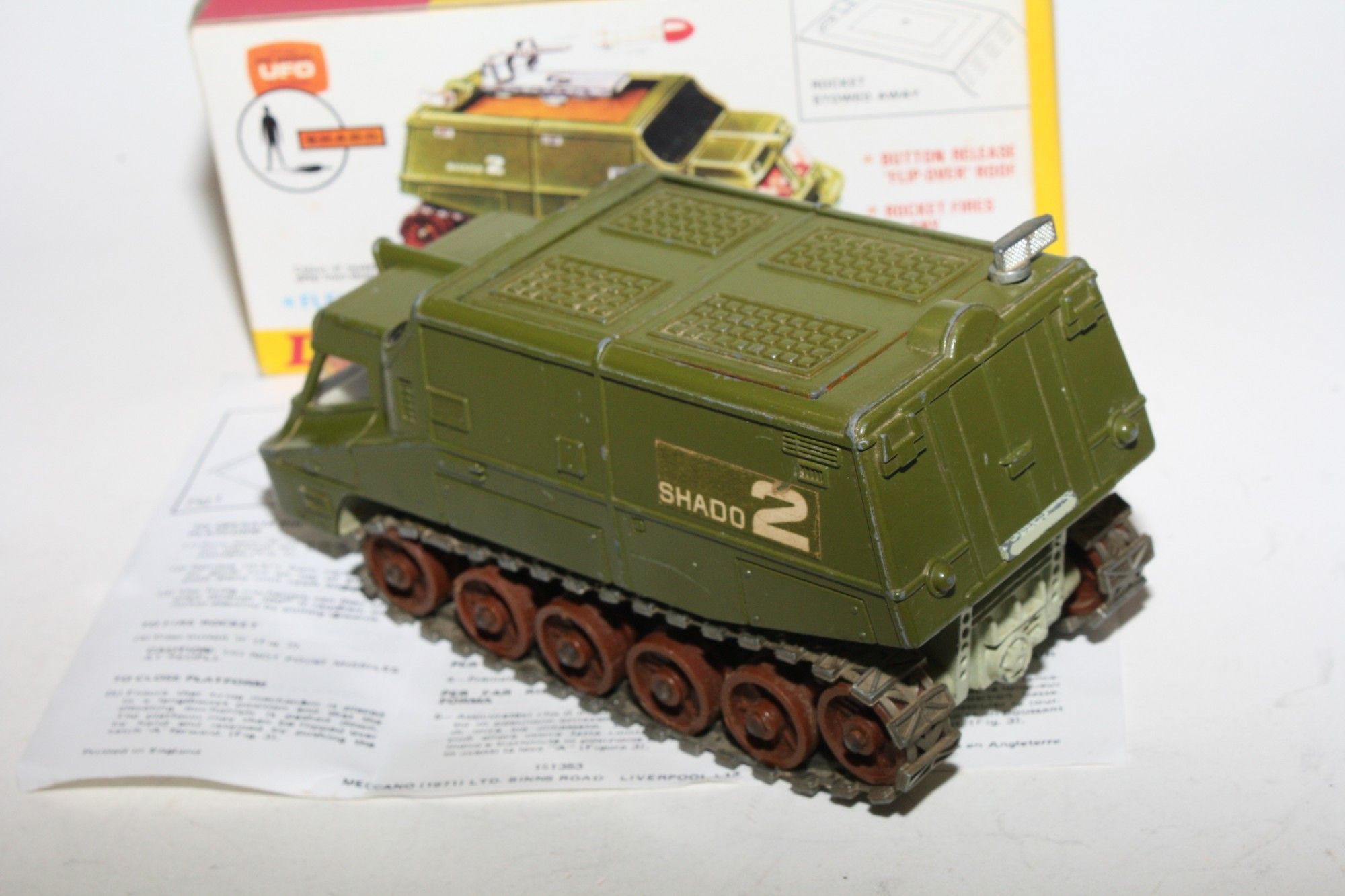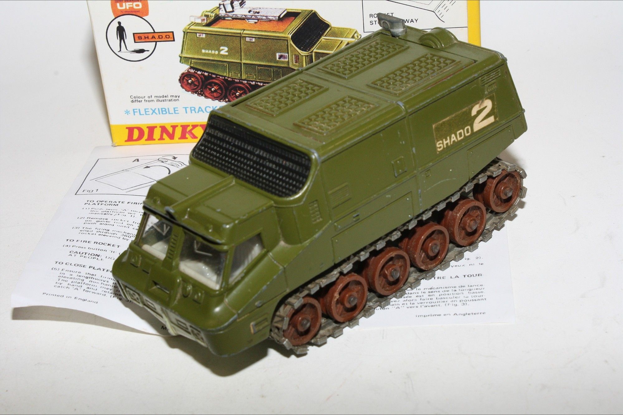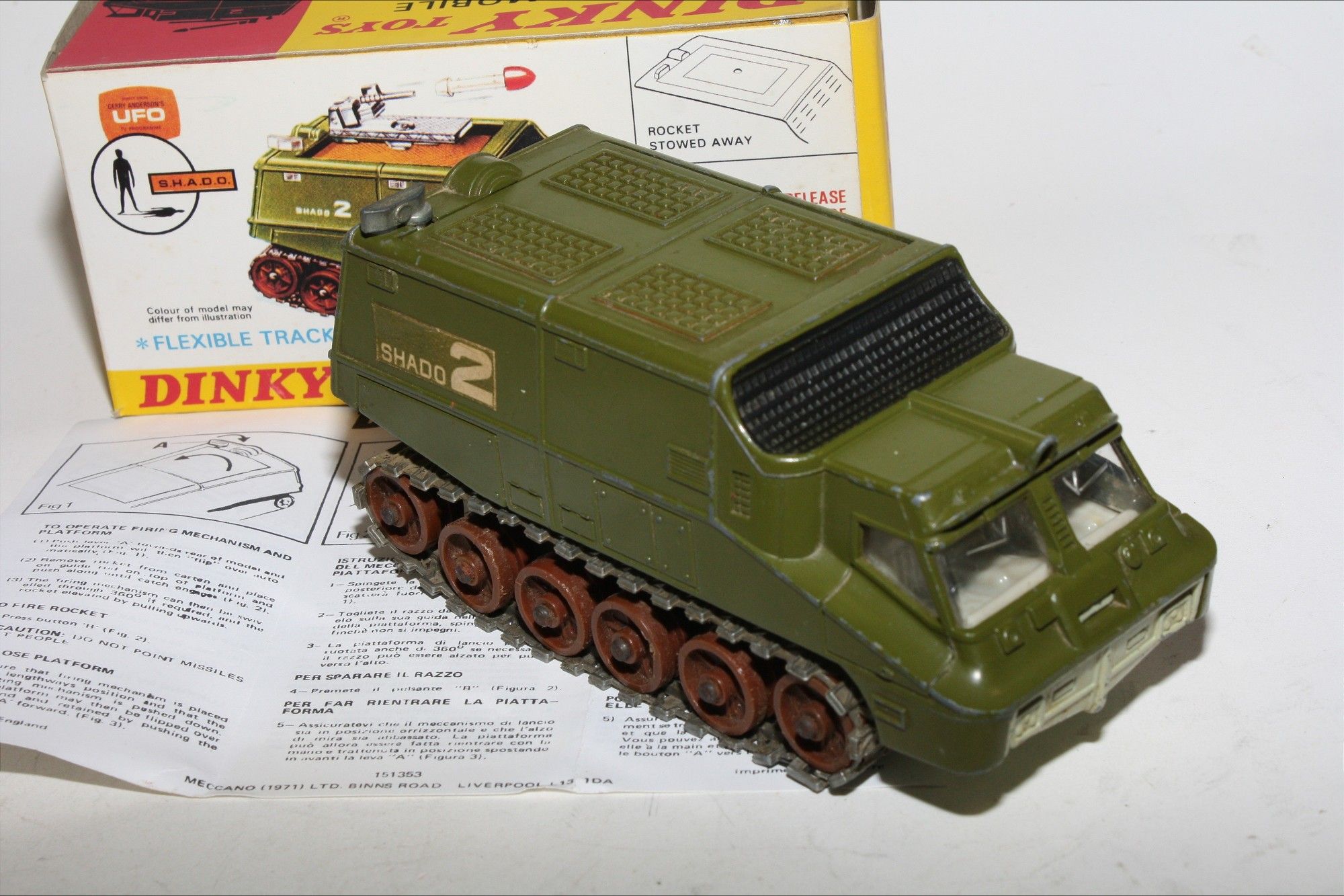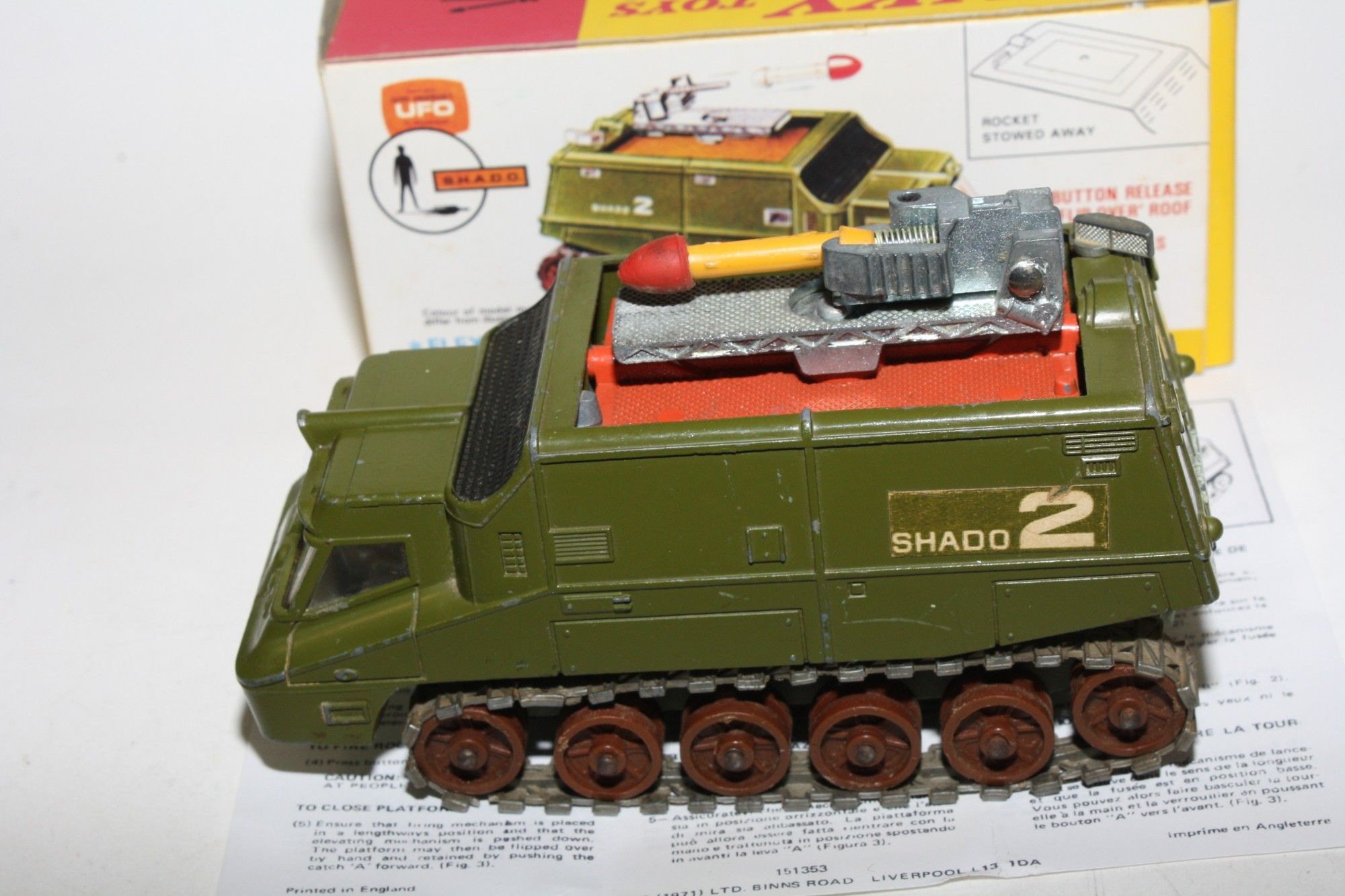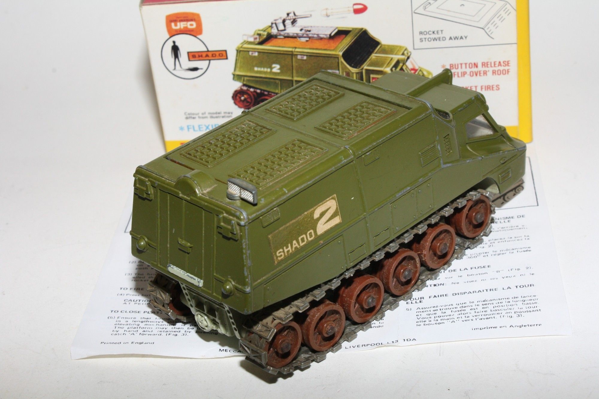 A good example of this UFO Shado 2 Gerry Anderson model. Original green paintwork is good with a few small nicks/rubs/wear, please study the photos. Perfect original silver tracks on brown rollers, windows crystal clear, white interior, missile launcher all in good working order with 1 x original missile, rotating roof all good and locks into position as it should. Pale green baseplate with scratches and playwear.